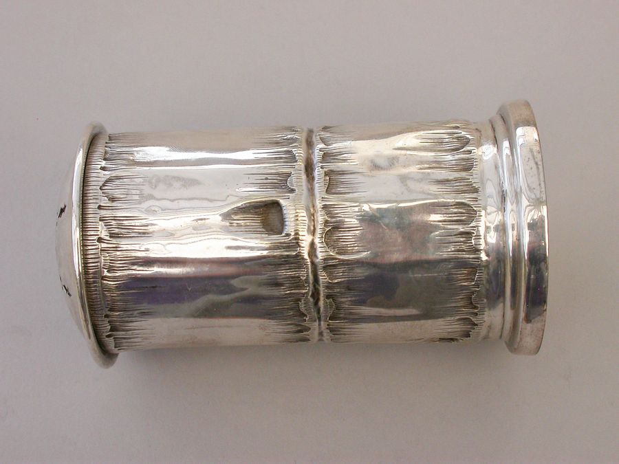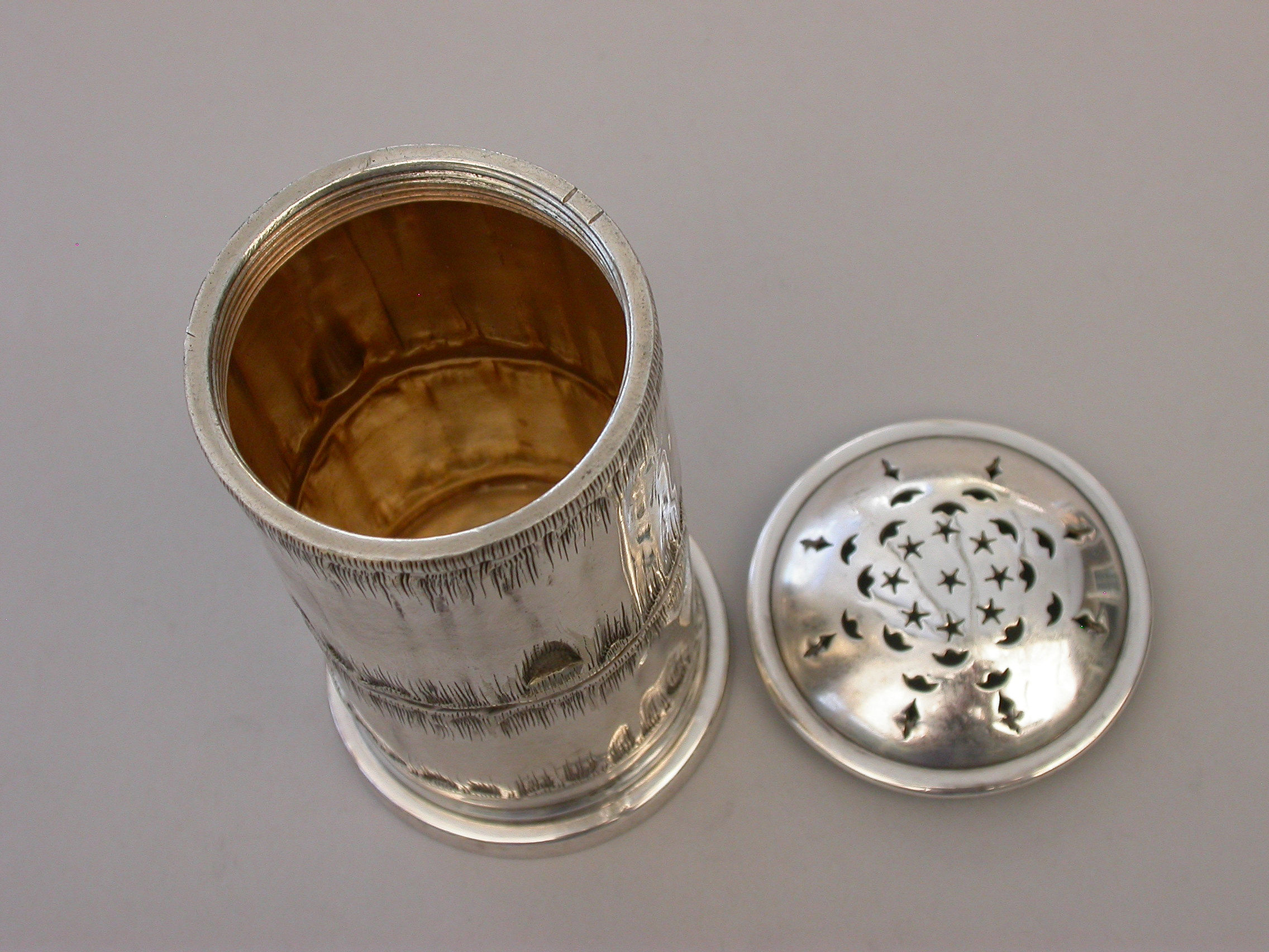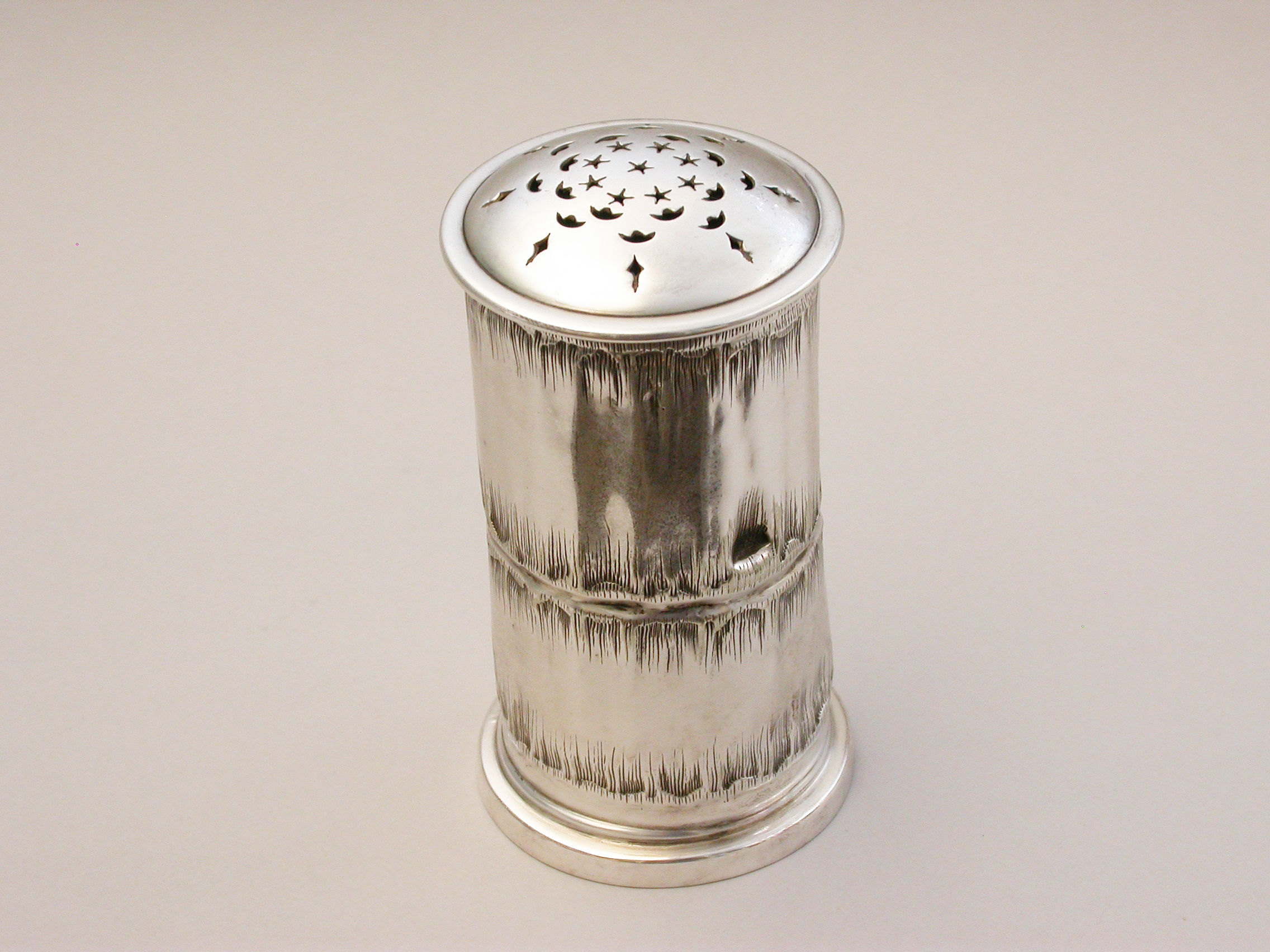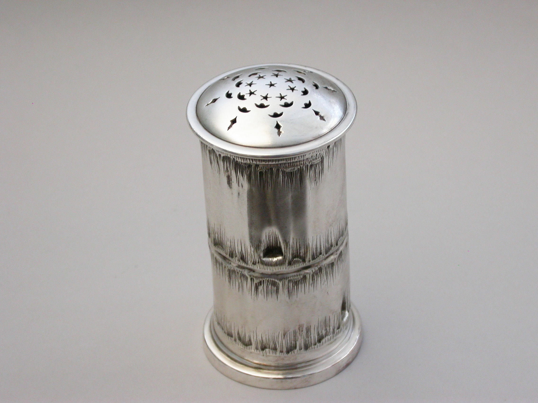 A good quality late Victorian novelty electroplated silver Sugar Caster made in the form of a a piece of sugar cane. Screw-off lid and gilded interior.