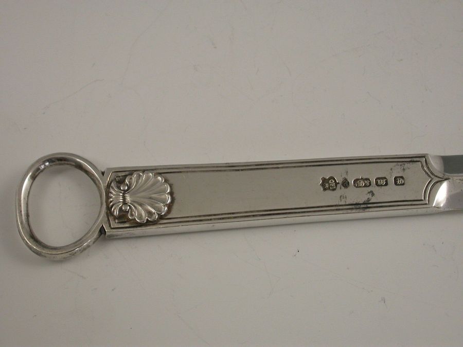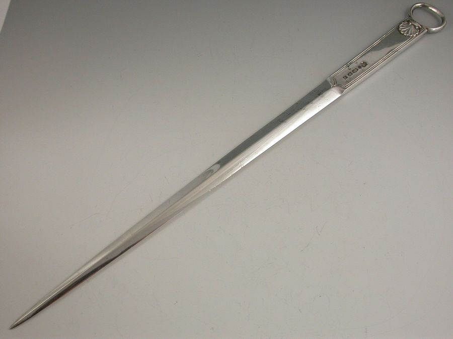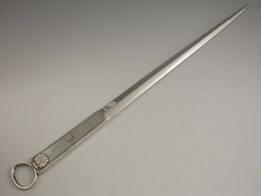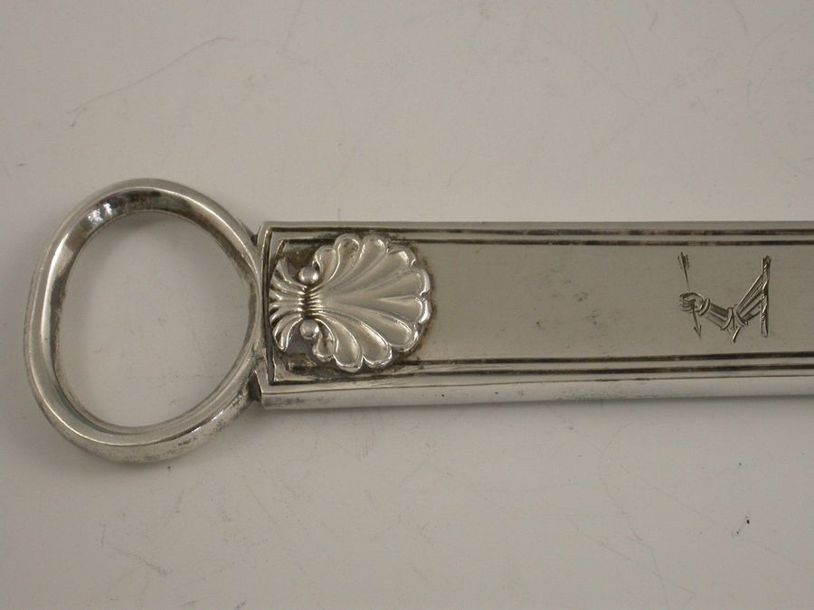An unusual mid Victorian electroplated Meat Skewer of large size and fine quality, with ring terminal and applied scallop shell decoration, the handle engraved with a contemporary crest depicting an arm in armour holding an arrow.