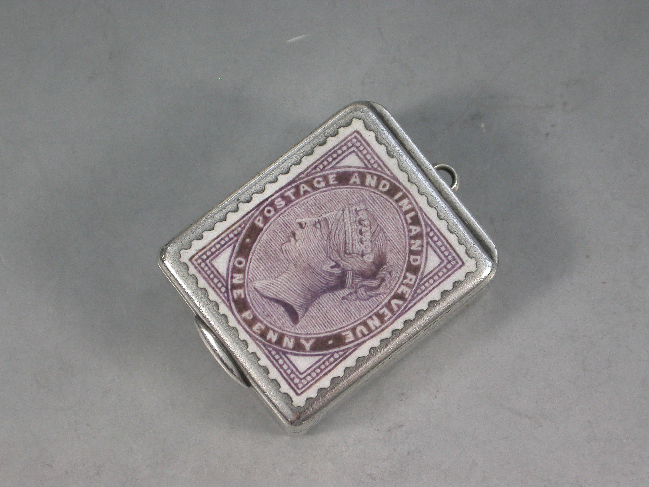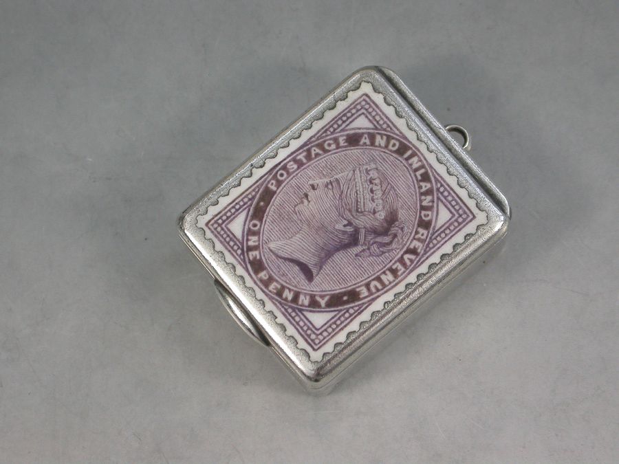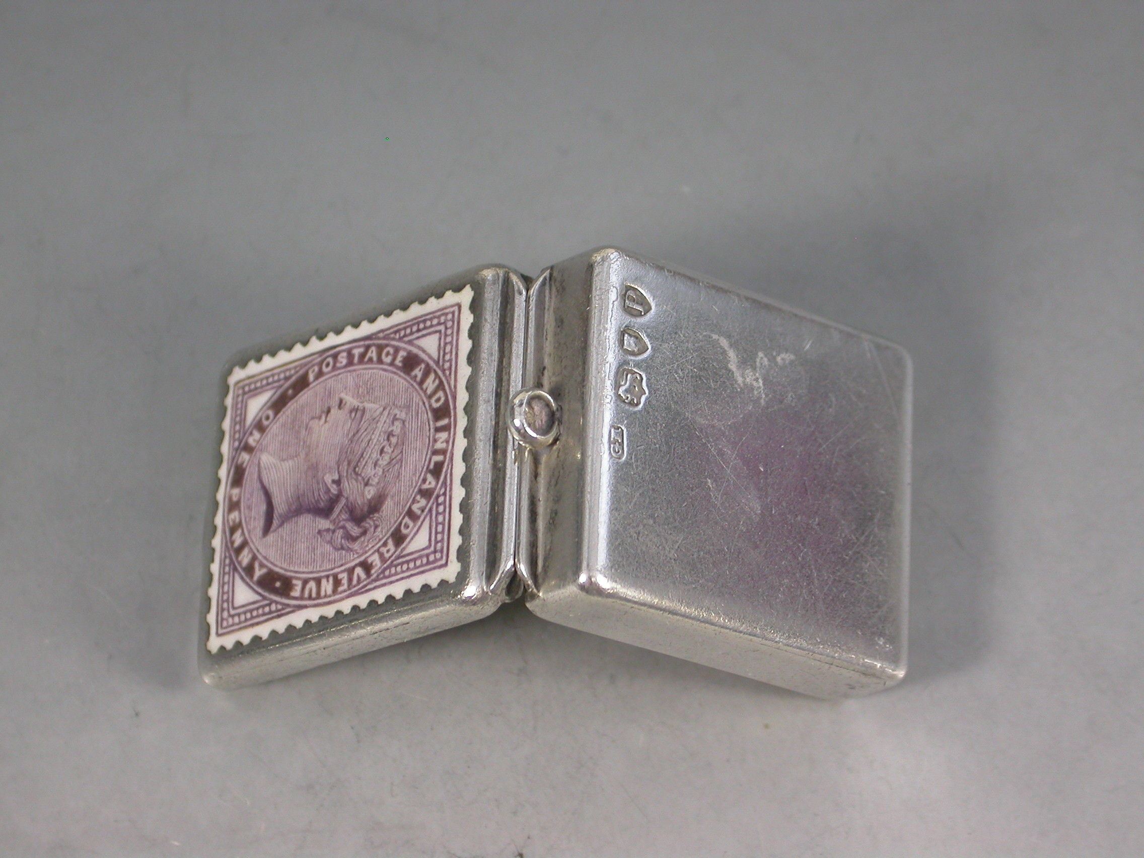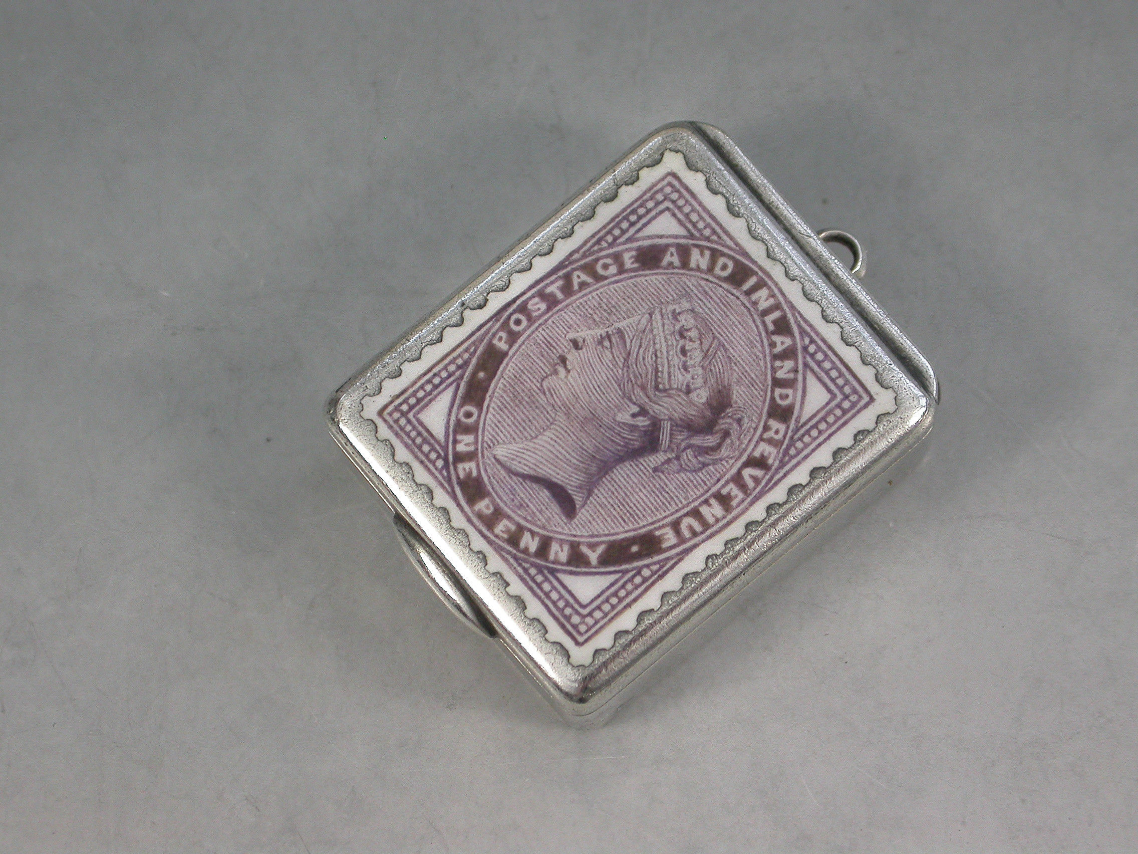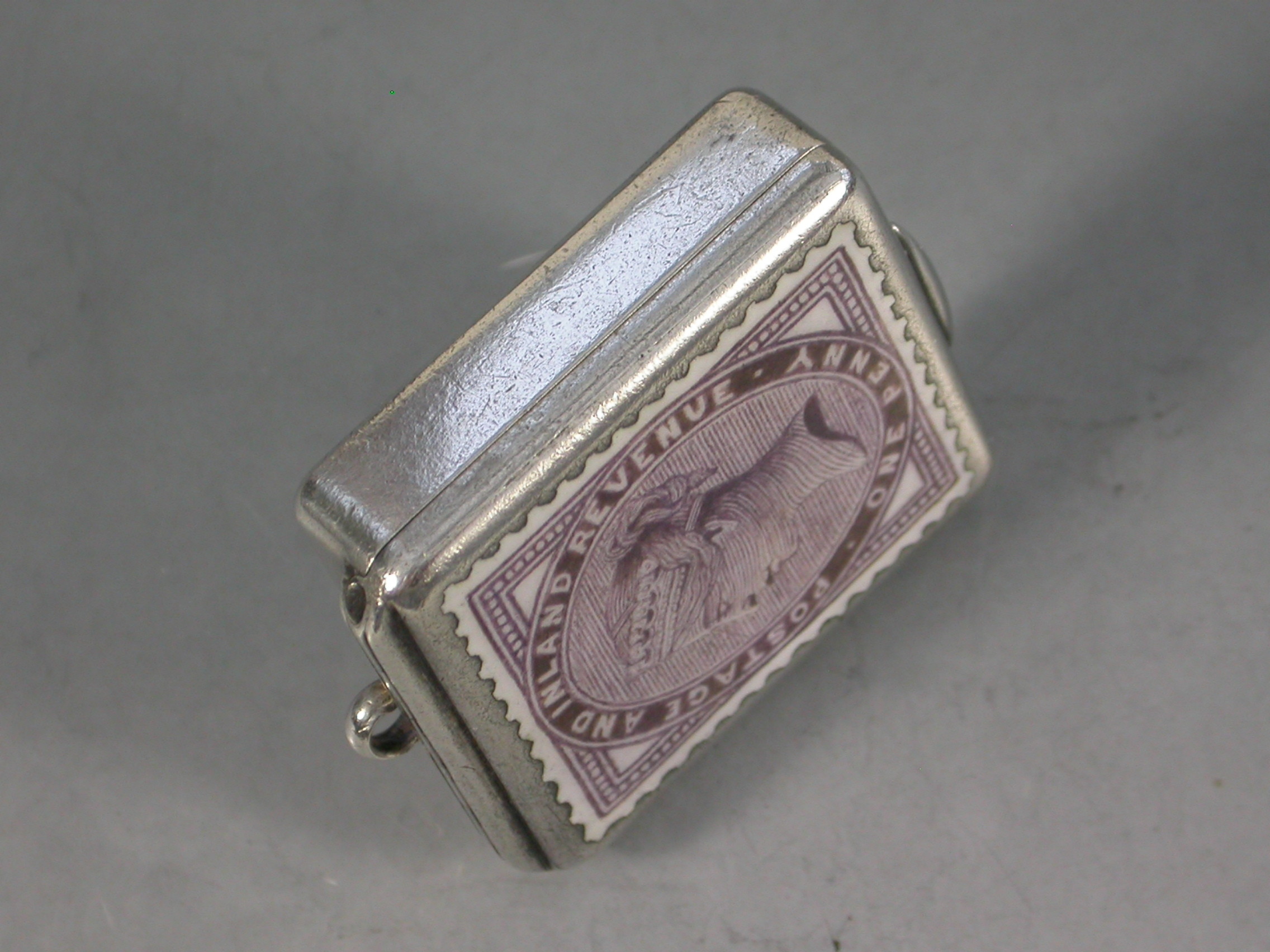 An extremely rare Victorian silver Stamp Case of oblong form, the cover enamelled with a one penny lilac coloured stamp, the gilded interior with spring loaded stamp compartment.