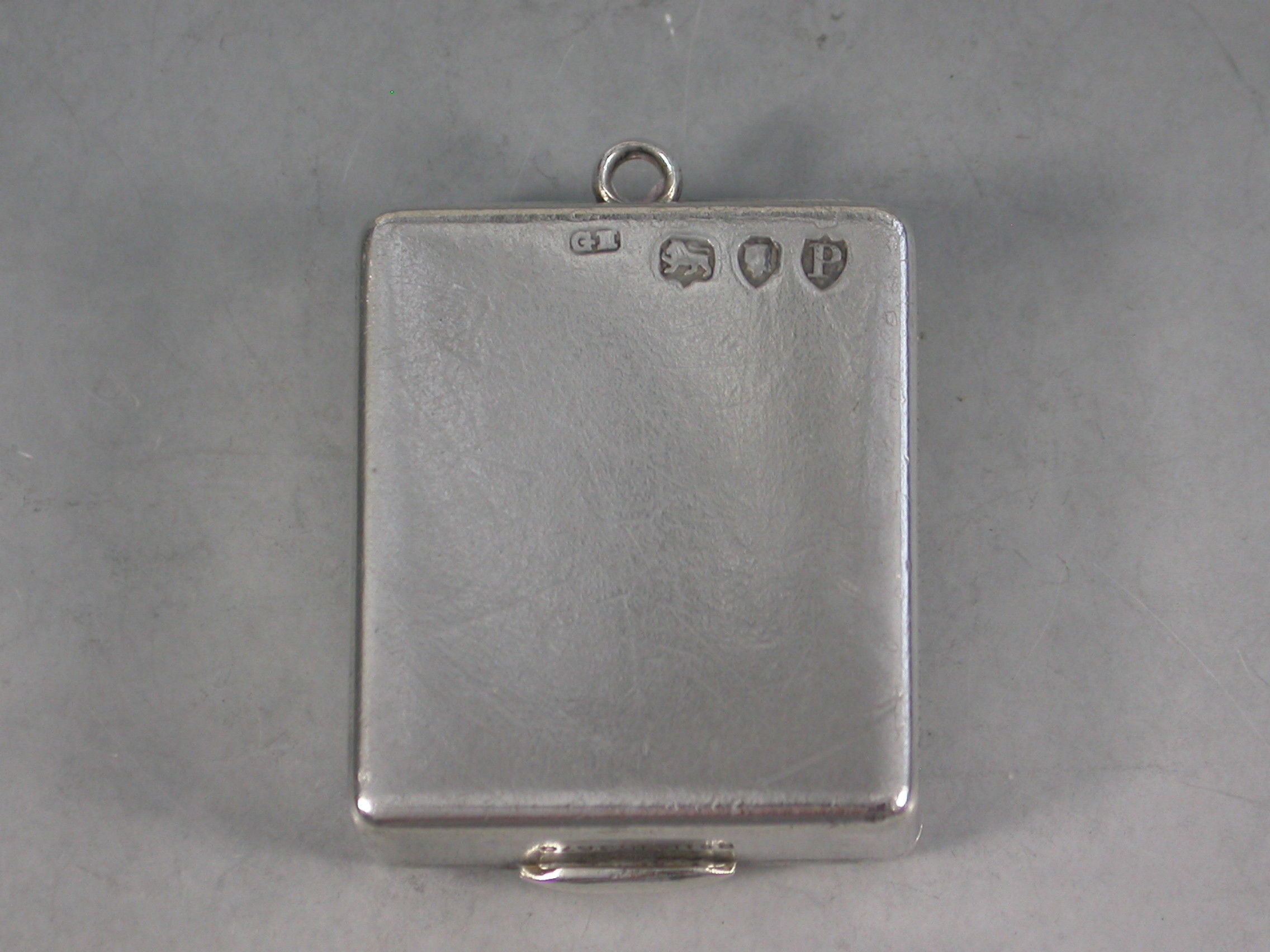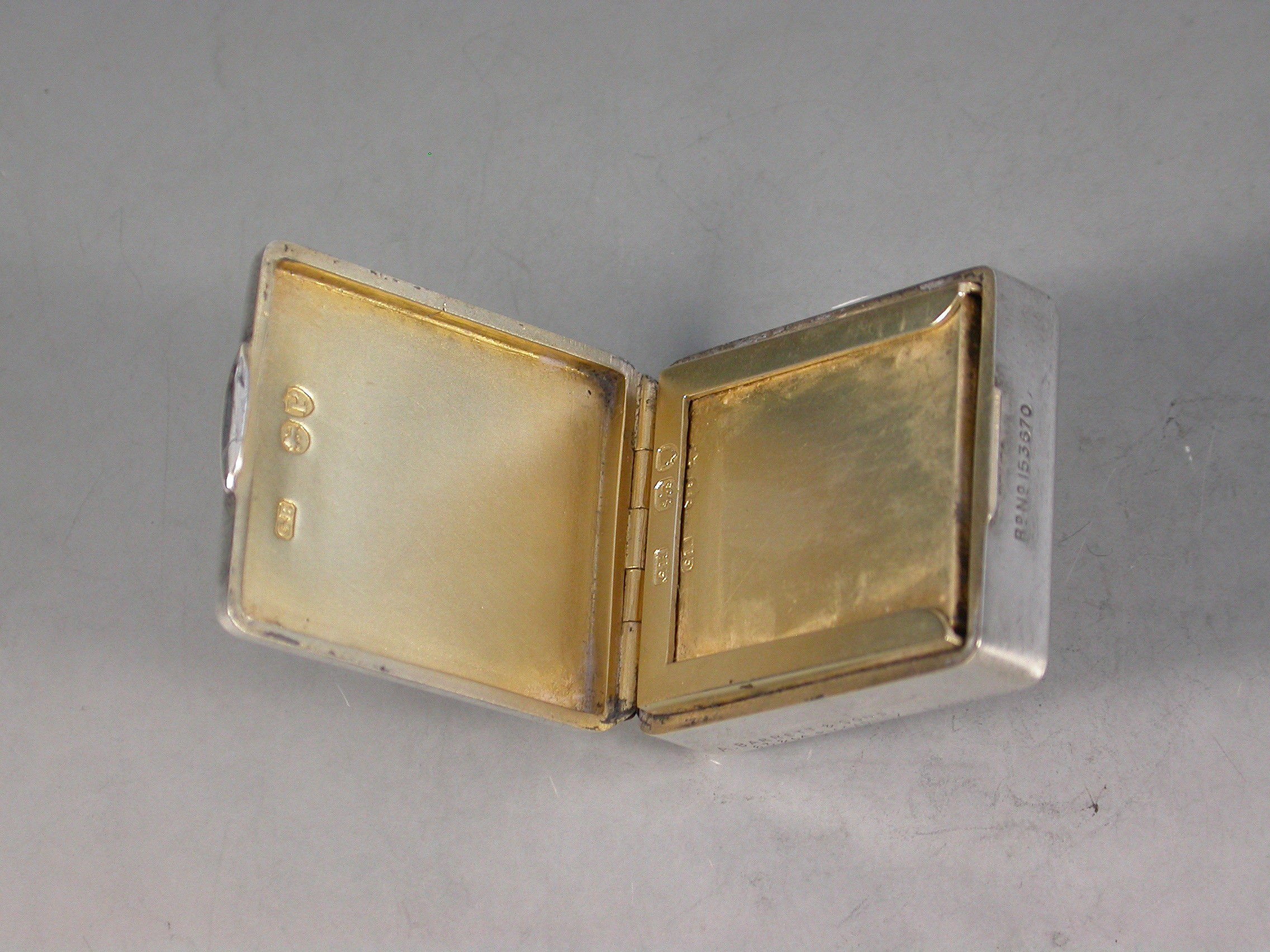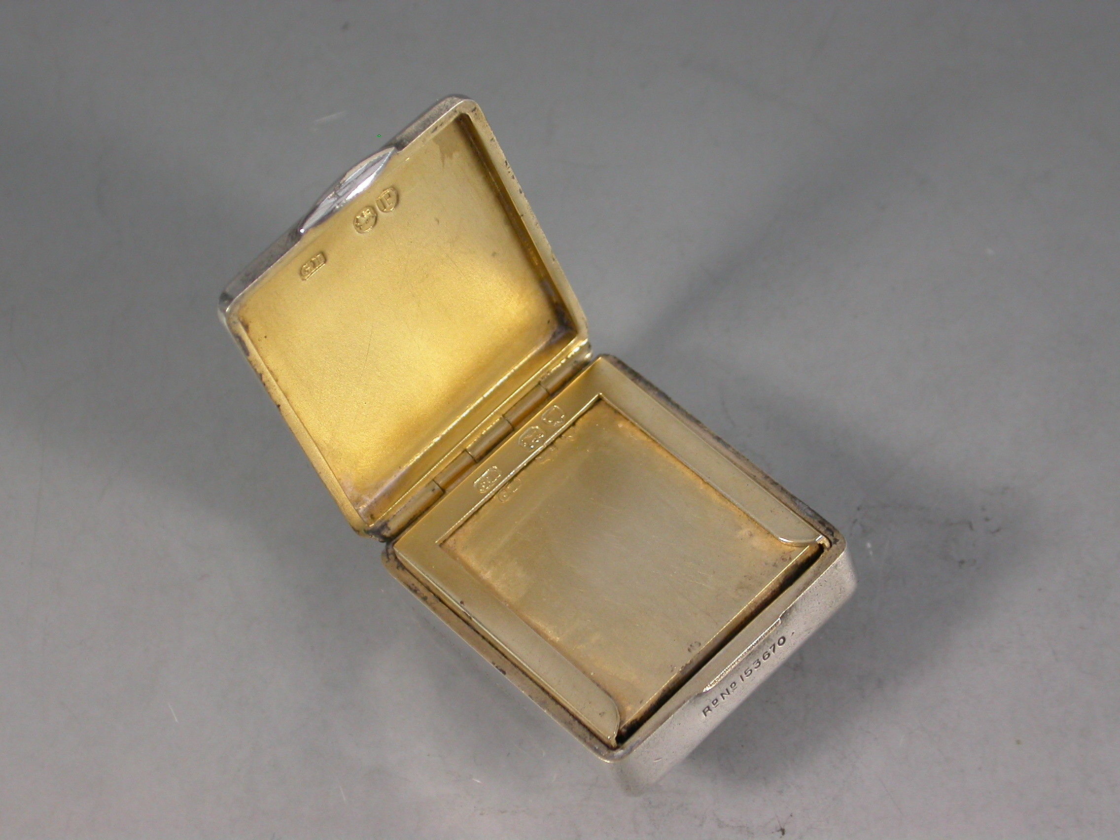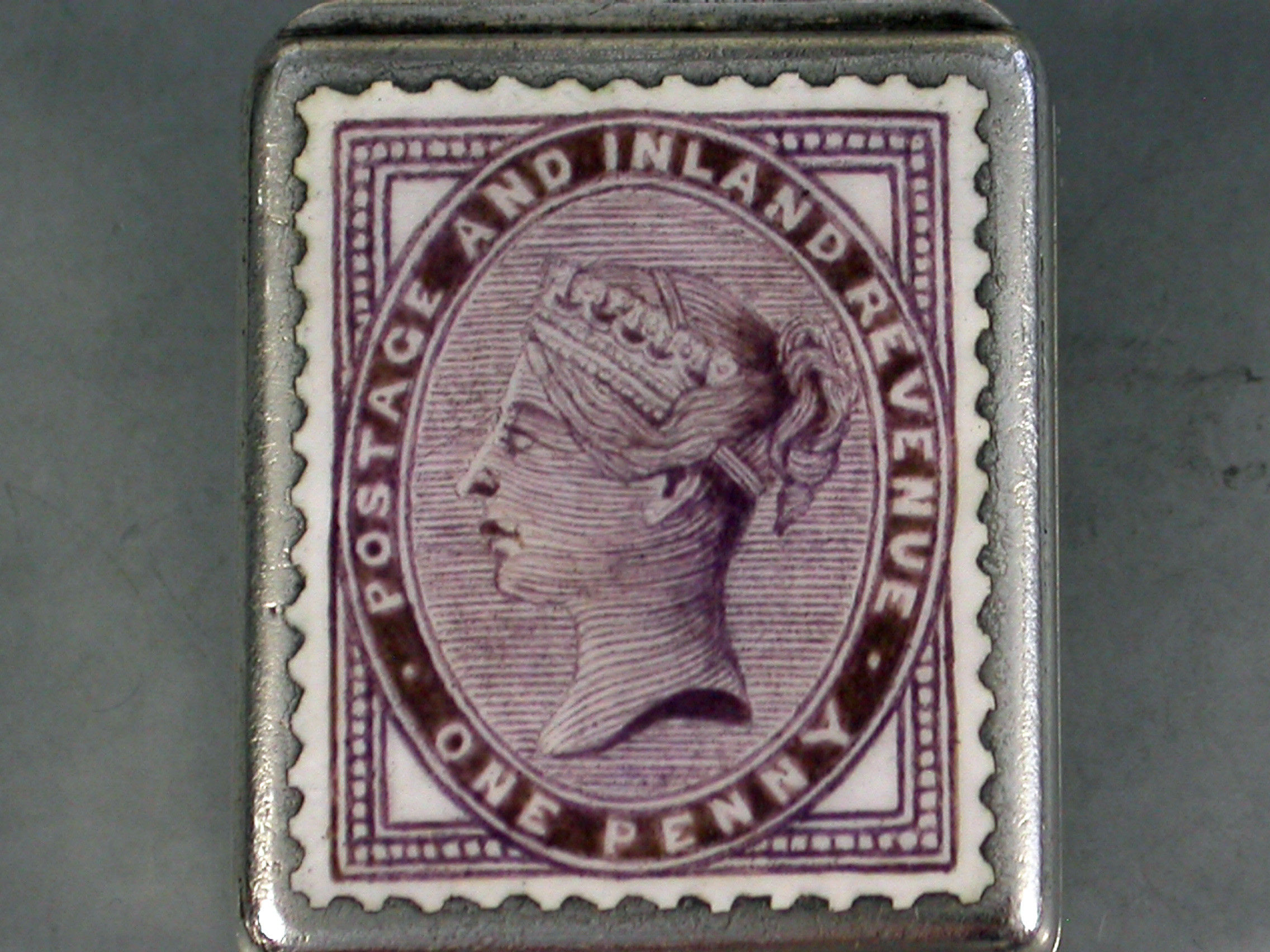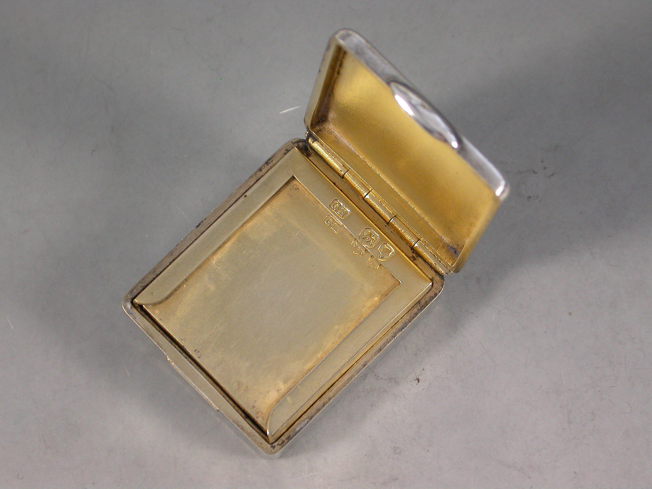 An extremely rare Victorian silver Stamp Case of oblong form, the cover enamelled with a one penny lilac coloured stamp, the gilded interior with spring loaded stamp compartment.