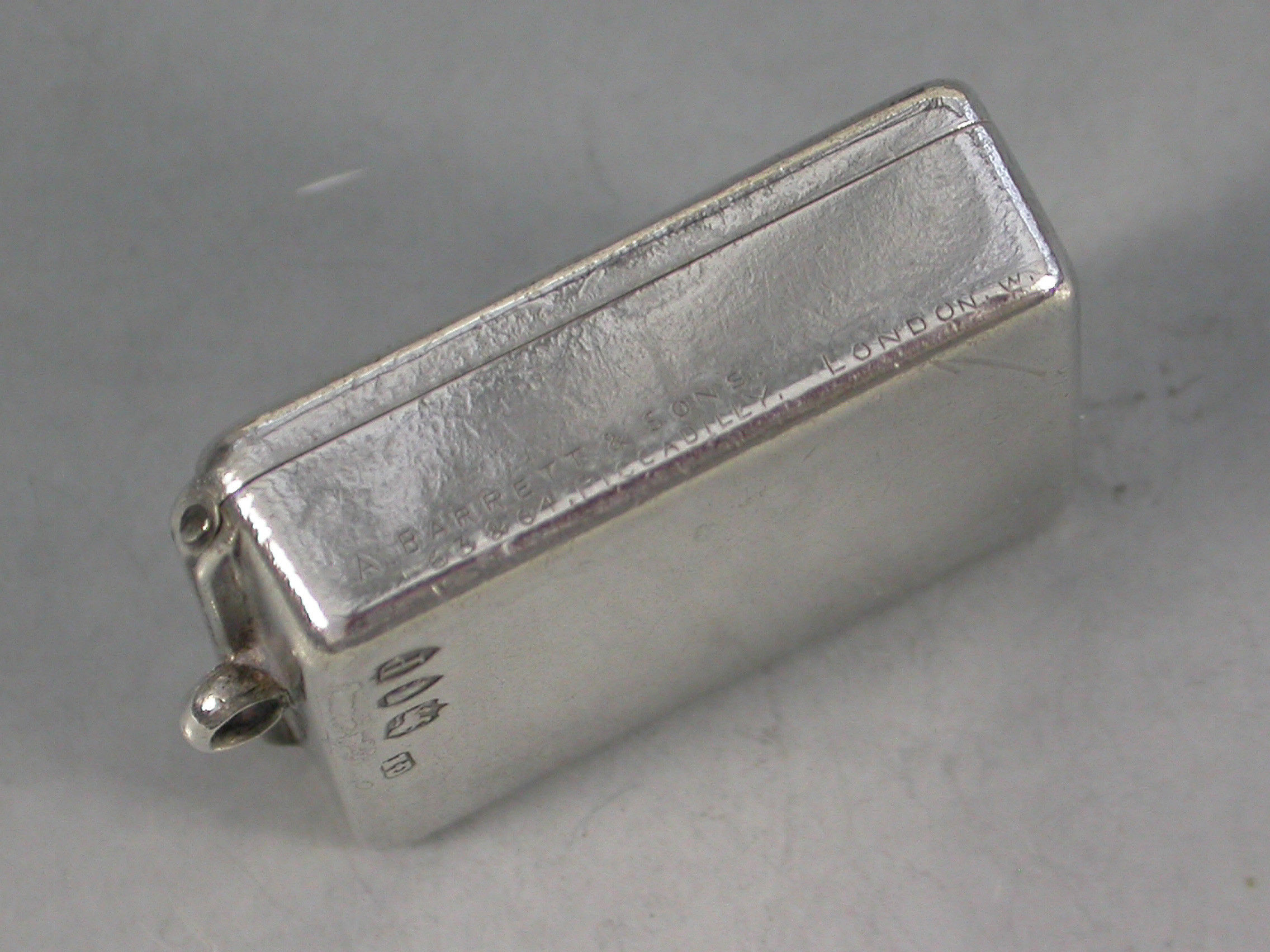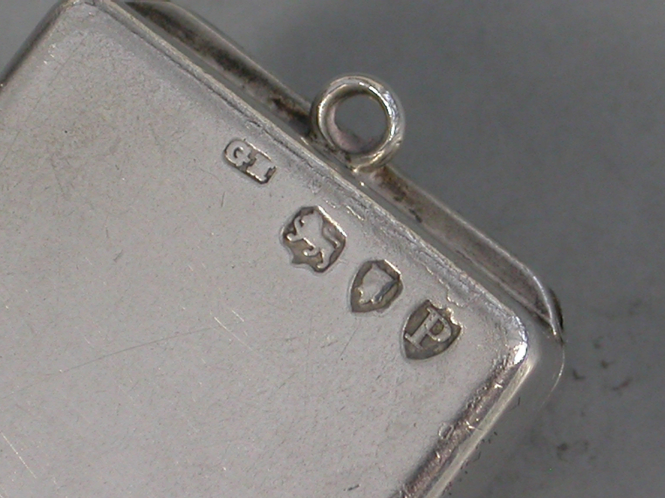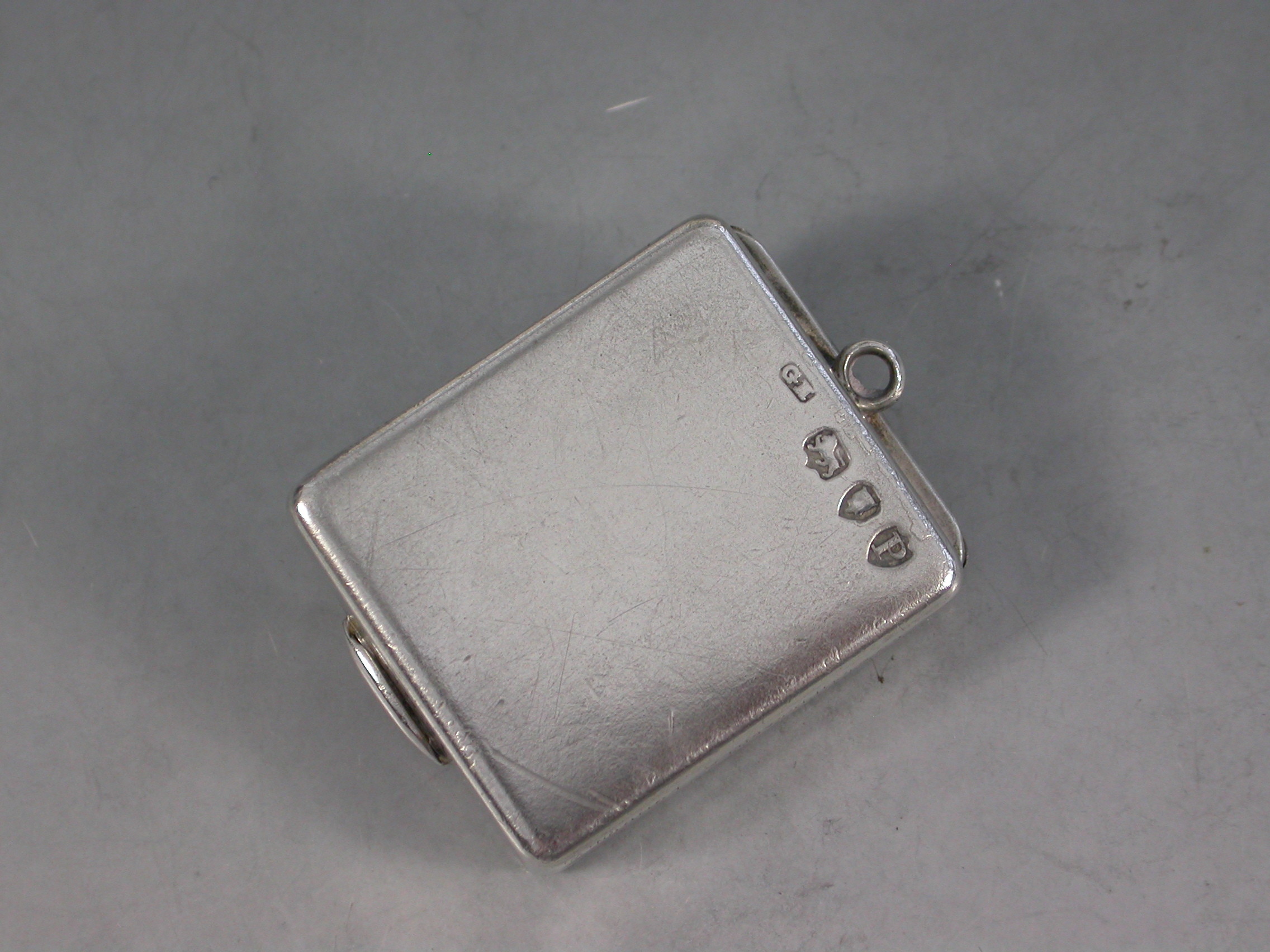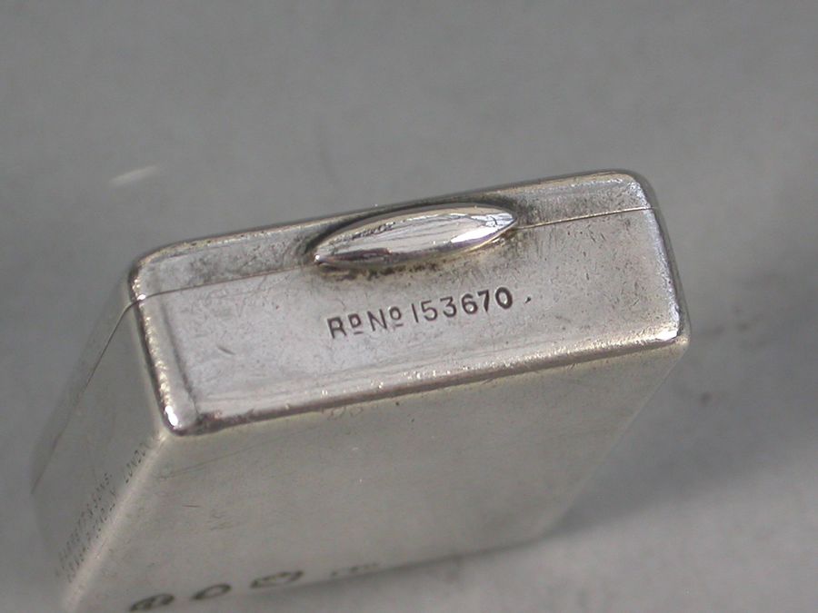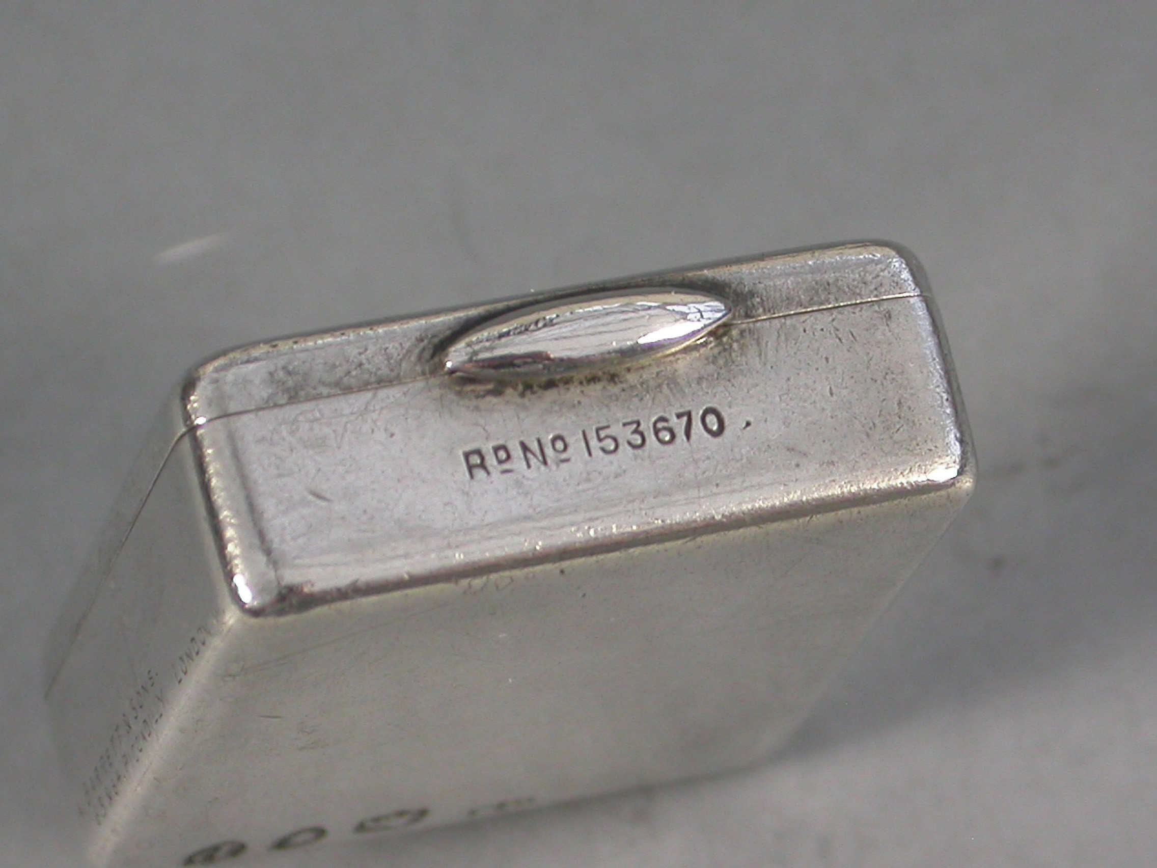 An extremely rare Victorian silver Stamp Case of oblong form, the cover enamelled with a one penny lilac coloured stamp, the gilded interior with spring loaded stamp compartment.