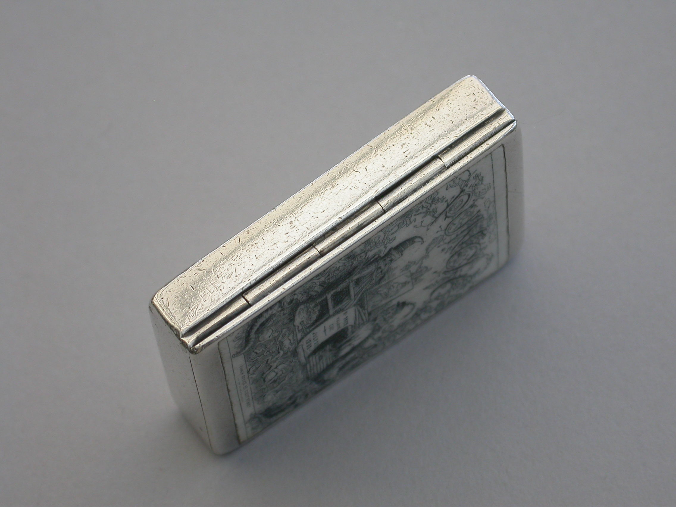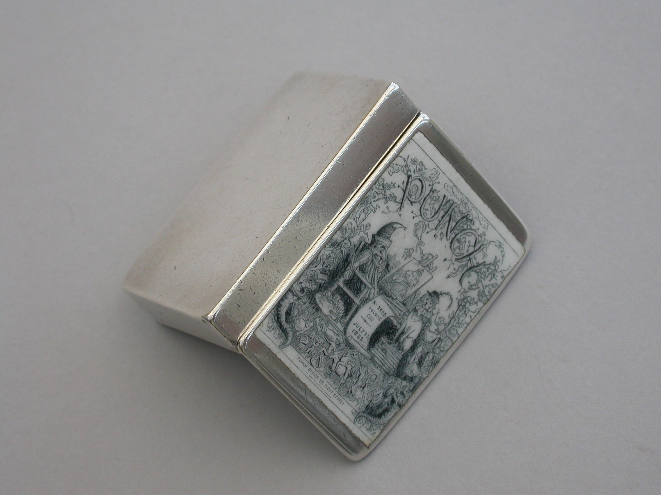 A good Victorian silver and enamel Vesta Case of rounded rectangular form with hinged lid and silver gilt interior. The cover inset with a monochrome enamel panel depicting the front cover of Punch Magazine dated 1892.