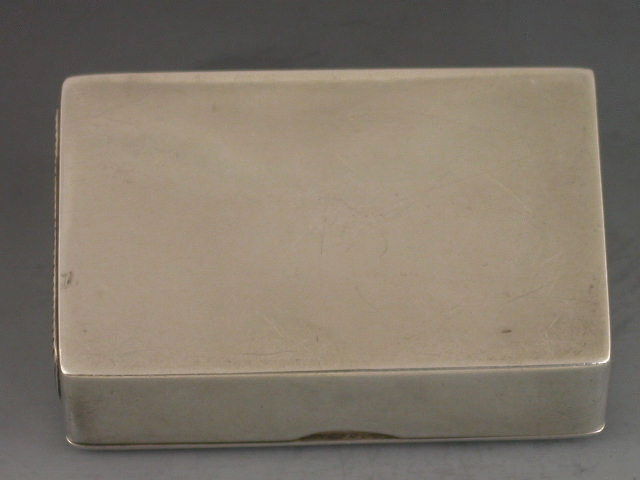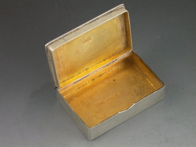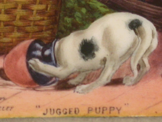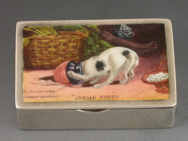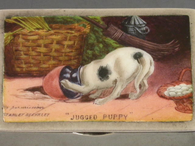 A very fine Victorian silver Vesta Case of rectangular box type form with silver gilt interior, the cover enamelled with a scene of a dog with its head stuck in a milk jug, surrounded by a basket of eggs, vegetables and a broom. Also enamelled with the title “Jugged Puppy” and by permission of Stanley Berkeley.