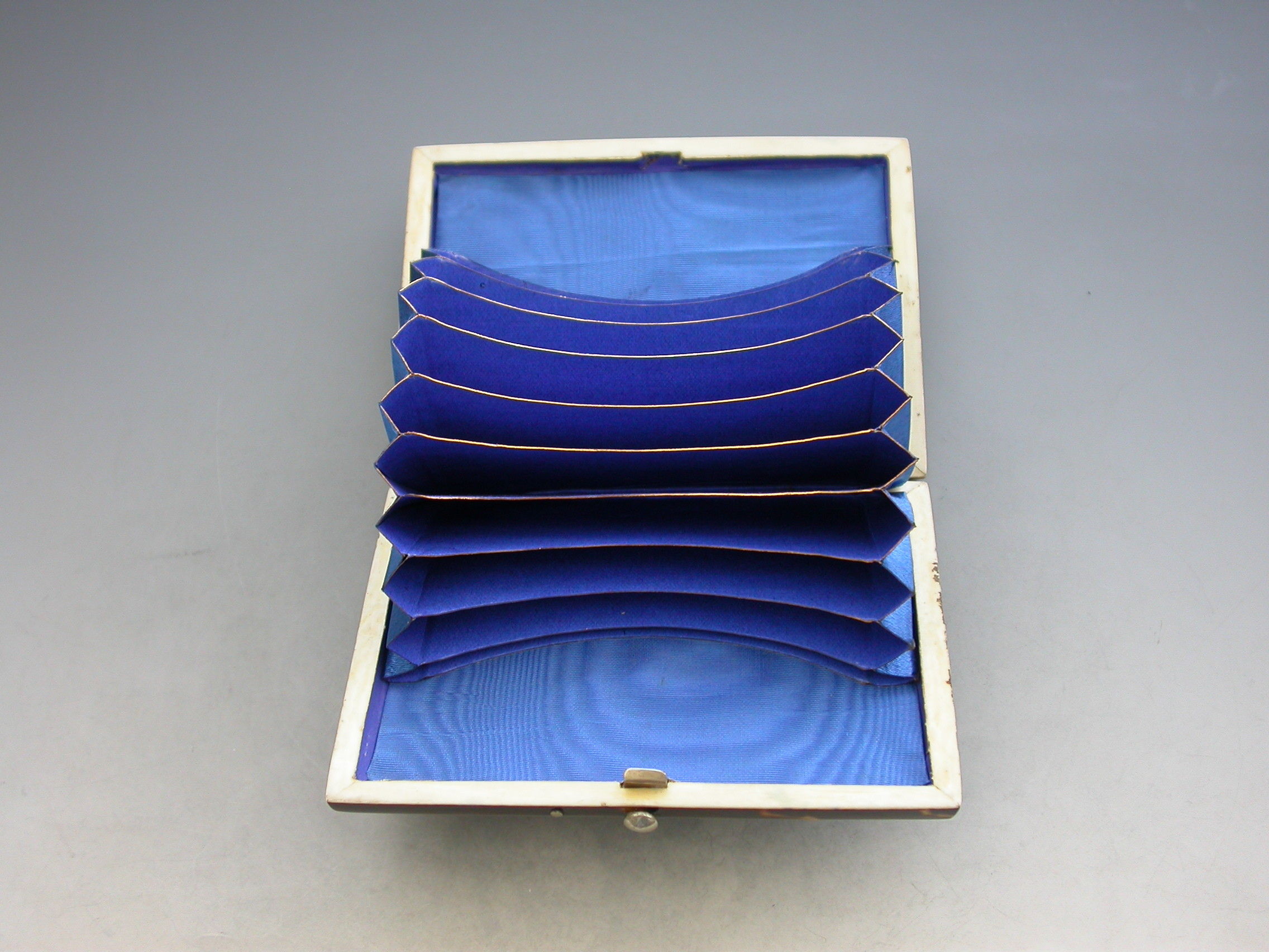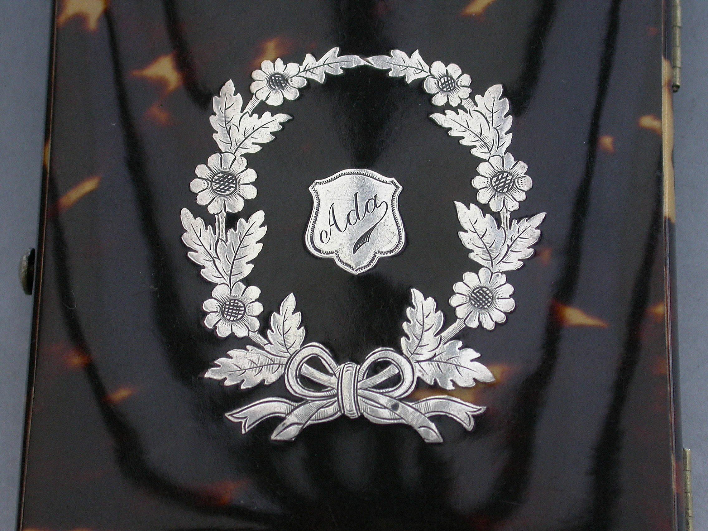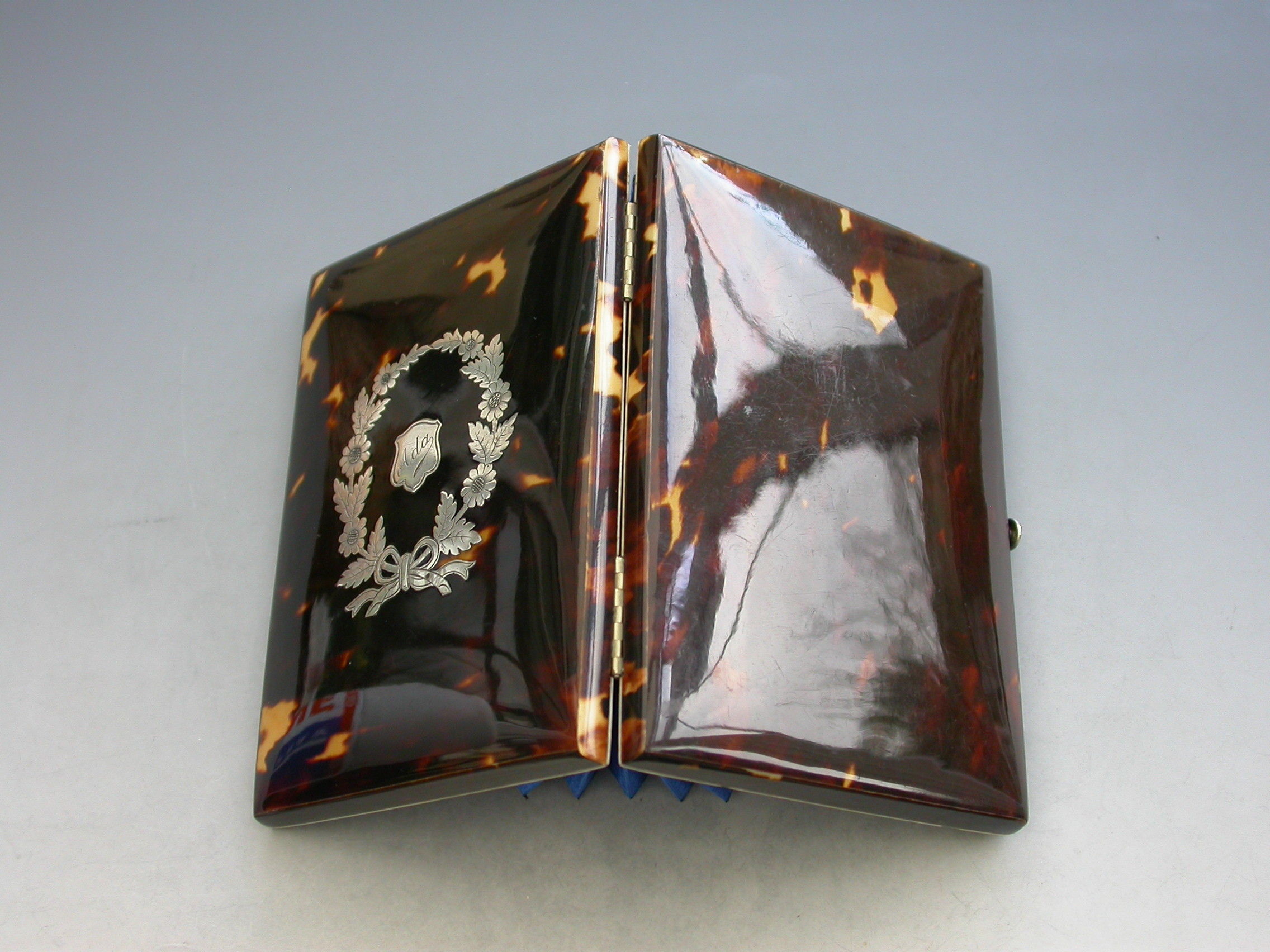 An English Victorian multi pocket 'concertina' Card Case in tortoiseshell with silver inlay, a shield shaped silver cartouche to the cover engraved 'Ada'. Blue silk lined interior and sprung push button opening mechanism.