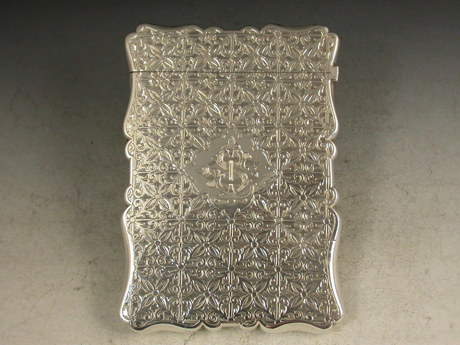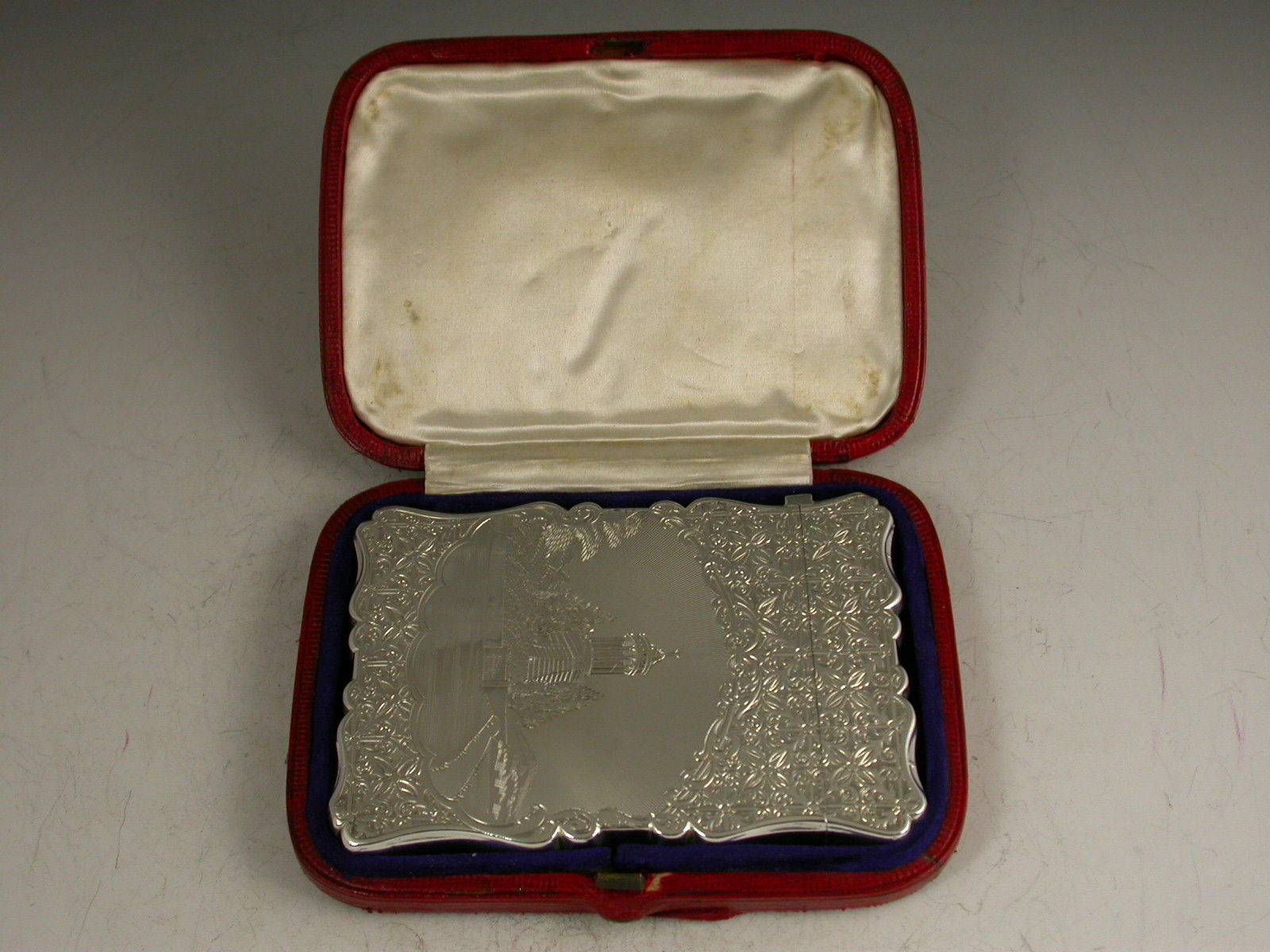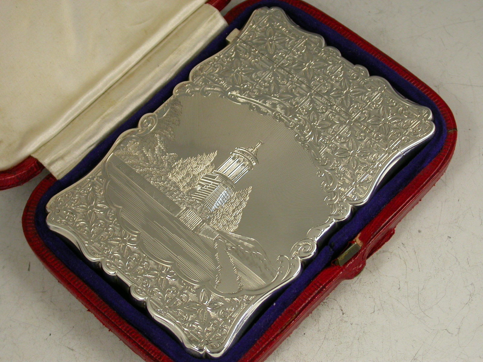 A very fine Victorian silver Card Case of shaped rectangular form with hinged lid, the reverse engraved with a geometric pattern and diamond shaped cartouche engraved with contemporary initials. The face with a similar pattern and a shaped panel depicting the Burns Monument in Scotland. Complete with original silk and velvet lined Morocco leather case.