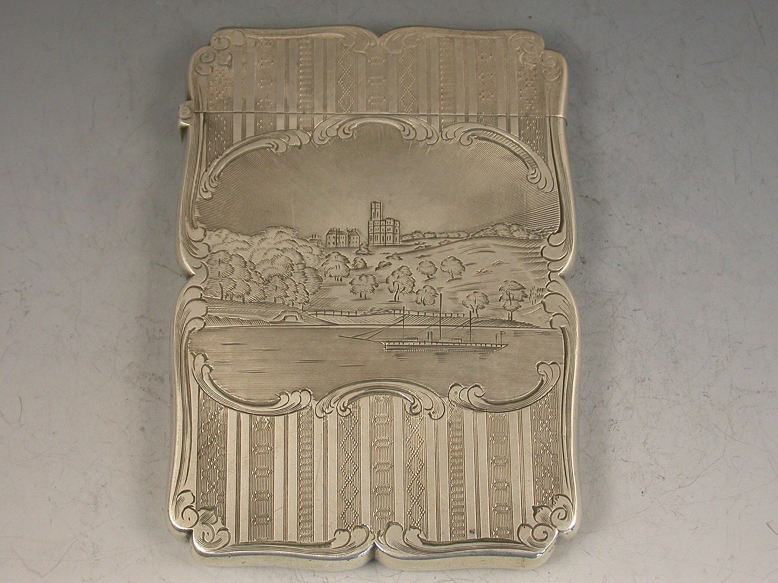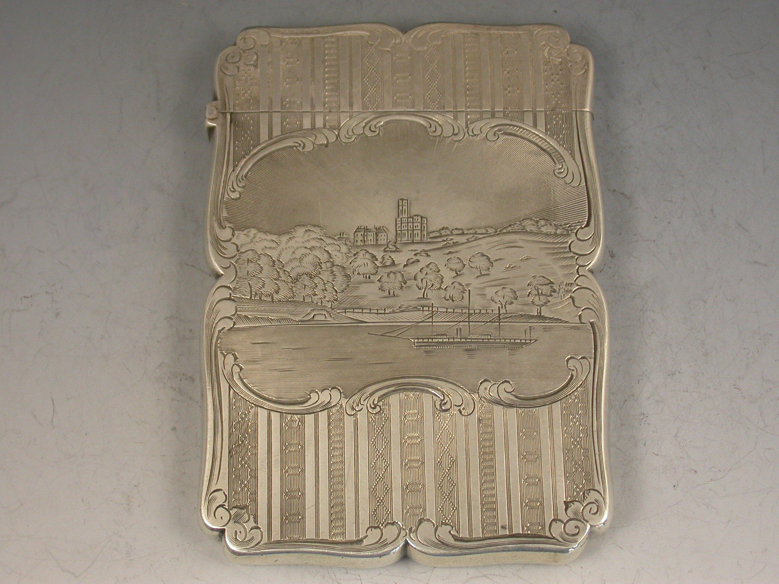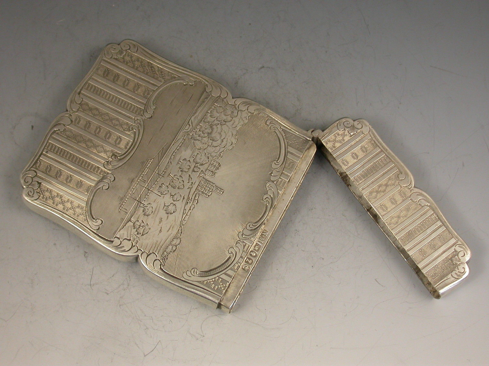 A rare Victorian silver Card Case of shaped rectangular form with bands of engine turned decoration, a vacant shield shaped cartouche to the reverse and asymmetrical cartouche to the front engraved with a scene depicting Osborne House on the Isle of Wight in the background and the Royal Yacht Victoria and Albert moored in the foreground.