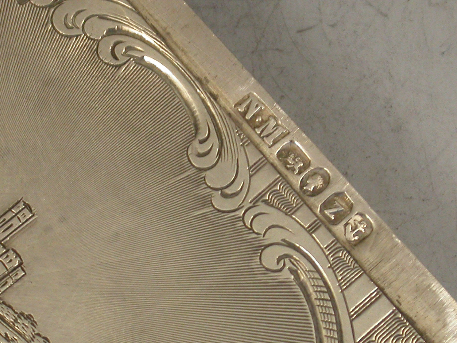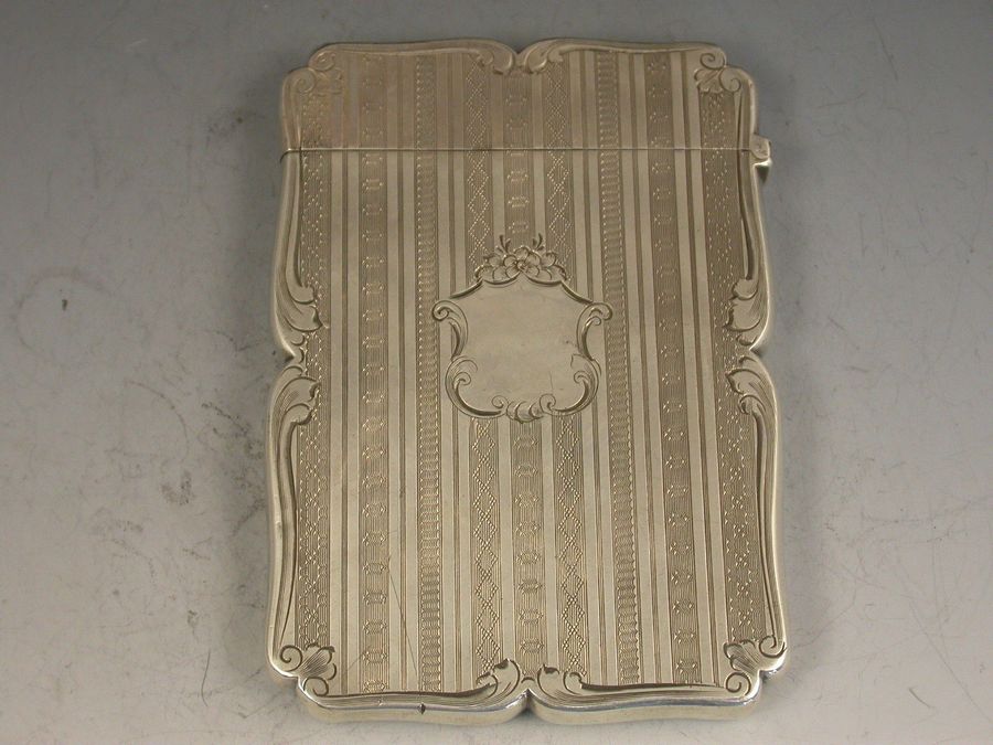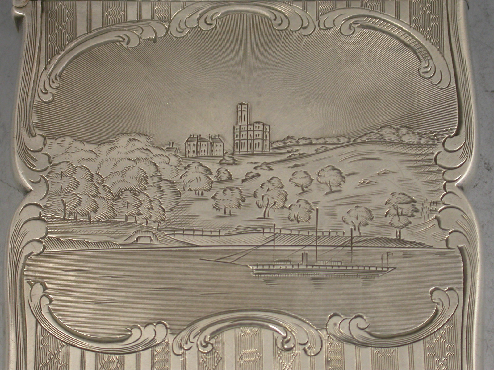 A rare Victorian silver Card Case of shaped rectangular form with bands of engine turned decoration, a vacant shield shaped cartouche to the reverse and asymmetrical cartouche to the front engraved with a scene depicting Osborne House on the Isle of Wight in the background and the Royal Yacht Victoria and Albert moored in the foreground.