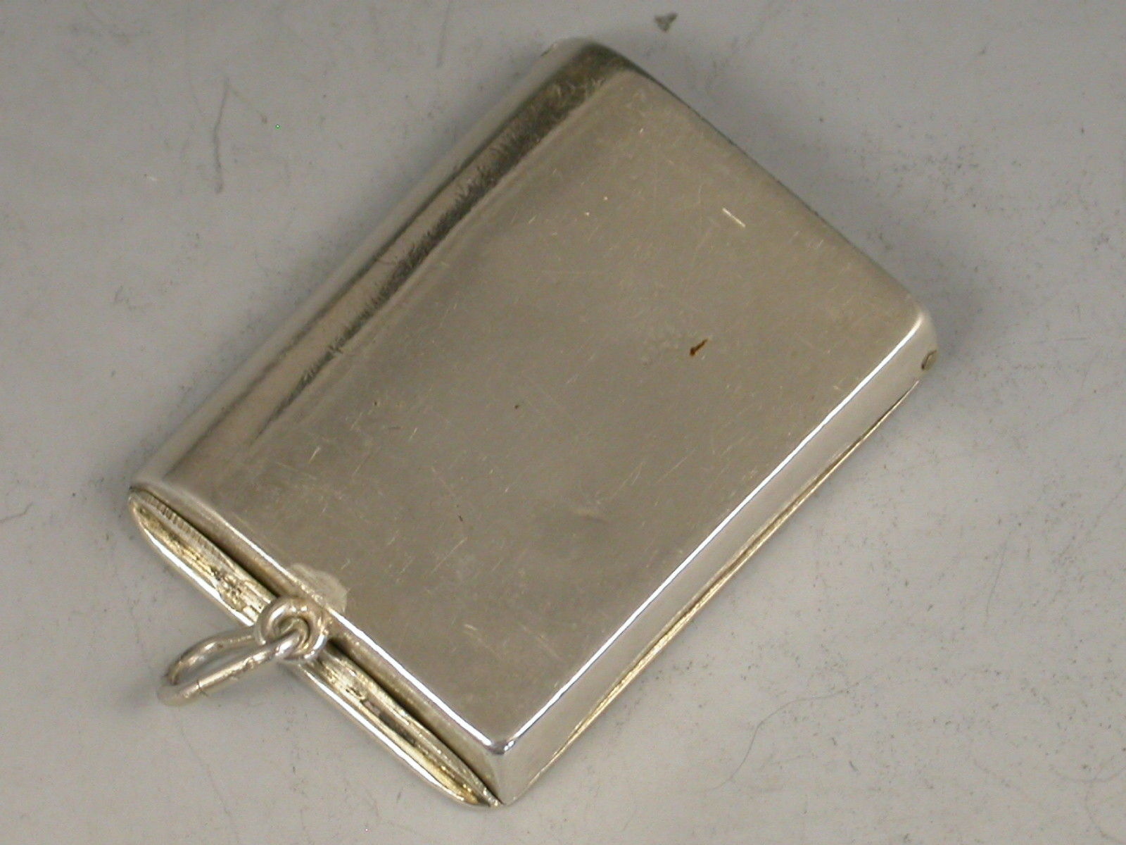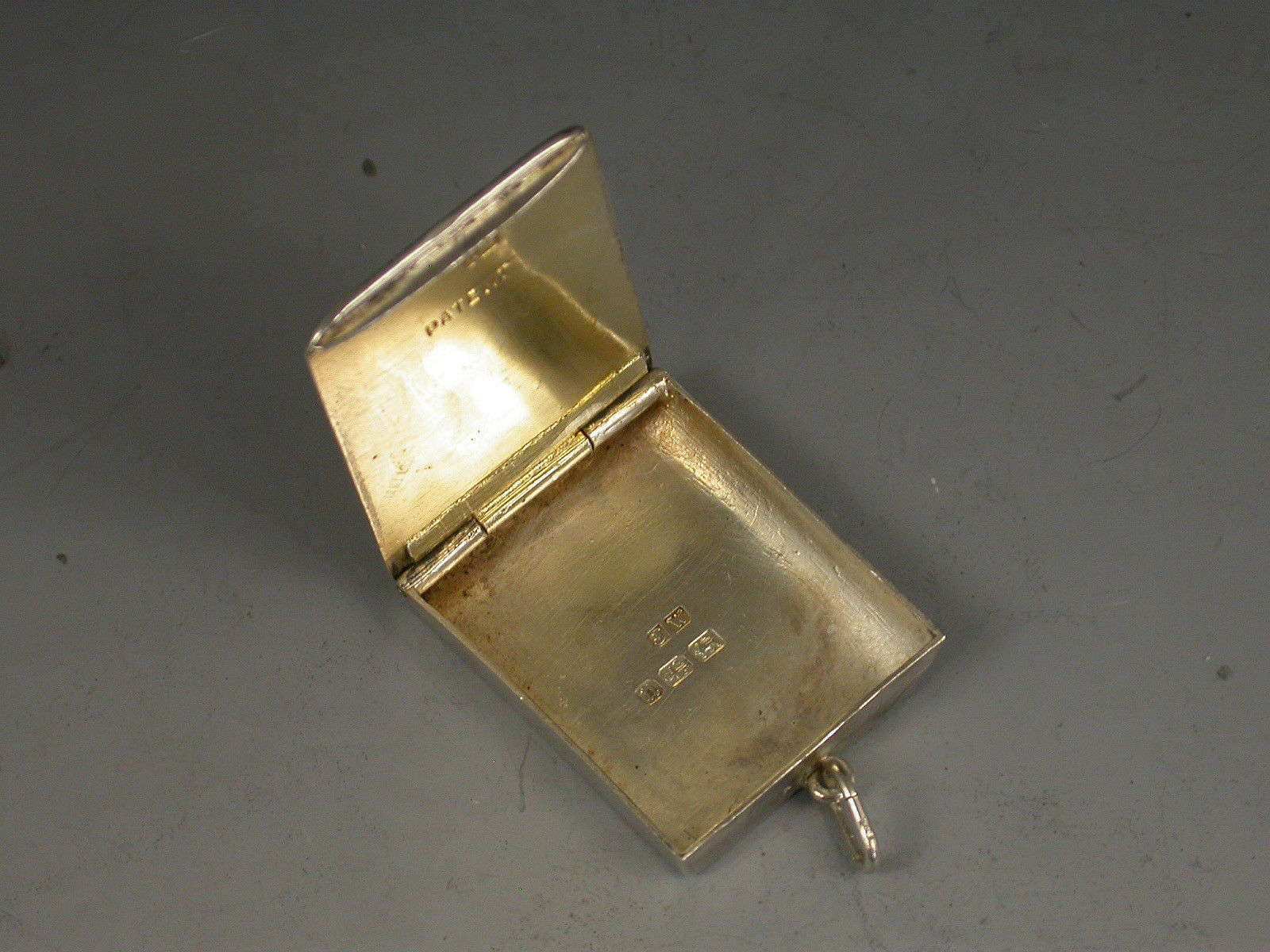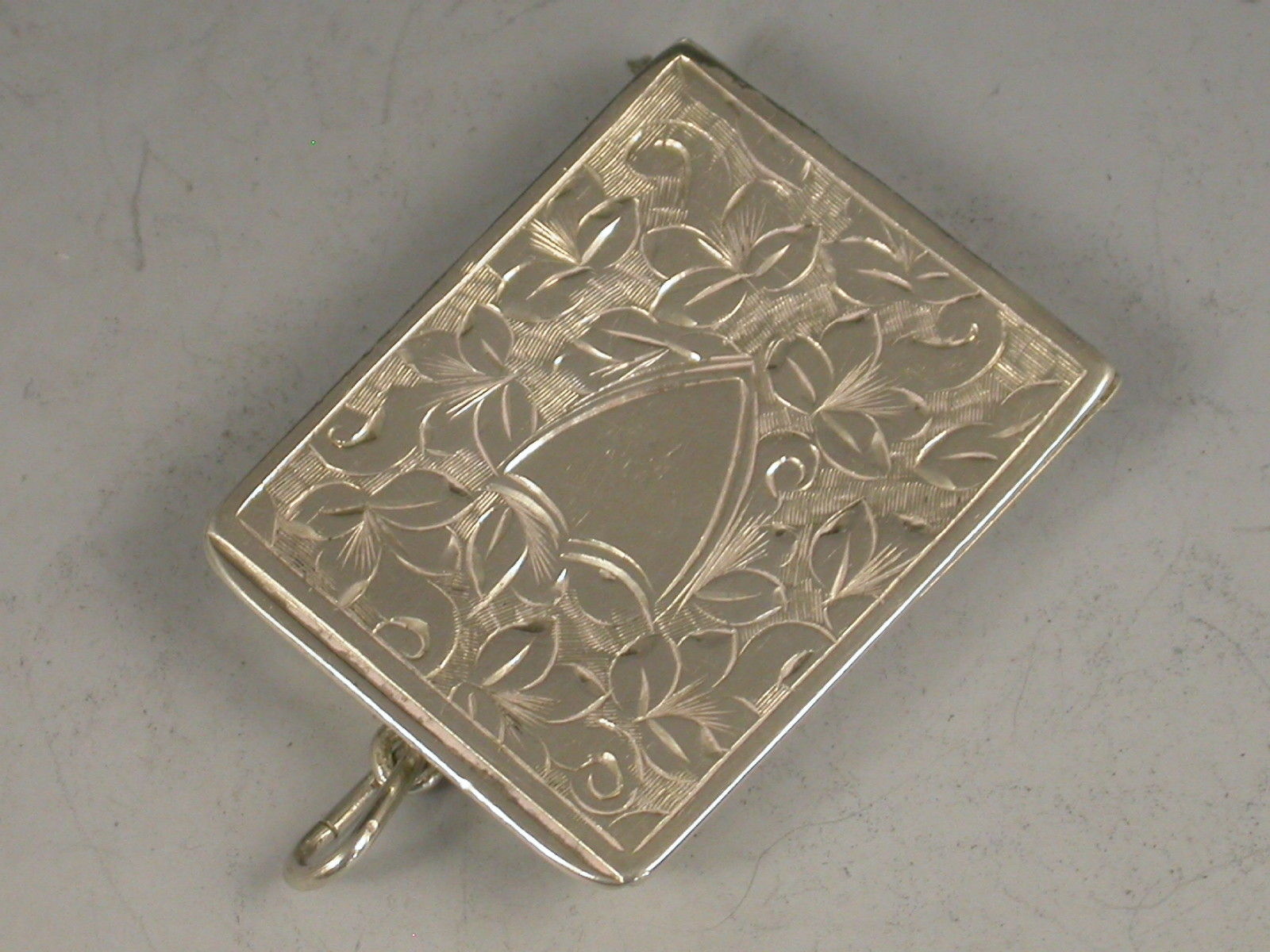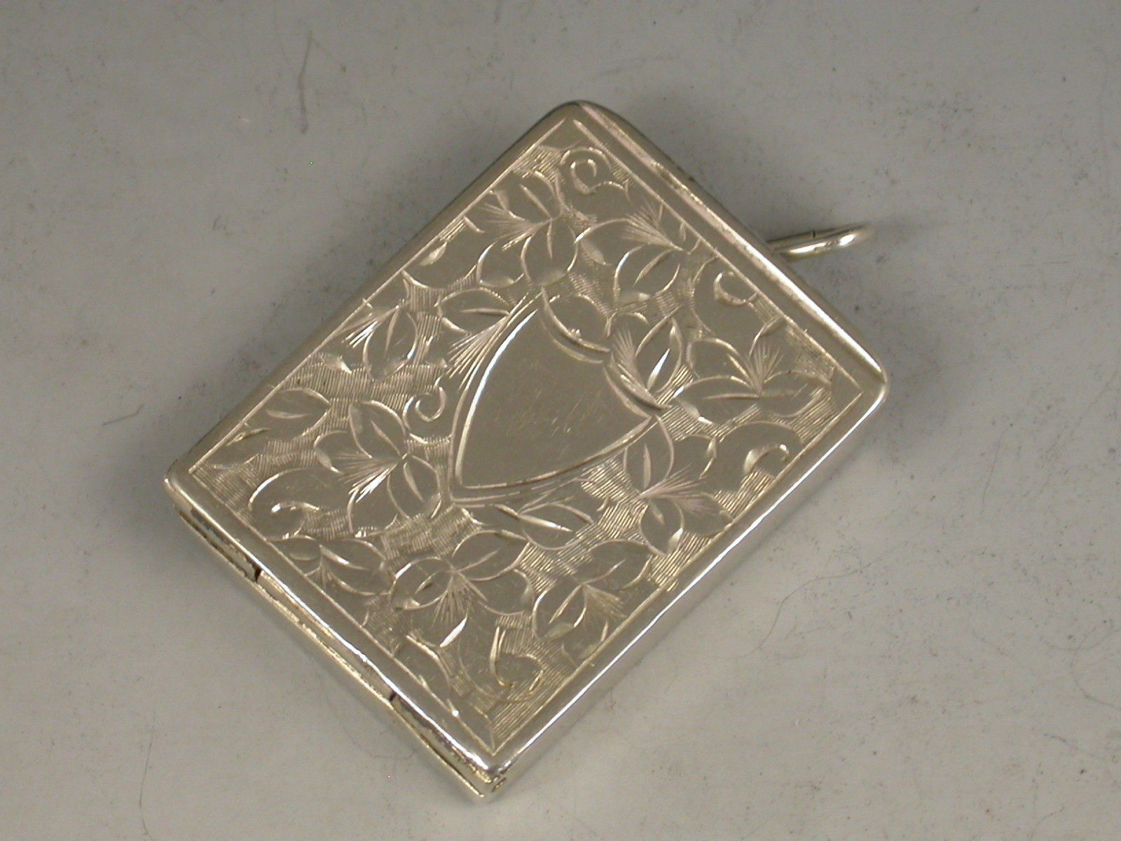 A Victorian silver Stamp Case of rounded rectangular locket form with hinged cover and attached suspension ring, engraved with ivy leaf decoration surrounding a shield shaped cartouche to the lid, silver gilt interior.