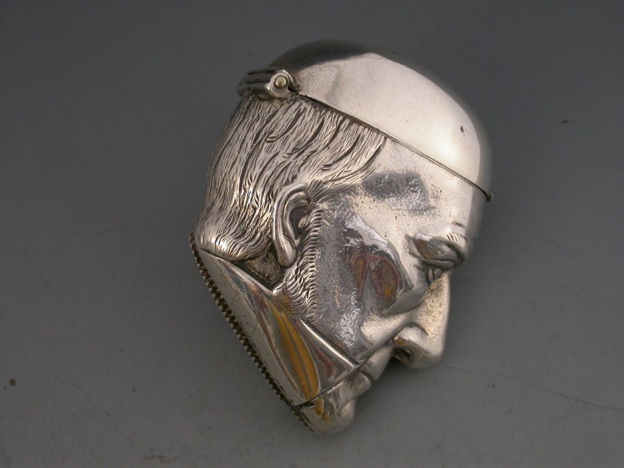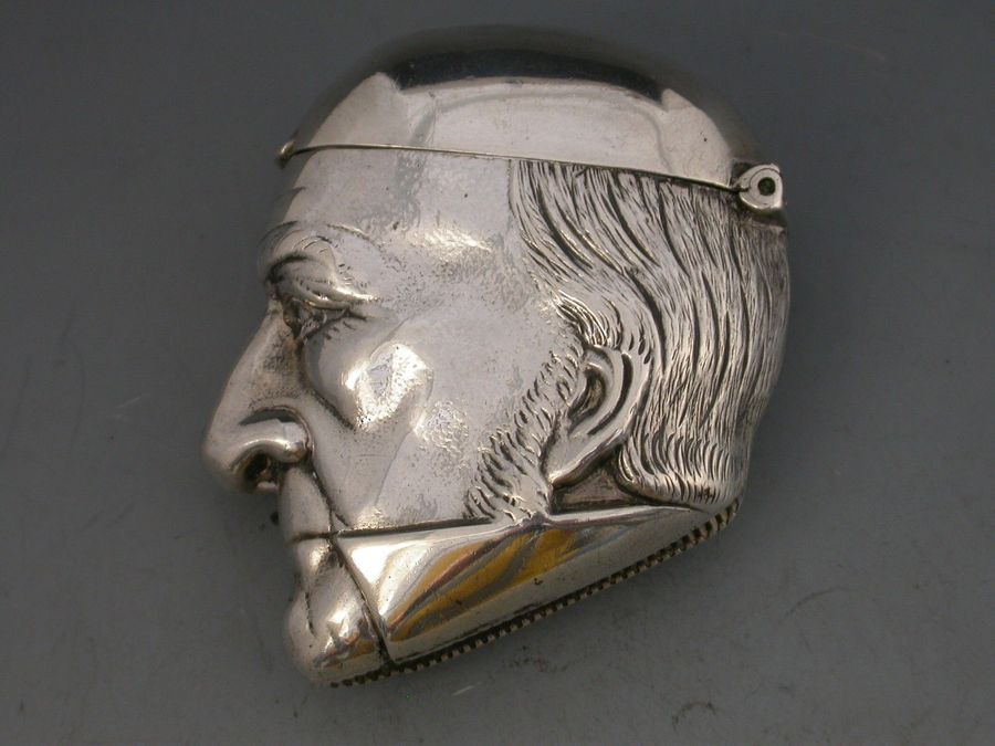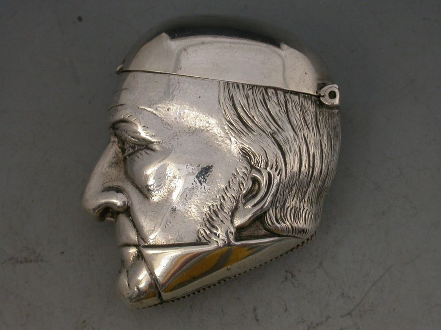 A rare Victorian silver figural Vesta Case depicting a bust of William Gladstone, with hinged flip-top lid and striker to the base.