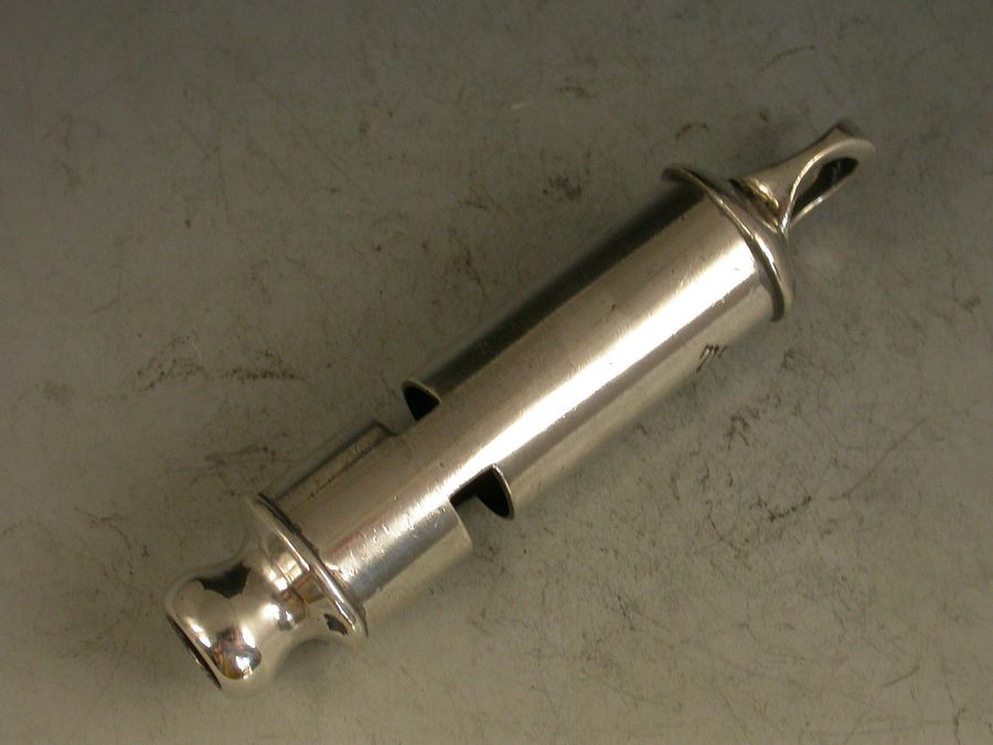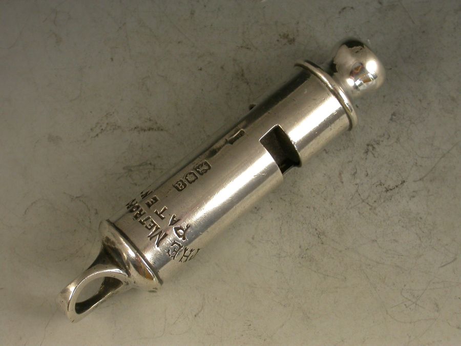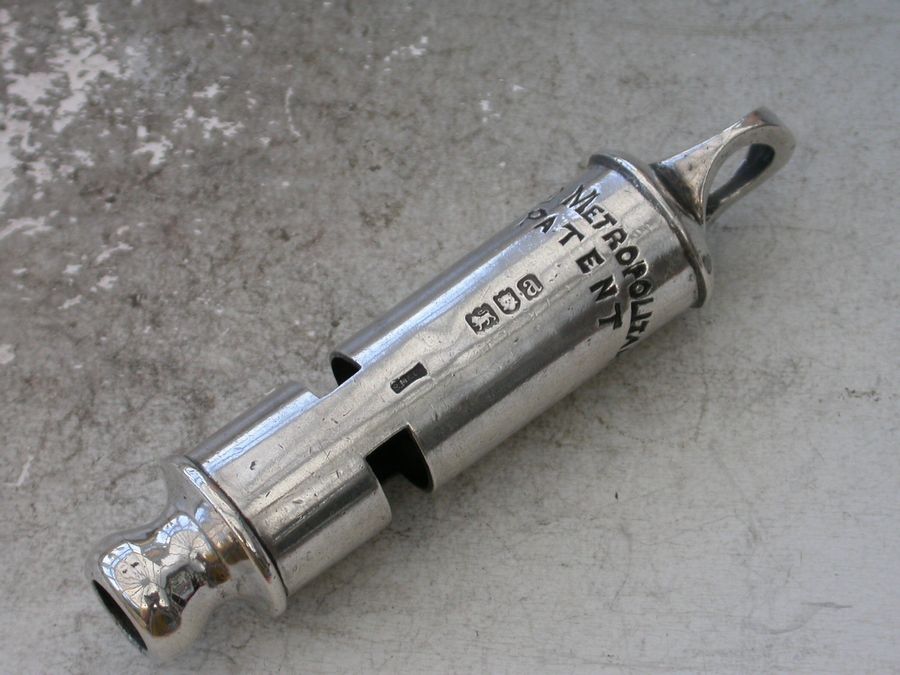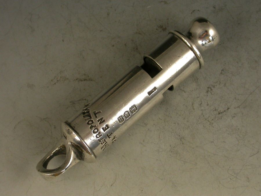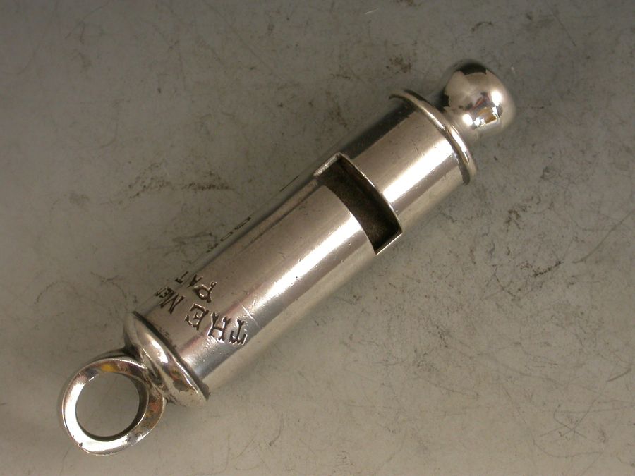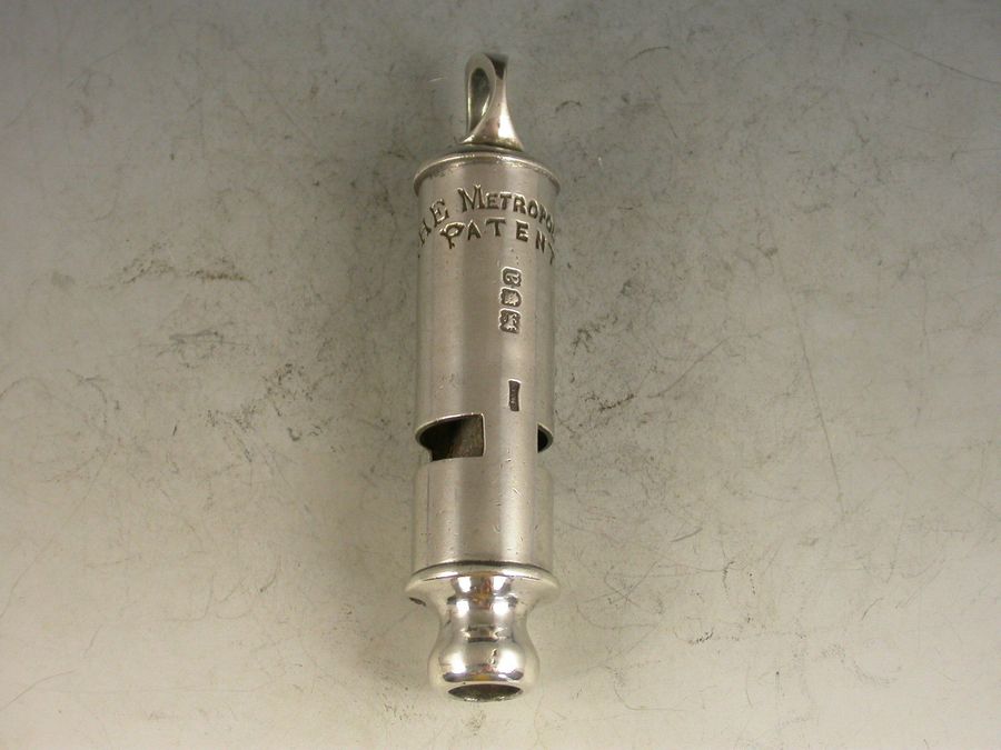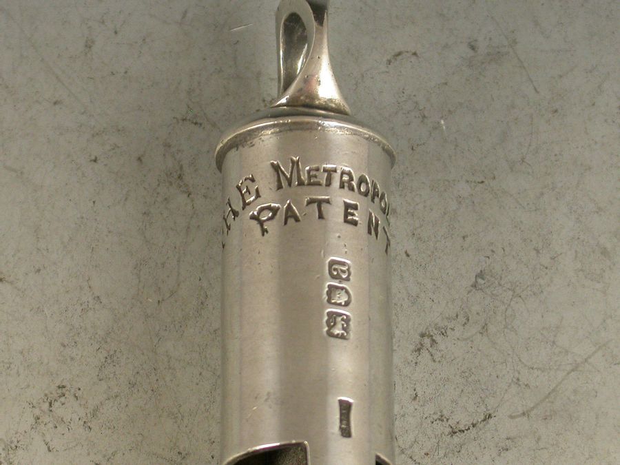 A rare fully hallmarked Victorian silver Metropolitan Patent Police 'type' Whistle with a Hudson's Patent mechanism.