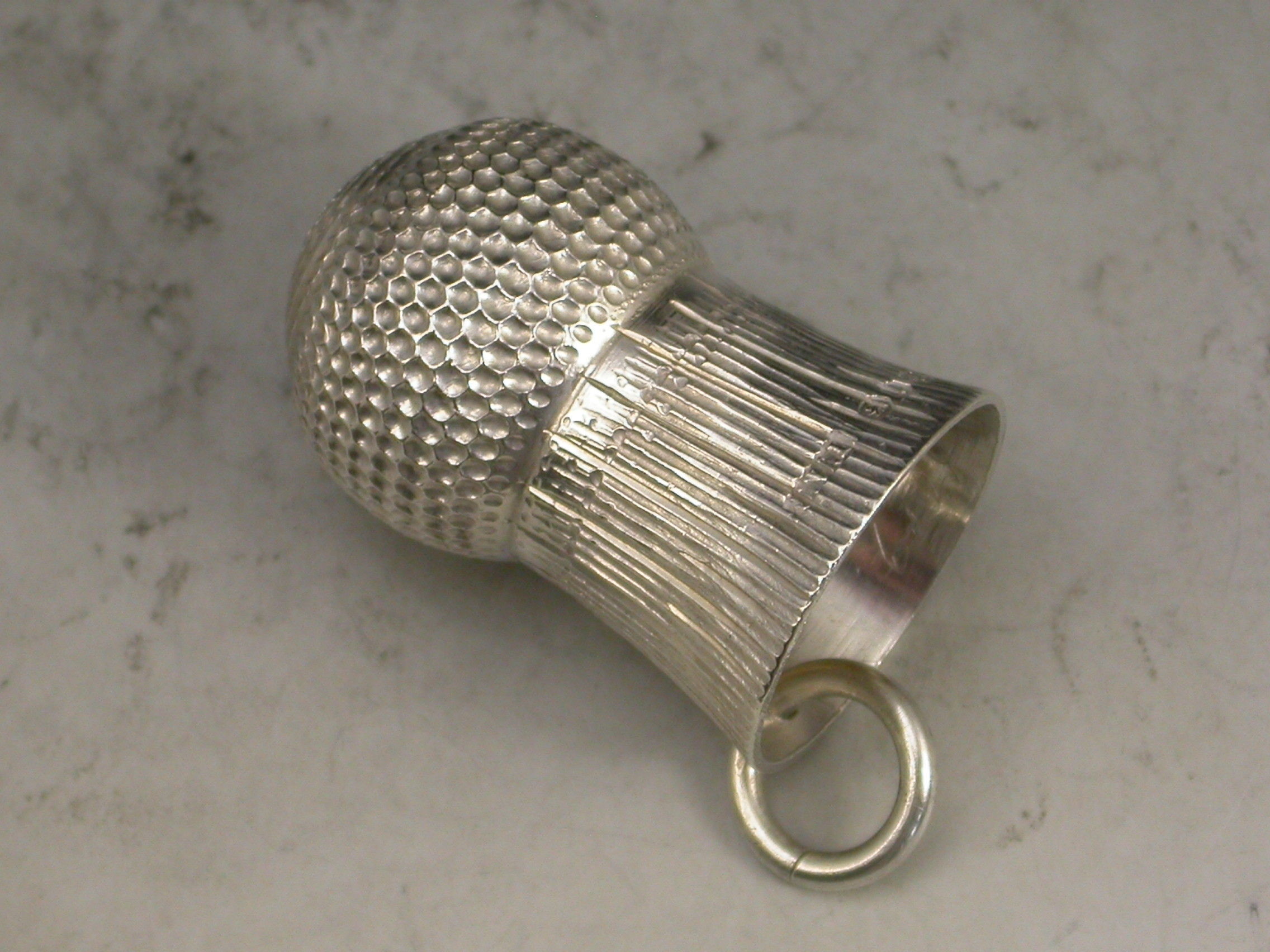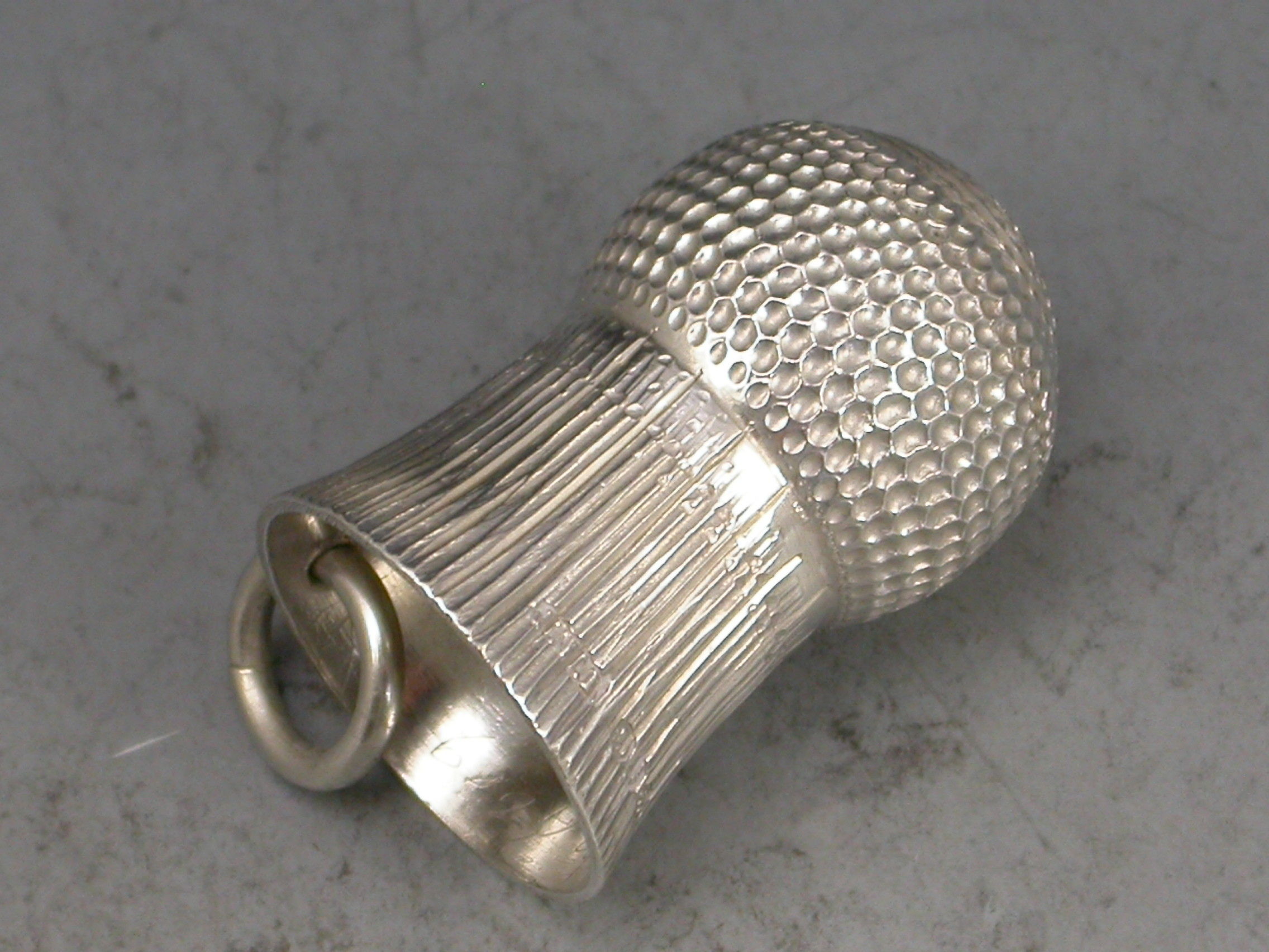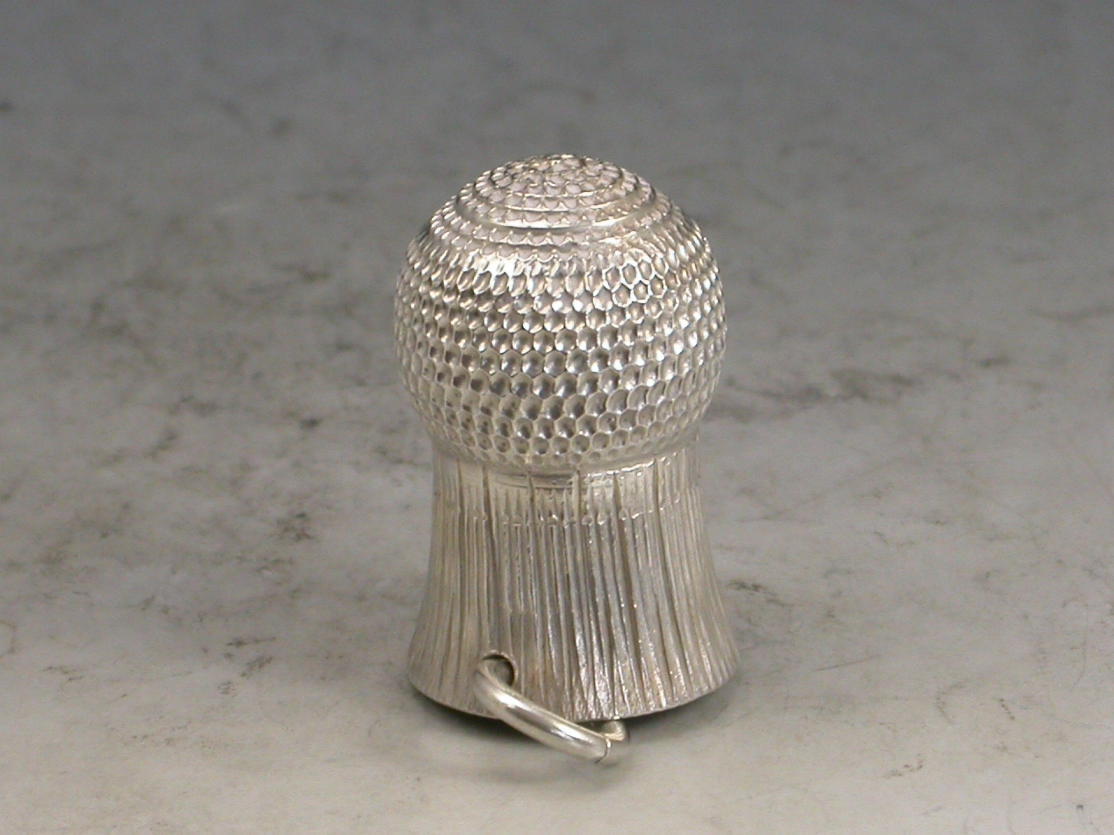 A Victorian fully hallmarked silver Thimble, made in the form of a Thistle Head, with attached suspension ring.