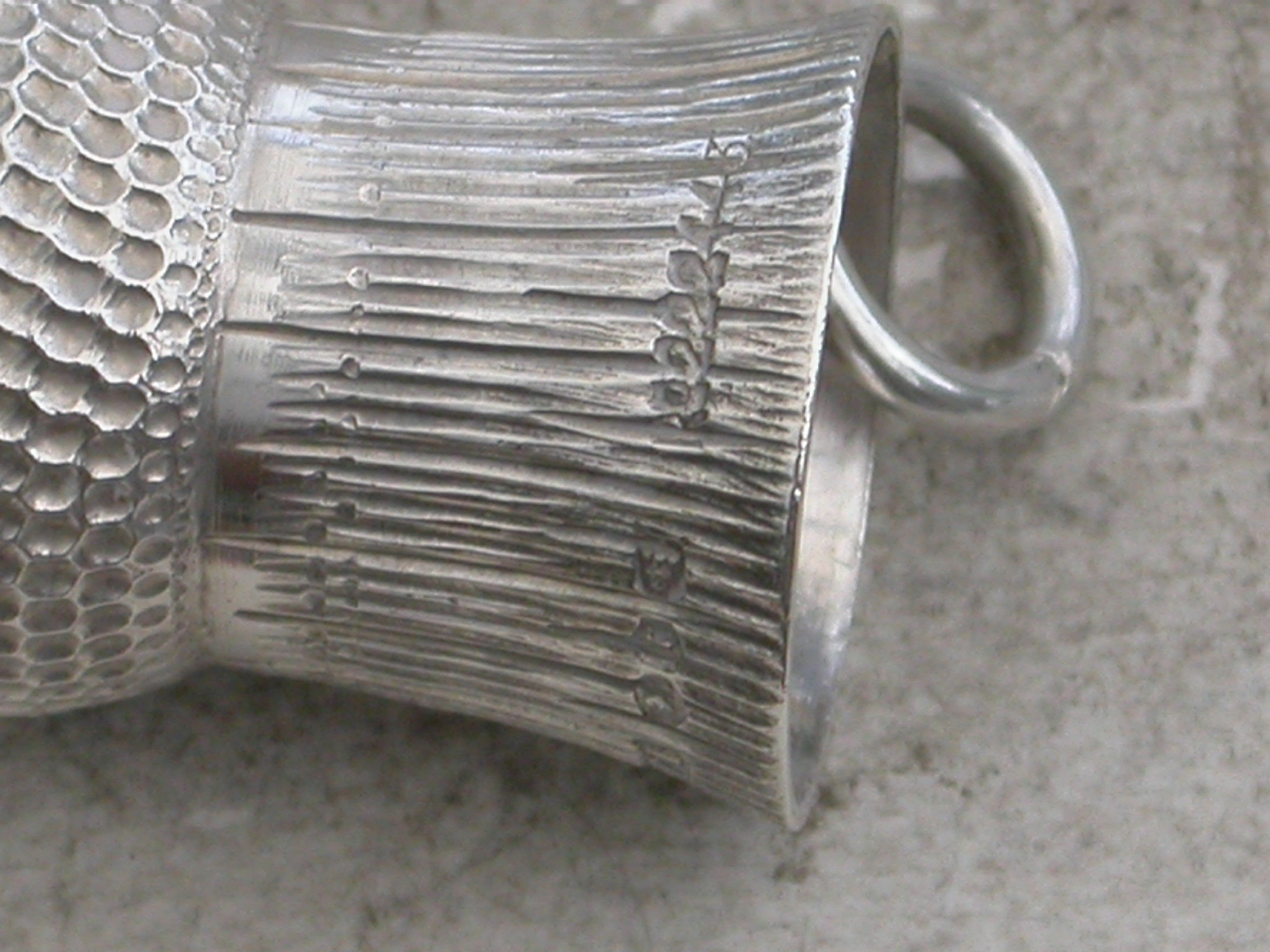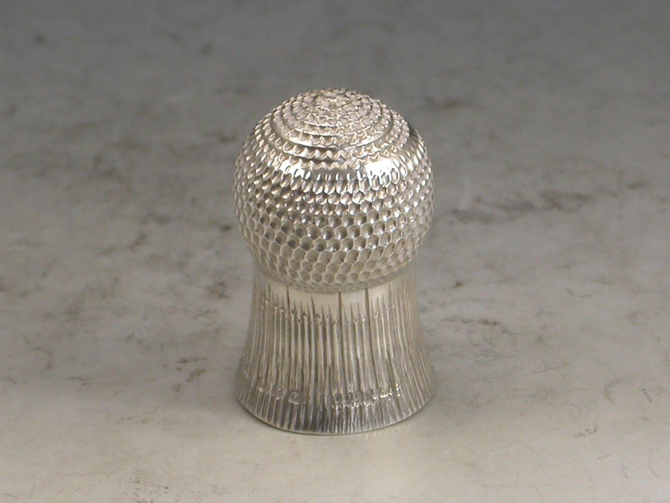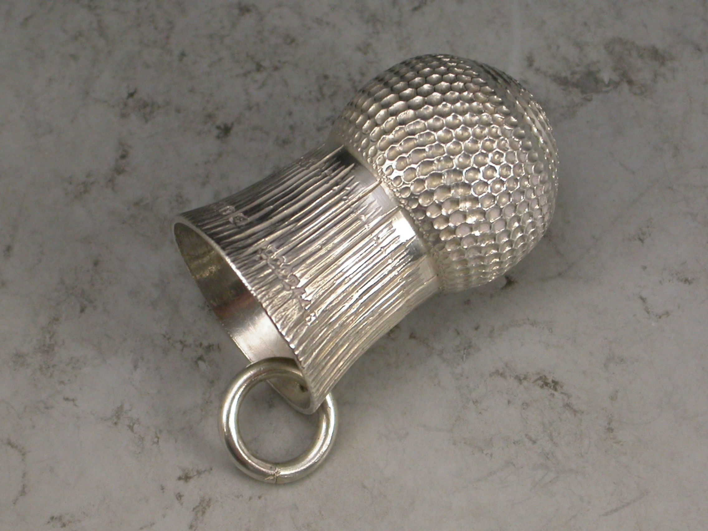 A Victorian fully hallmarked silver Thimble, made in the form of a Thistle Head, with attached suspension ring.