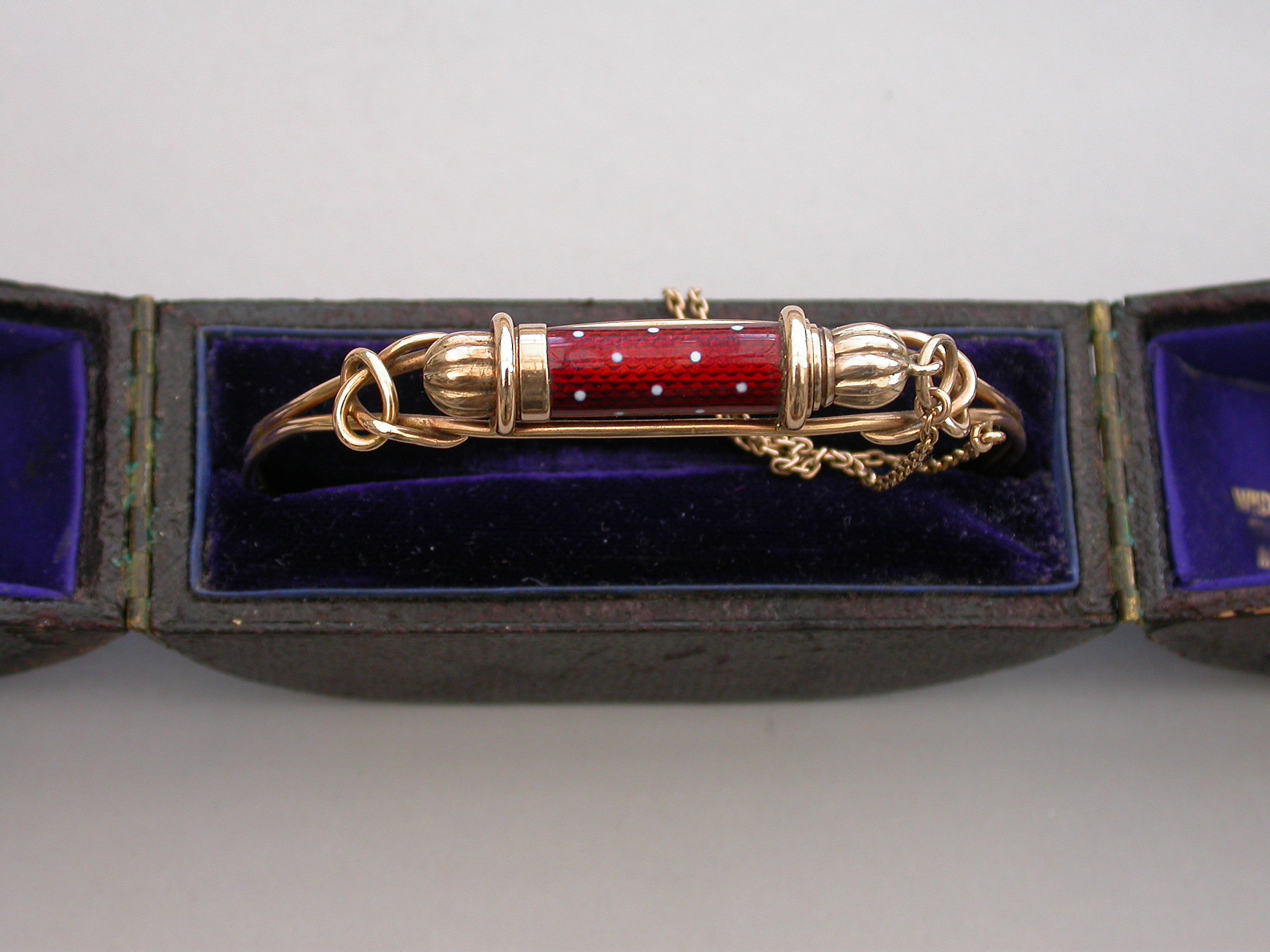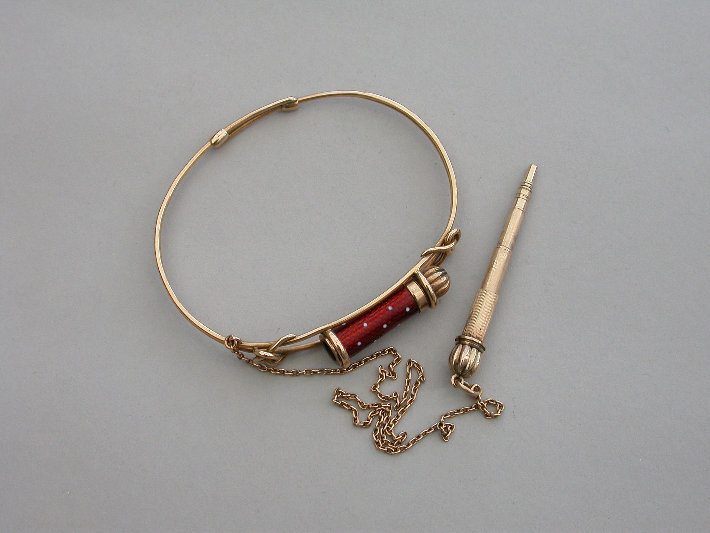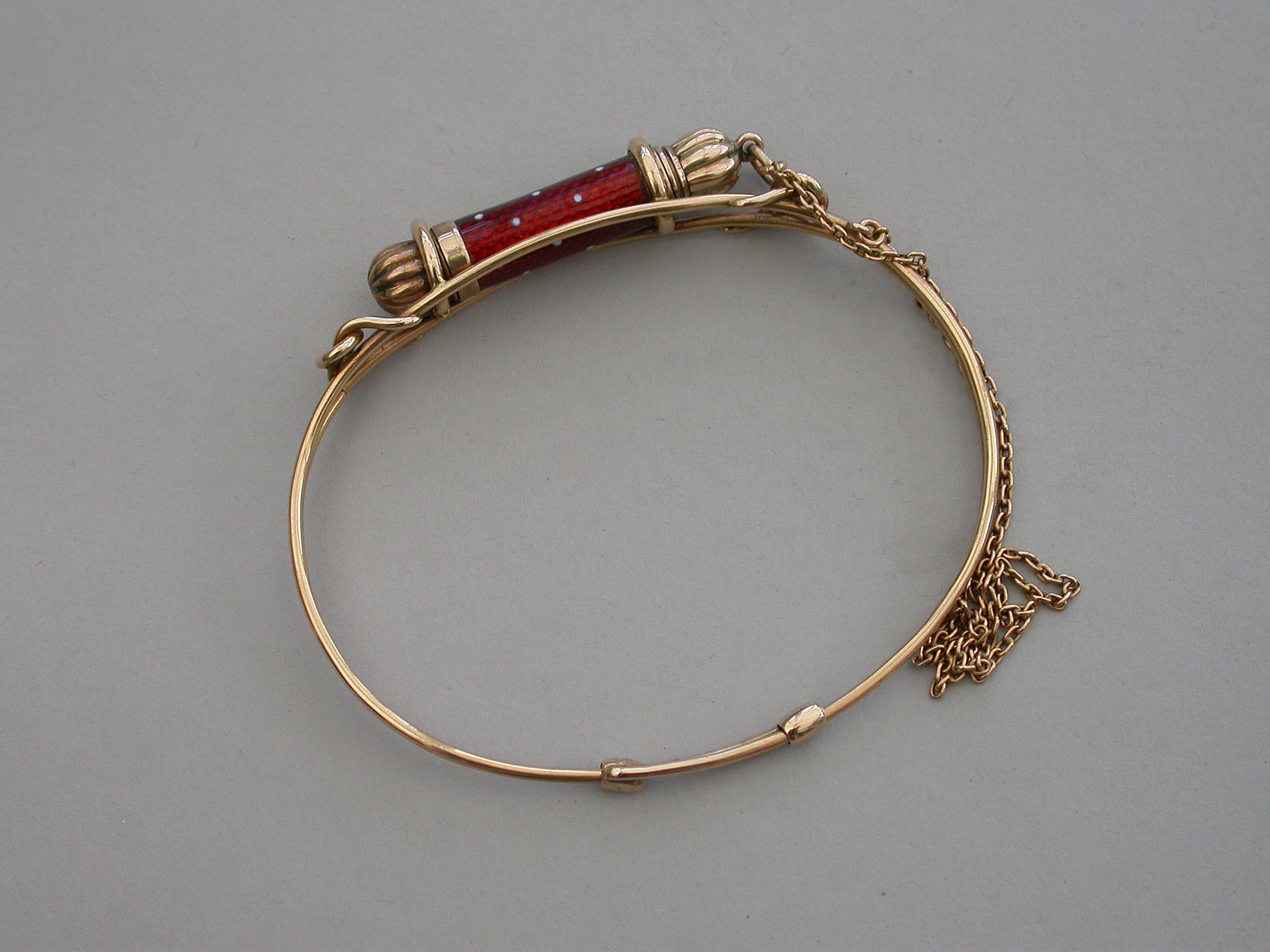A fine quality Victorian gold Bangle of sprung hooped form with wirework cage surmounted by a gold telescopic propelling pencil housed in a red guilloche enamel sheath with white dots. Complete with attached safety chain and silk and velvet lined leather retailers case.
