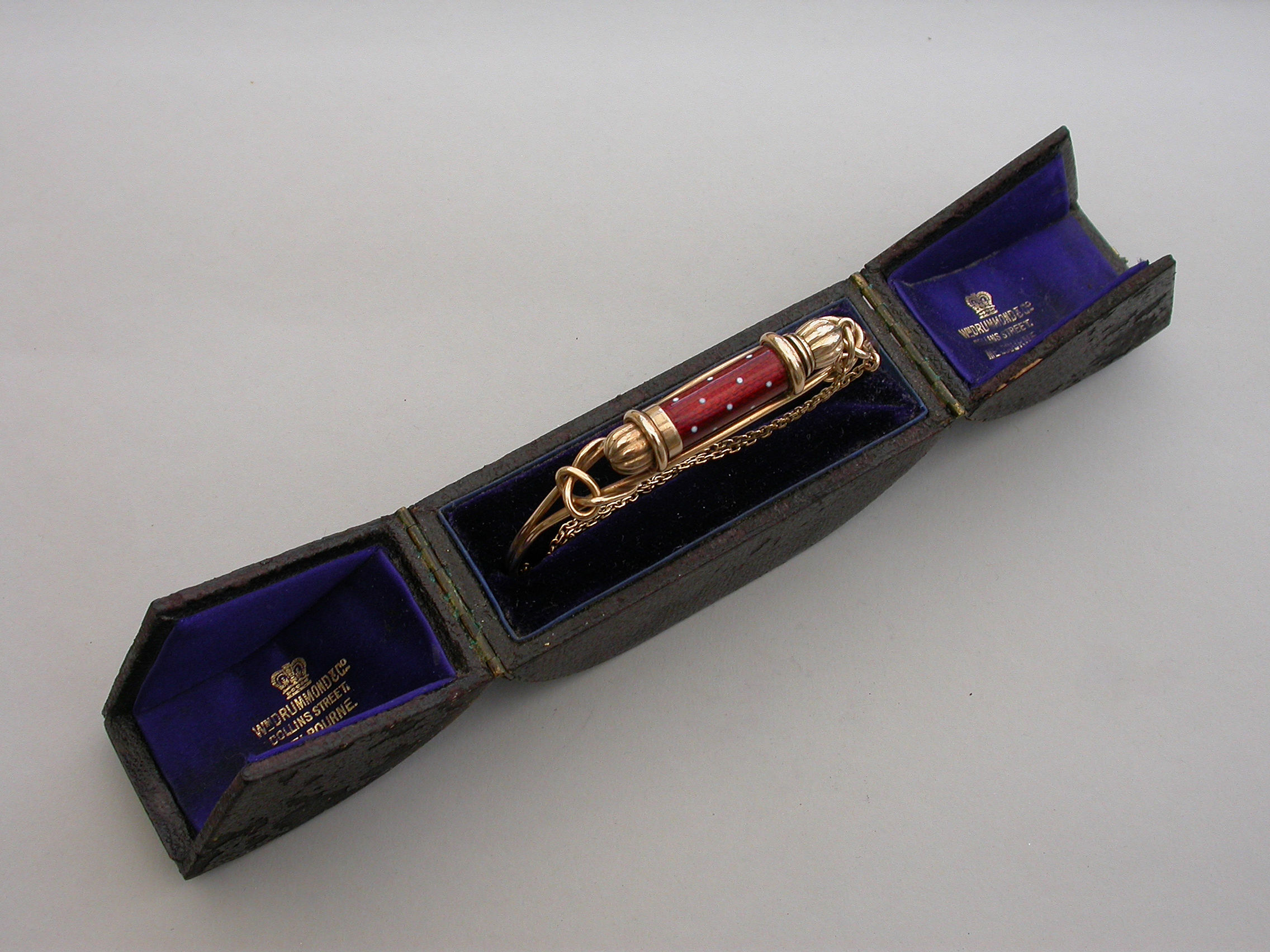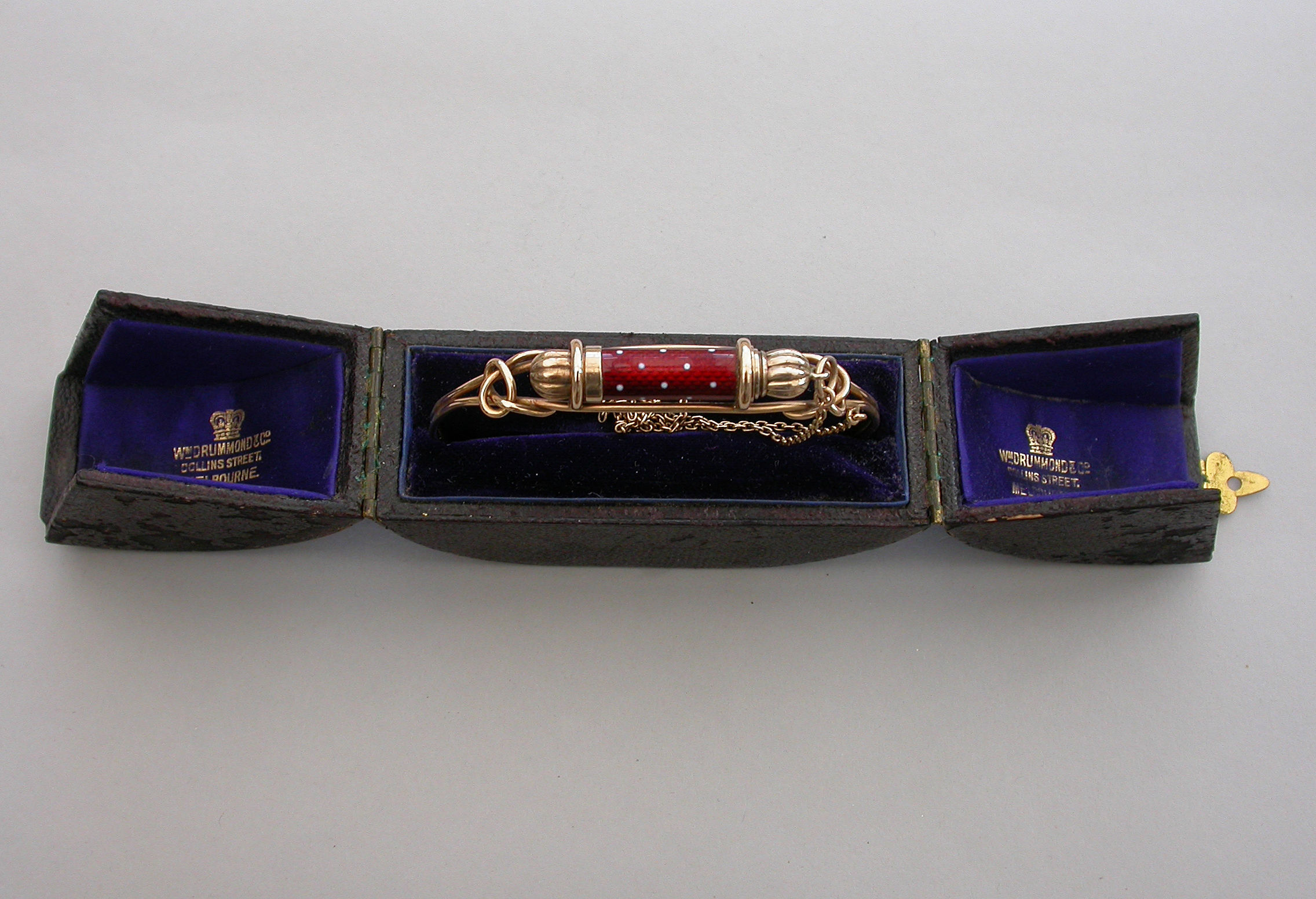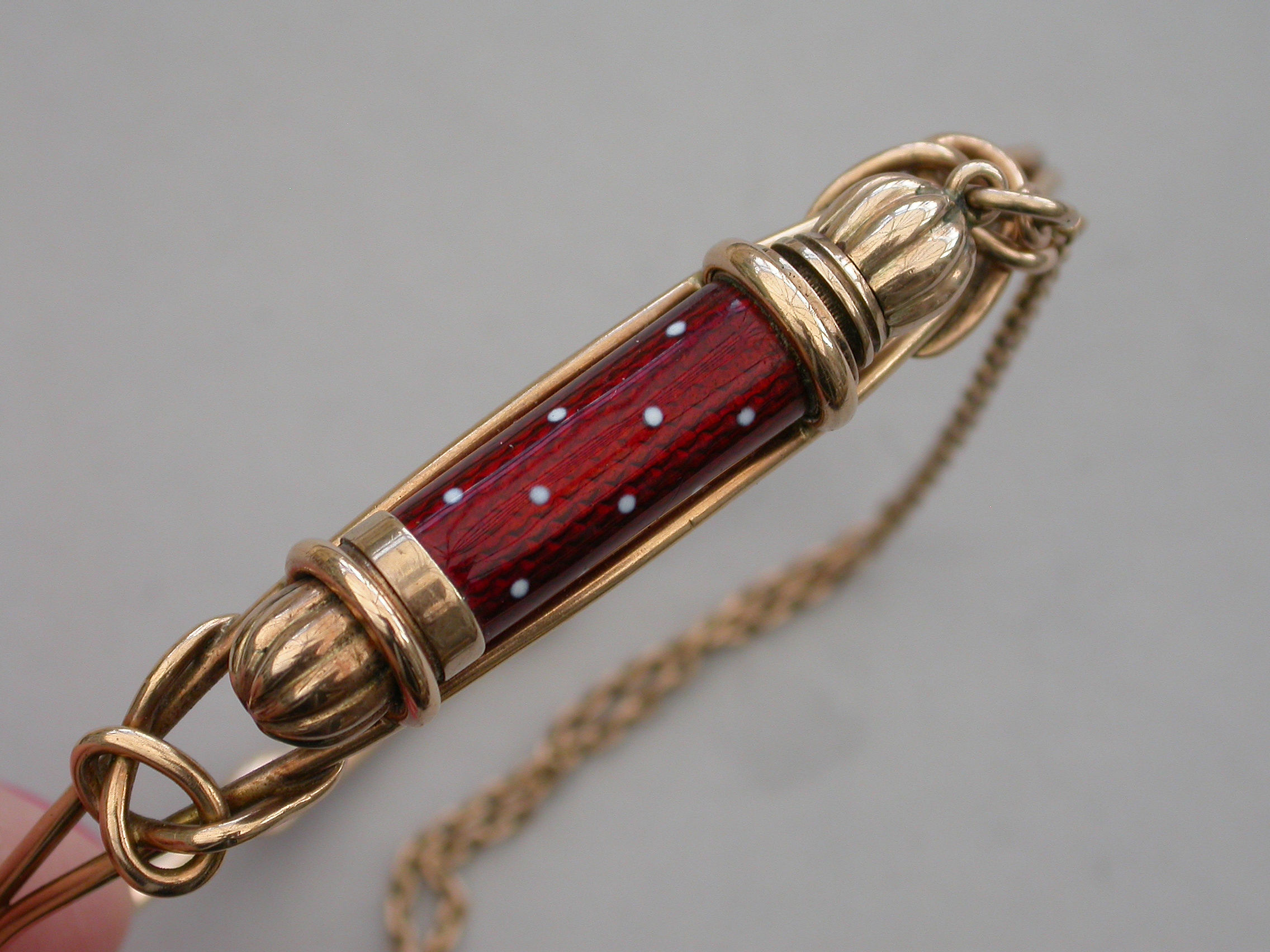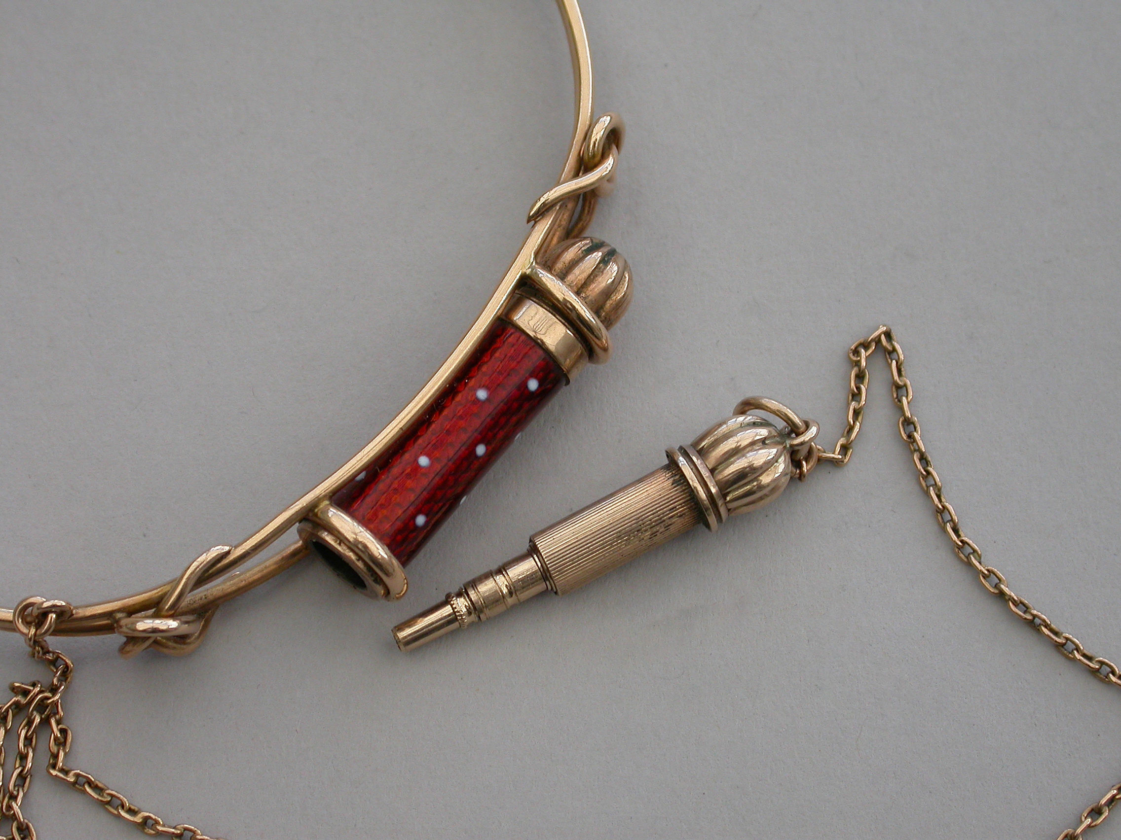 A fine quality Victorian gold Bangle of sprung hooped form with wirework cage surmounted by a gold telescopic propelling pencil housed in a red guilloche enamel sheath with white dots. Complete with attached safety chain and silk and velvet lined leather retailers case.