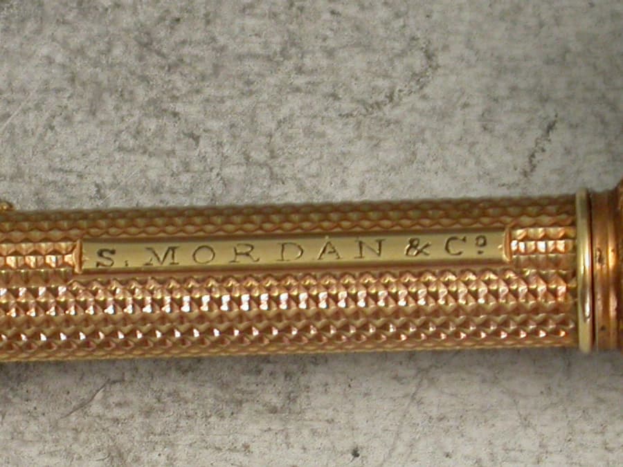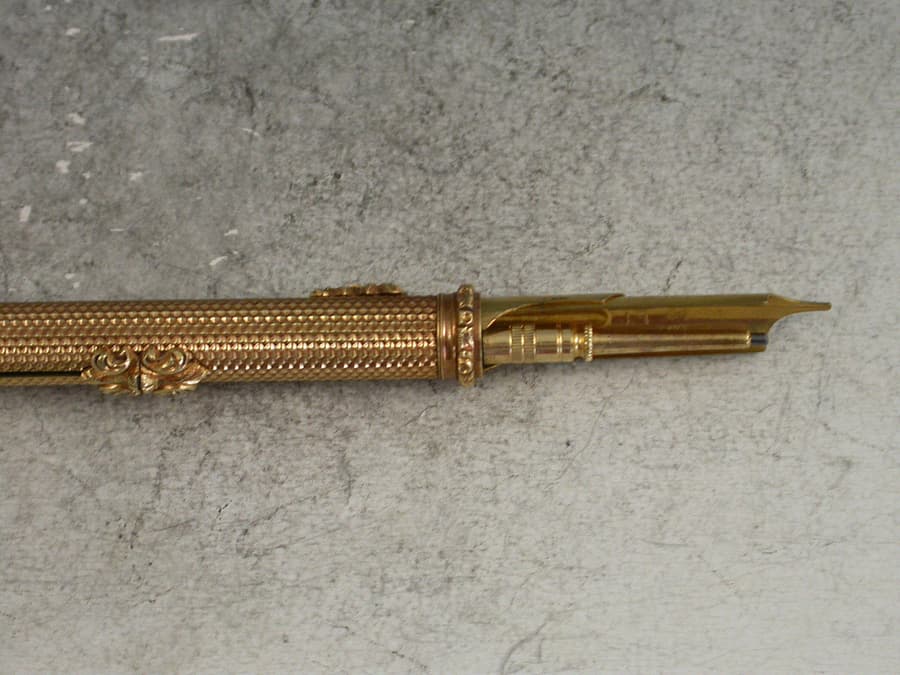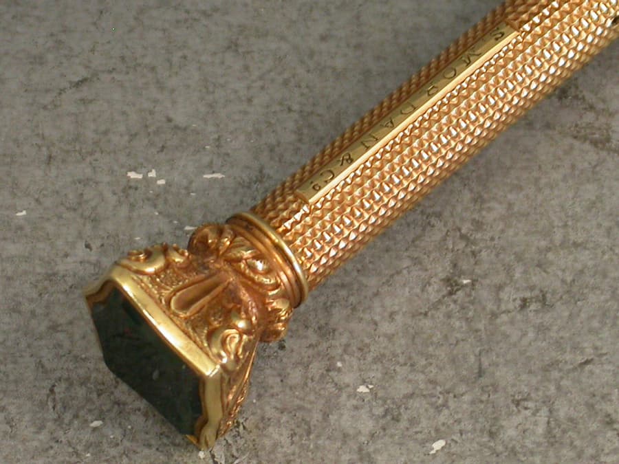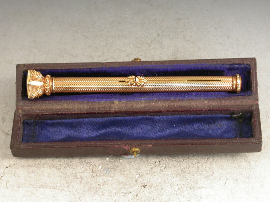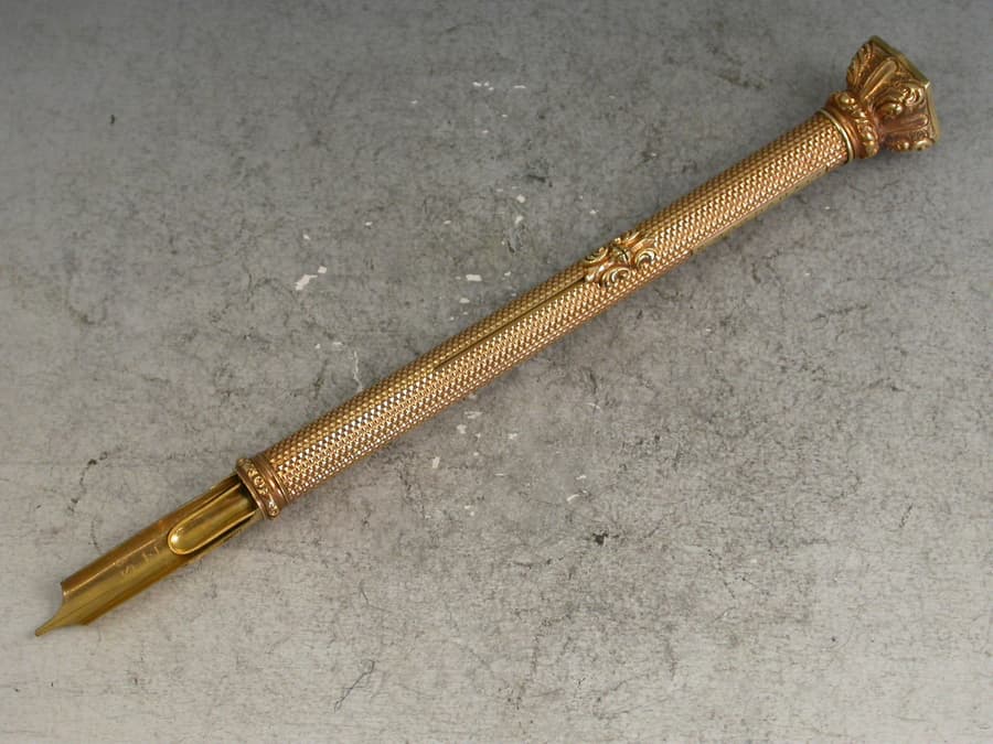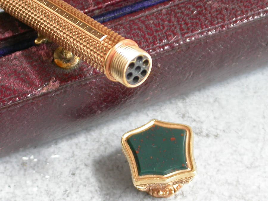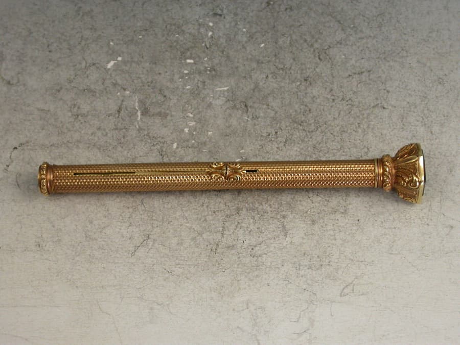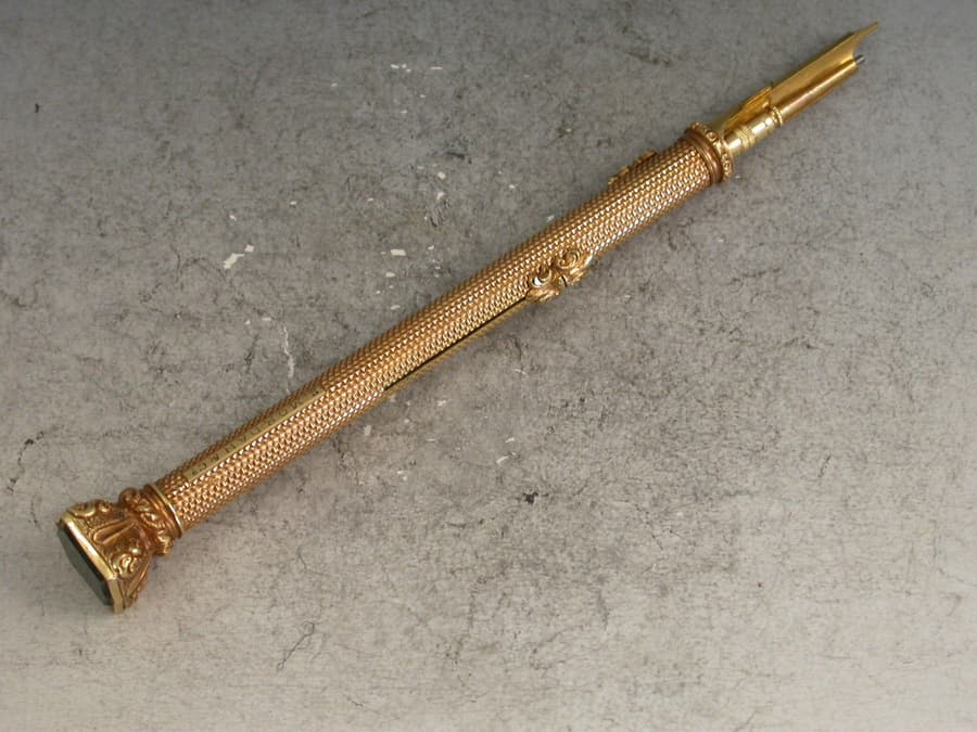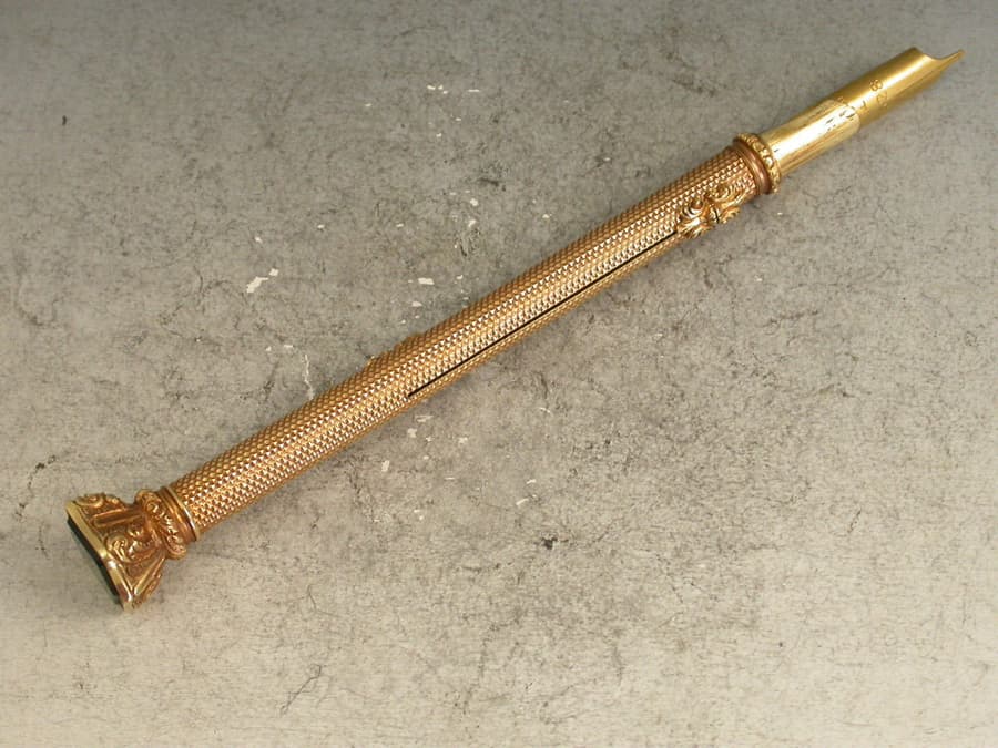 A good quality mid 19th century combined gold Propelling Pencil and Pen with engine turned tubular body, two raised foliate scroll slider buttons extending the pen and the pencil, the cast foliate scroll decorated seal terminal set with a shield shaped blood stone seal and unscrewing to reveal a lead reservoir.