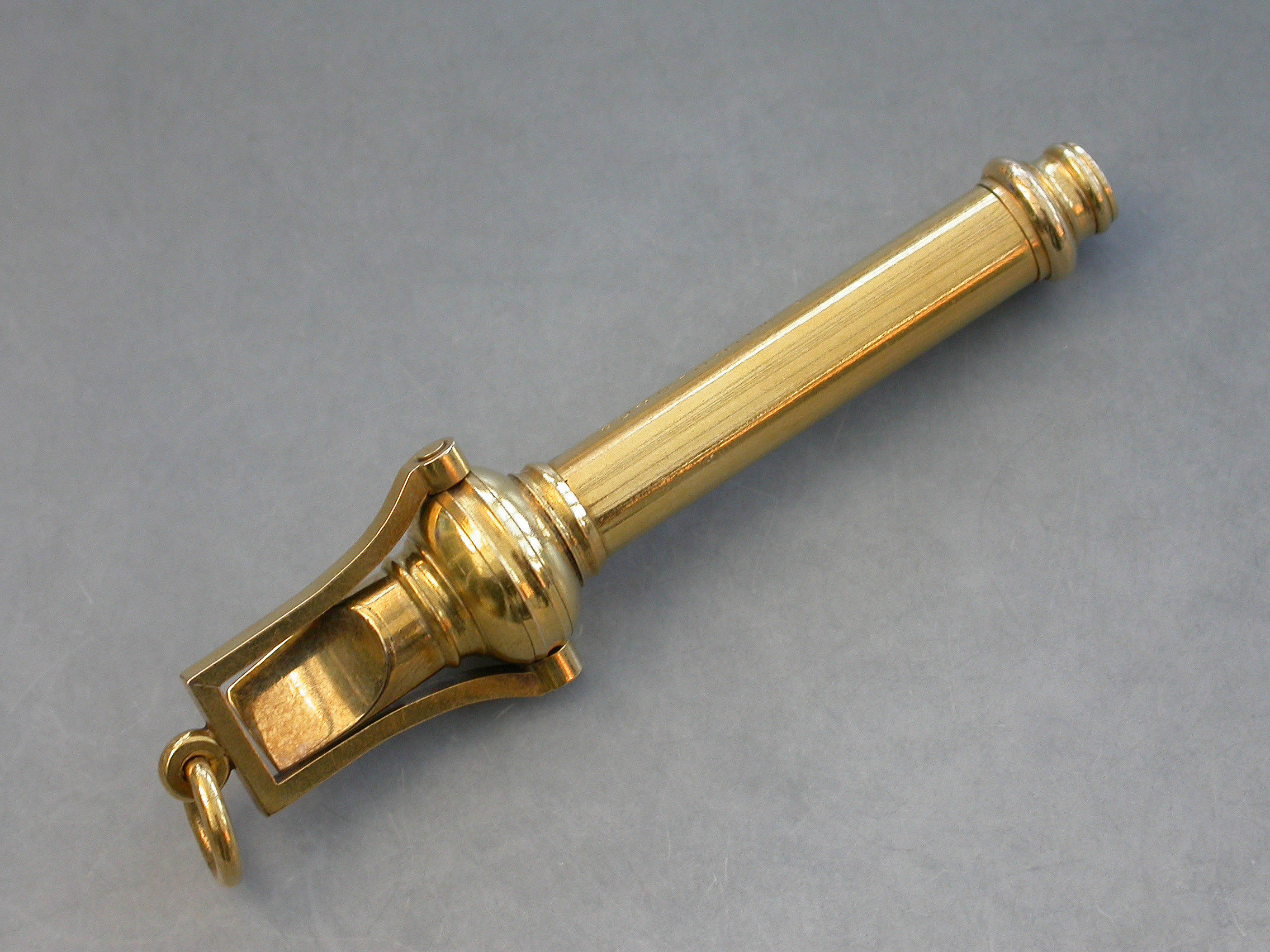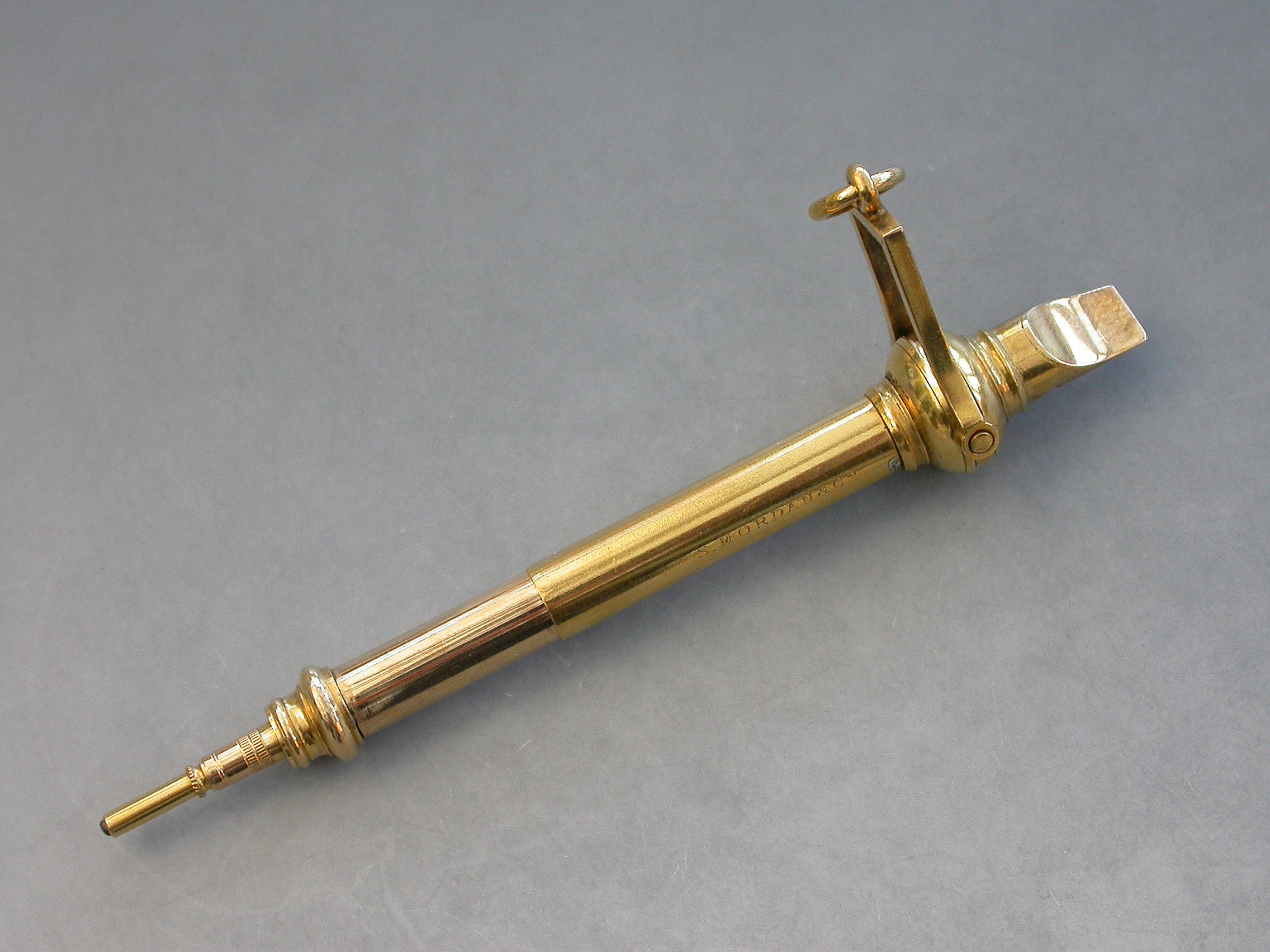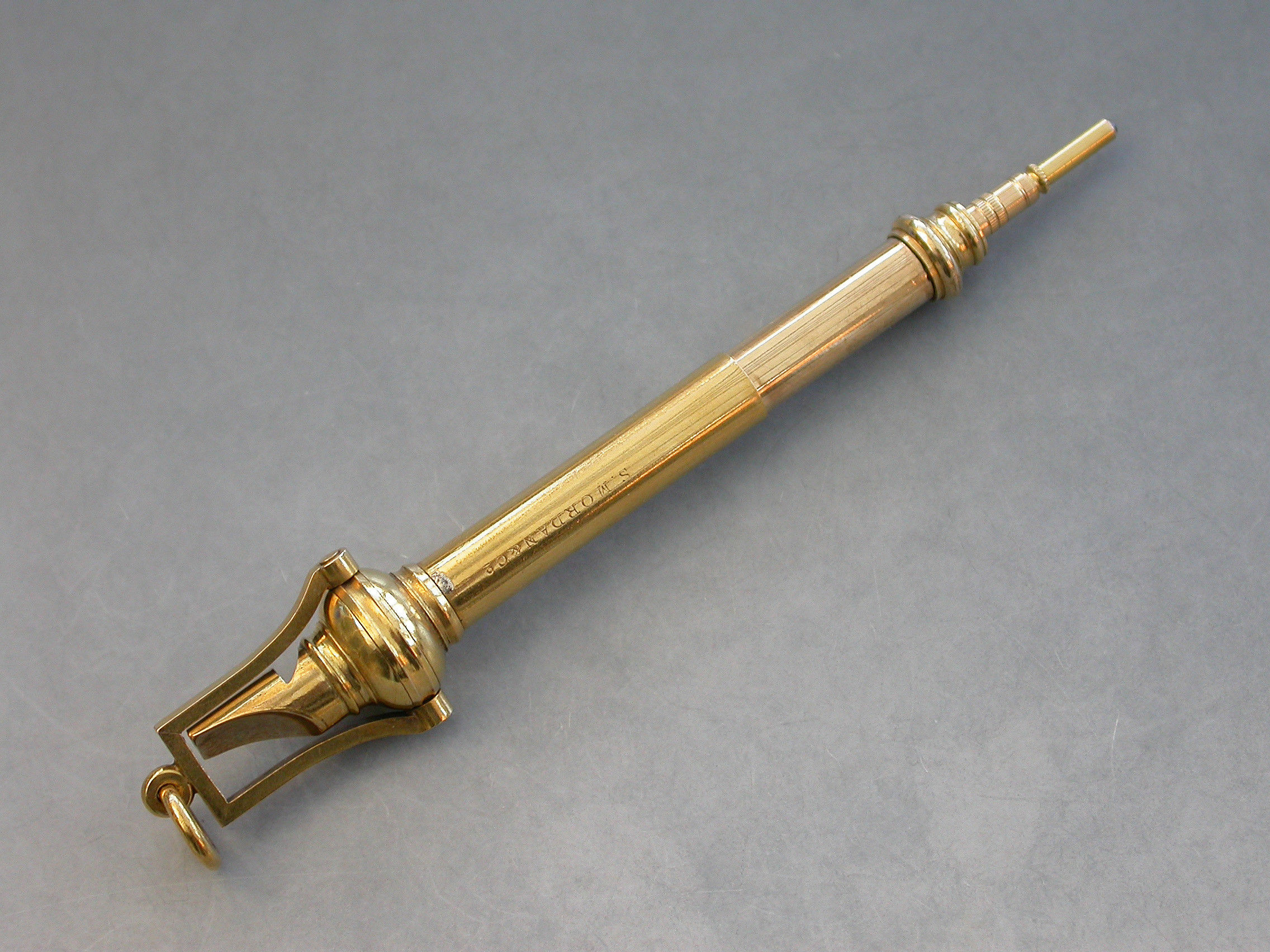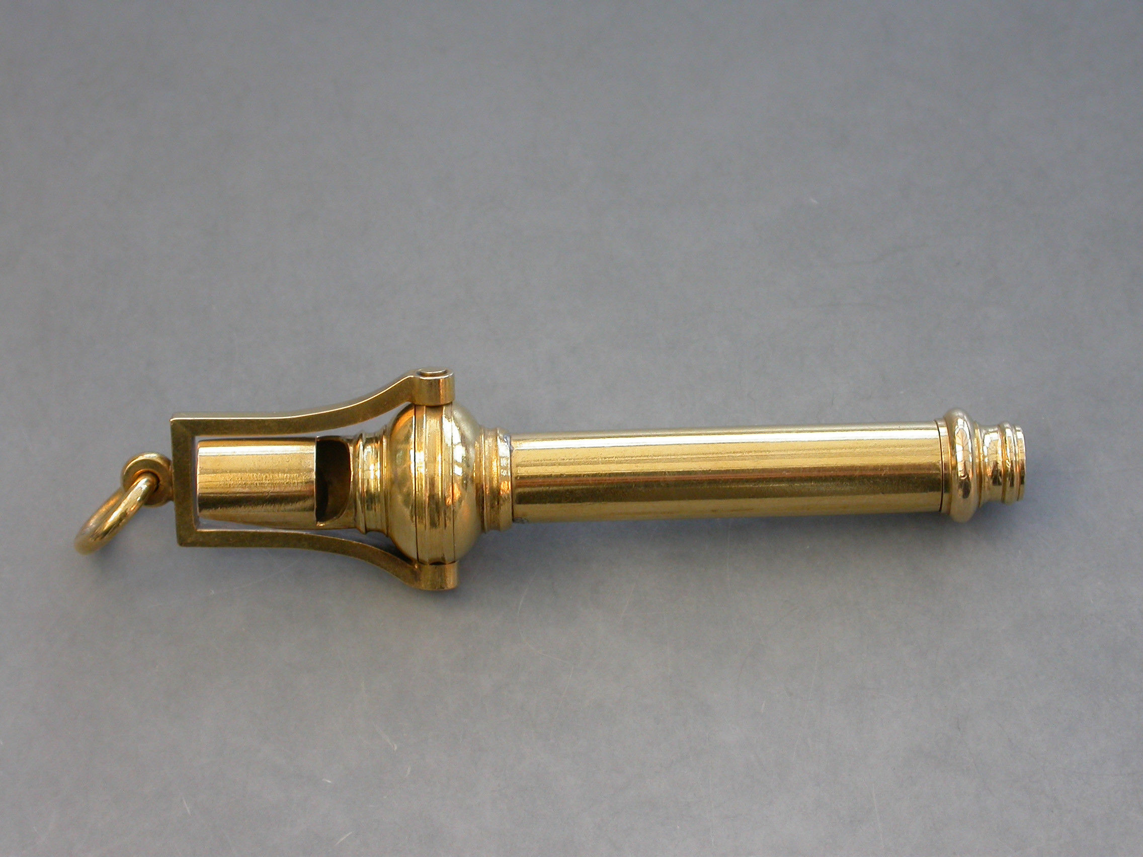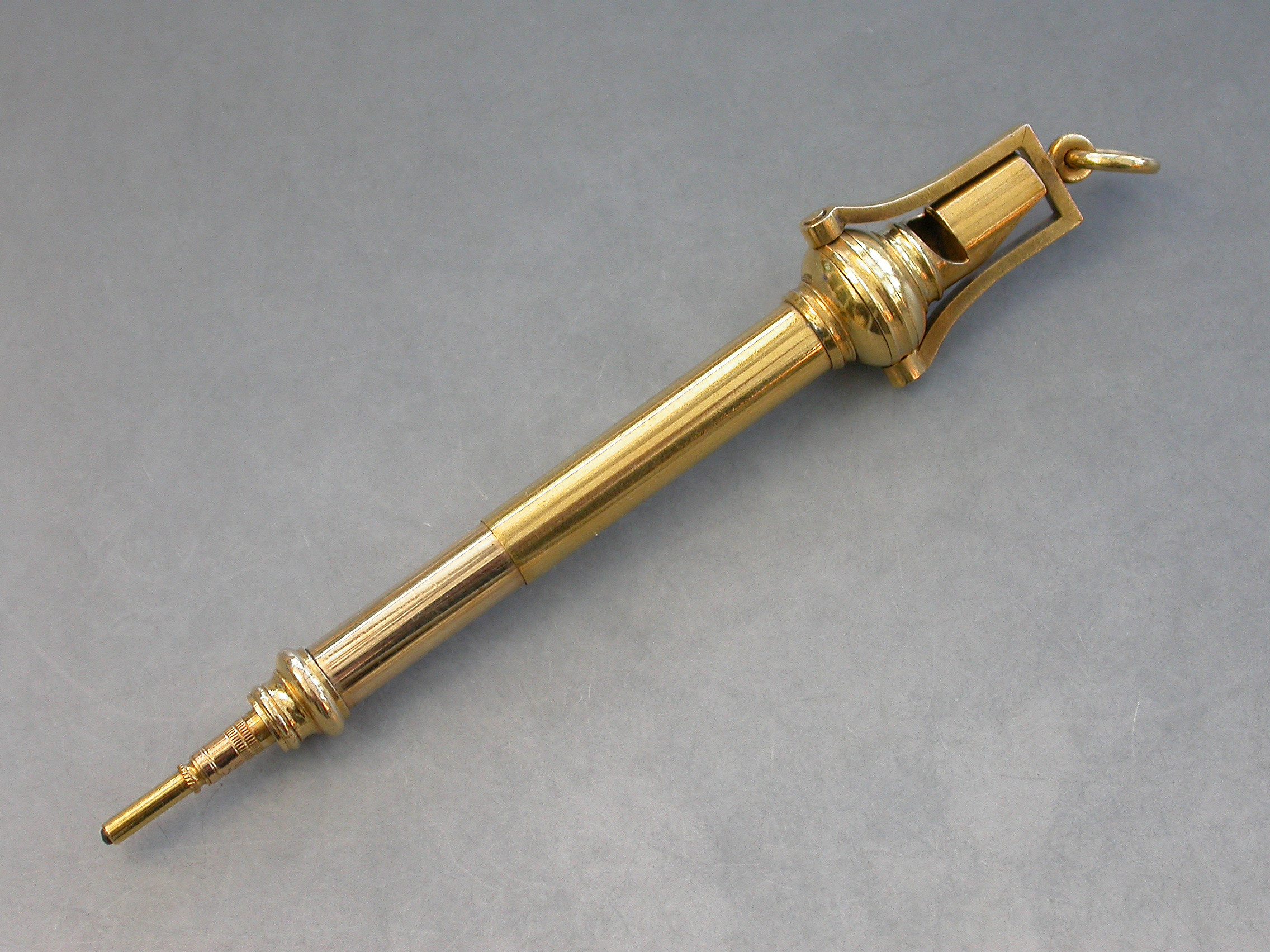 A fine quality late Victorian high carat gold combined Whistle and Telescopic Propelling Pencil with attached stirrup shaped suspension ring.