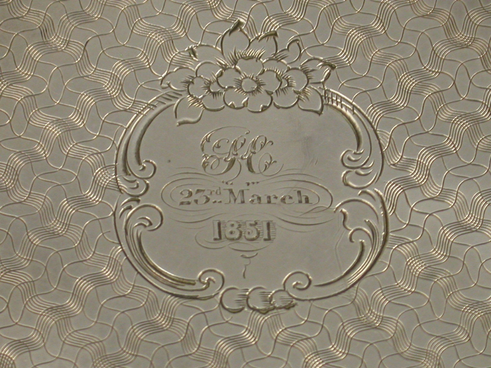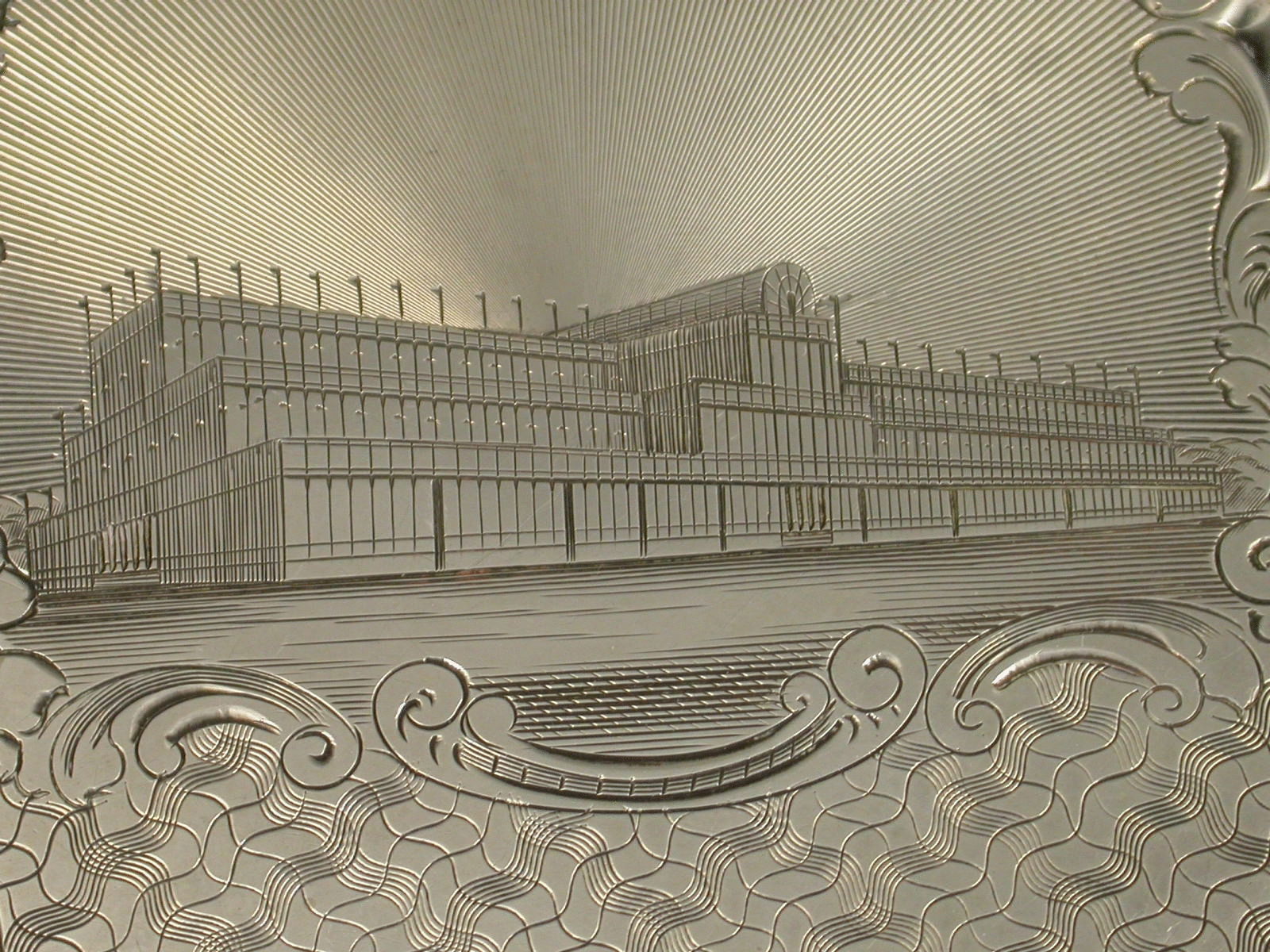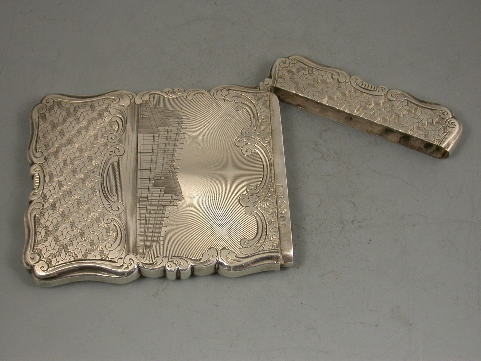 A fine Victorian silver Card Case of shaped rectangular form, the body engraved with an unusual cross hatched pattern and a depiction of Crystal Palace in a shaped cartouche with a rayed background. A souvenir from the Great Exhibition in 1851. The reverse with contemporary inscription.