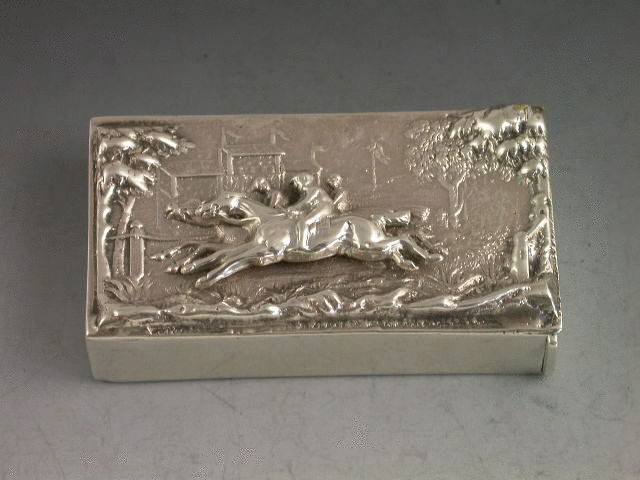 A good Victorian silver Vesta Case with hinged flip top lid and striker, the top with raised scene depicting three horses and jockeys racing past a grandstand. The base with later engraved inscription.