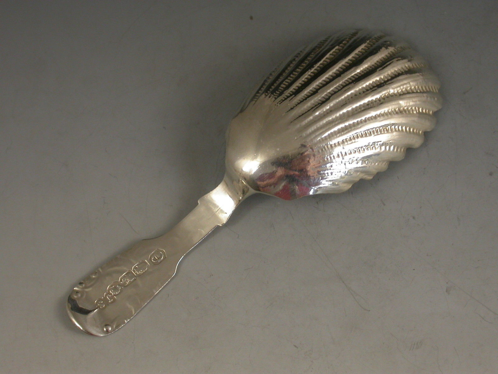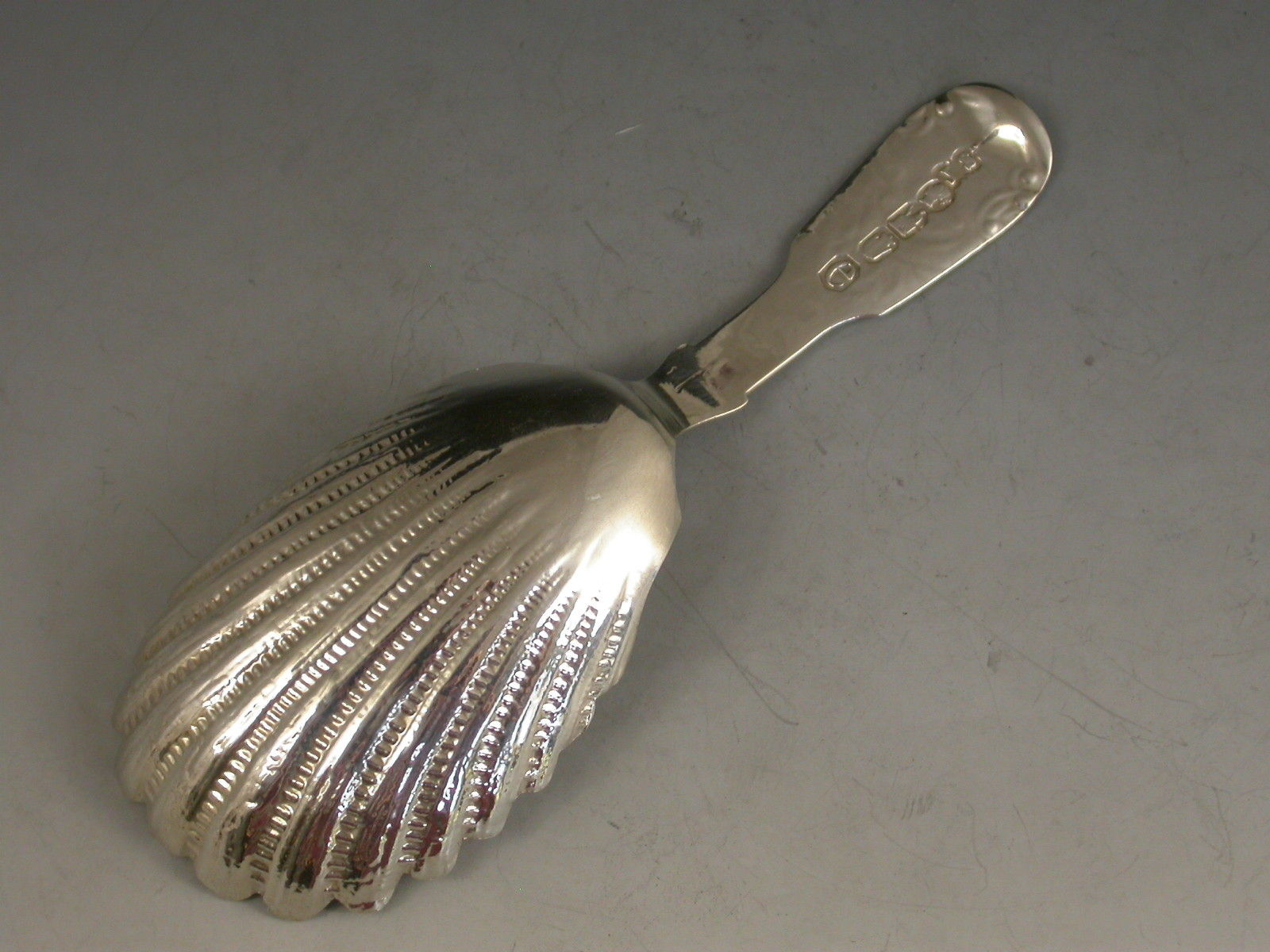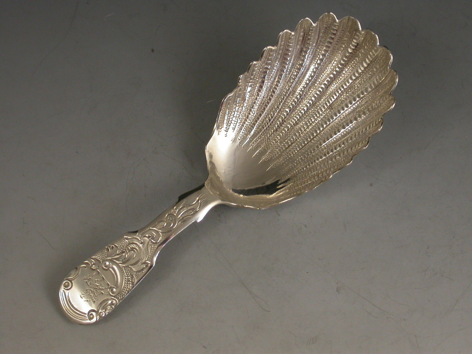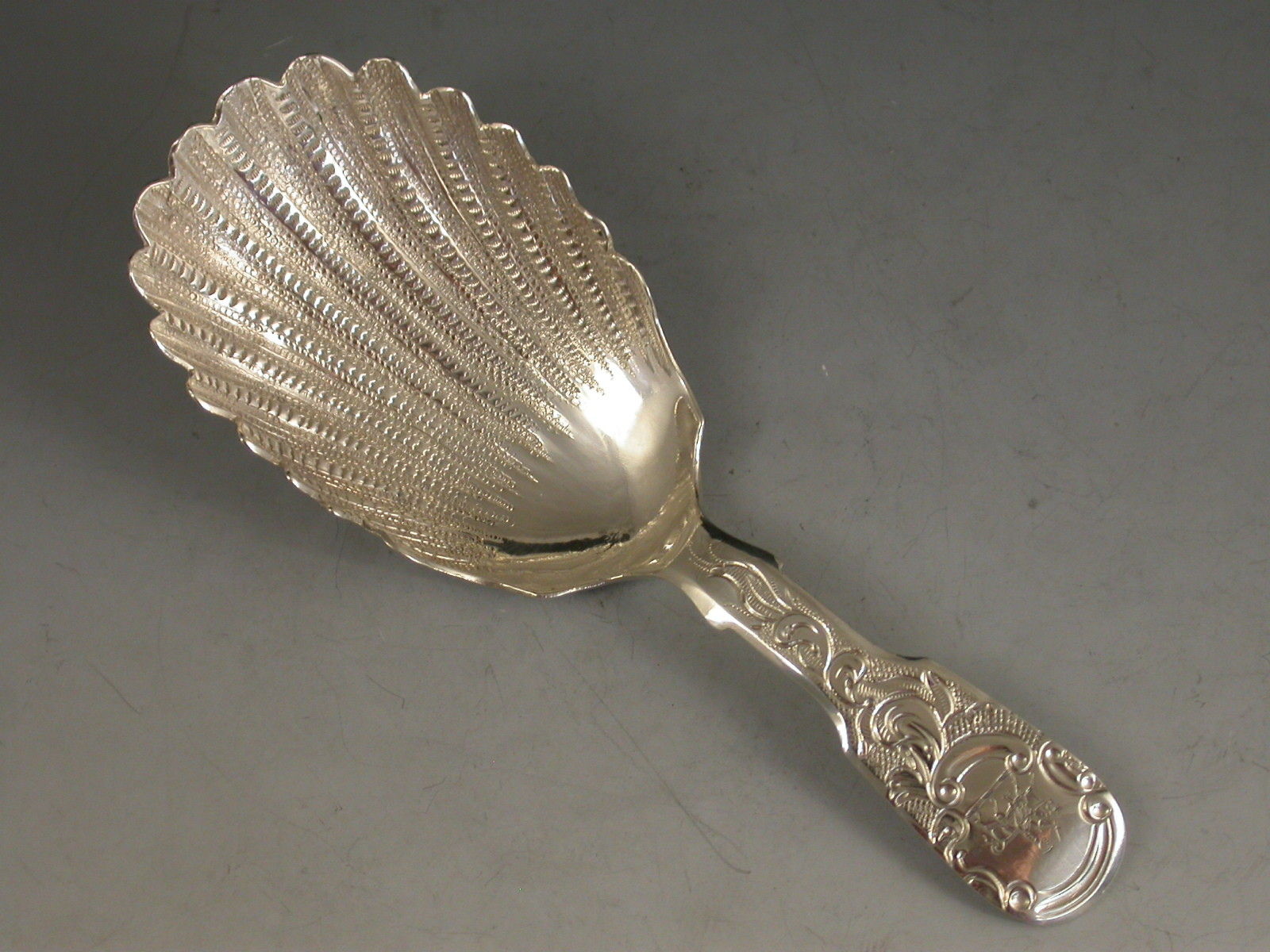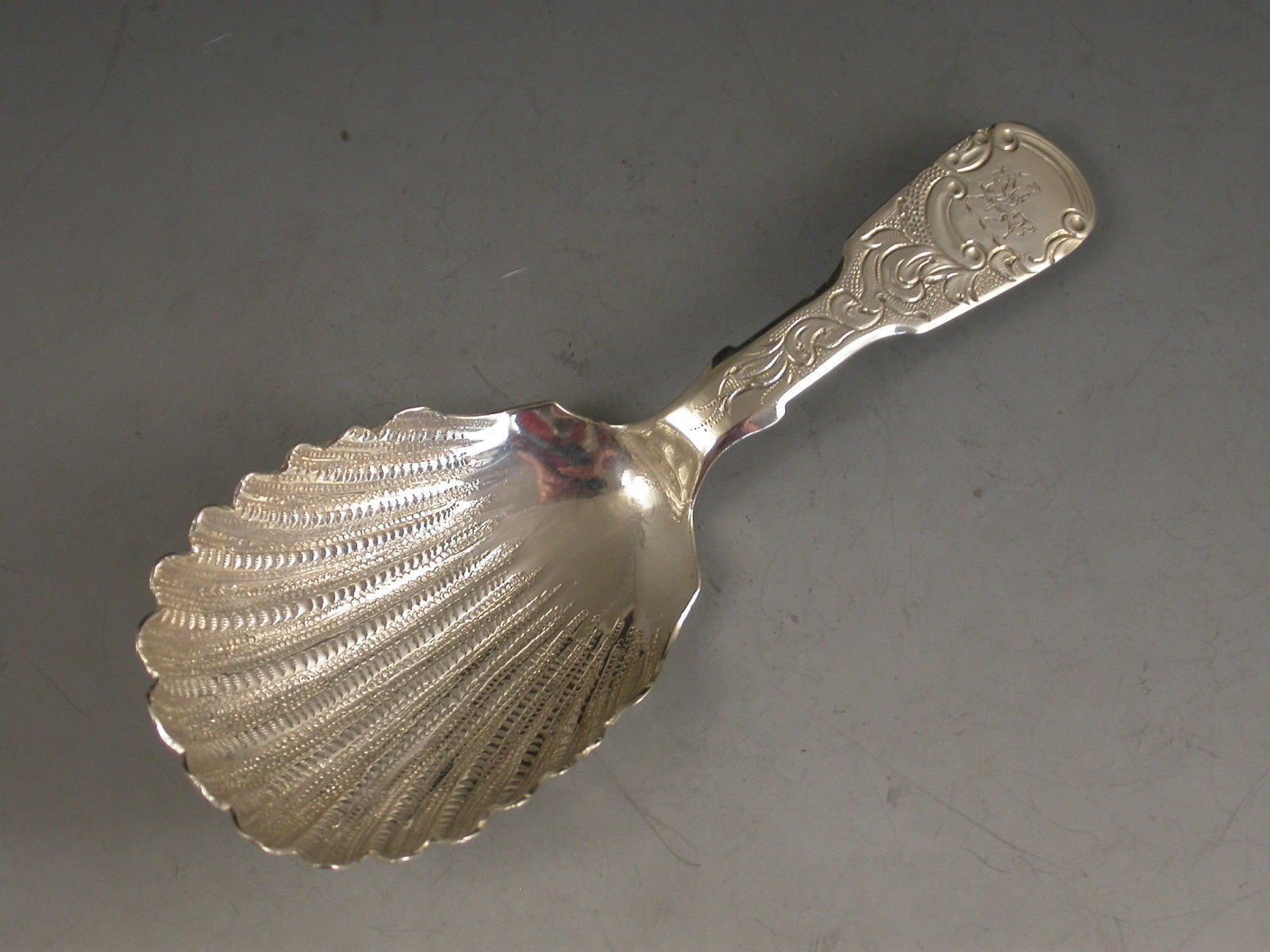 A good Victorian Irish silver Caddy Spoon with fluted shell shaped bowl, the handle with engraved decoration and engraved with a crest.