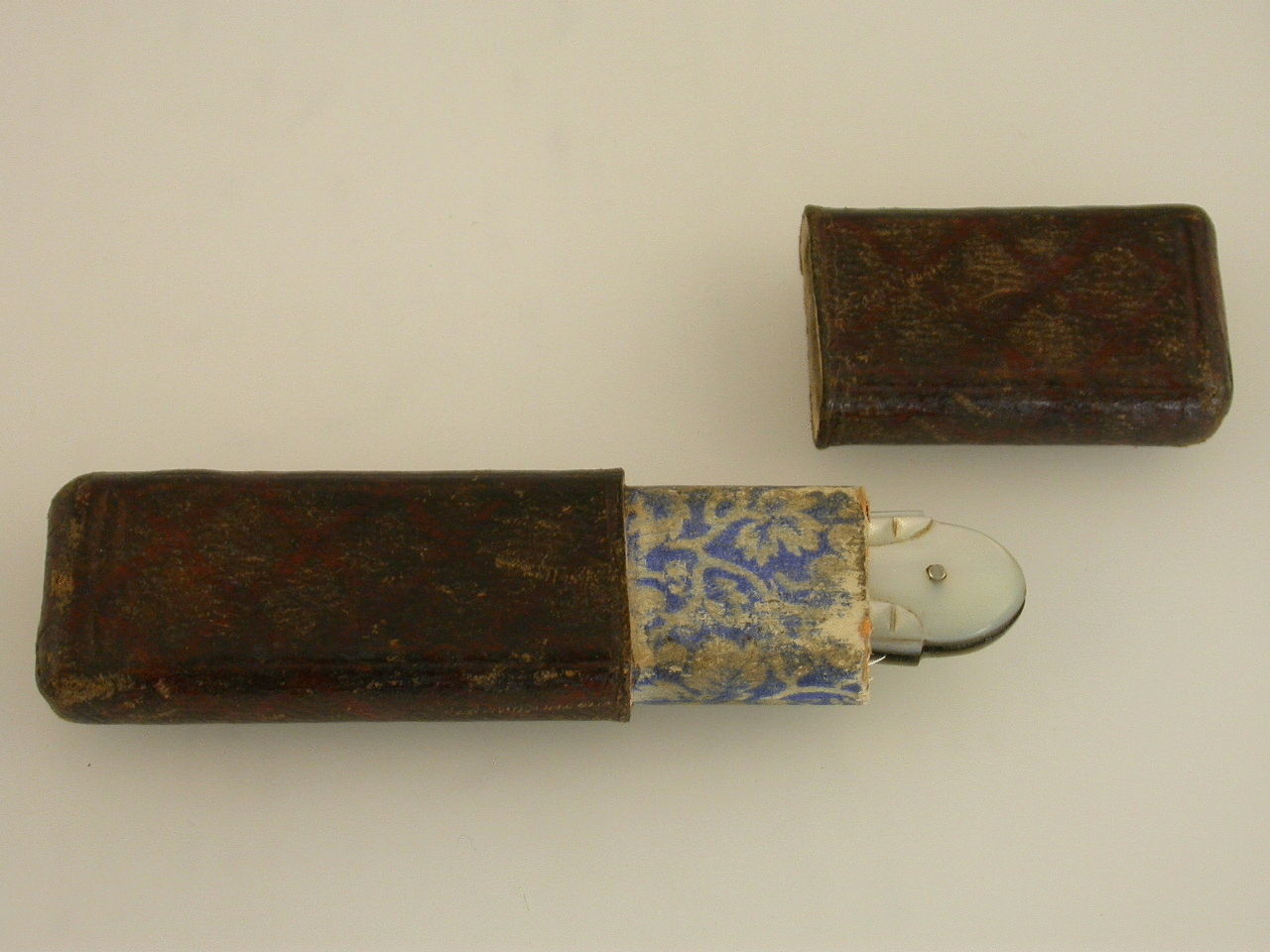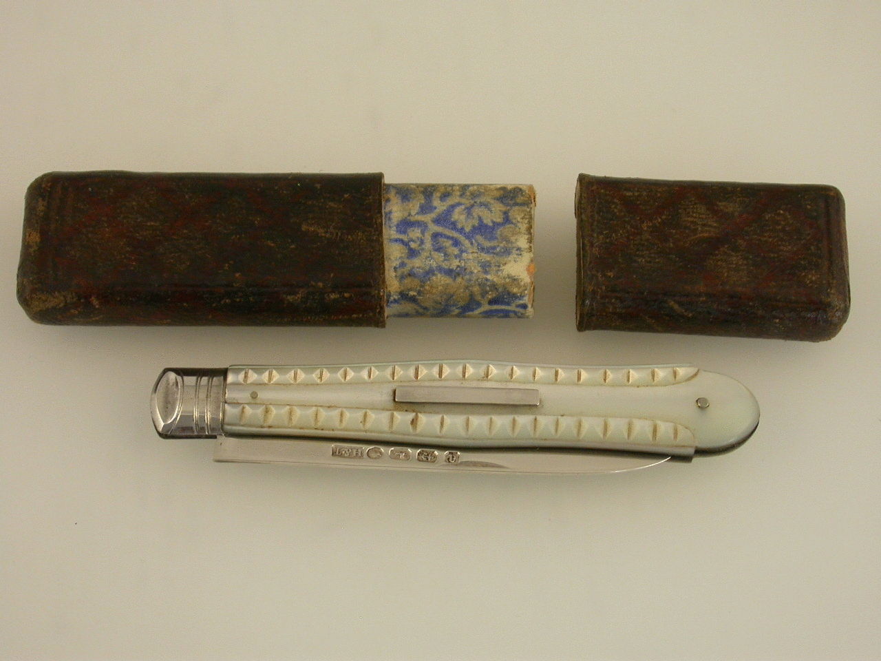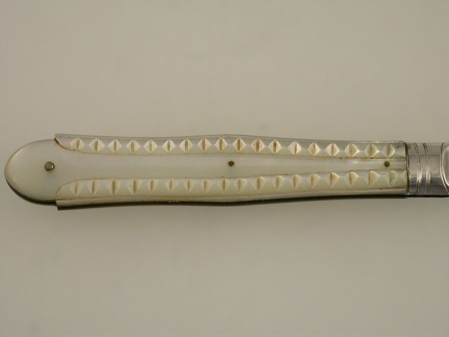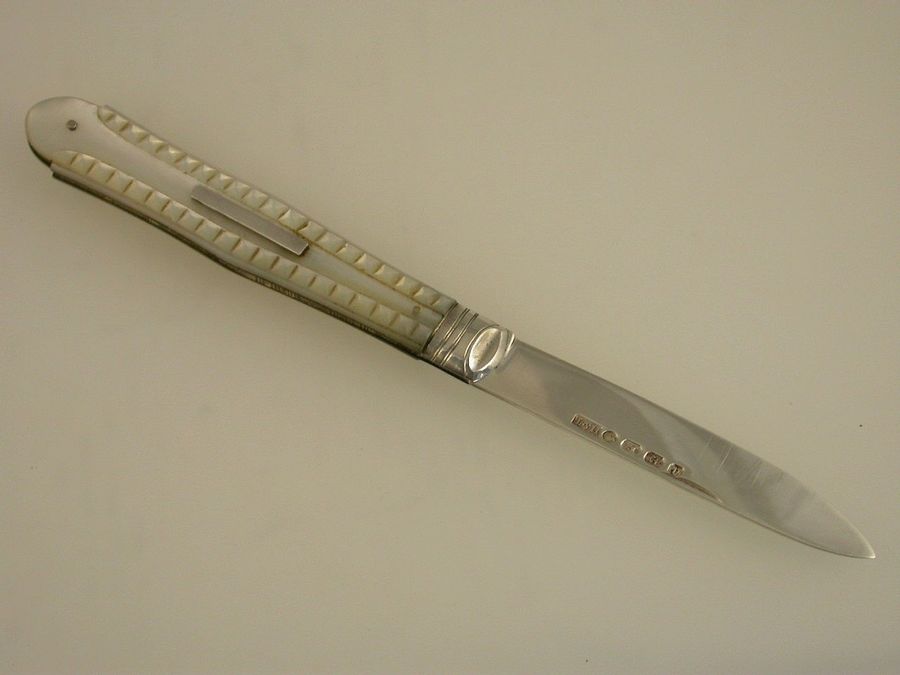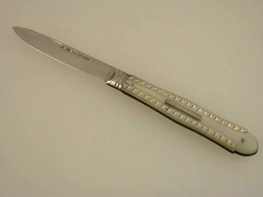 A good Victorian silver Folding Fruit Knife with shaped Mother of Pearl mounted handle with hob-nail cut decoration and plain silver vacant cartouche. Complete with original morocco leather case.