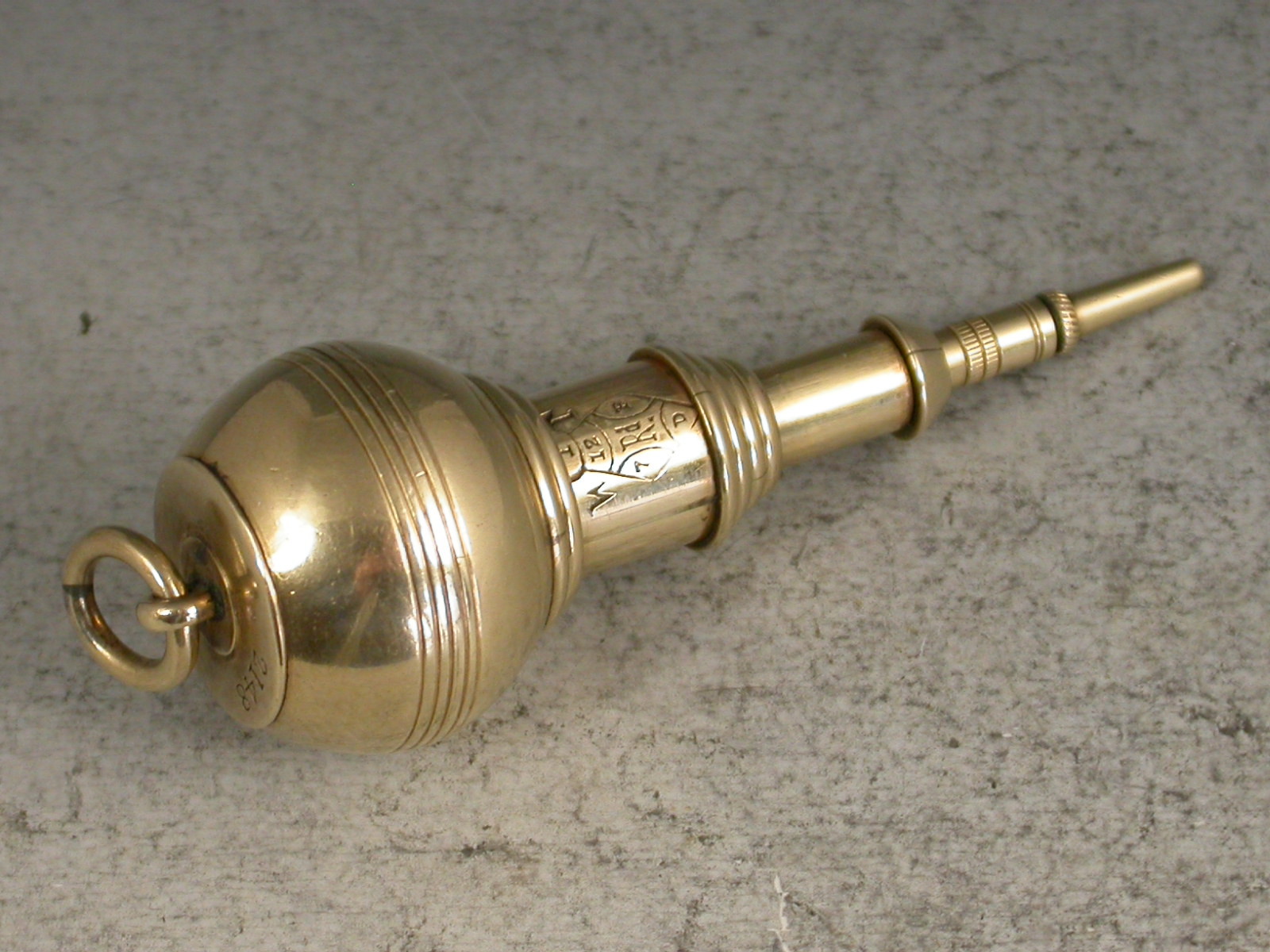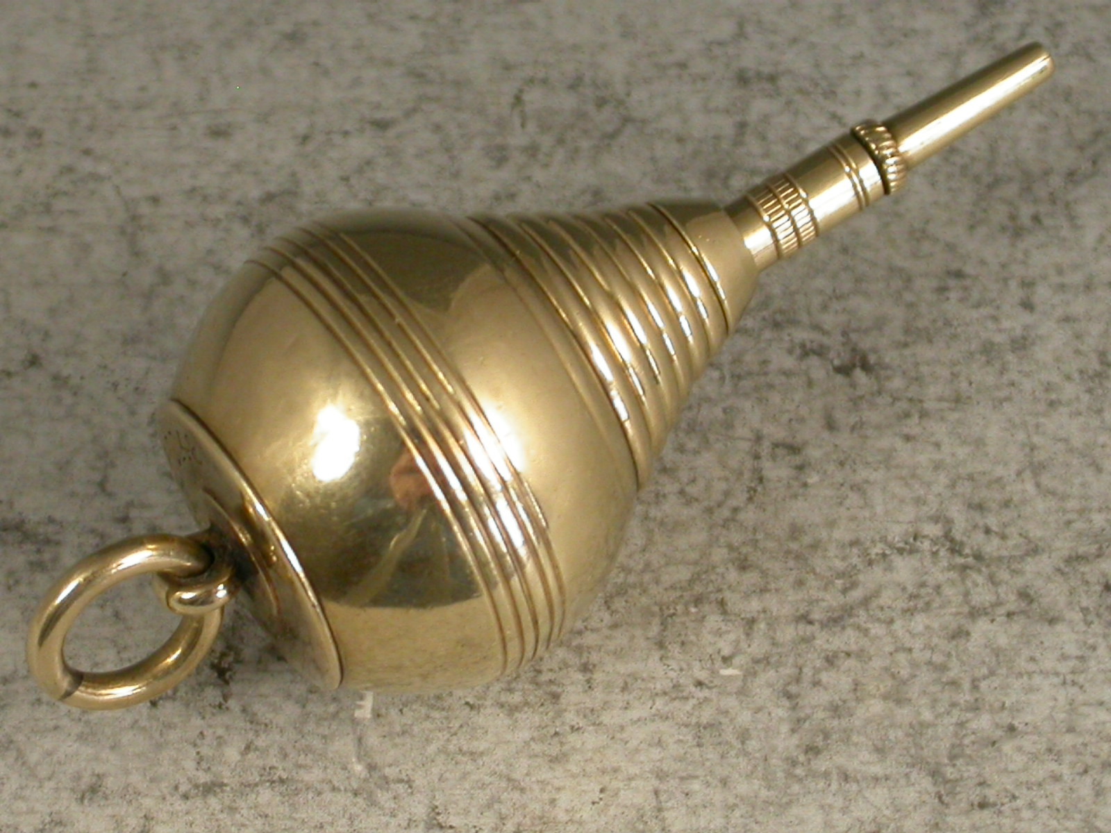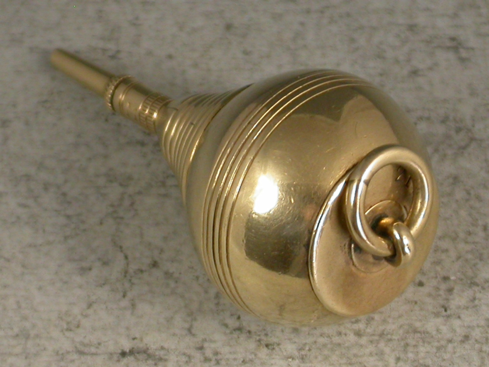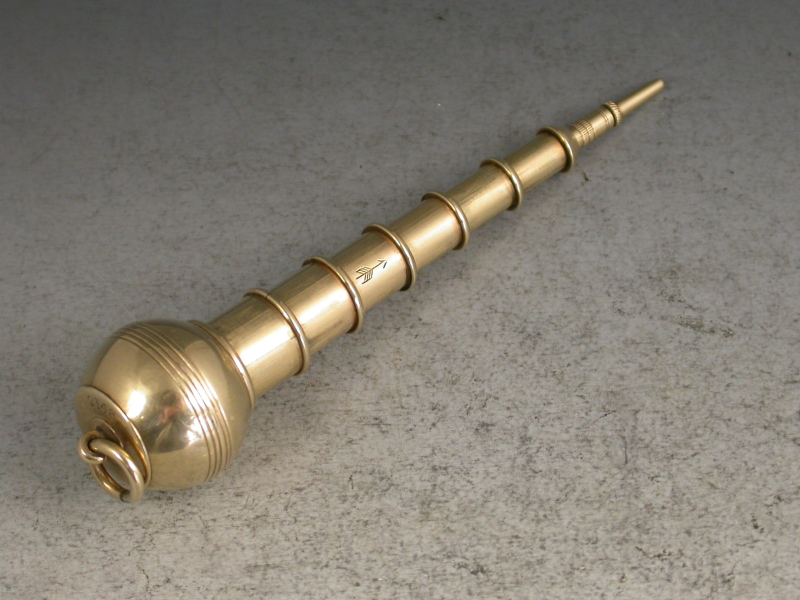 A very rare Victorian novelty 10 carat gold six-drawer telescopic Propelling Pencil made in the form of a Plumb Bob or Spinning Top, each section graduated to fit one inside the other when opened or closed. the circular body with attached suspension ring and reeded decoration. One section stamped with the diamond registration mark for 12th September 1873. The top stamped with the number 2148.