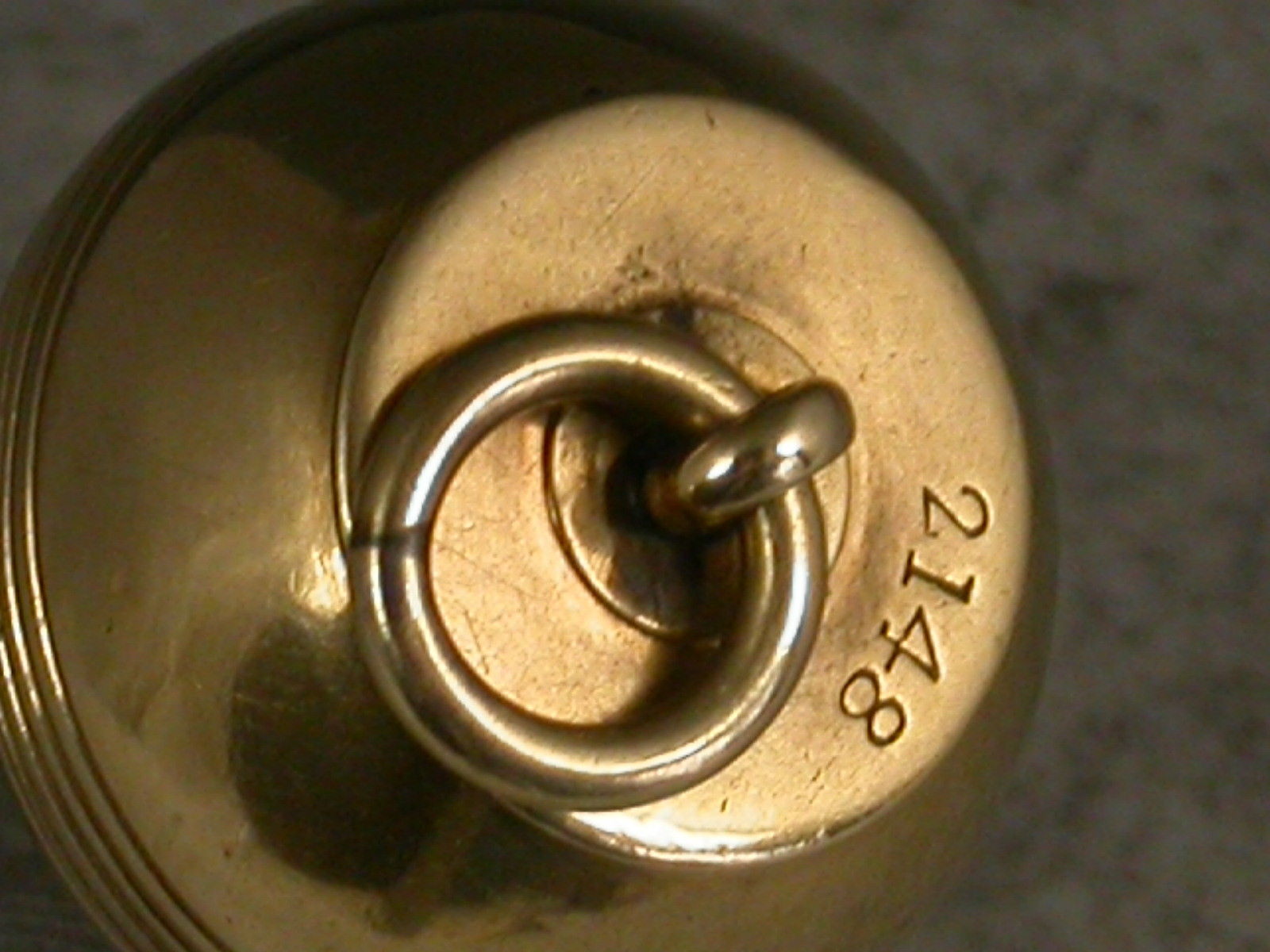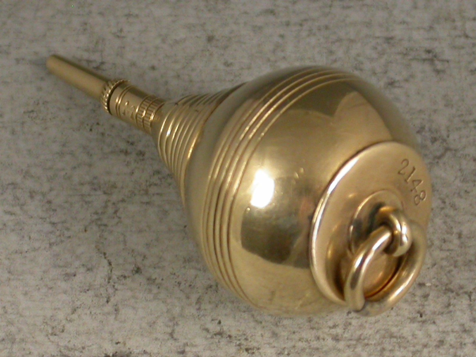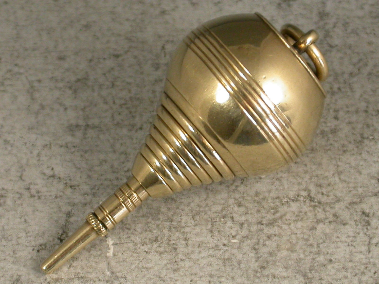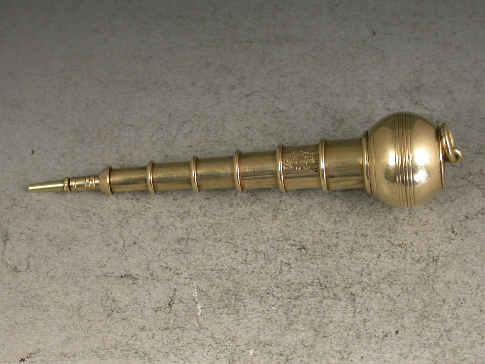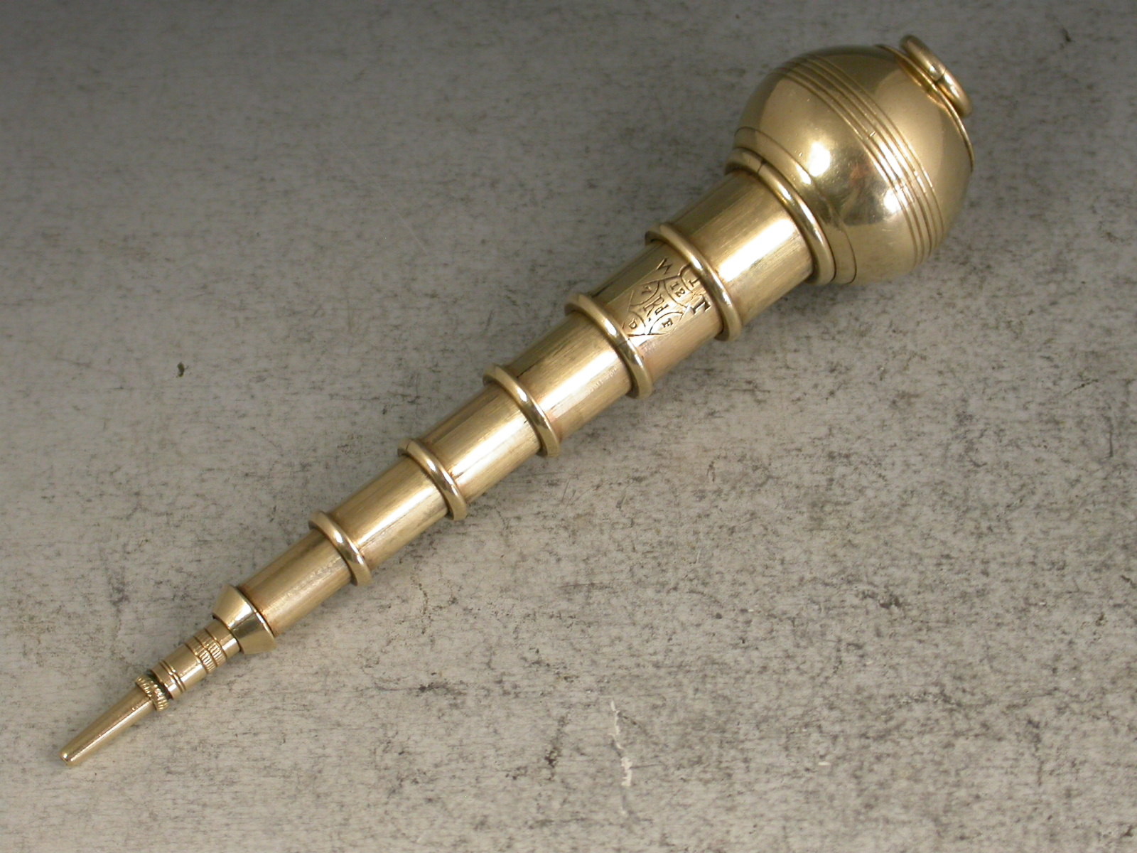 A very rare Victorian novelty 10 carat gold six-drawer telescopic Propelling Pencil made in the form of a Plumb Bob or Spinning Top, each section graduated to fit one inside the other when opened or closed. the circular body with attached suspension ring and reeded decoration. One section stamped with the diamond registration mark for 12th September 1873. The top stamped with the number 2148.