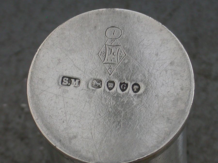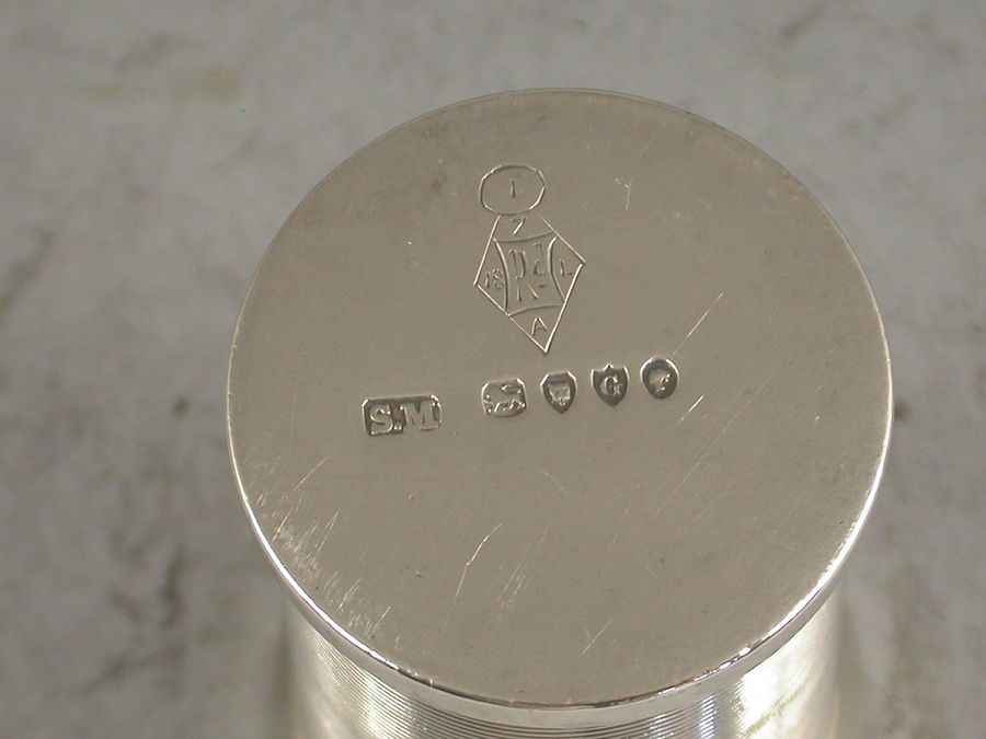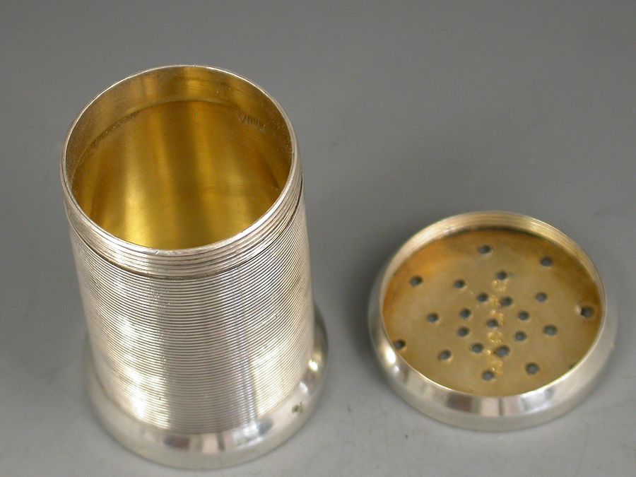 A rare Victorian novelty silver Pepper made in the form of a Cotton Reel with reeded body to simulate the cotton, a pierced screw off cover and silver gilt interior.