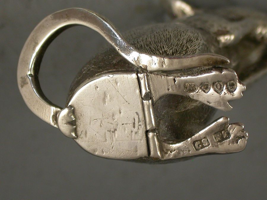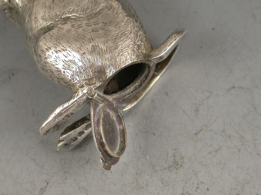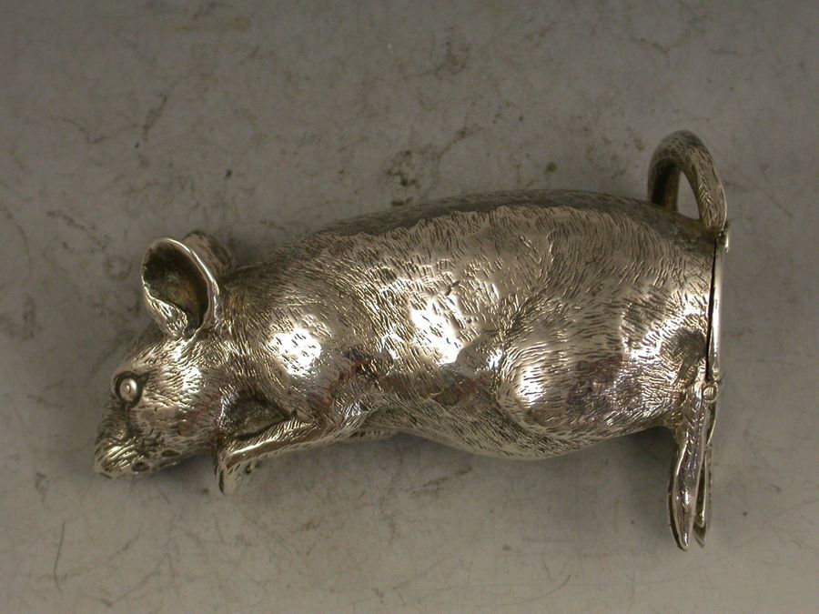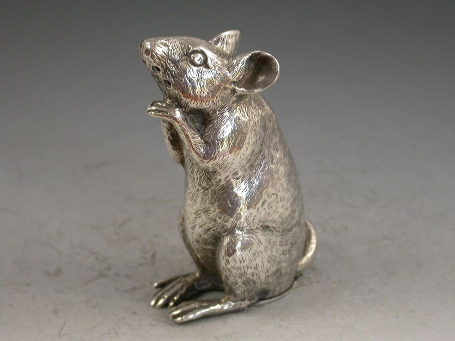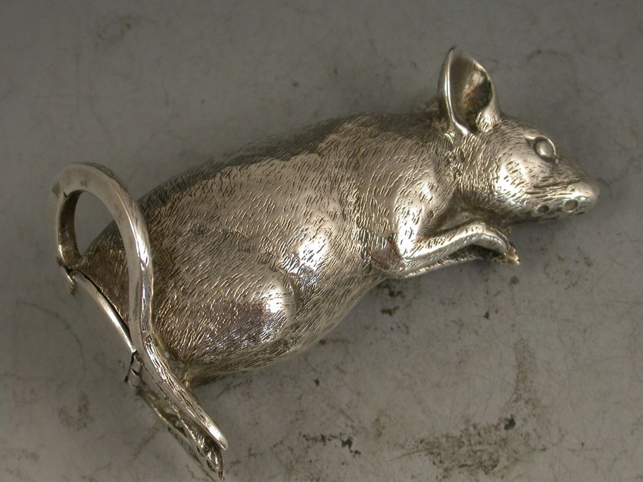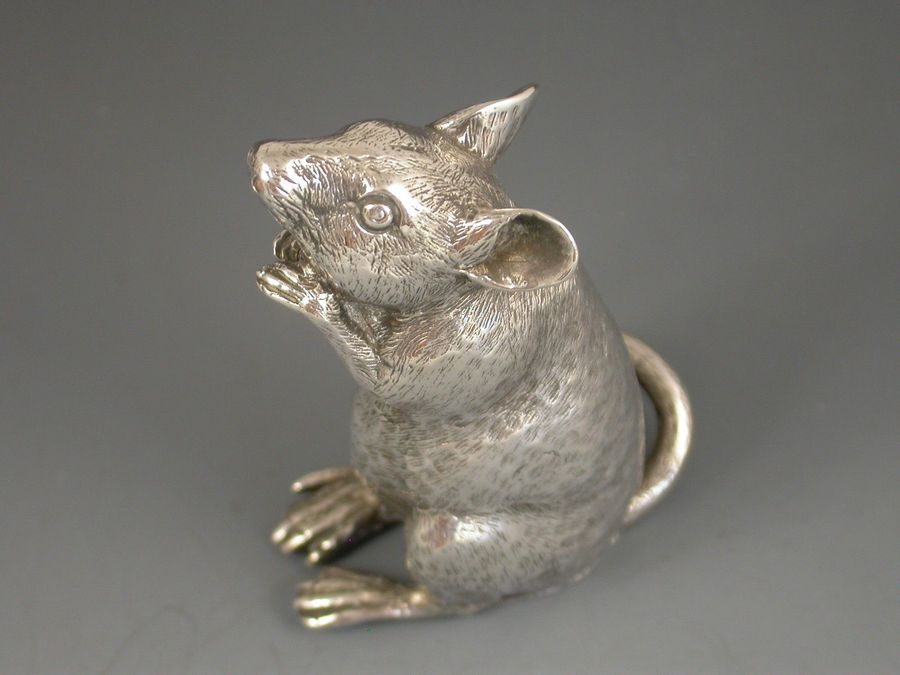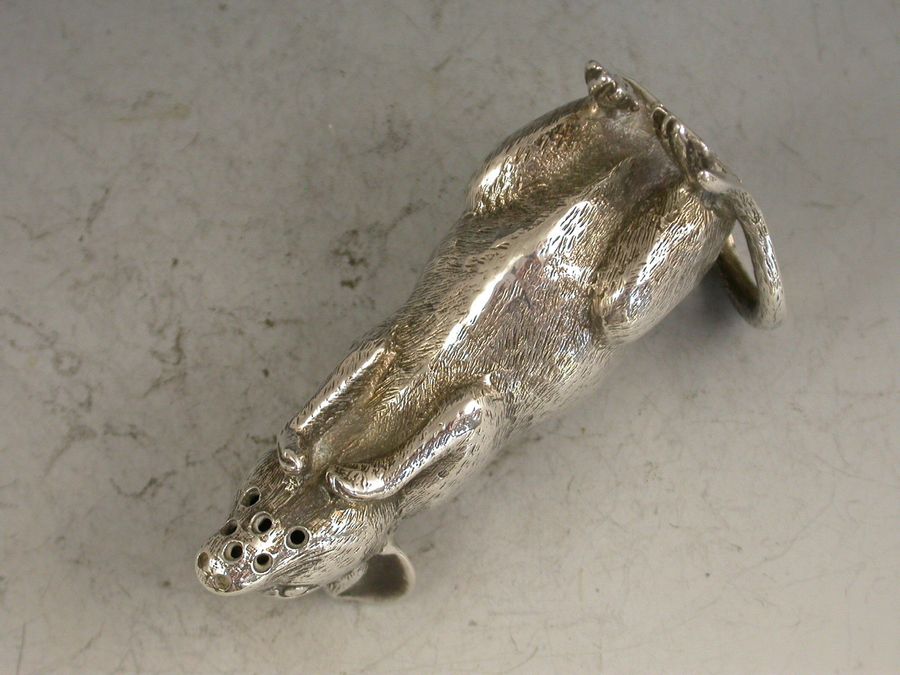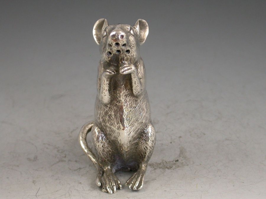 A fine quality Victorian novelty cast silver Pepper, made in the form of a Mouse sitting up on his hind legs, a flat hinged cover to the base and realistically textured fur to the body.