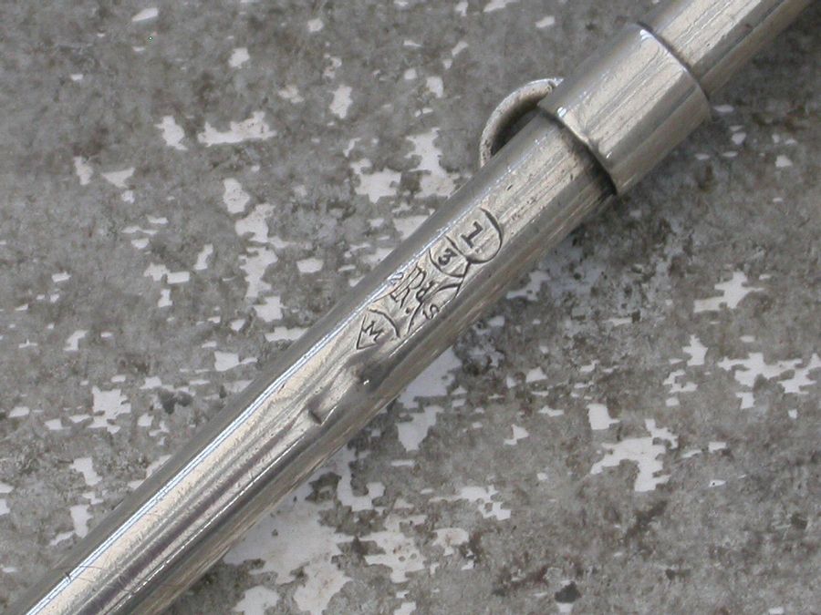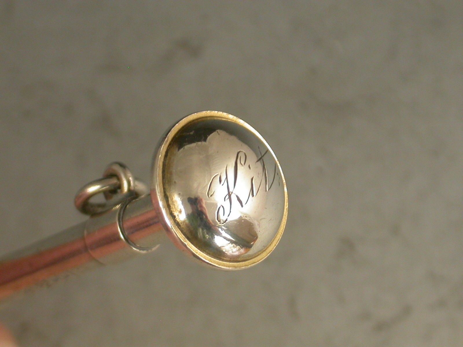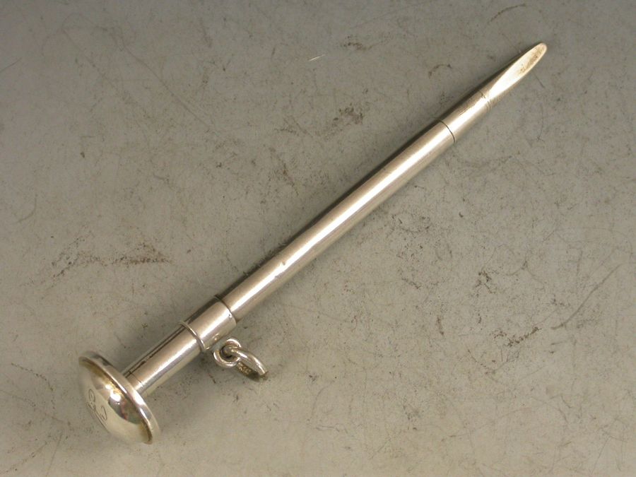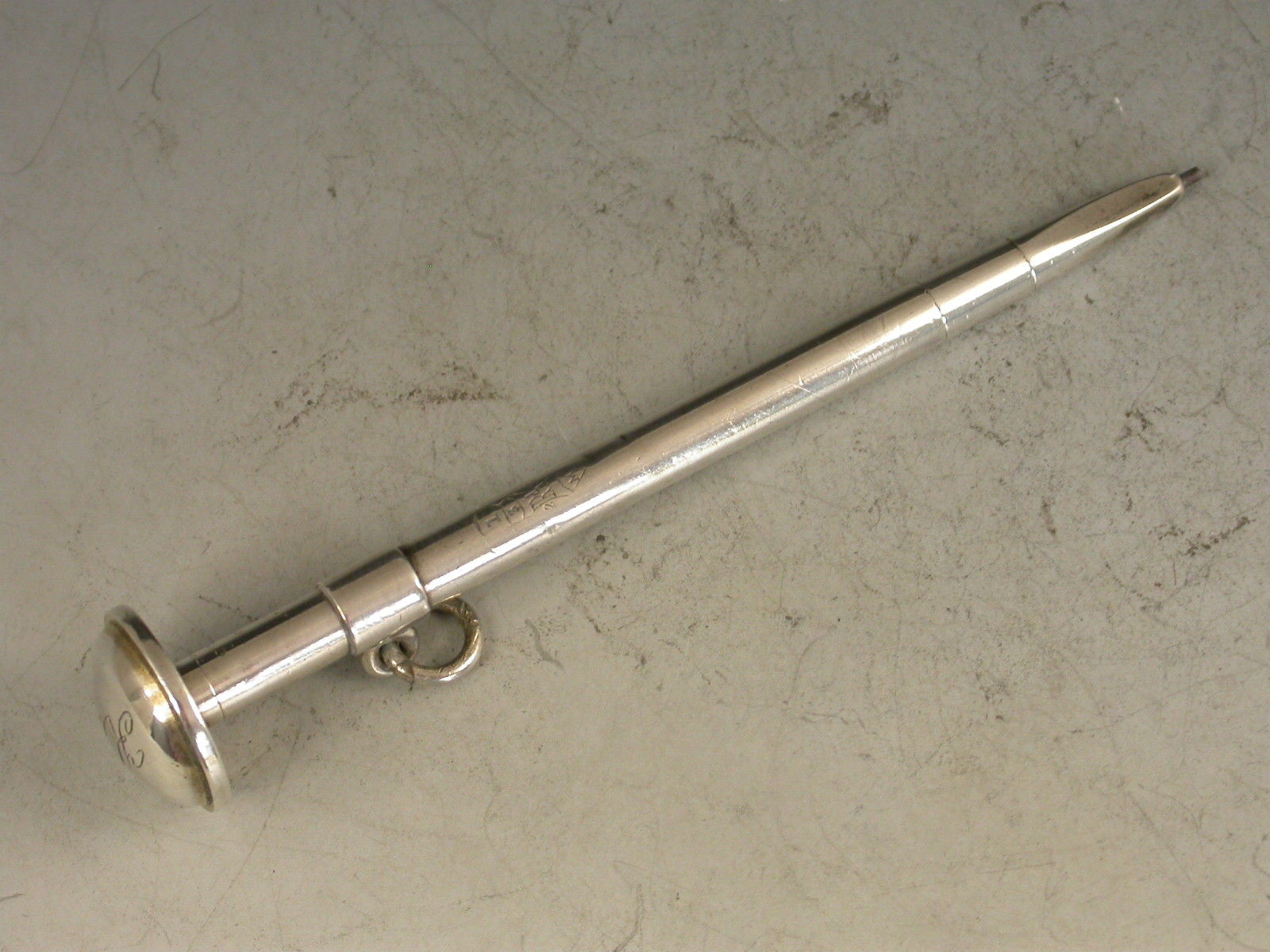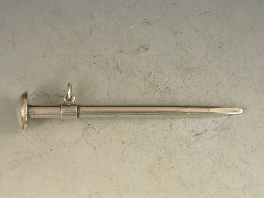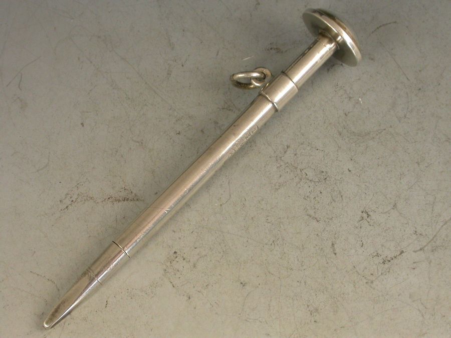 A rare Victorian novelty silver Propelling Pencil made in the form of a Nail with attached suspension ring, the domed cap engraved 'Kit' and unscrewing to reveal a lead reservoir. Twist mechanism to propel lead.