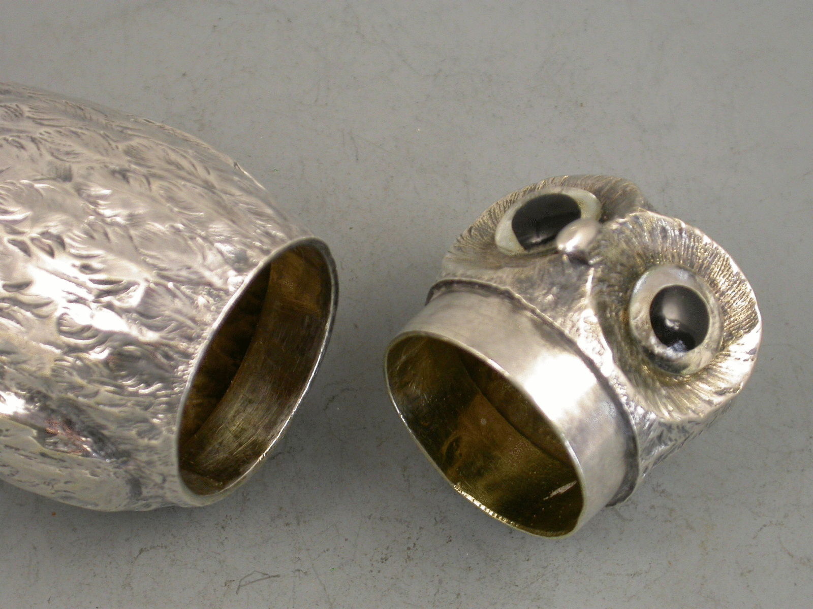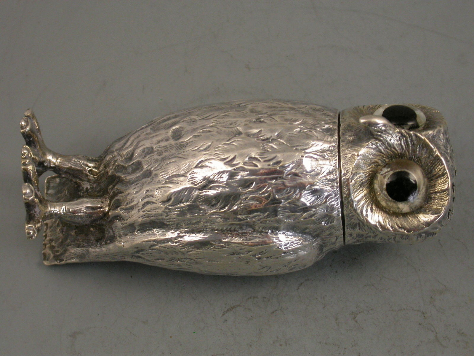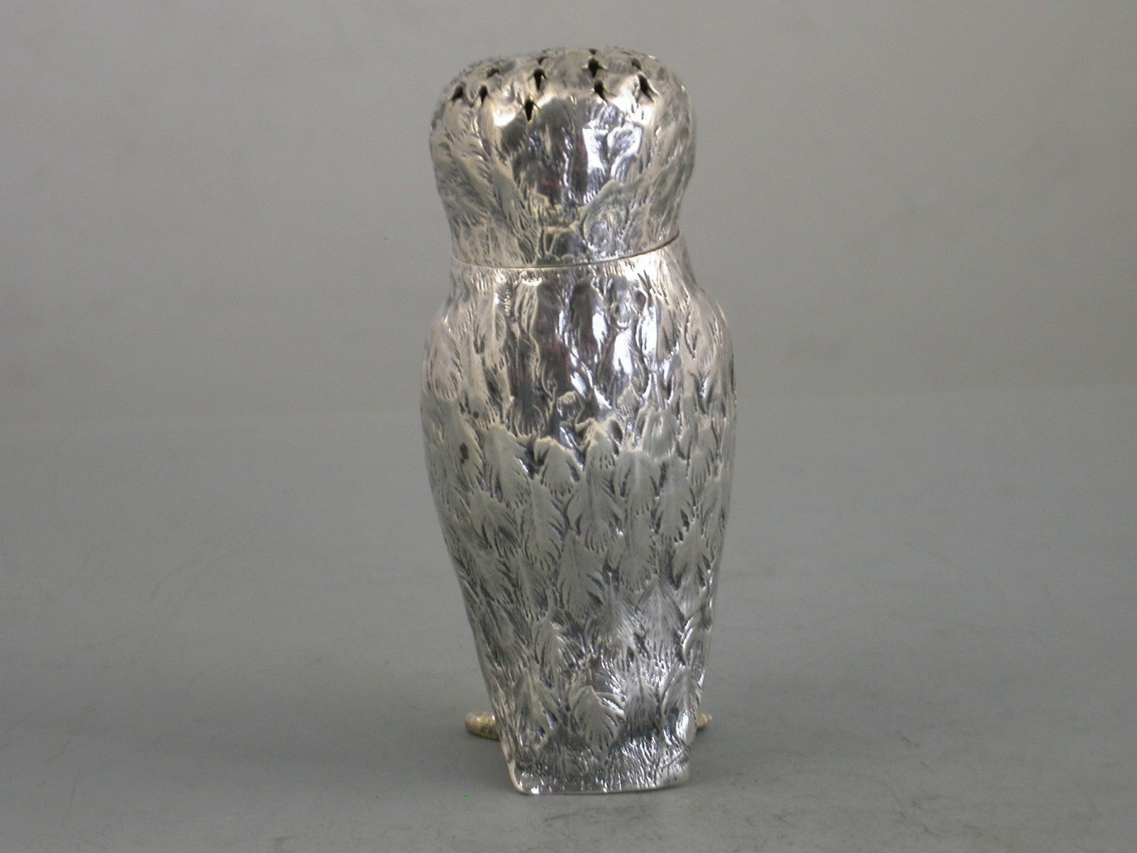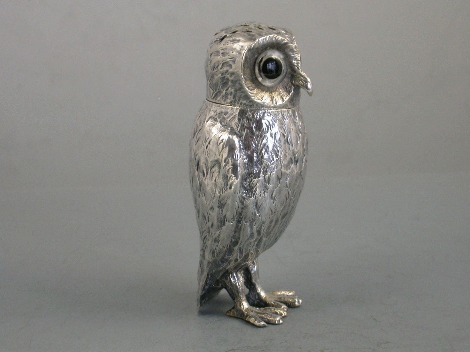 A nice quality Victorian novelty silver Pepper formed as a standing Owl with textured plumage and black glass eyes, pull-off cover and silver gilt interior.