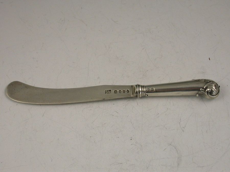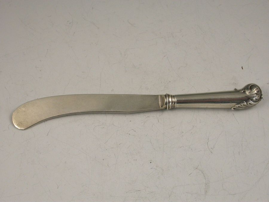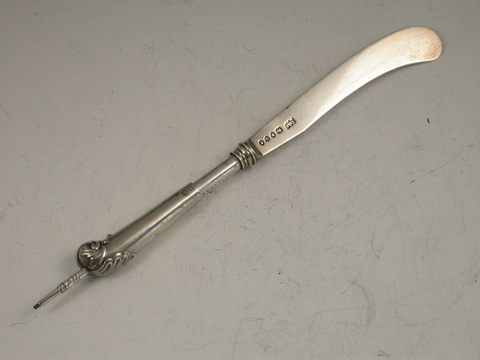 A rare Victorian novelty silver Propelling Pencil made in the form of a Butter Knife, the pistol shape handle with leaf capped end. Hallmarked to the blade and the handle and also stamped Asprey & Son to the barrel.