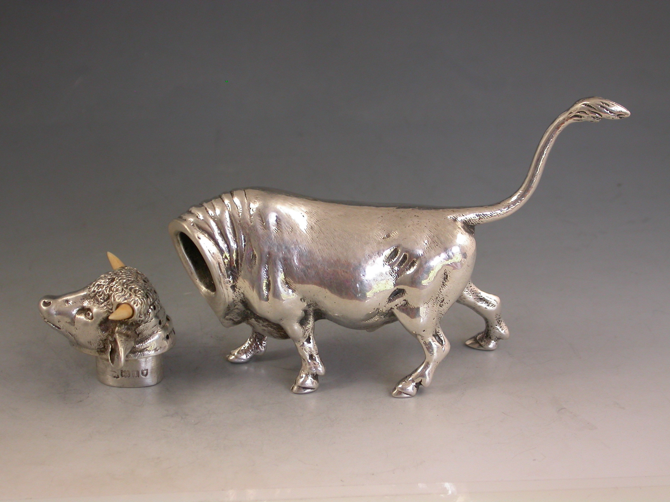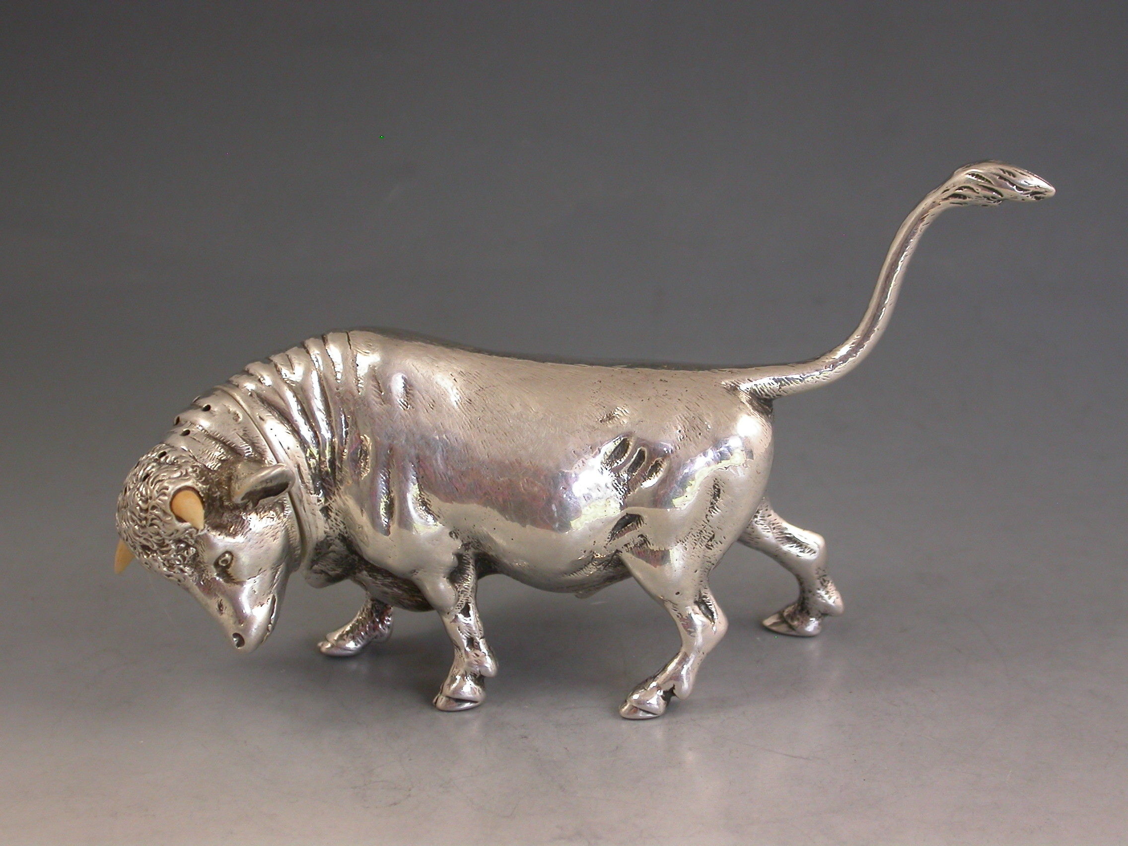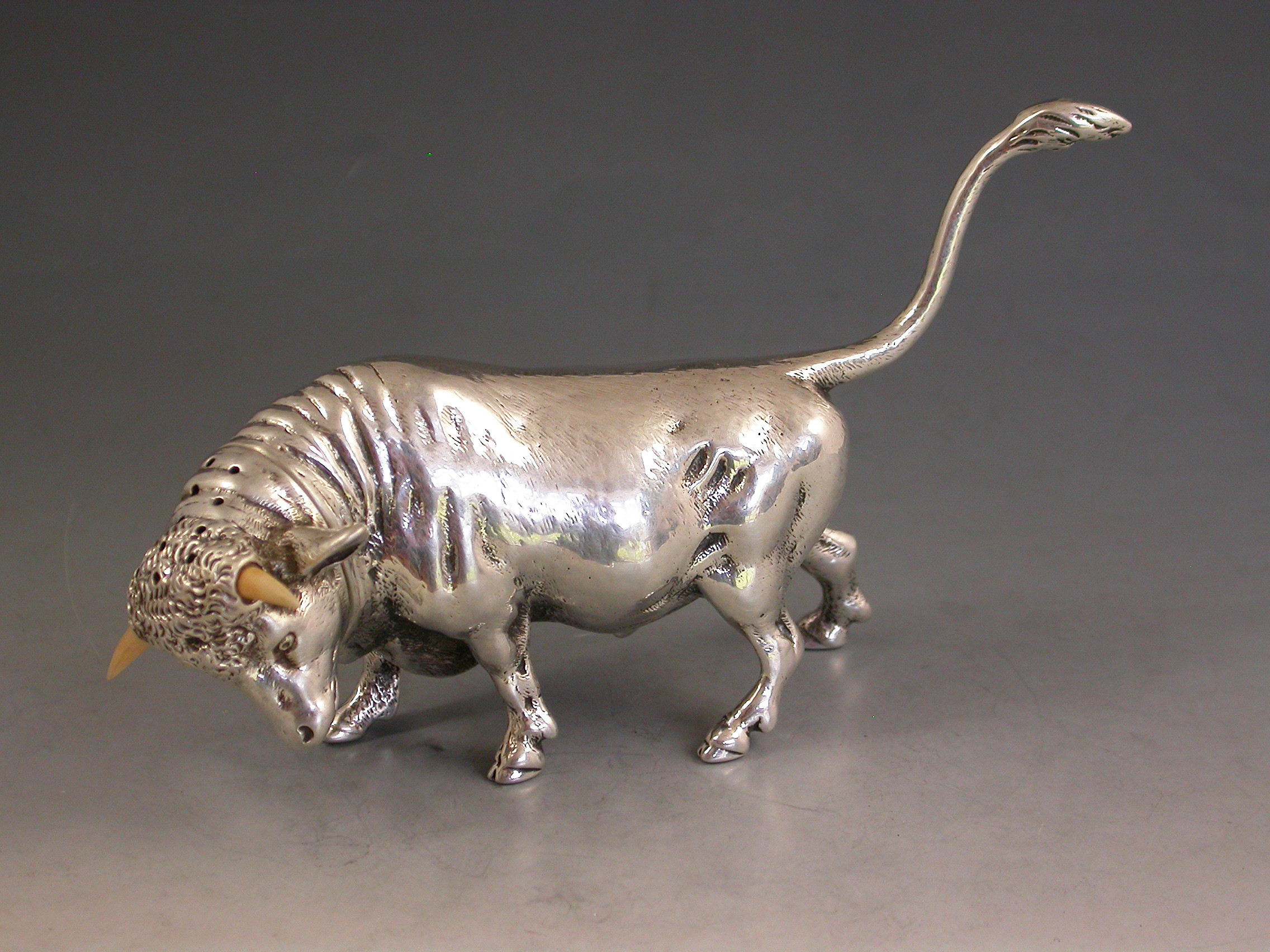 A very fine quality and extremely rare novelty cast silver Pepper made in the form of a Bull, with pull-off pierced head set with ivory horns.
