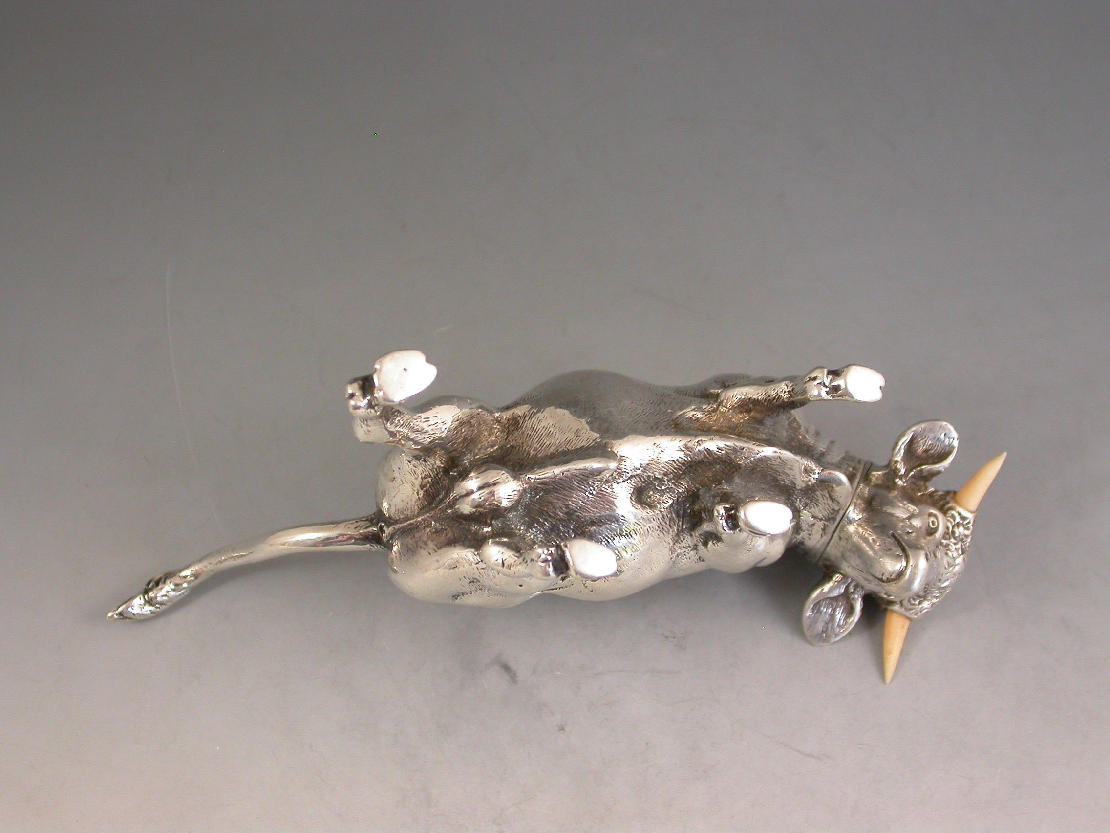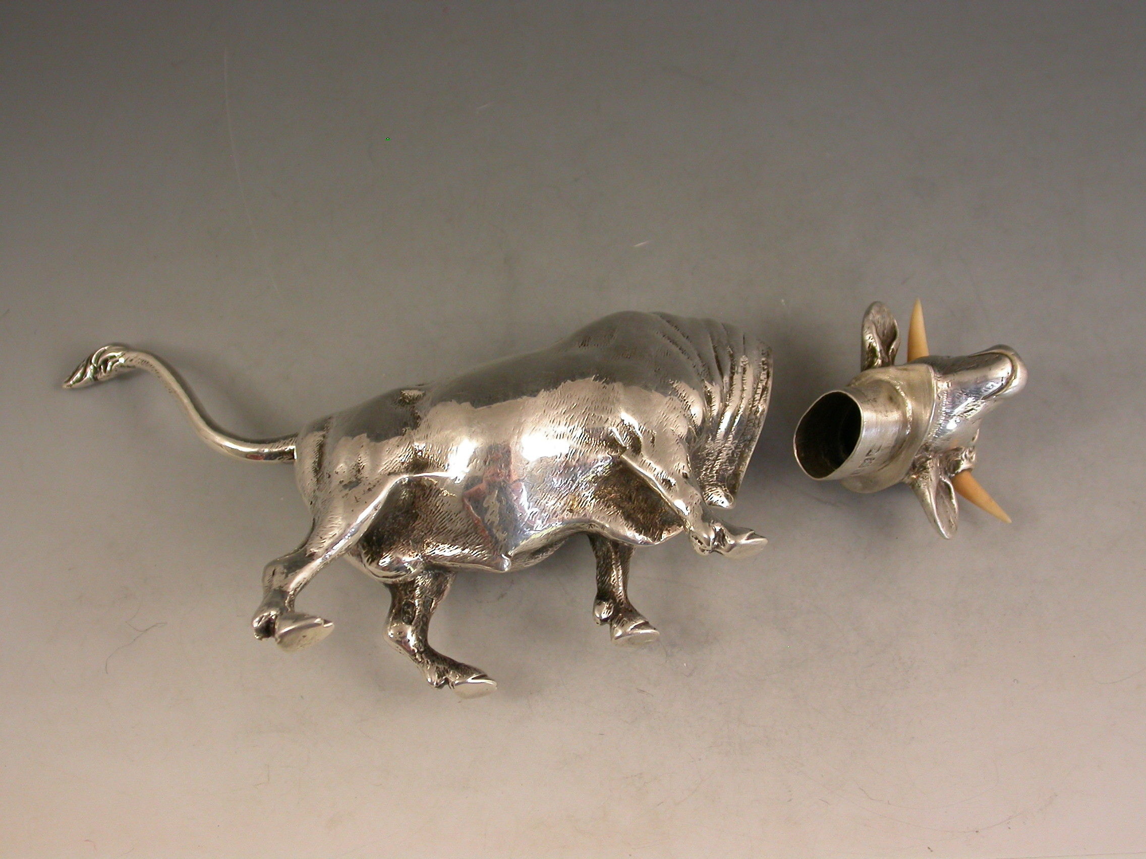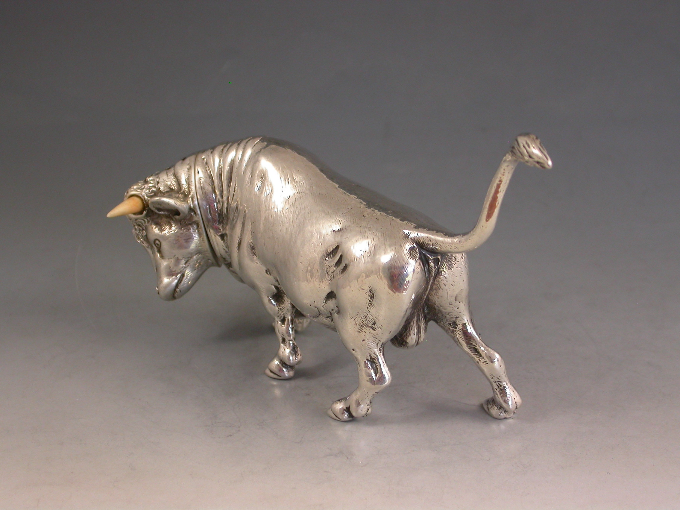 A very fine quality and extremely rare novelty cast silver Pepper made in the form of a Bull, with pull-off pierced head set with ivory horns.