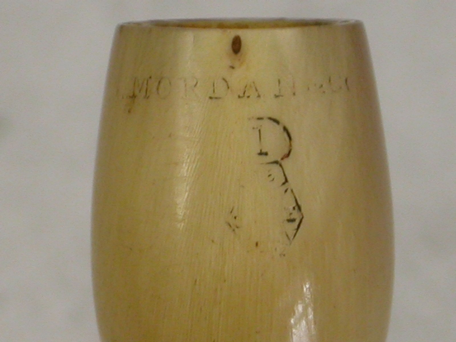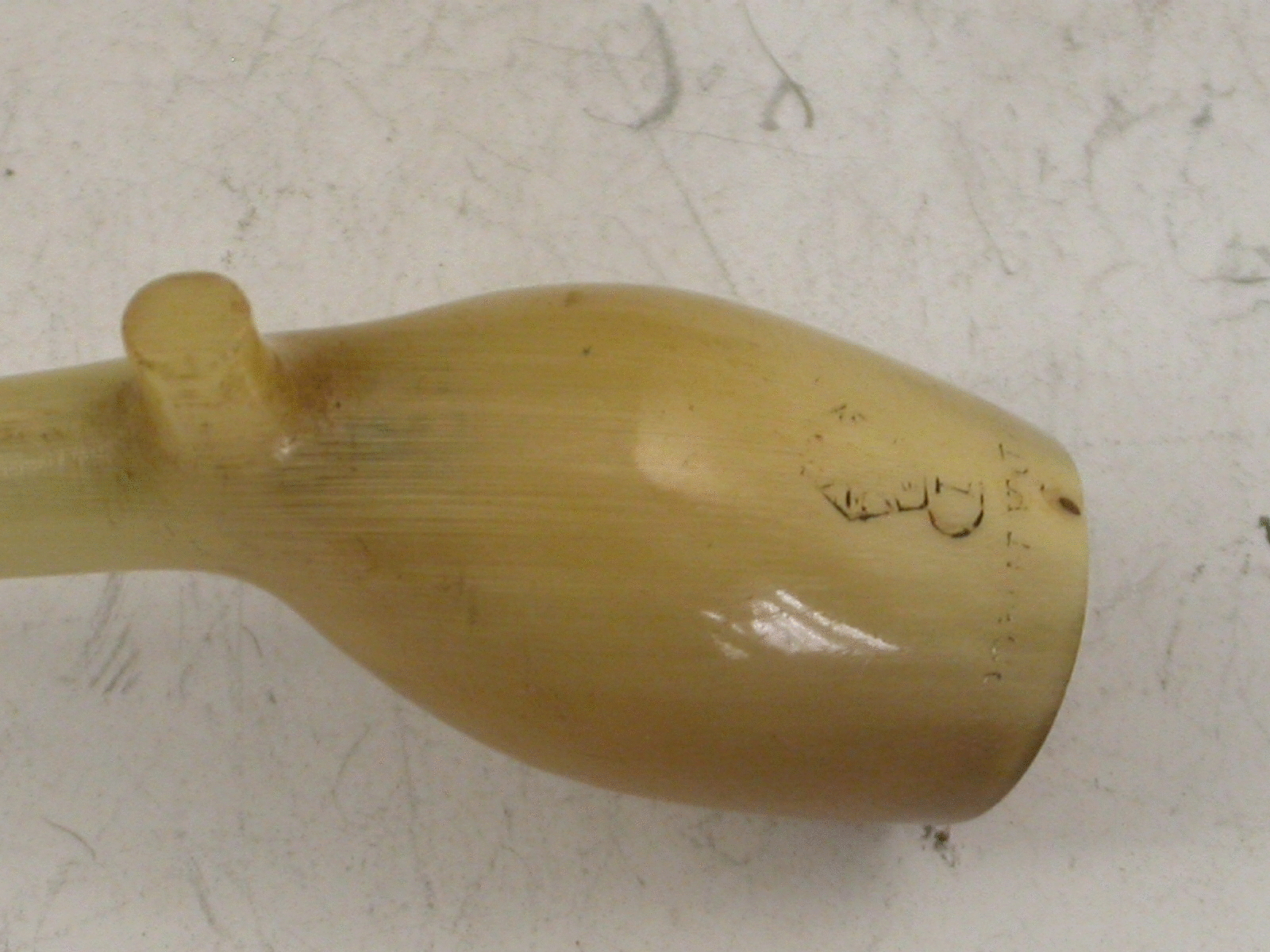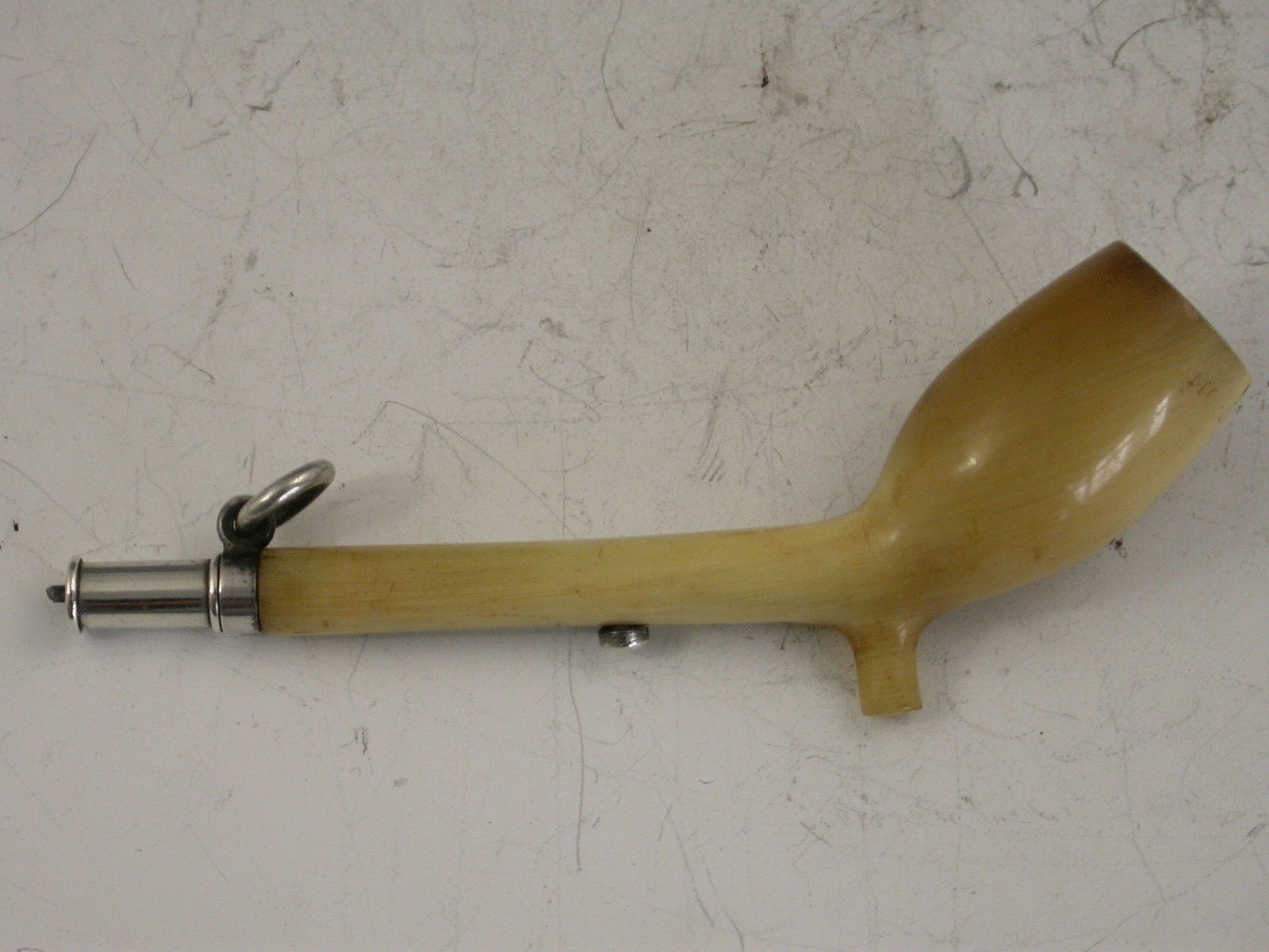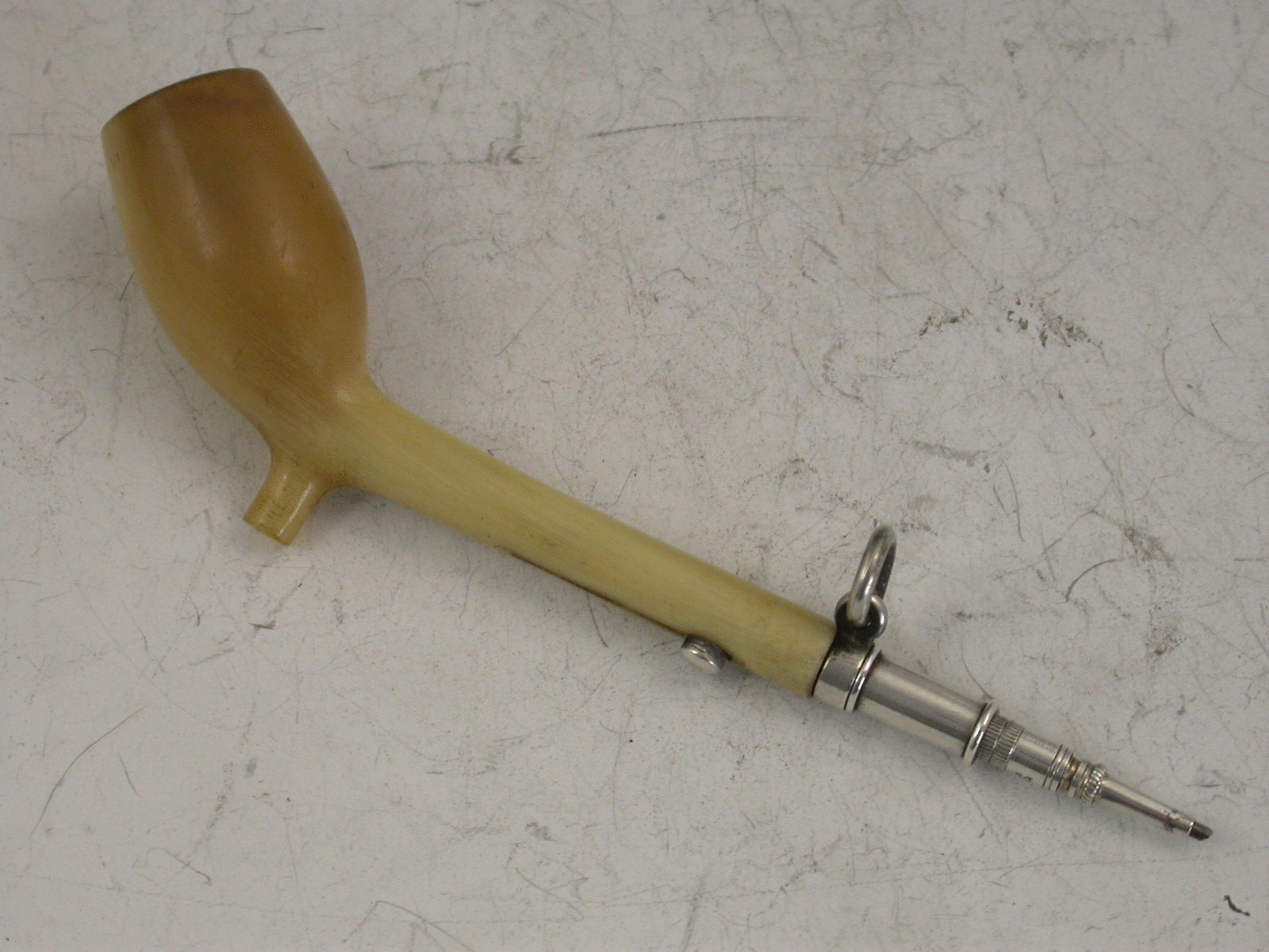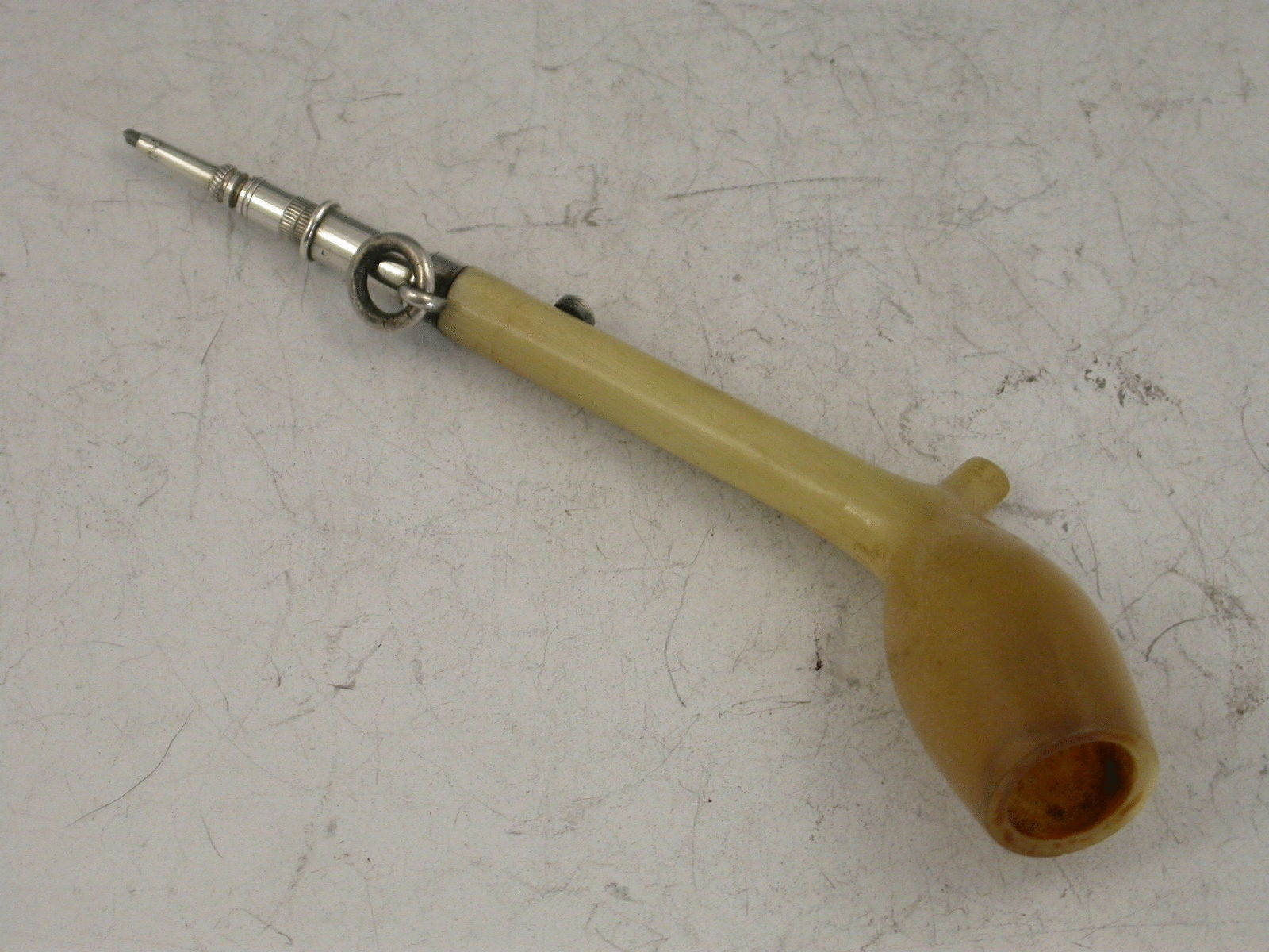 A rare Victorian novelty silver Propelling Pencil made in the form of a clay pipe, the bowl and stem formed from horn and stamped S Mordan & Co above a diamond registration mark for 1881.