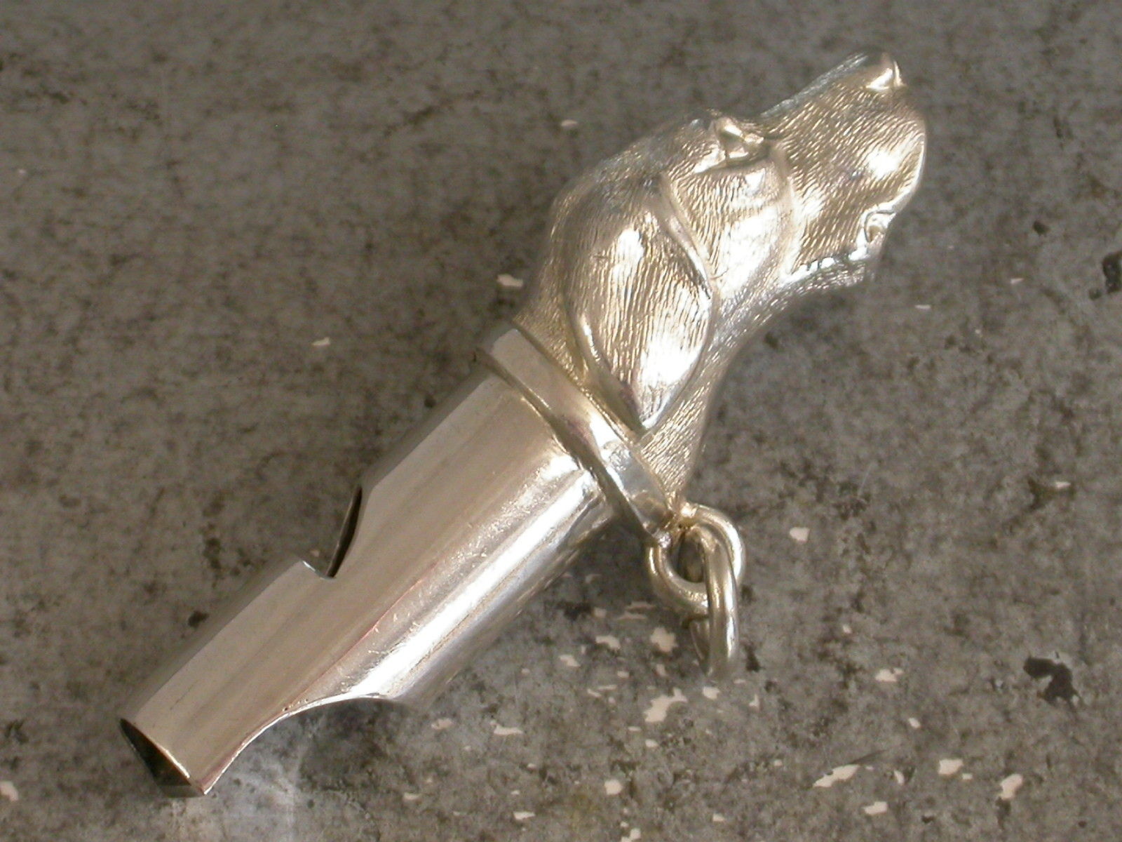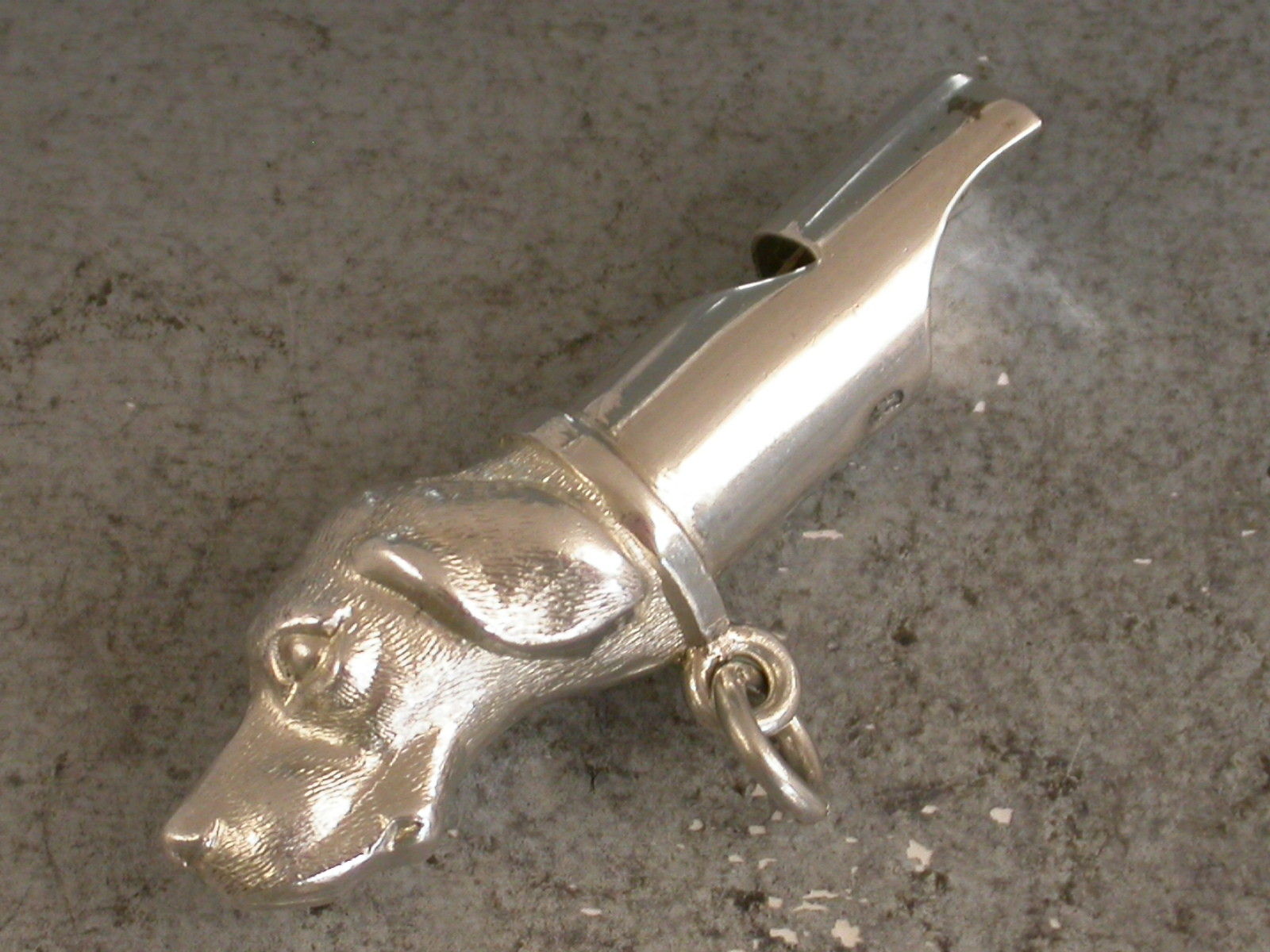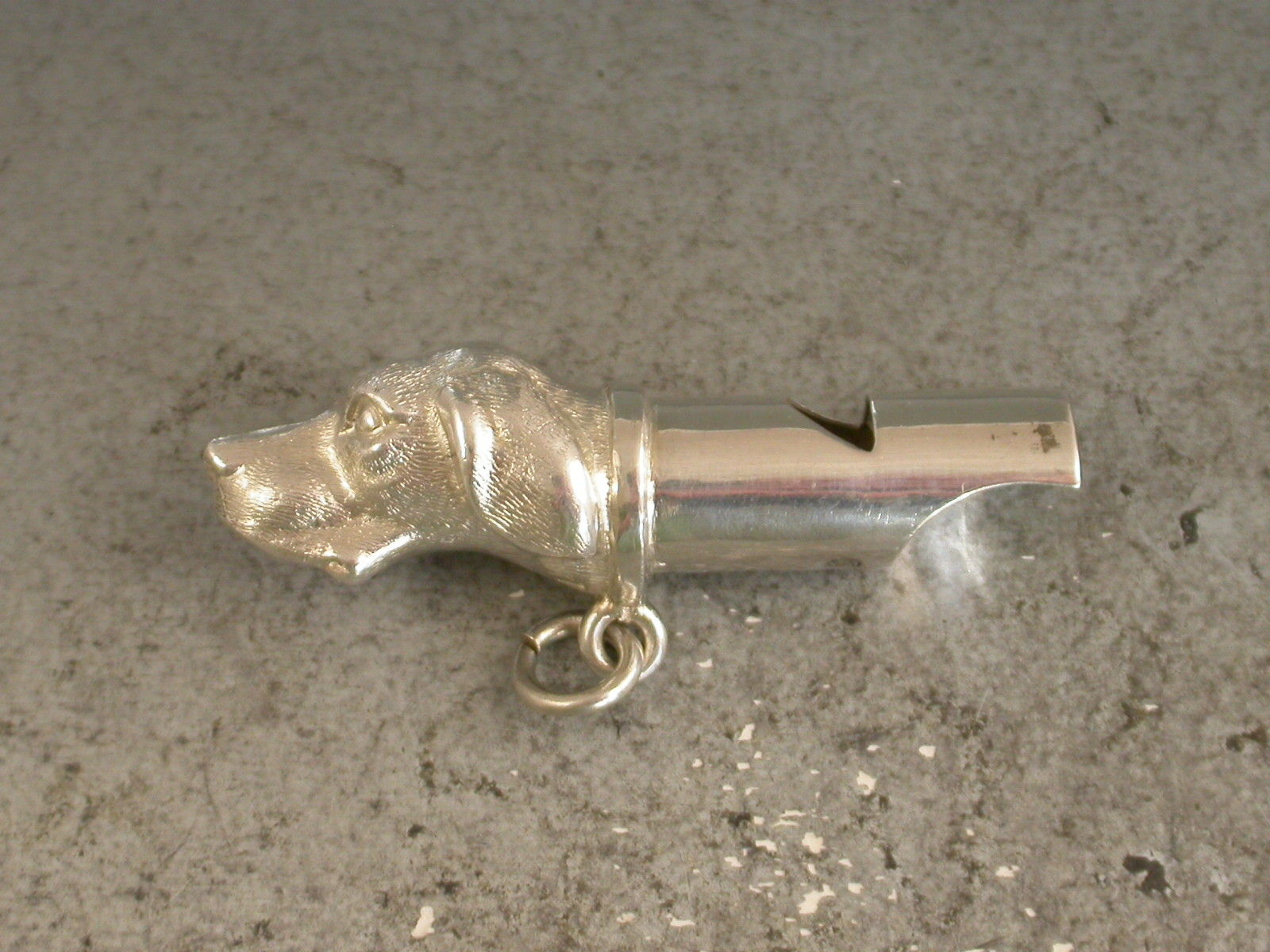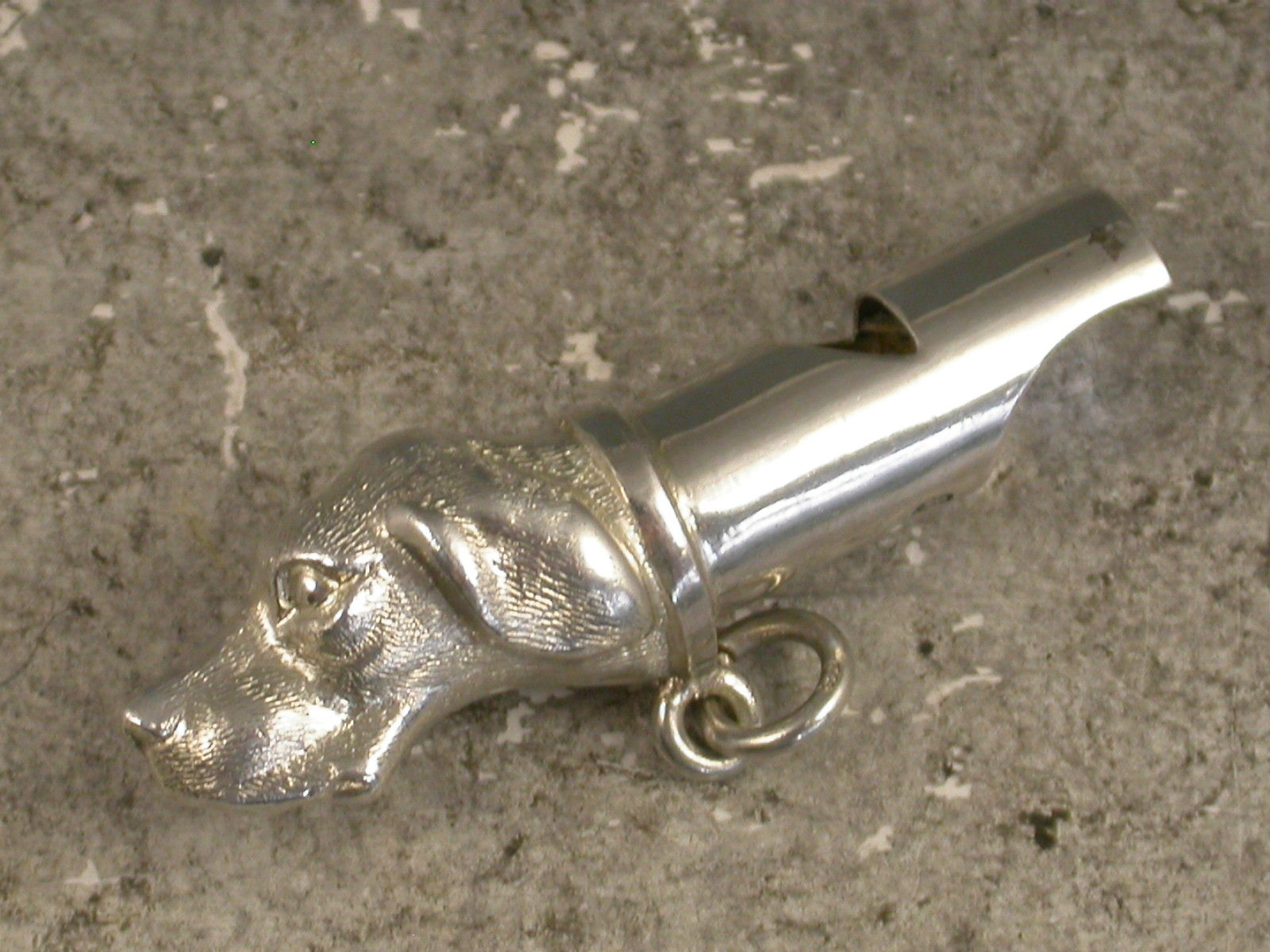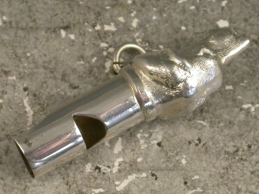 A good Victorian novelty silver Whistle made in the form of a Dogs Head, possibly a fox hound. With attached suspension ring.
