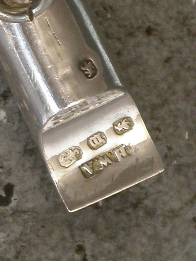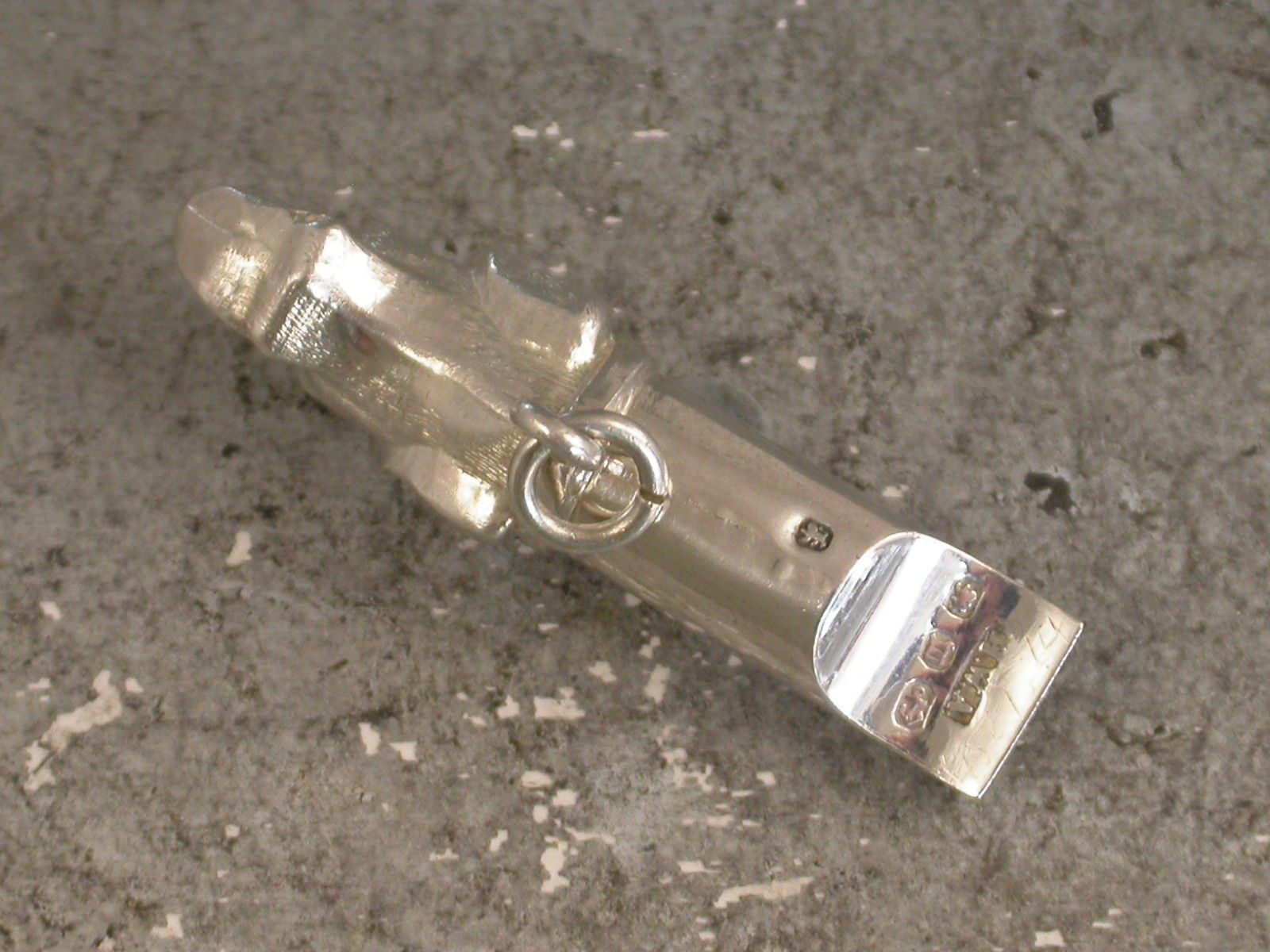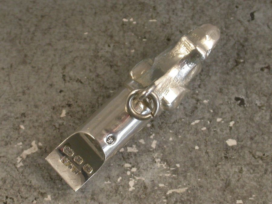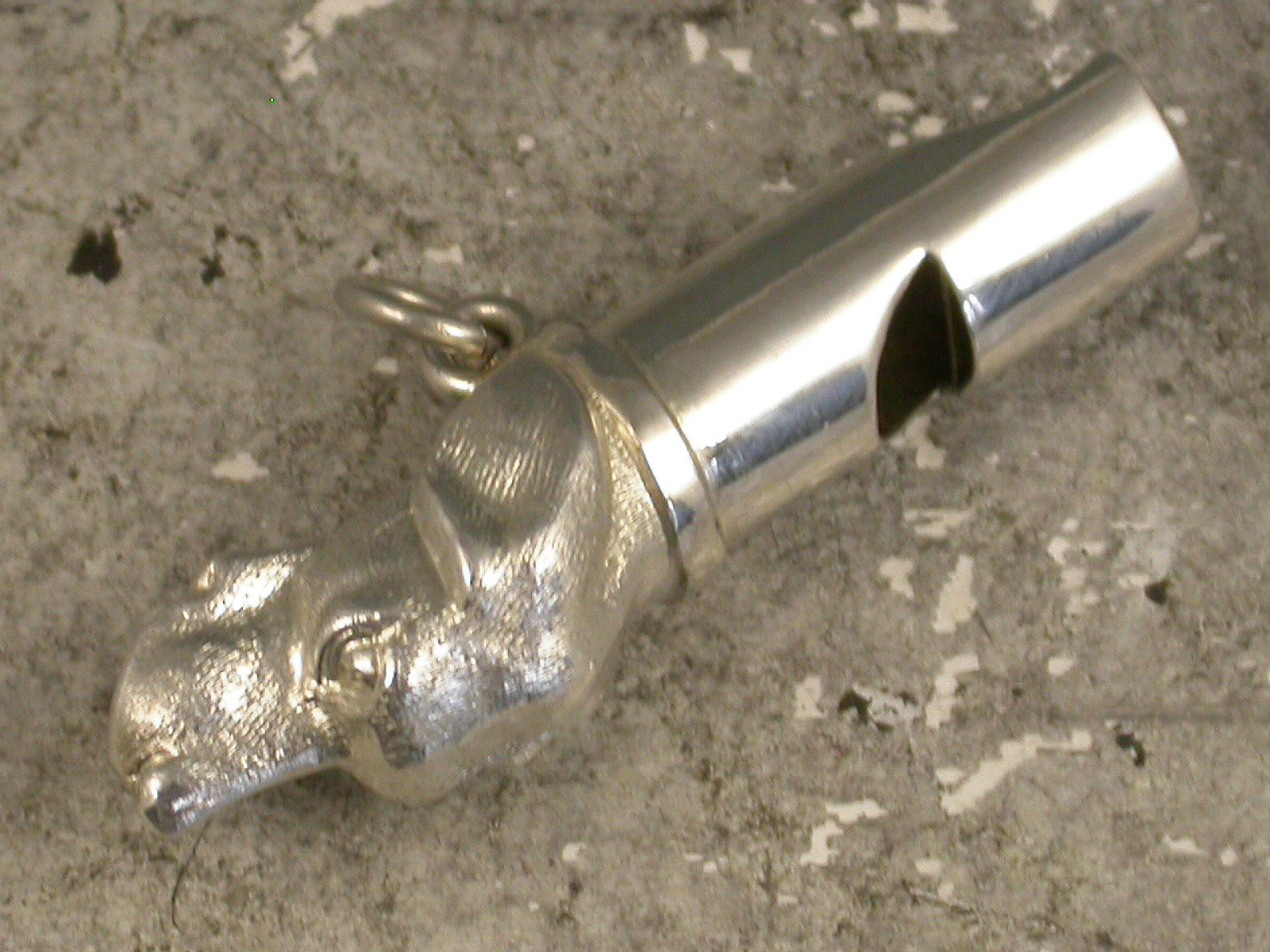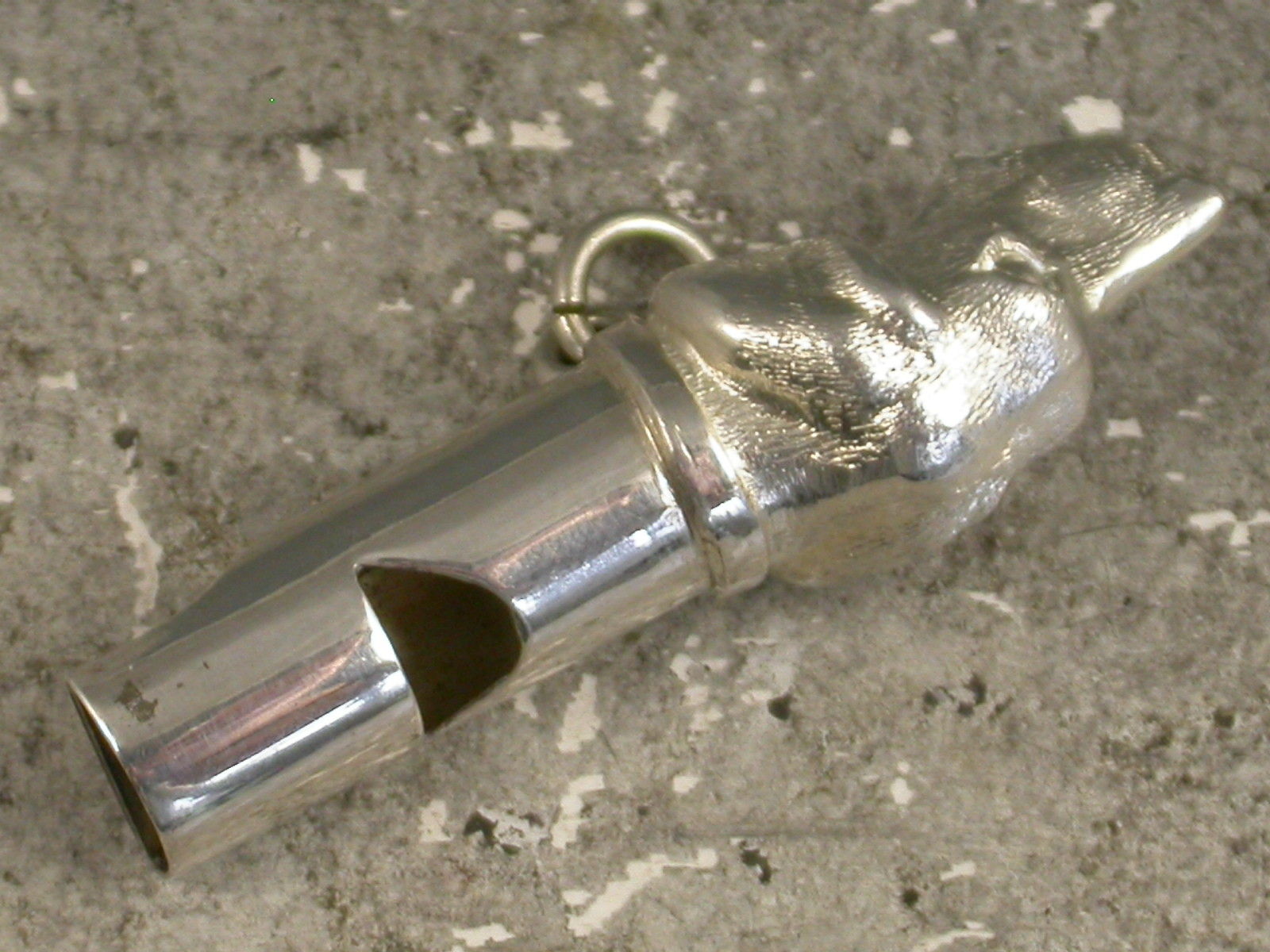 A good Victorian novelty silver Whistle made in the form of a Dogs Head, possibly a fox hound. With attached suspension ring.