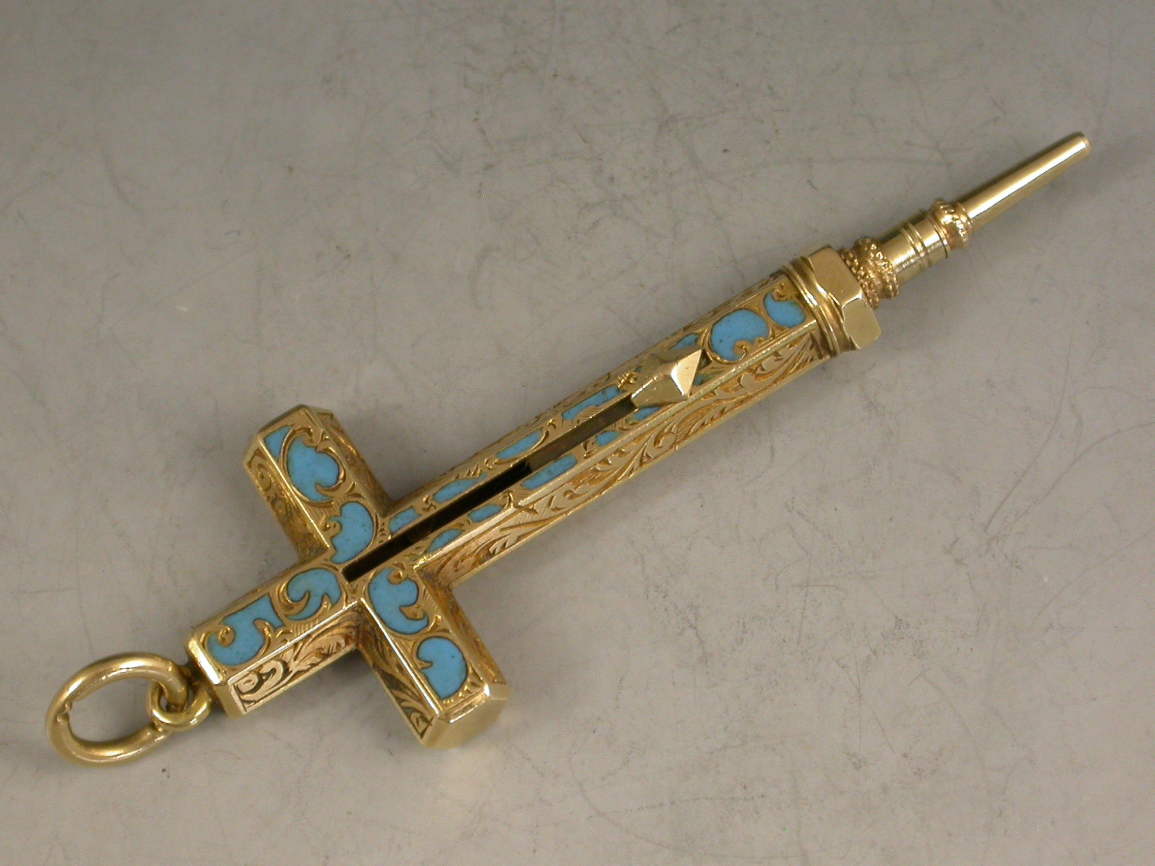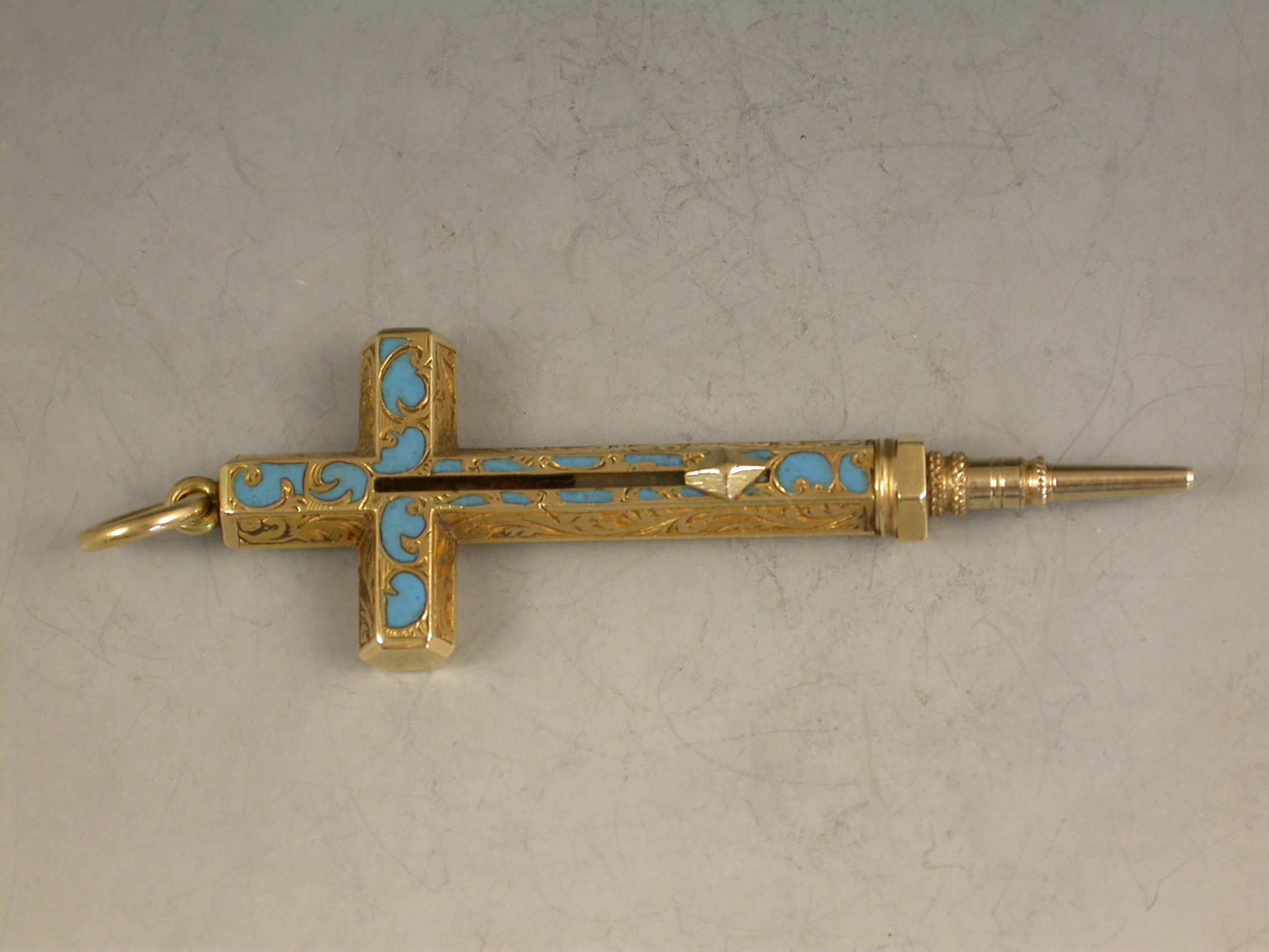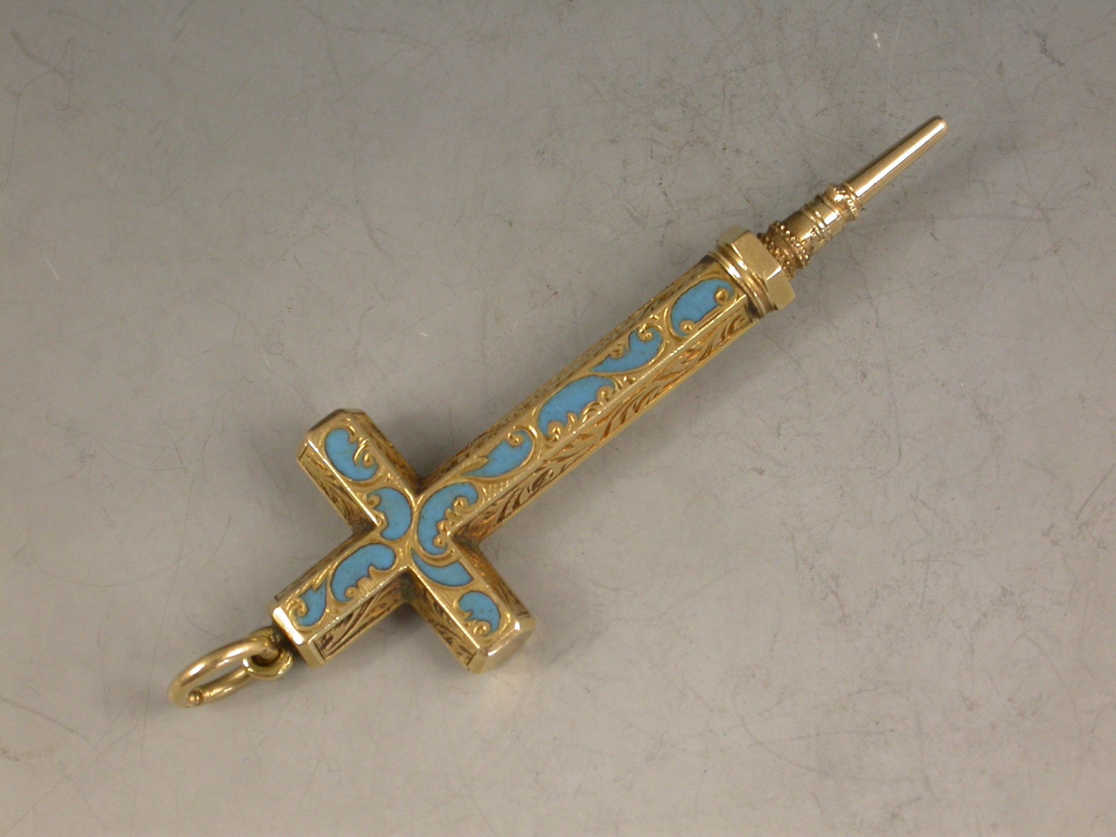 A fine early Victorian gold and enamel novelty Propelling Pencil made in the form of a cross with attached suspension ring and diamond shaped slider button, the hexagonal body engraved with foliate scroll decoration highlighted with turquoise enamel.