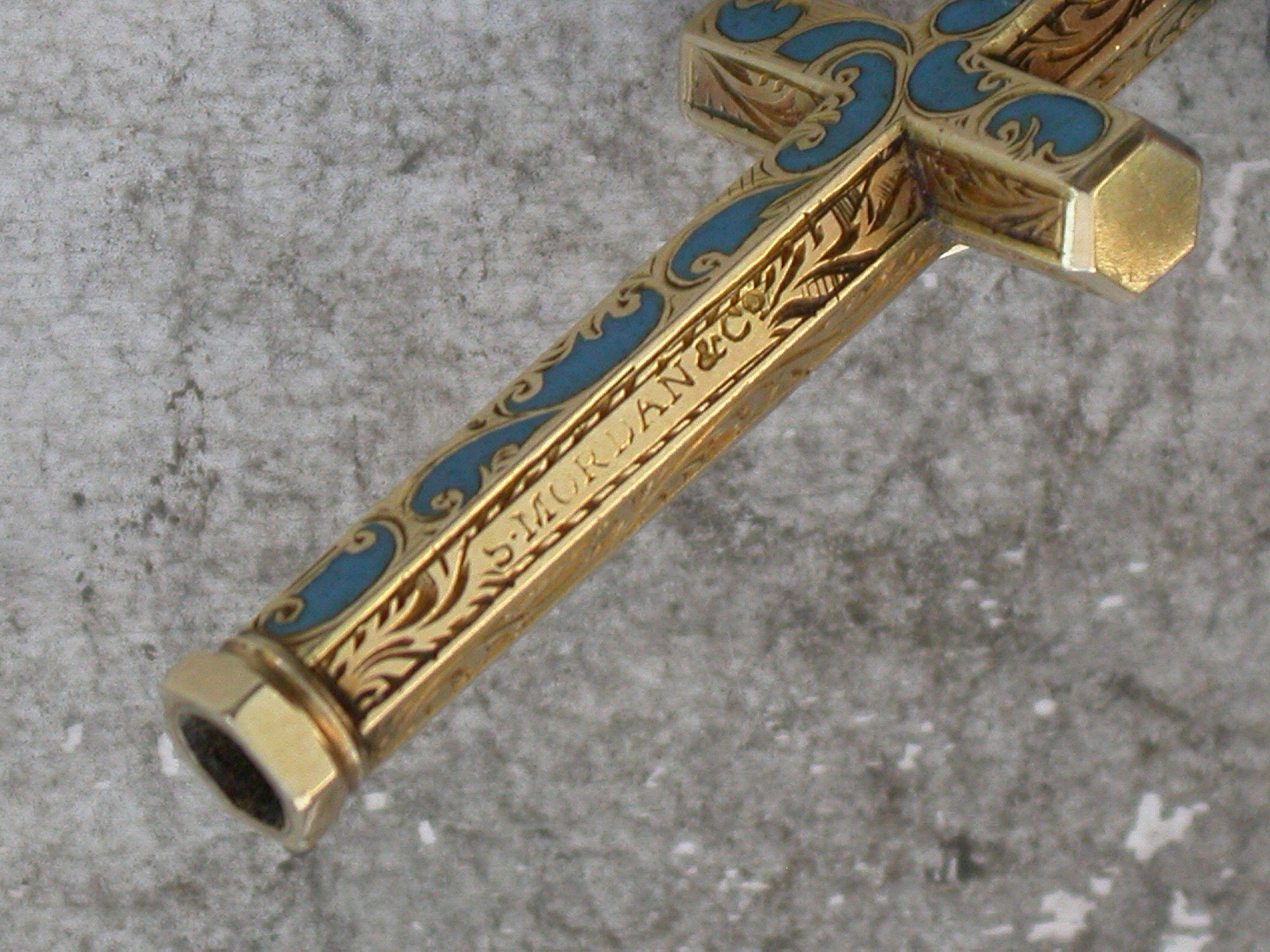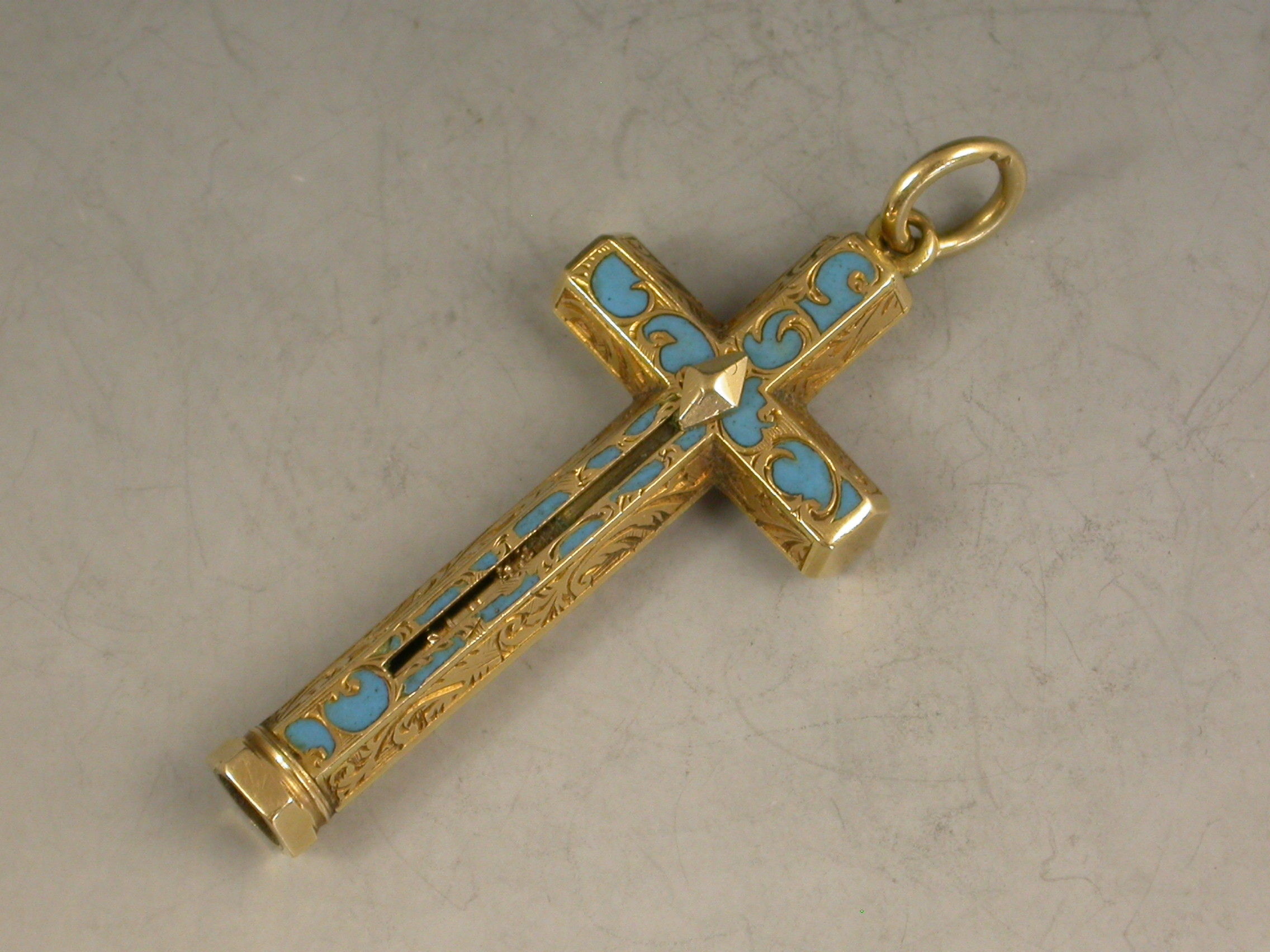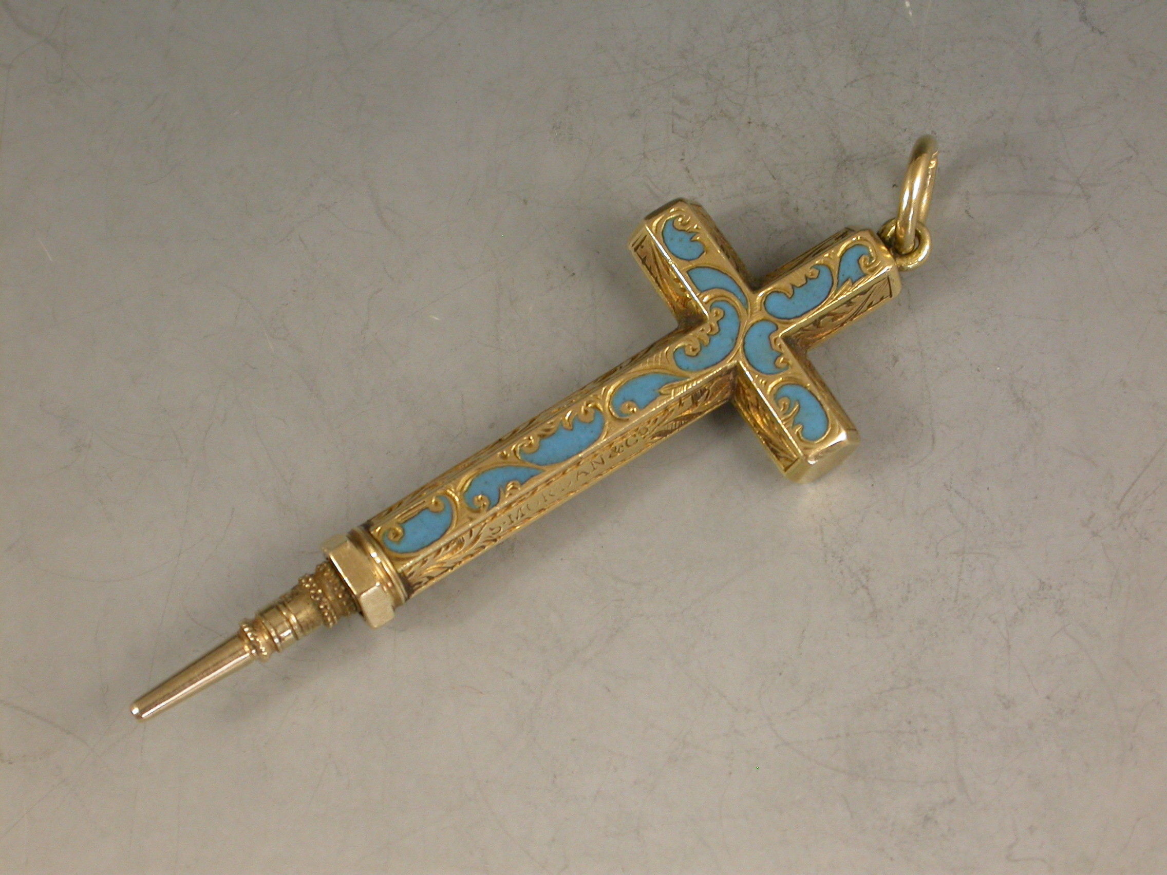 A fine early Victorian gold and enamel novelty Propelling Pencil made in the form of a cross with attached suspension ring and diamond shaped slider button, the hexagonal body engraved with foliate scroll decoration highlighted with turquoise enamel.