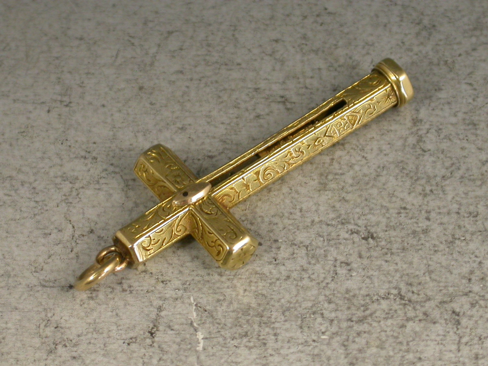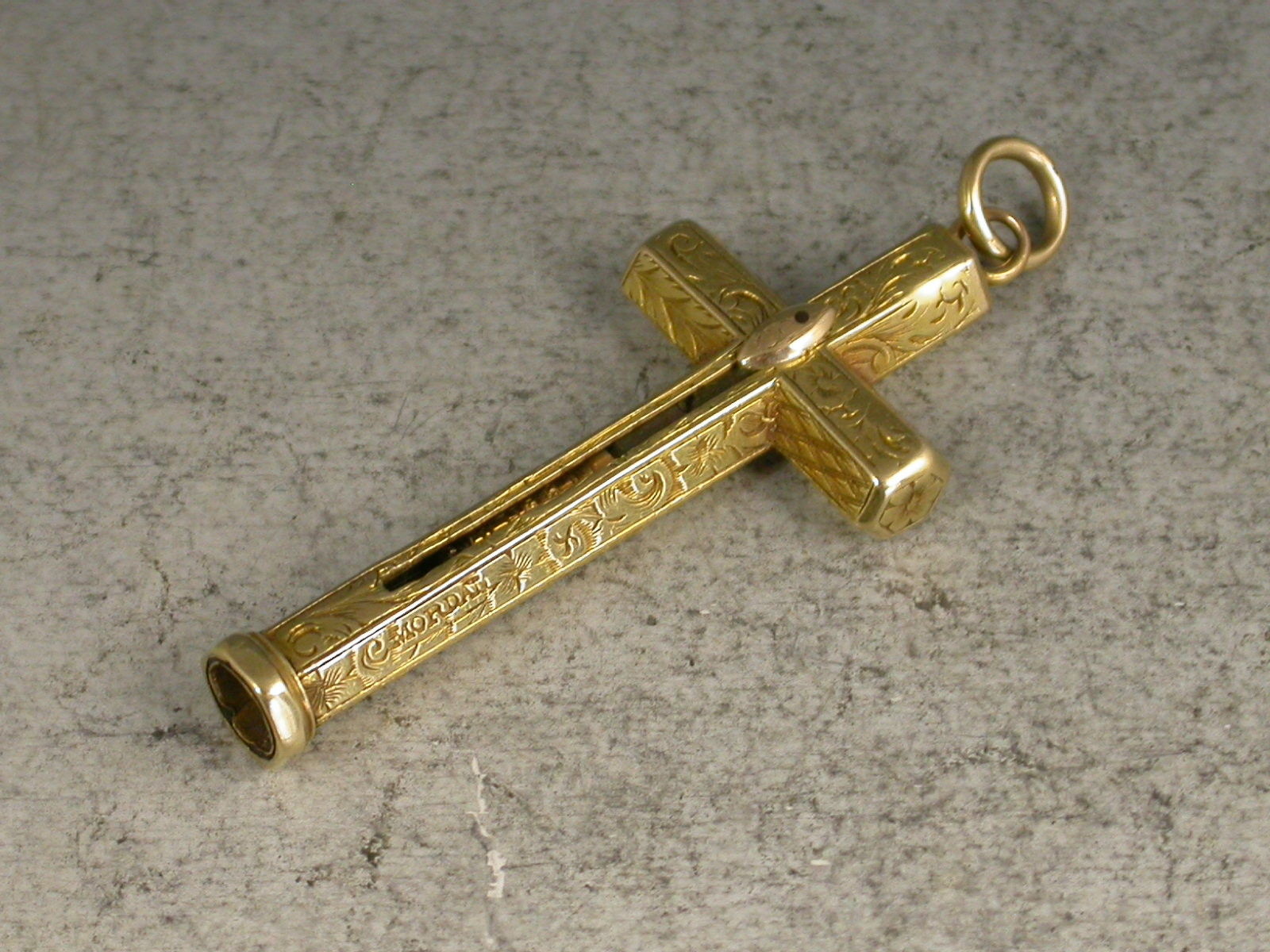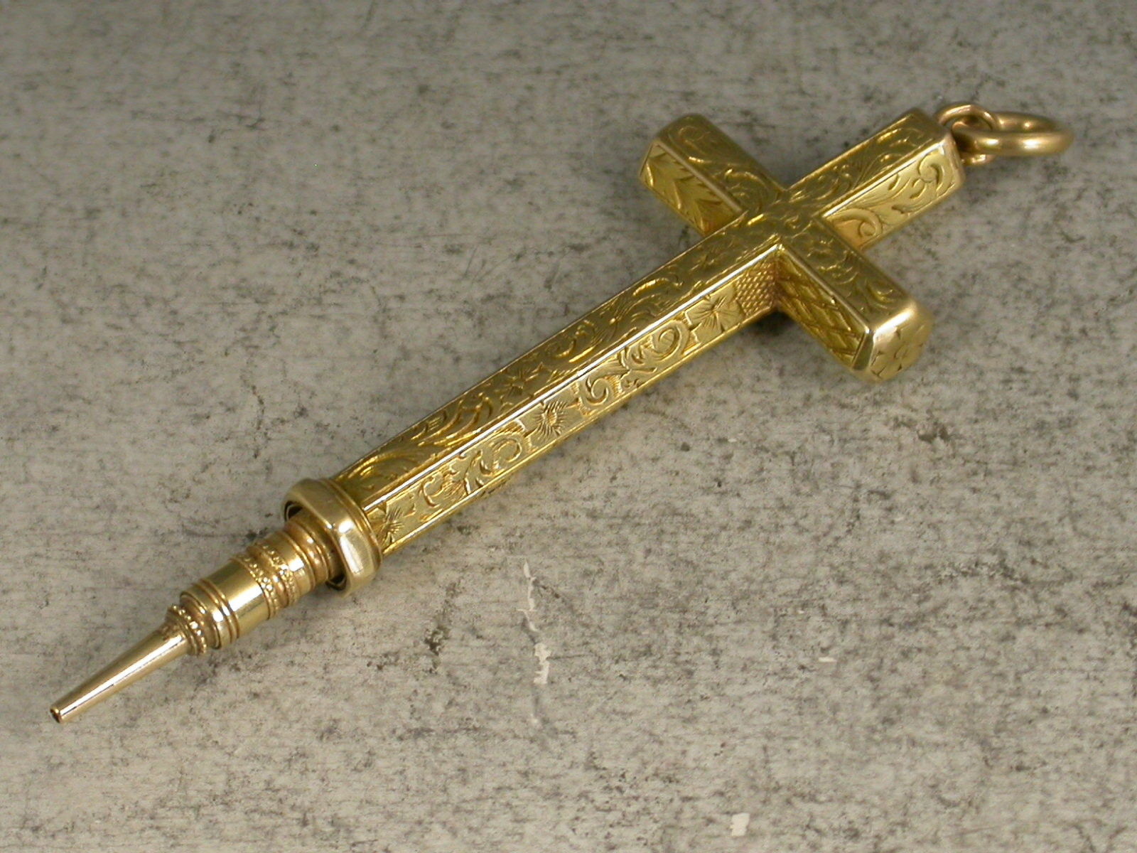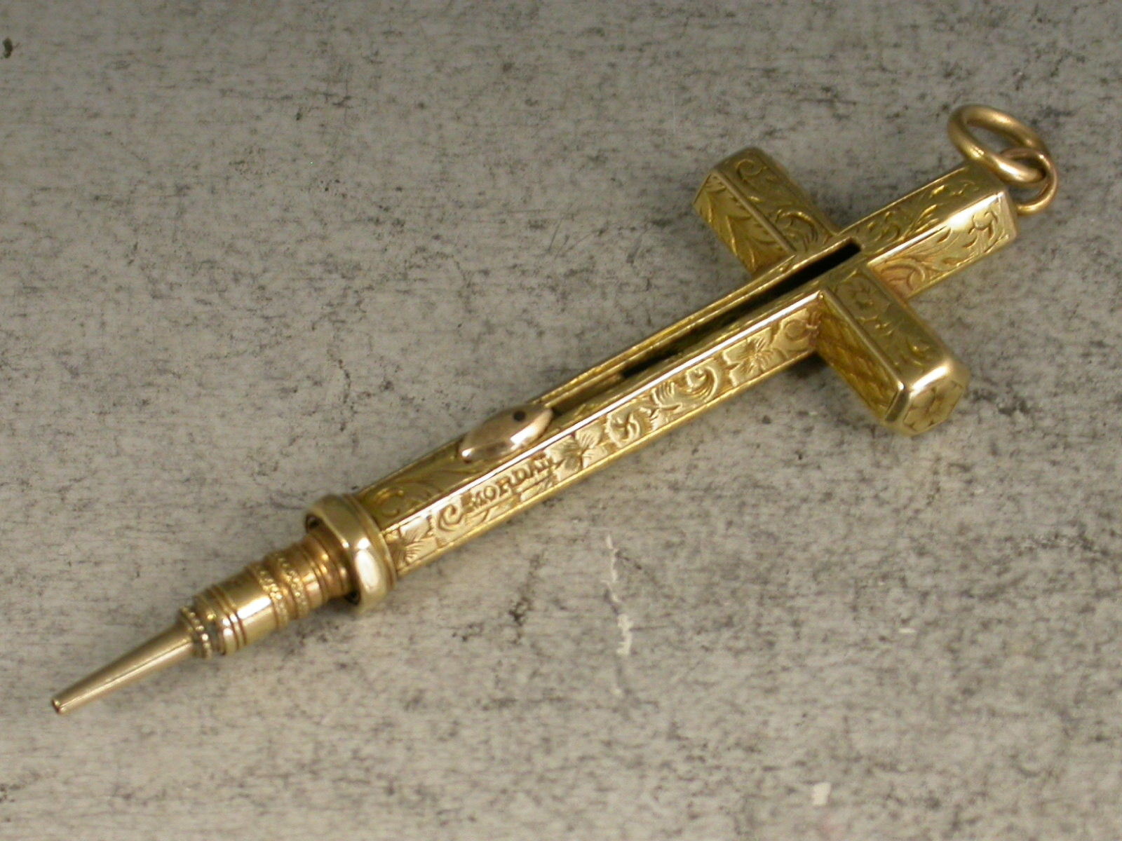 A good early Victorian gold cased novelty Pencil made in the form of a cross, with attached suspension ring, the hexagonal body engraved with folaite scroll decoration and stamped MORDAN. Also stamped with a diamond registration mark for 1843. Push button slide action to open.