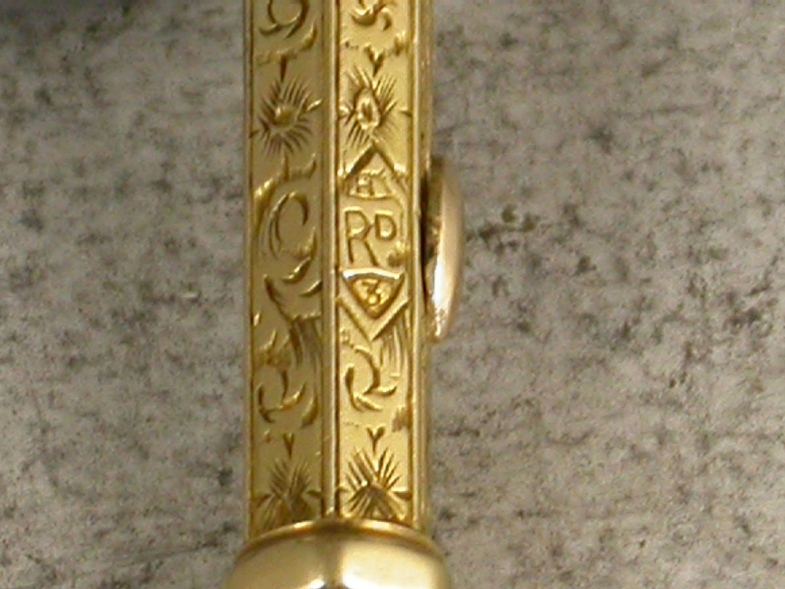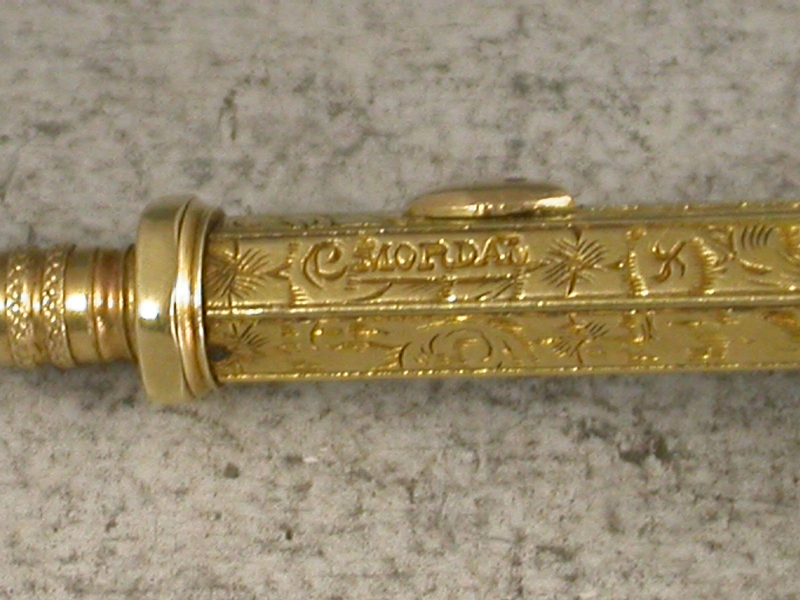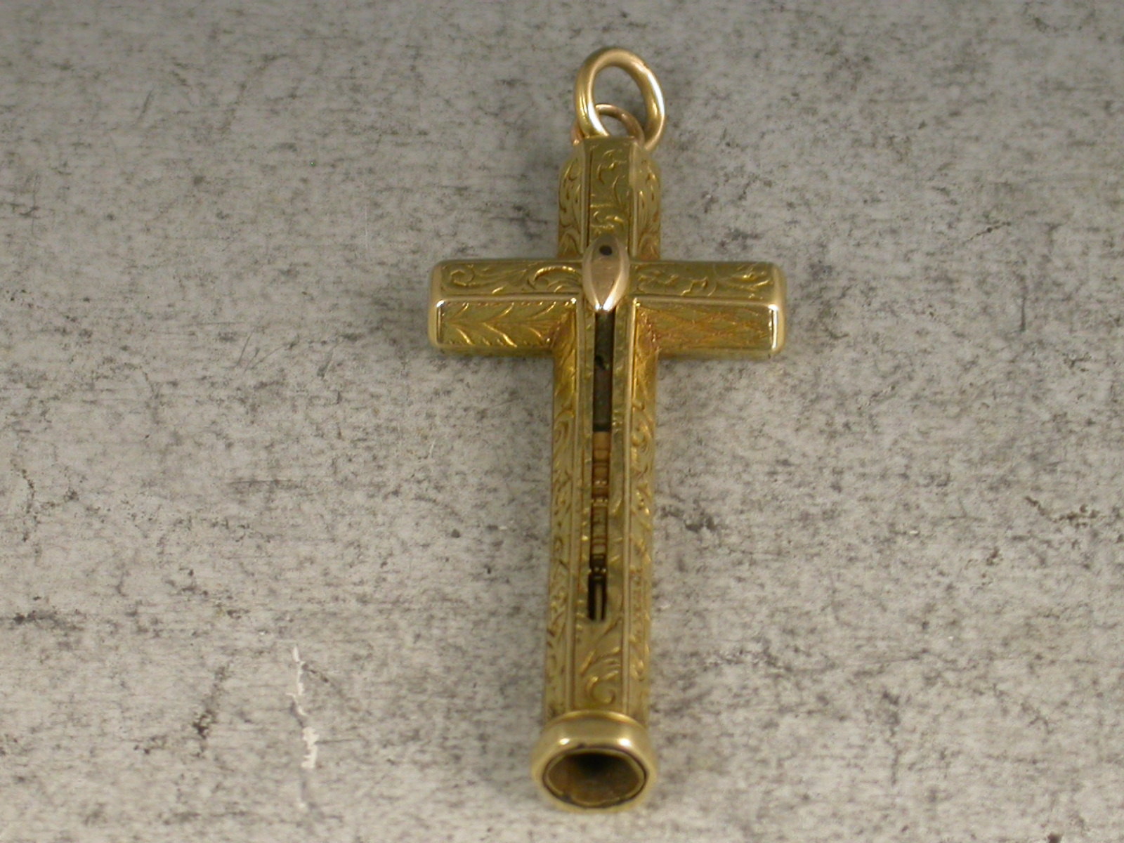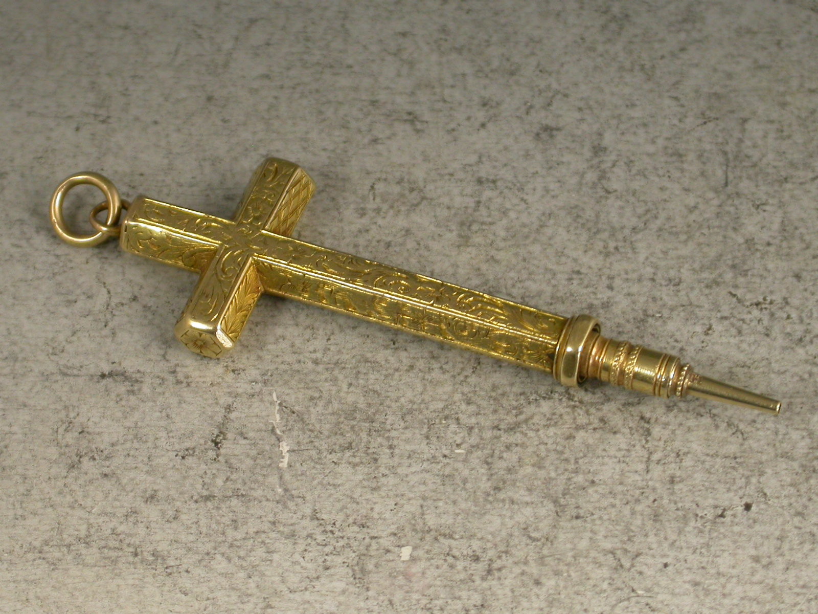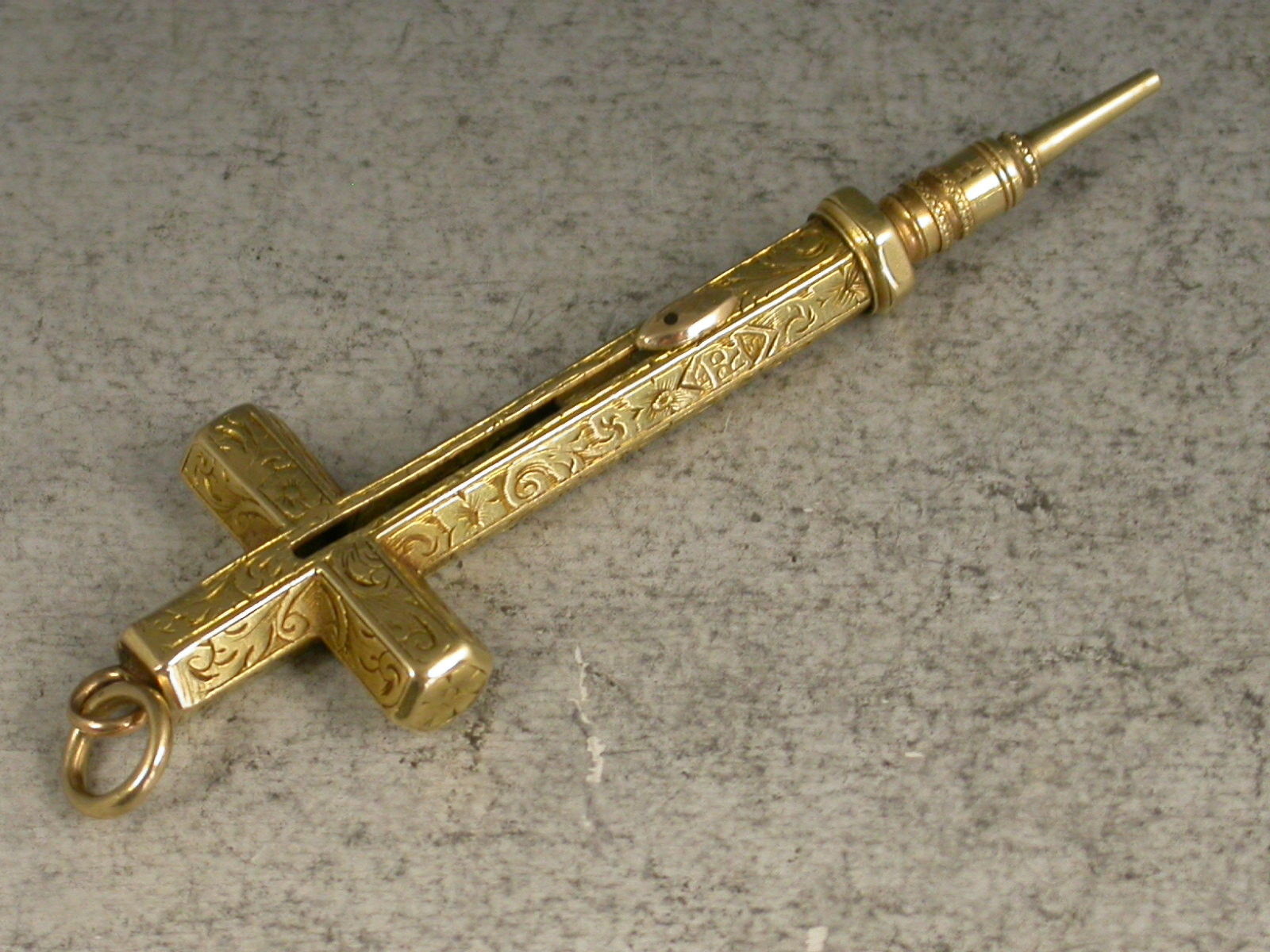 A good early Victorian gold cased novelty Pencil made in the form of a cross, with attached suspension ring, the hexagonal body engraved with folaite scroll decoration and stamped MORDAN. Also stamped with a diamond registration mark for 1843. Push button slide action to open.