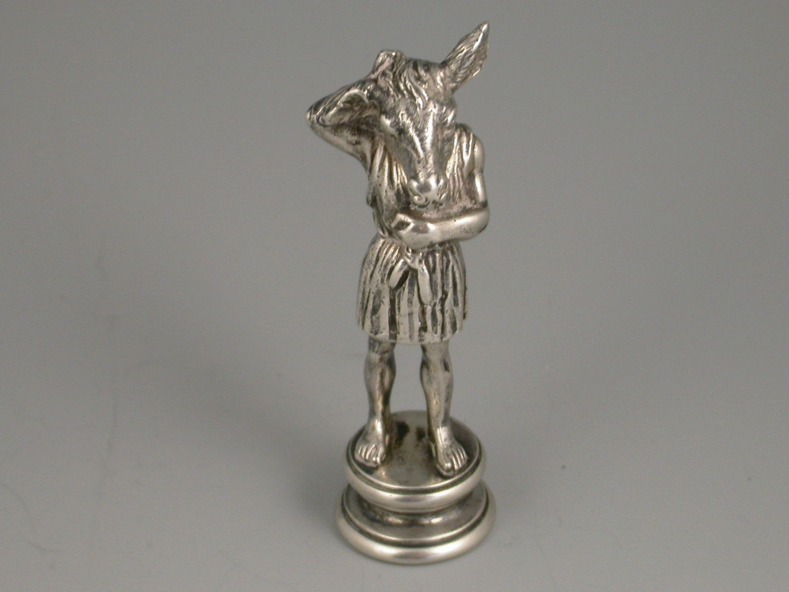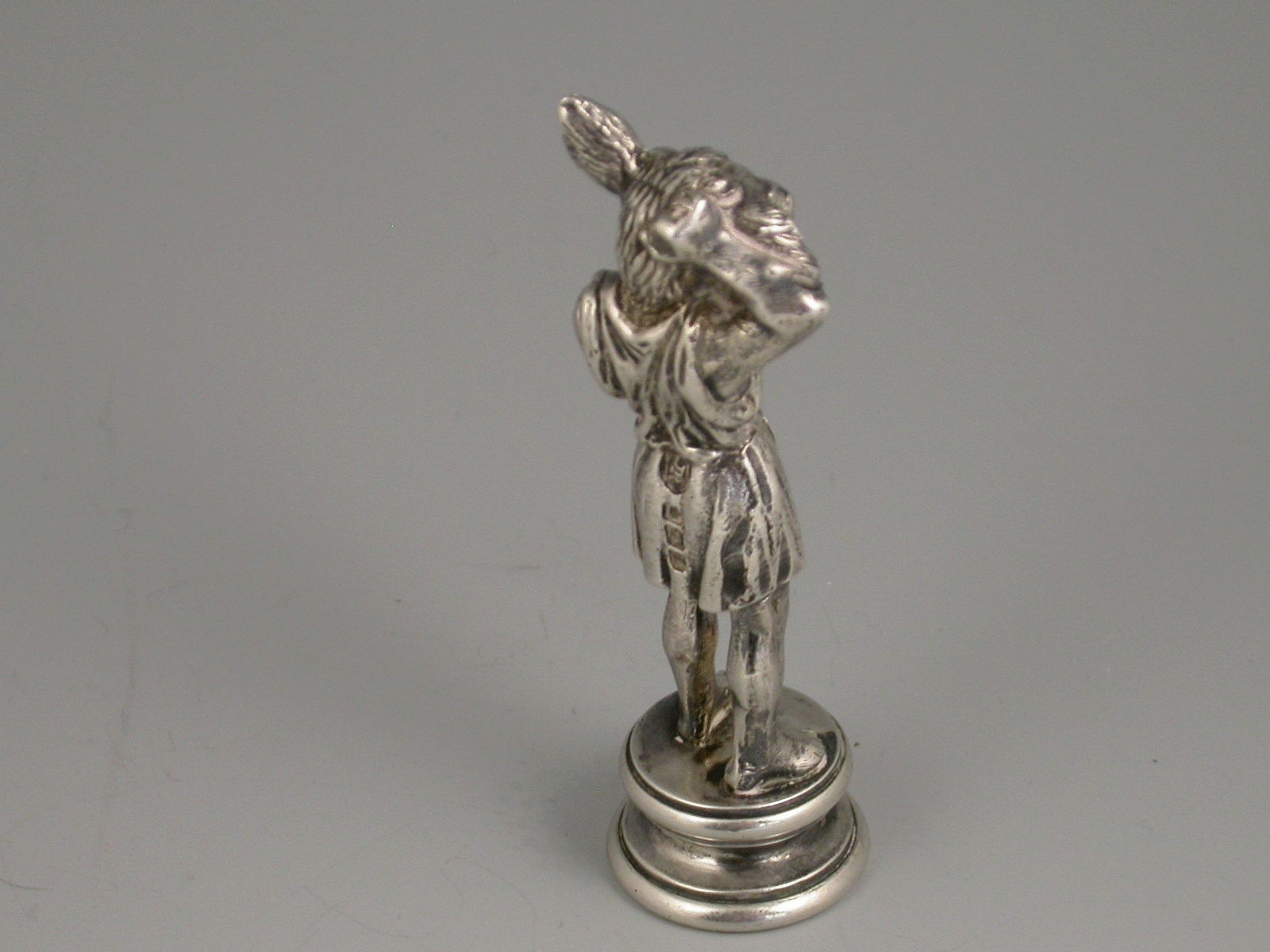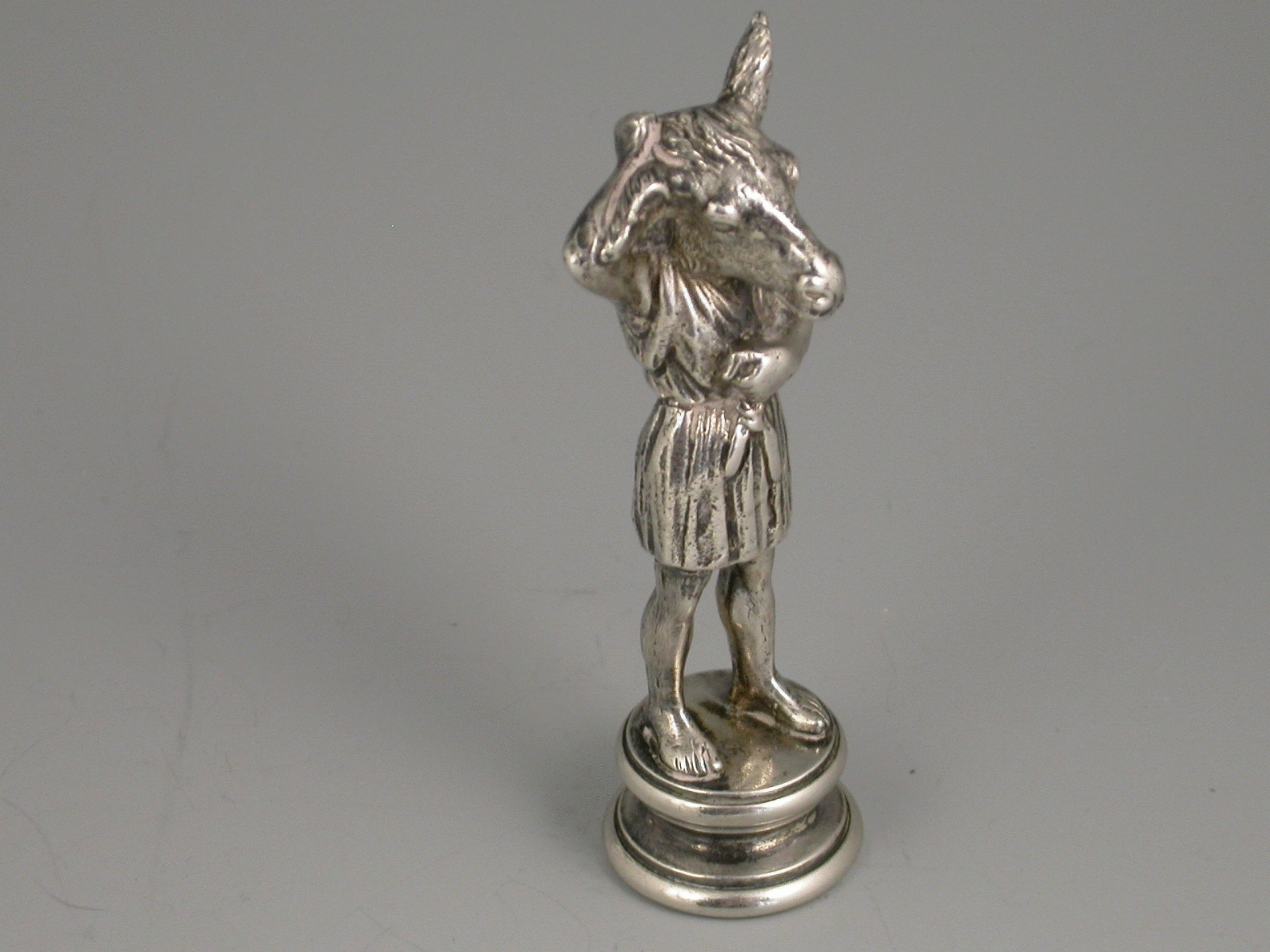 A fine Victorian heavy cast silver Seal formed as the character ‘Bottom’ from Shakespeare’s play - ‘A Mid Summers Night Dream.' Standing on a circular pedestal base.