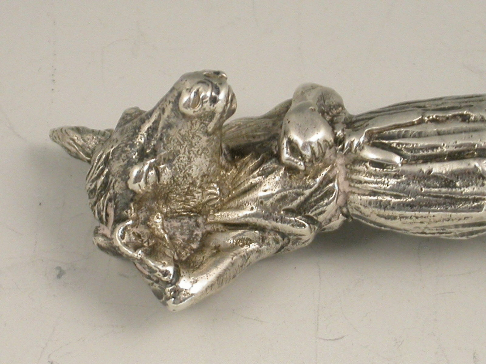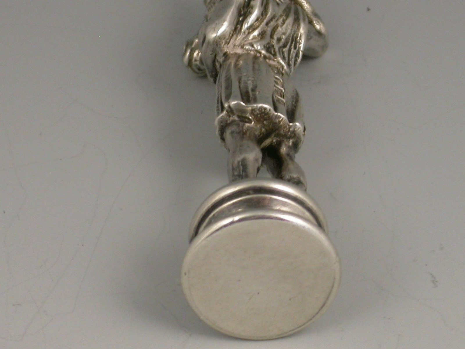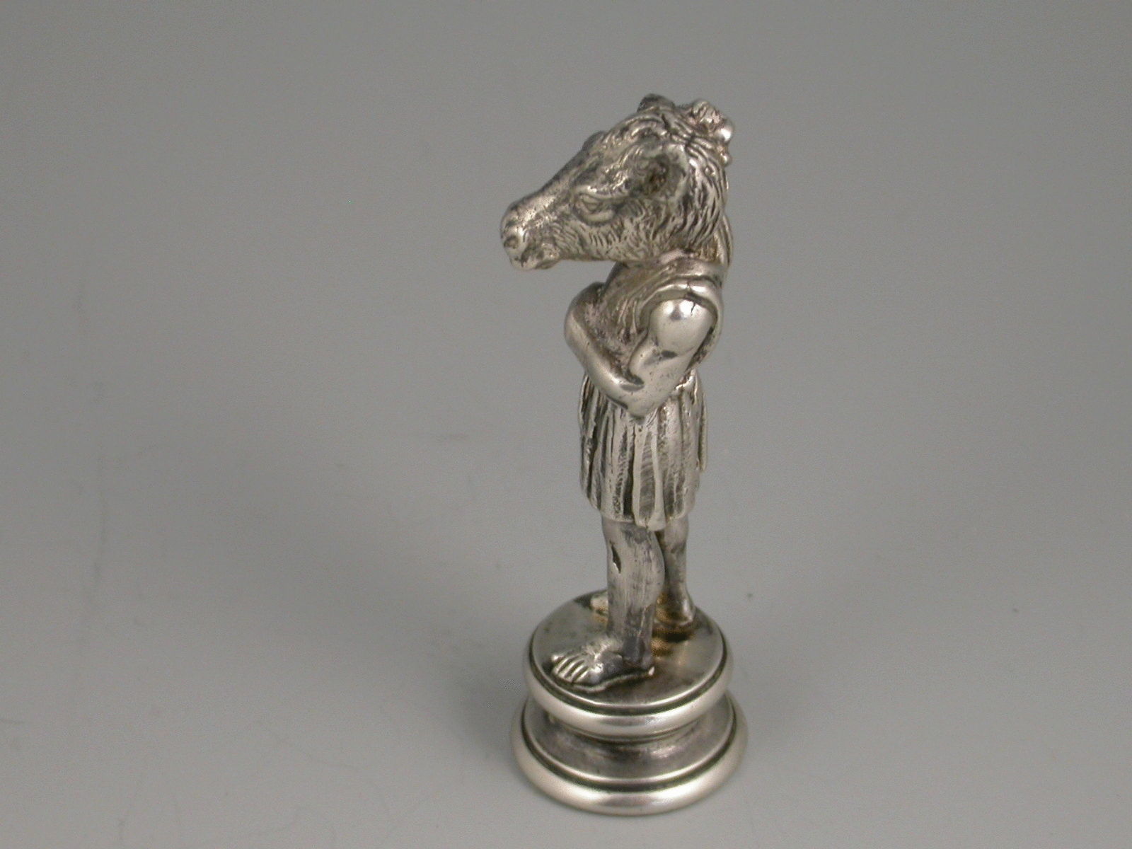 A fine Victorian heavy cast silver Seal formed as the character ‘Bottom’ from Shakespeare’s play - ‘A Mid Summers Night Dream.' Standing on a circular pedestal base.