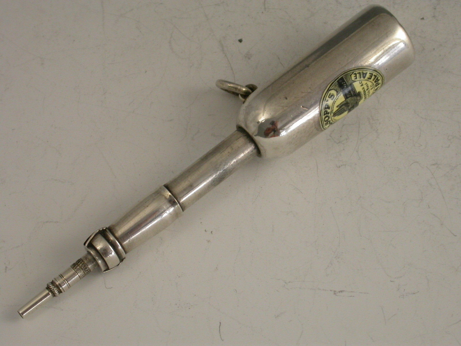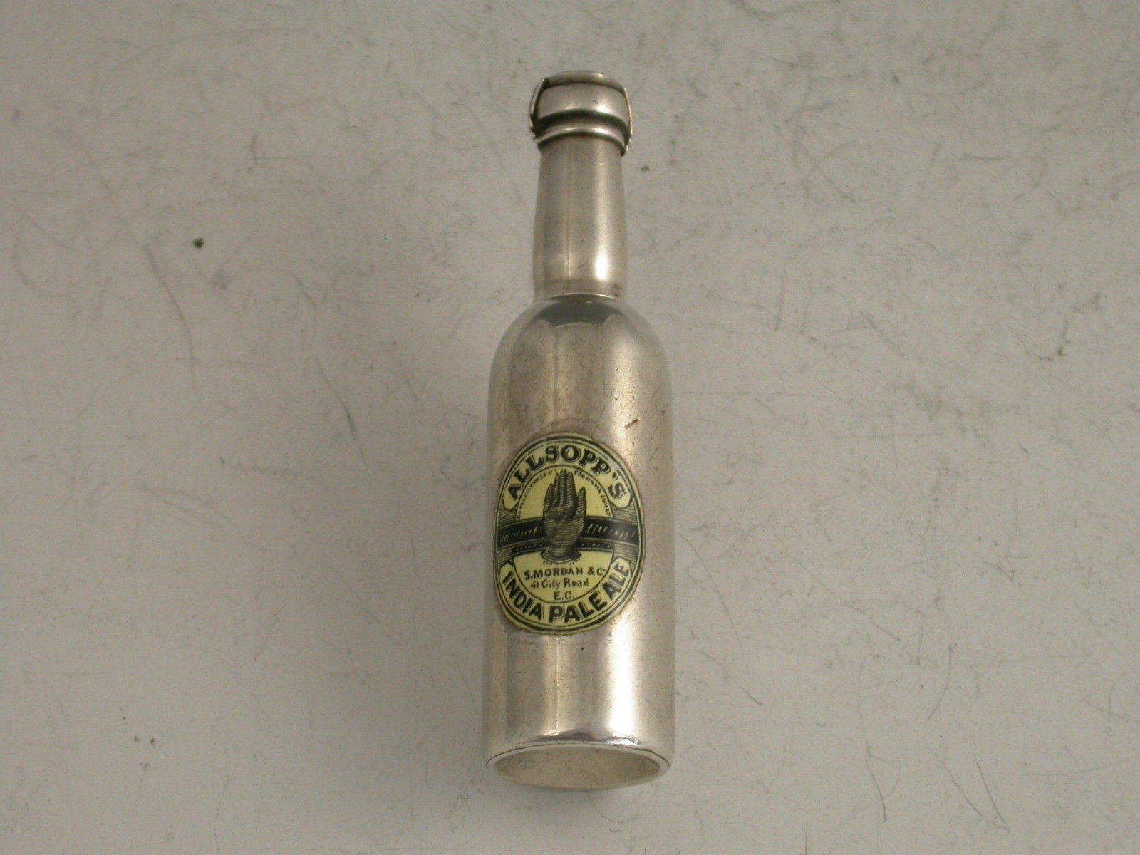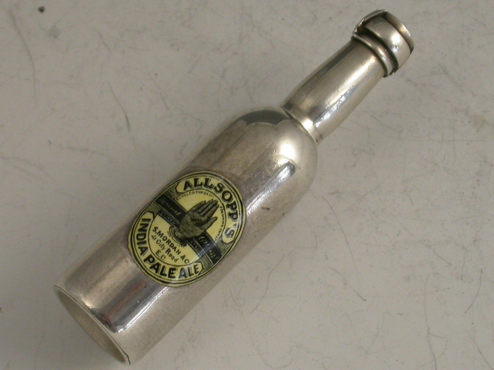 A rare Victorian novelty silver telescopic Propelling Pencil made in the form of an Allsopp's India Pale Ale Beer Bottle, with inset enamel plaque signed - S Mordan & Co 41 City Road, EC.