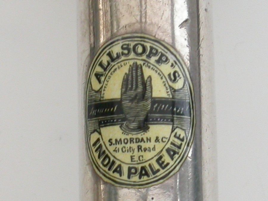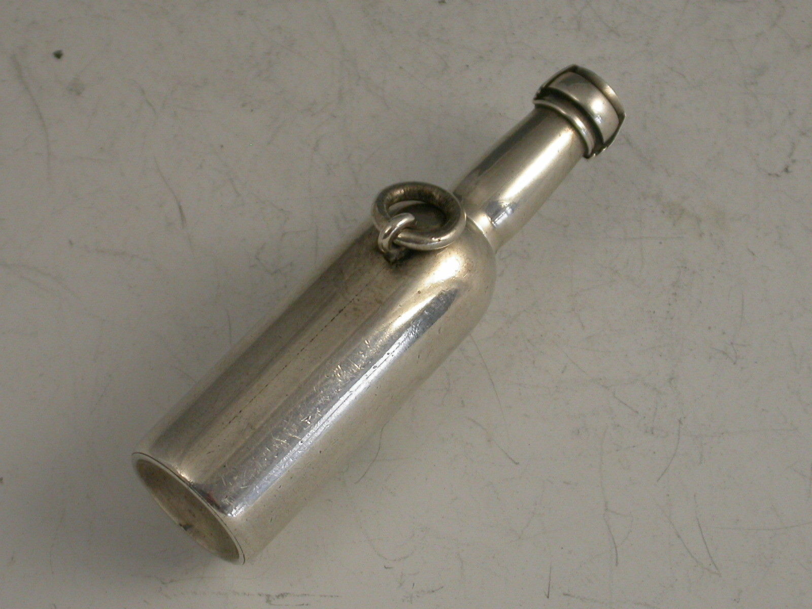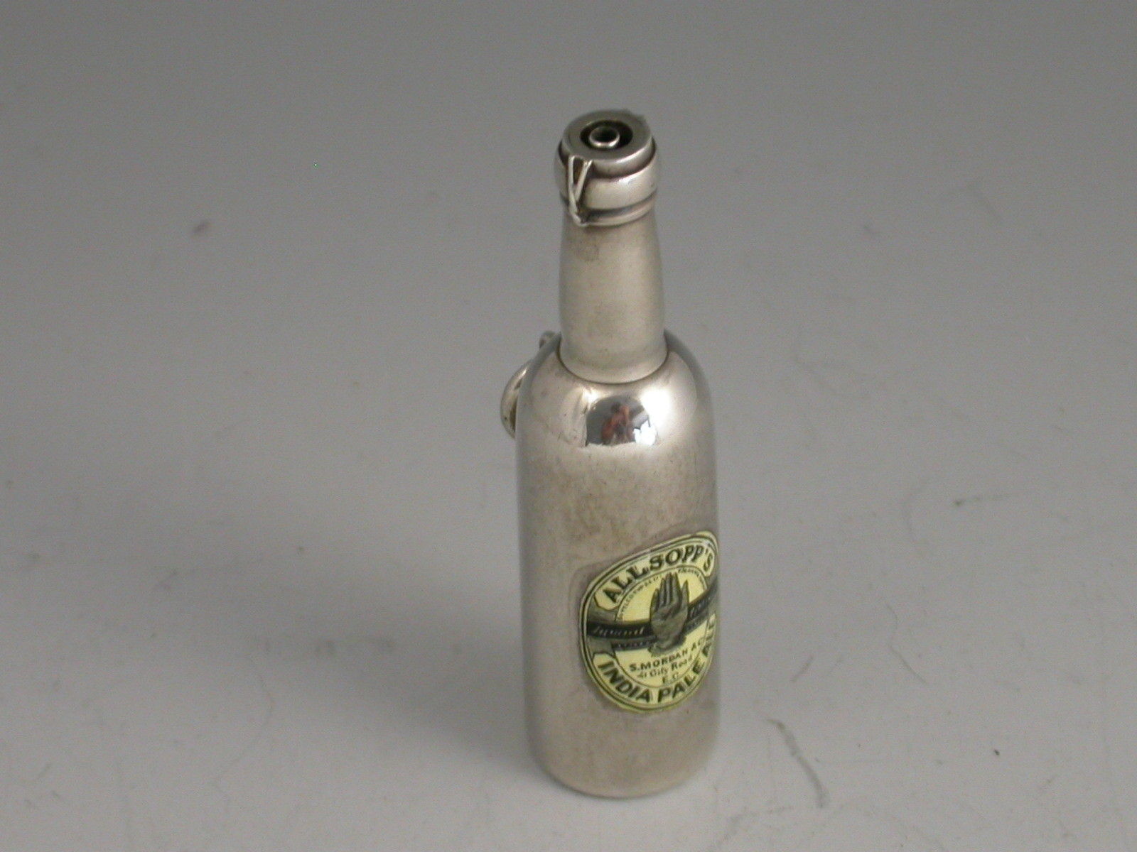 A rare Victorian novelty silver telescopic Propelling Pencil made in the form of an Allsopp's India Pale Ale Beer Bottle, with inset enamel plaque signed - S Mordan & Co 41 City Road, EC.
