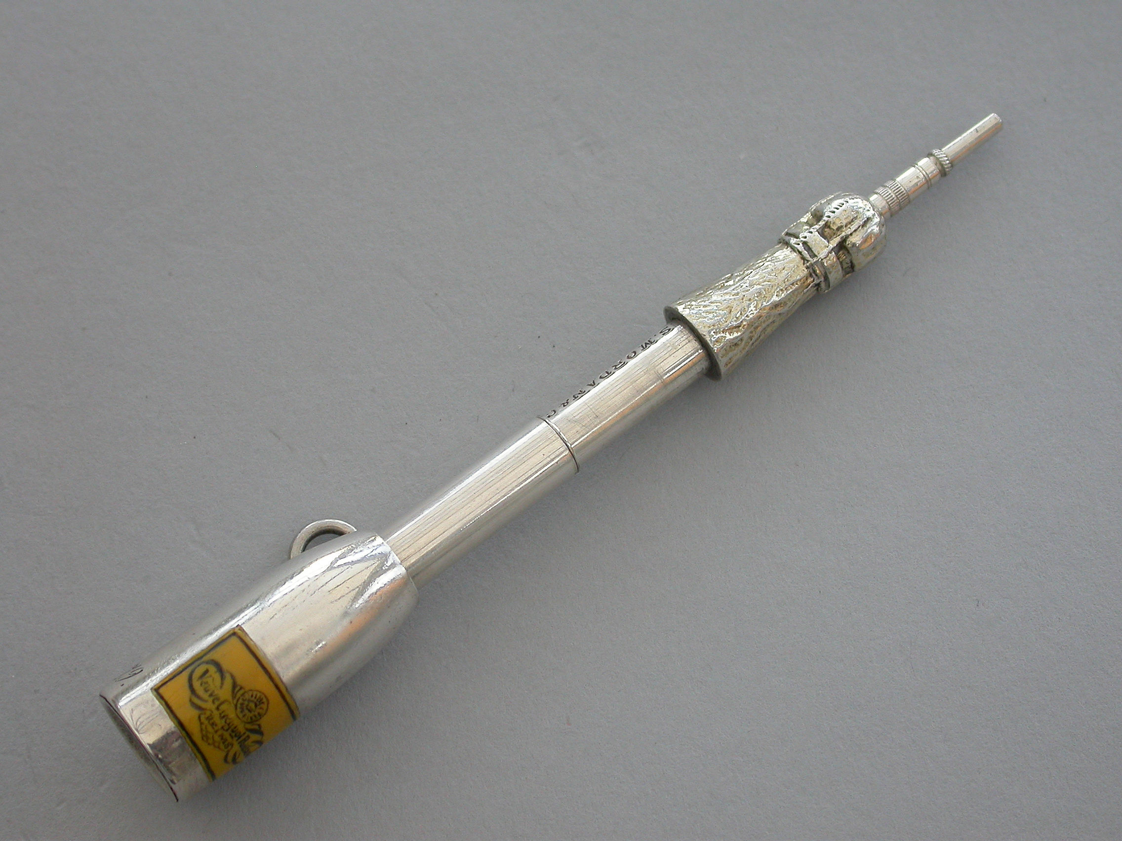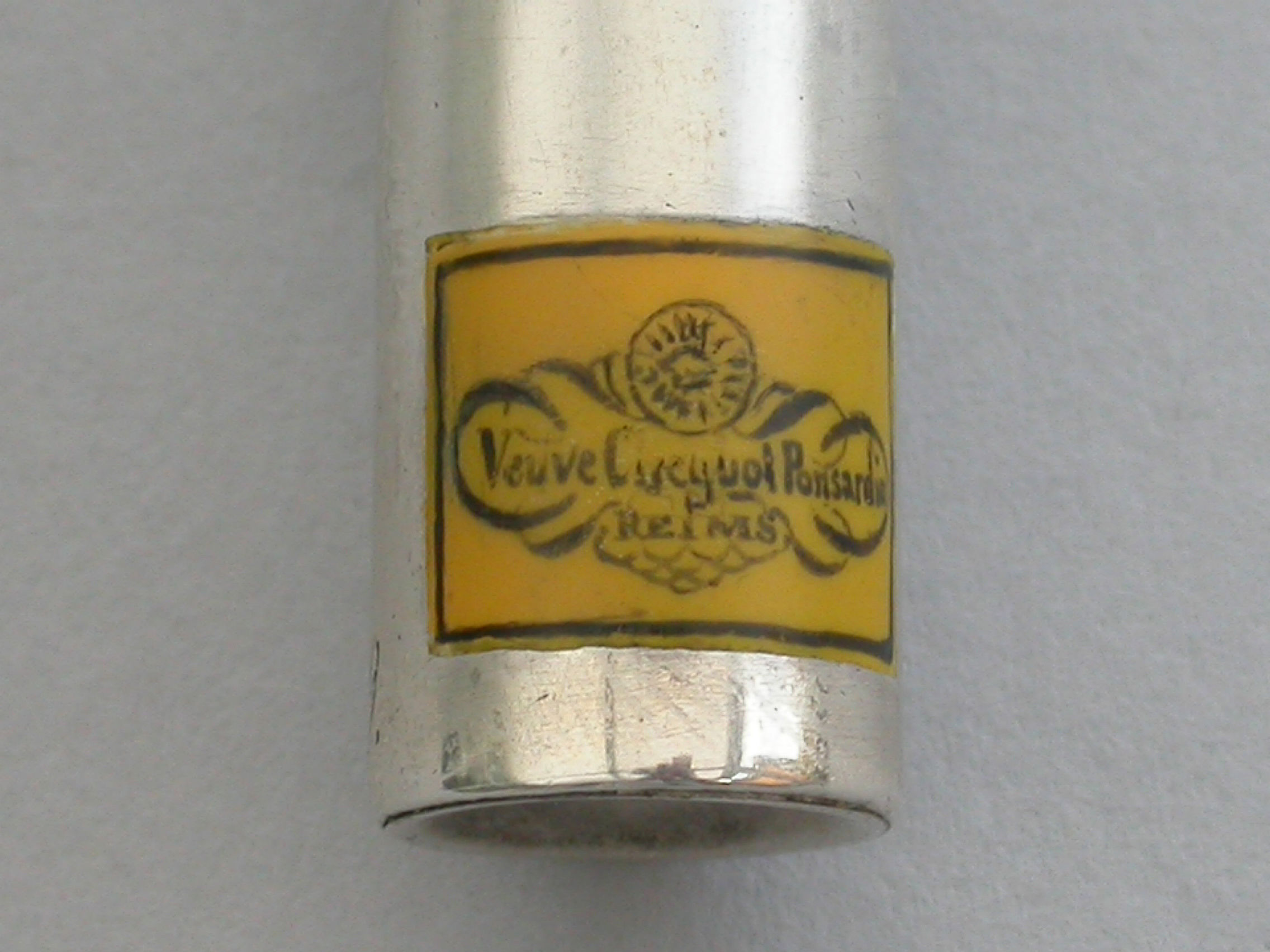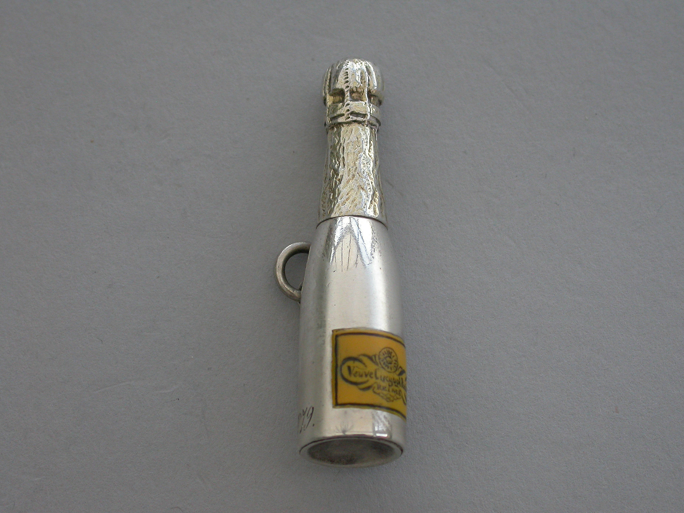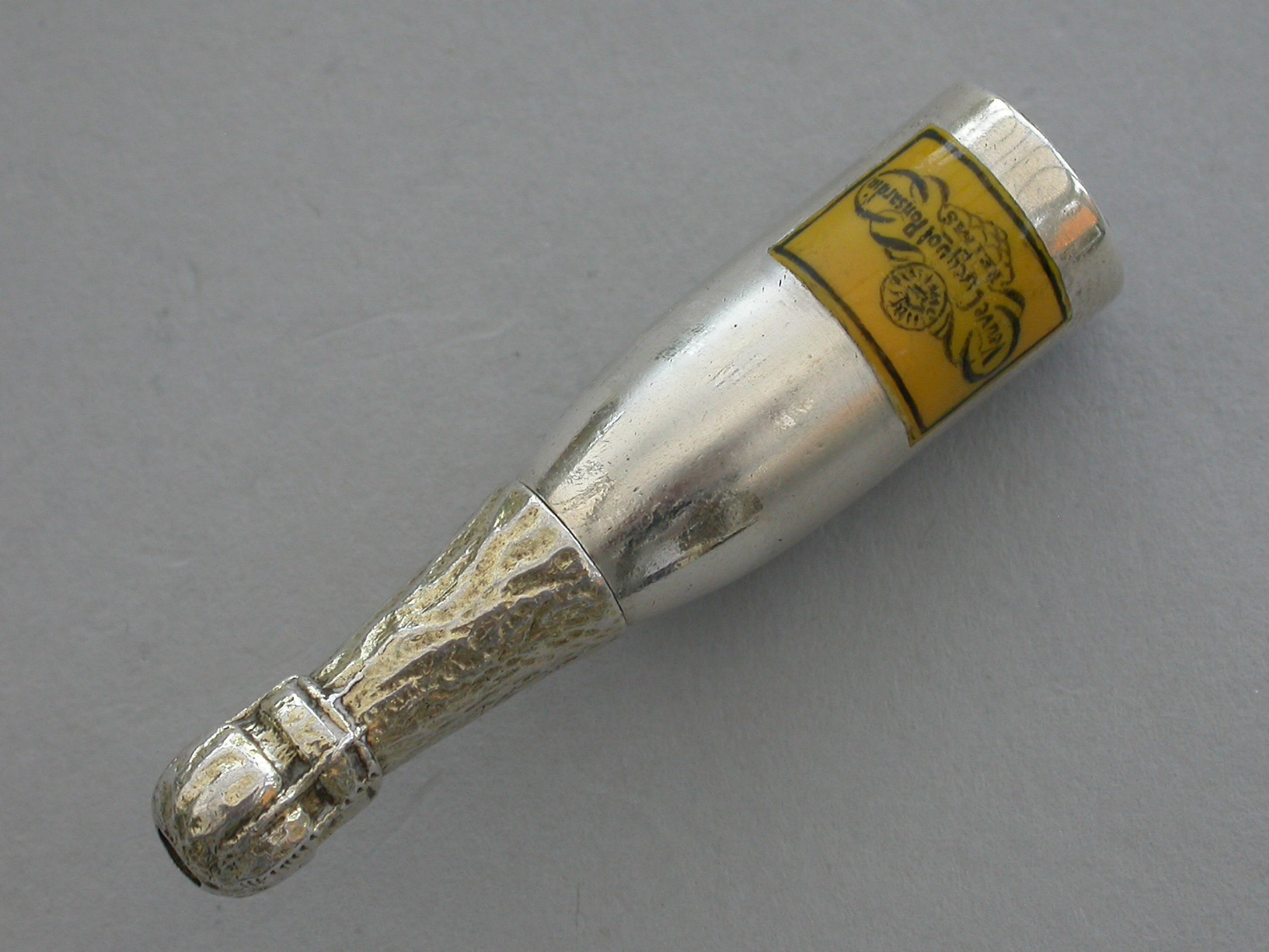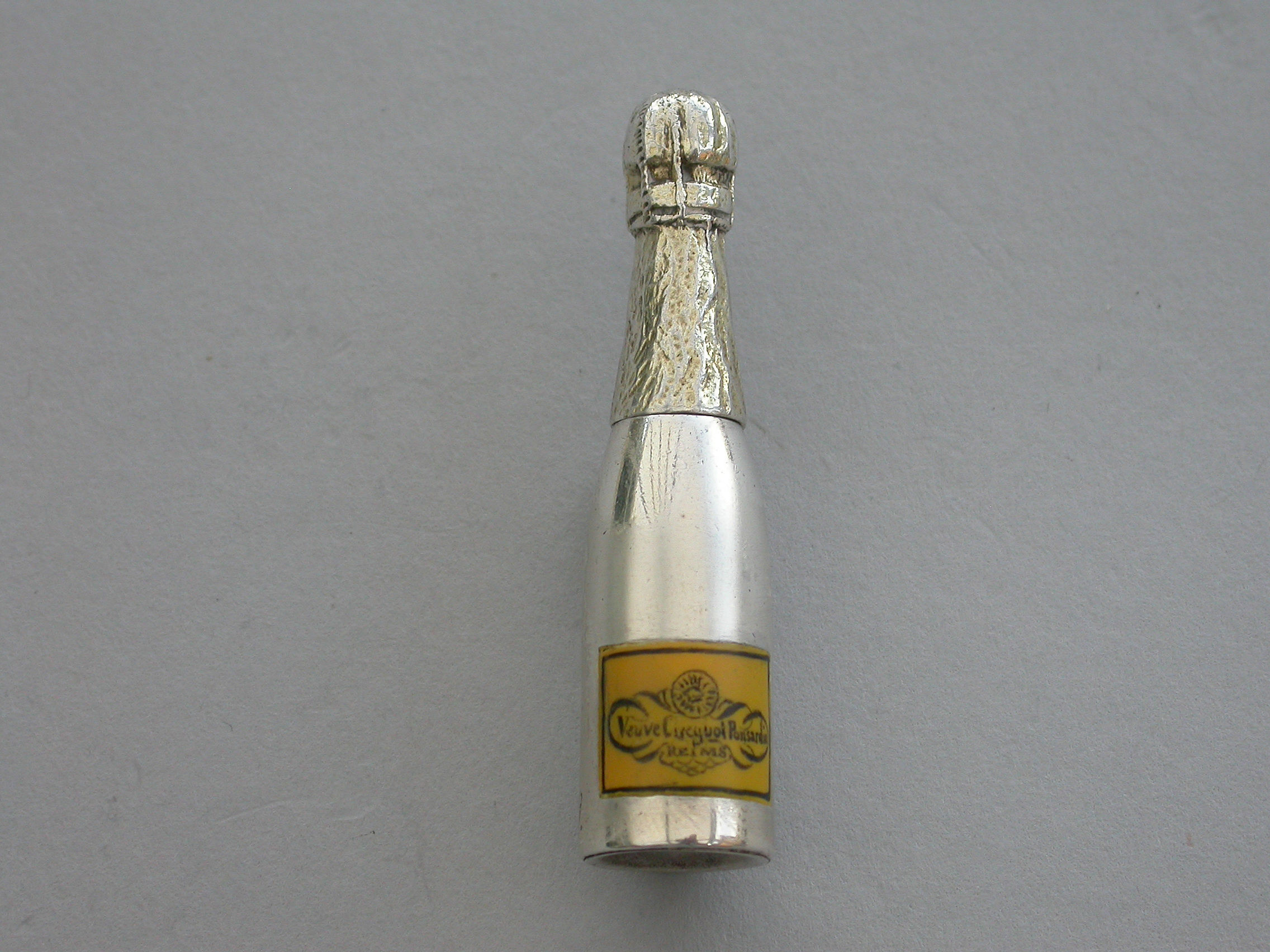 A good Victorian novelty silver and enamel telescopic Propelling Pencil made in the form of a Champagne Bottle, with distinctive yellow enamel label for Veuve Clicquot Ponsardin Champagne, Reims.