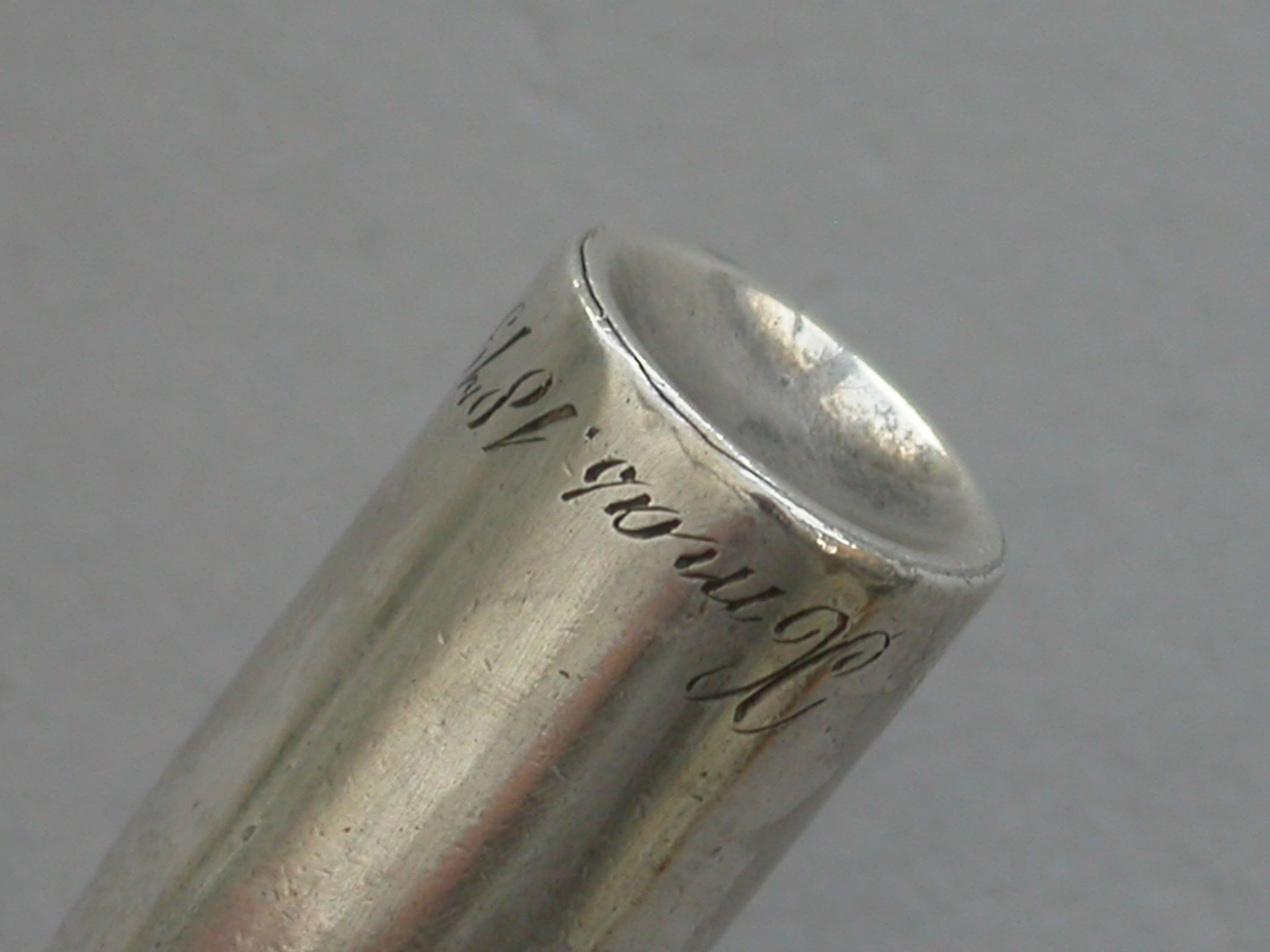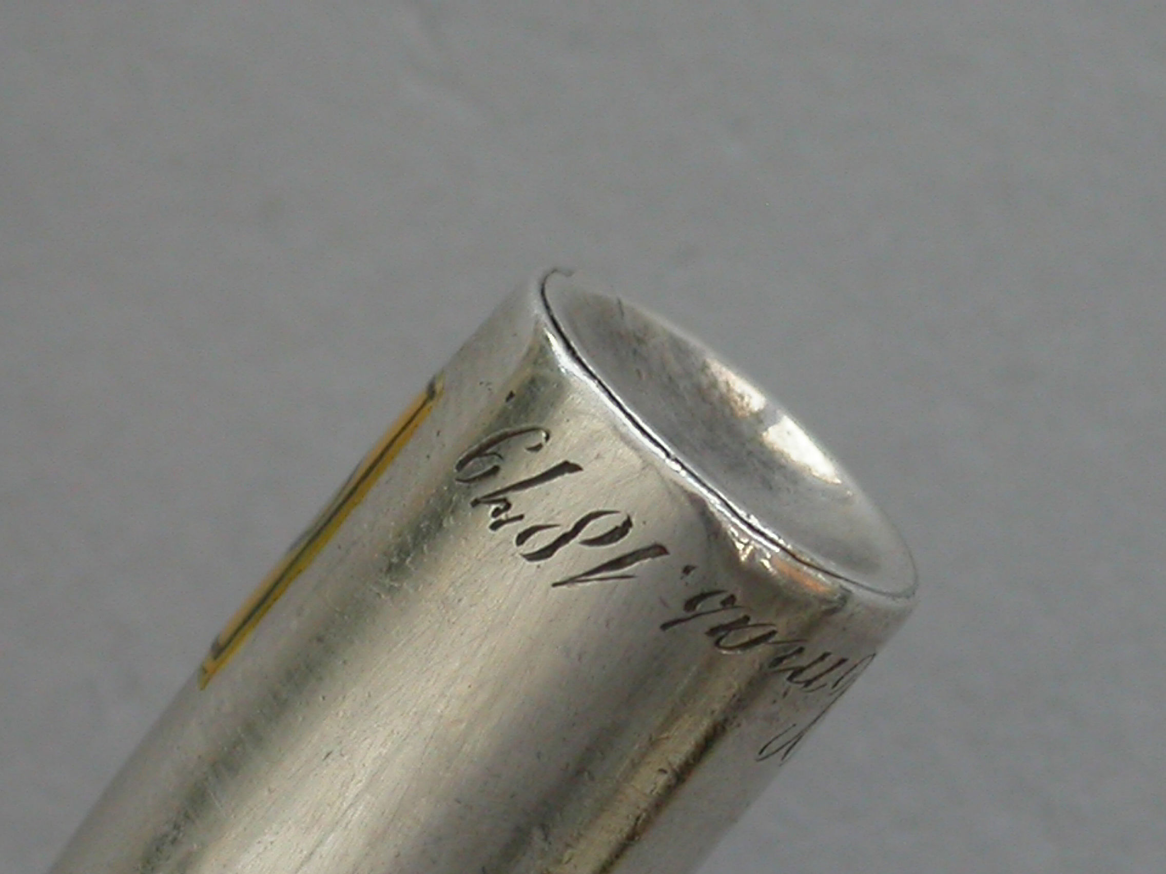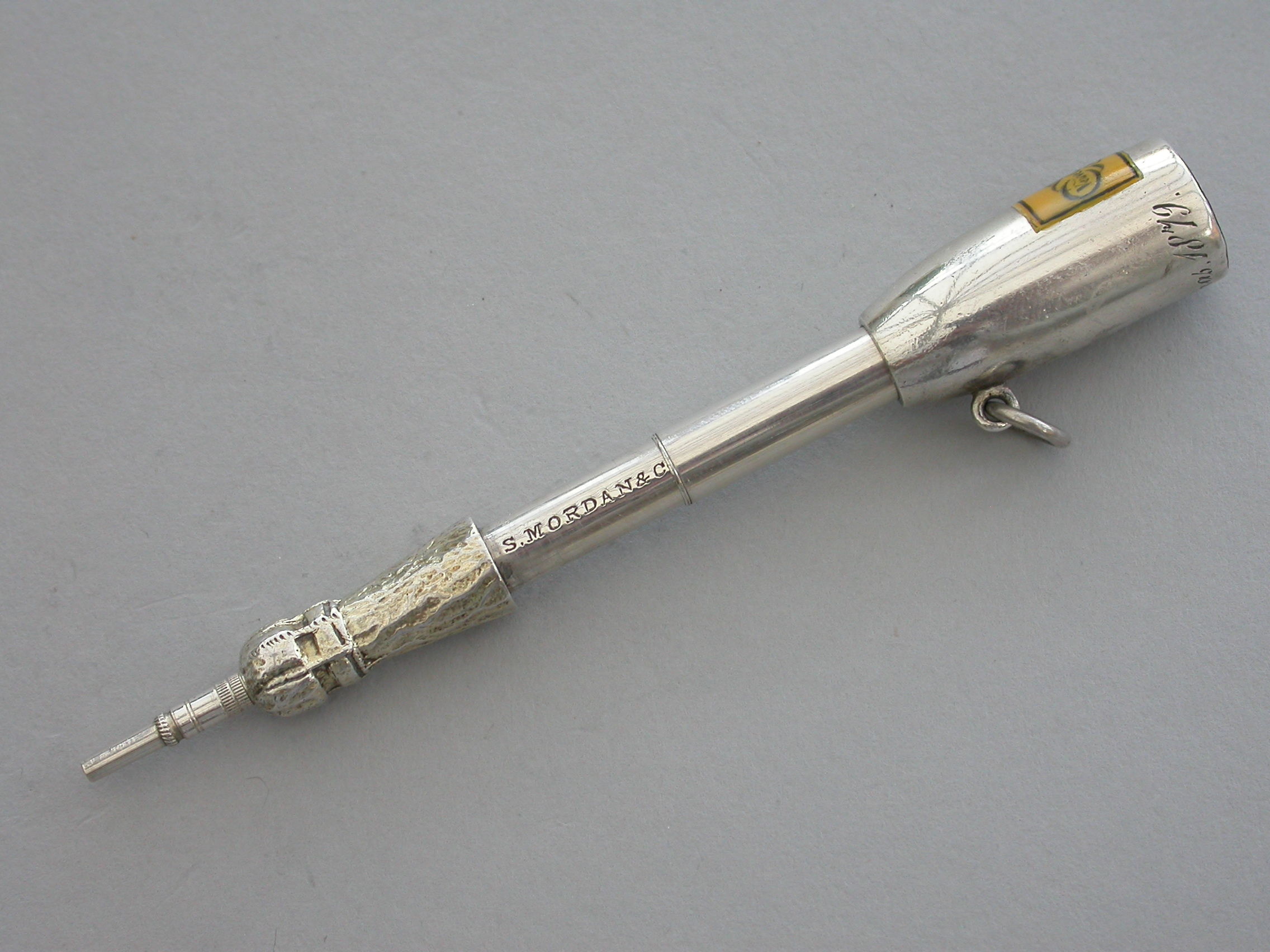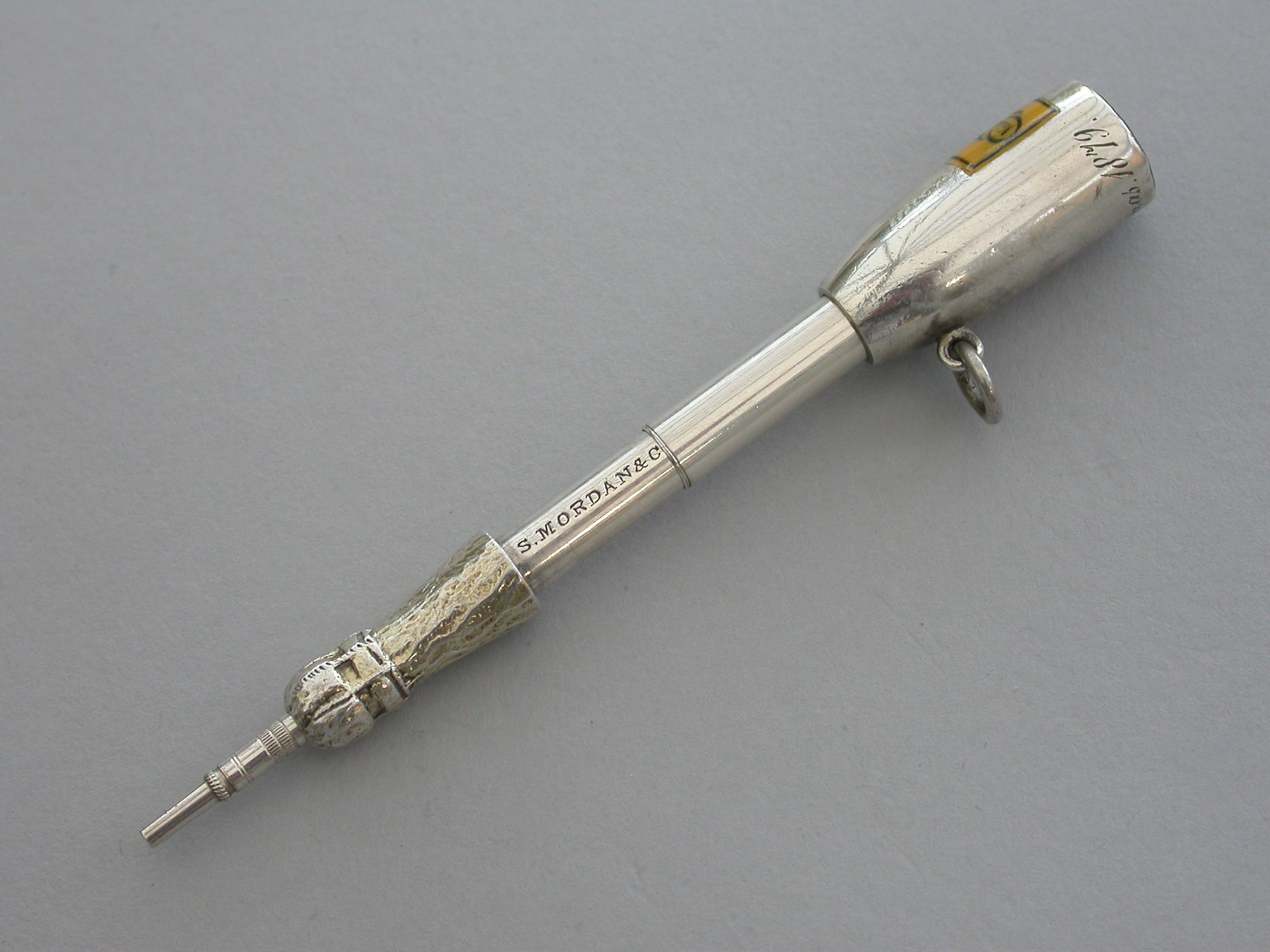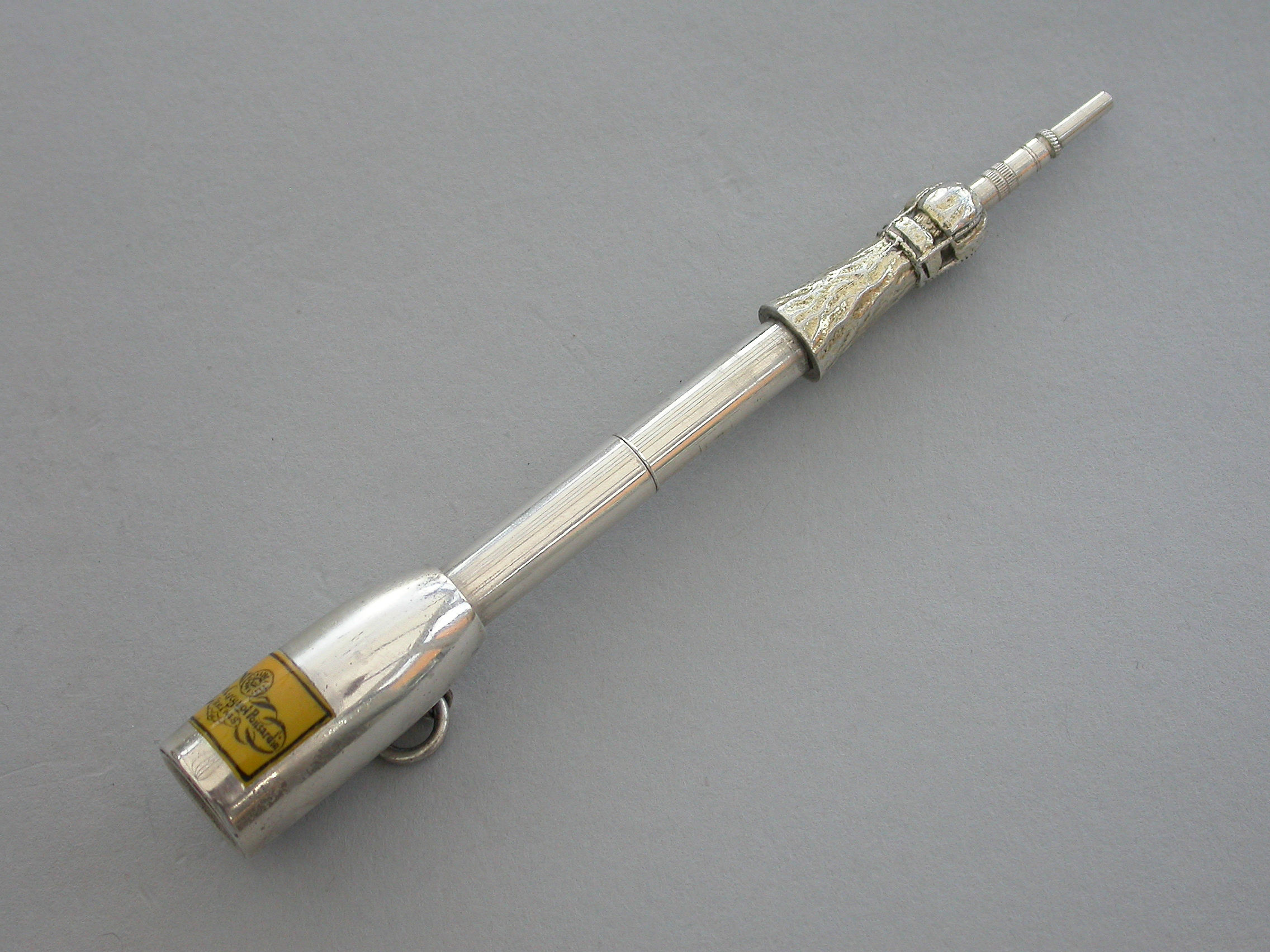 A good Victorian novelty silver and enamel telescopic Propelling Pencil made in the form of a Champagne Bottle, with distinctive yellow enamel label for Veuve Clicquot Ponsardin Champagne, Reims.