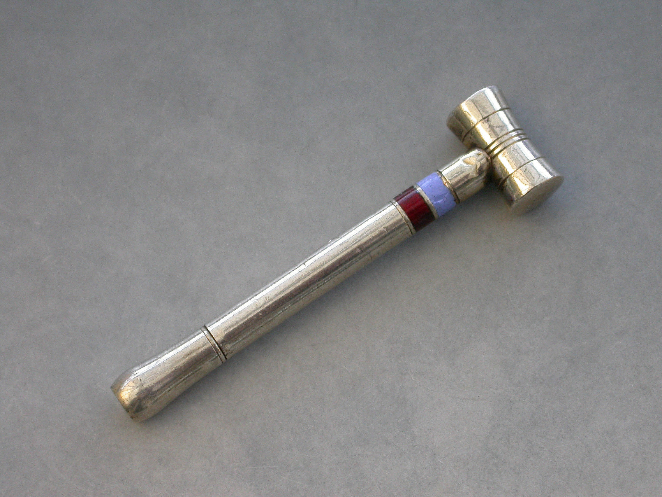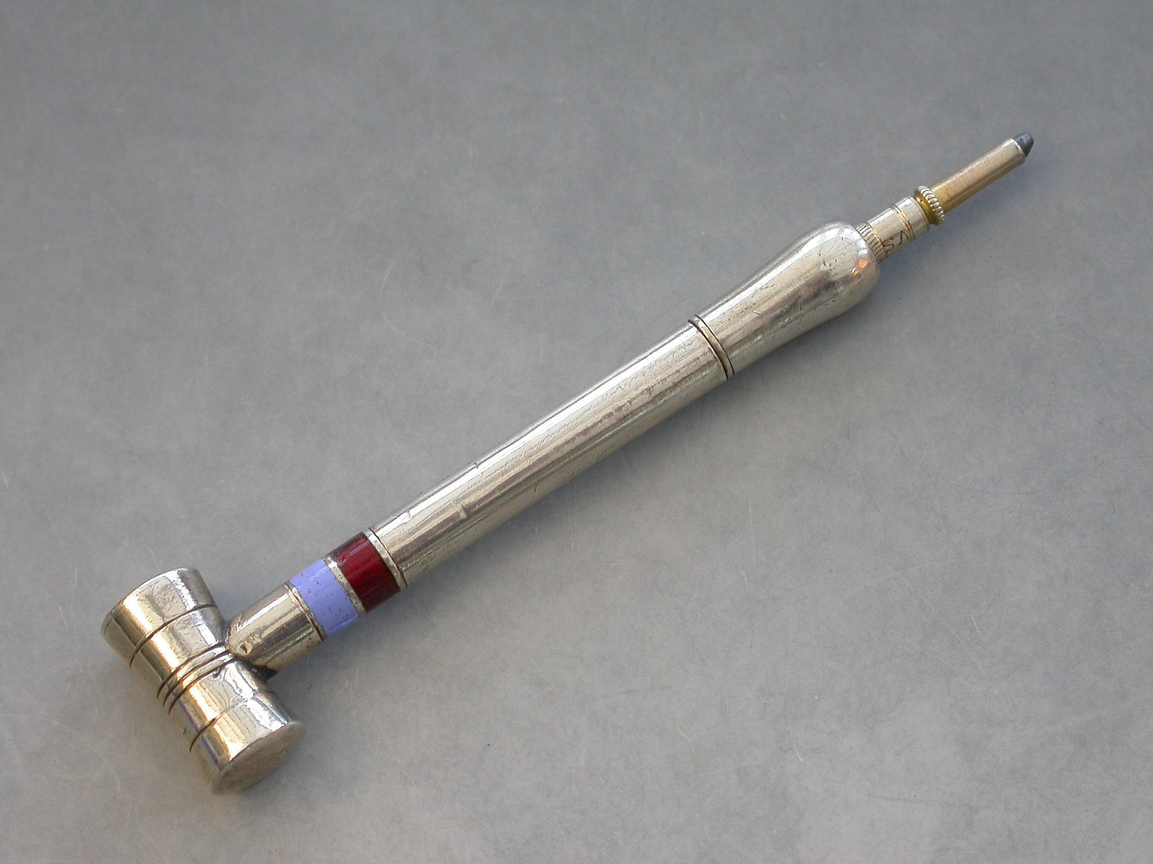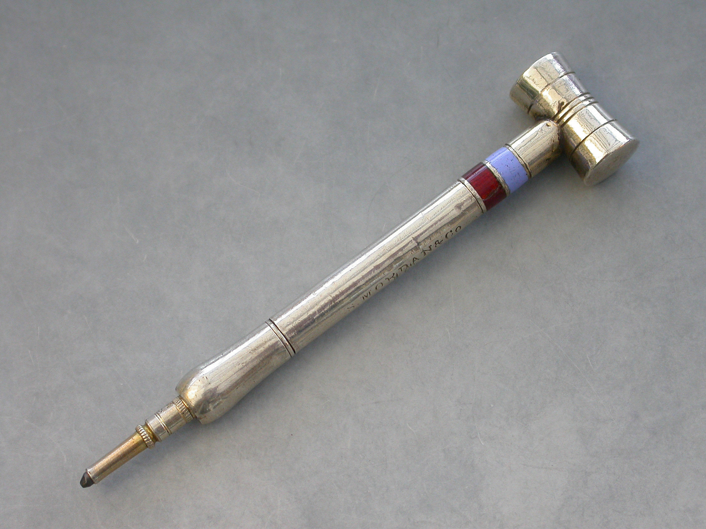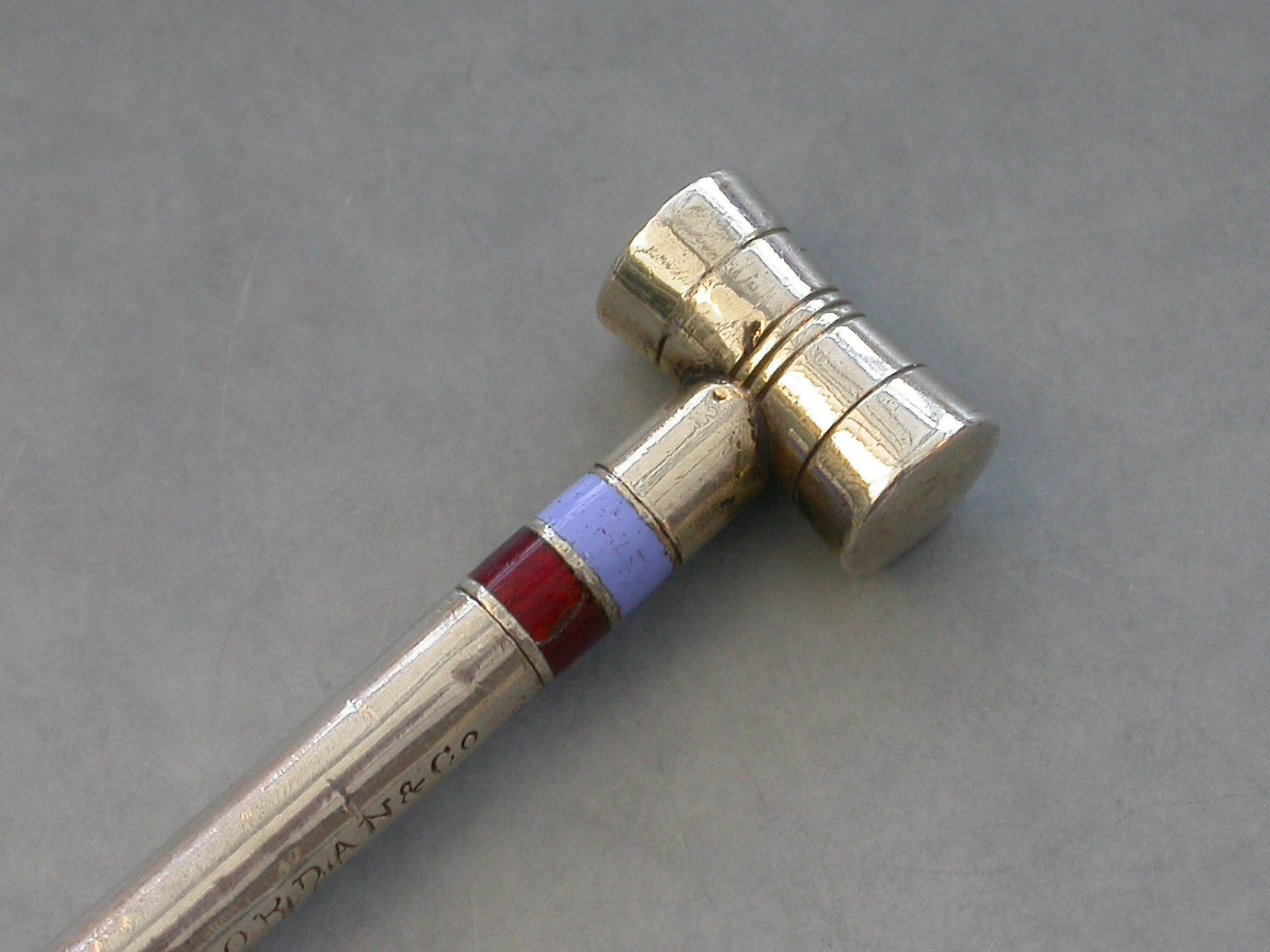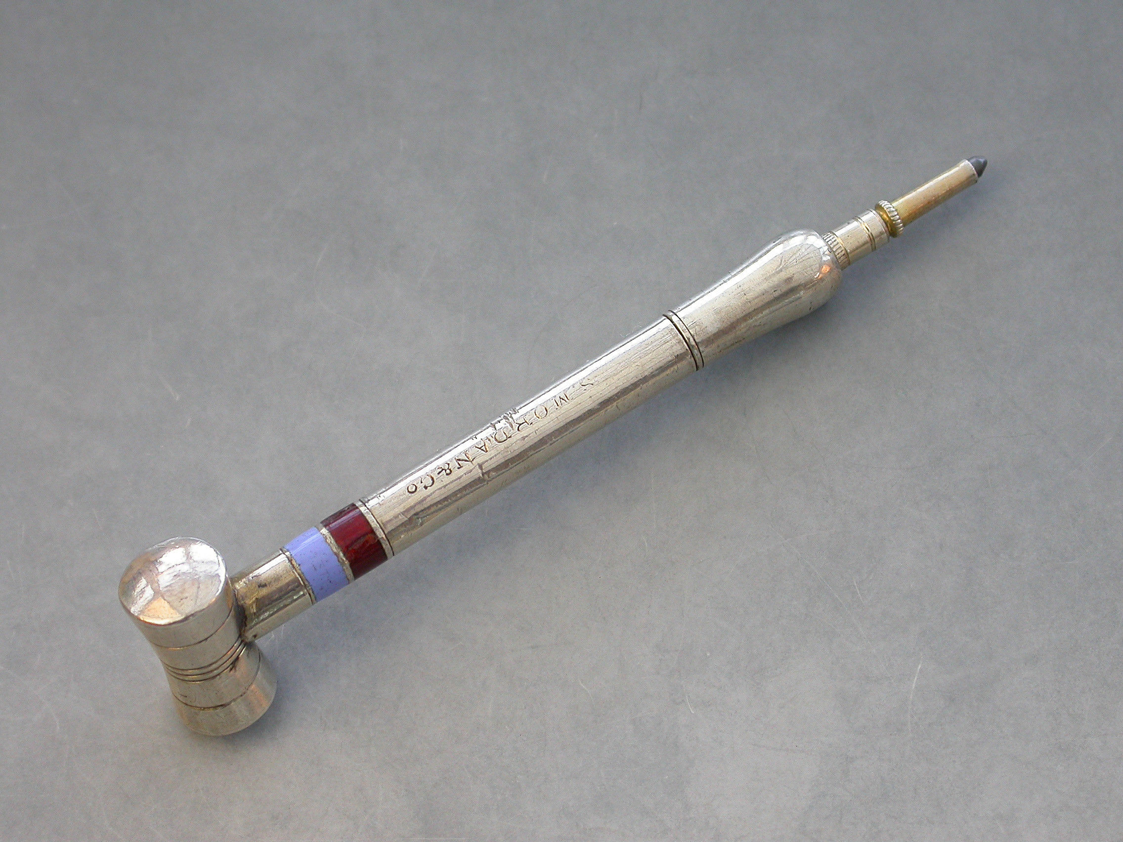 A rare Victorian novelty silver Propelling Pencil made in the form of a Croquet Mallet with blue and red enamel bands to the shaft. A twist action to propel the pencil.