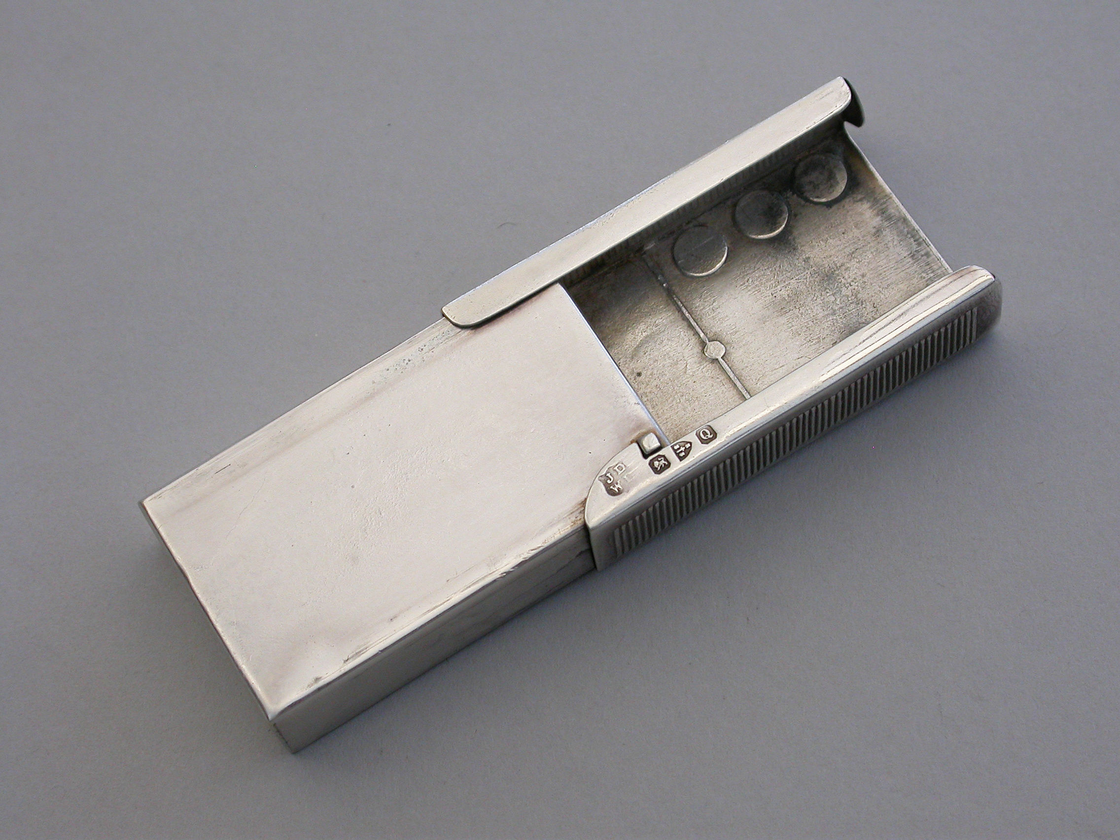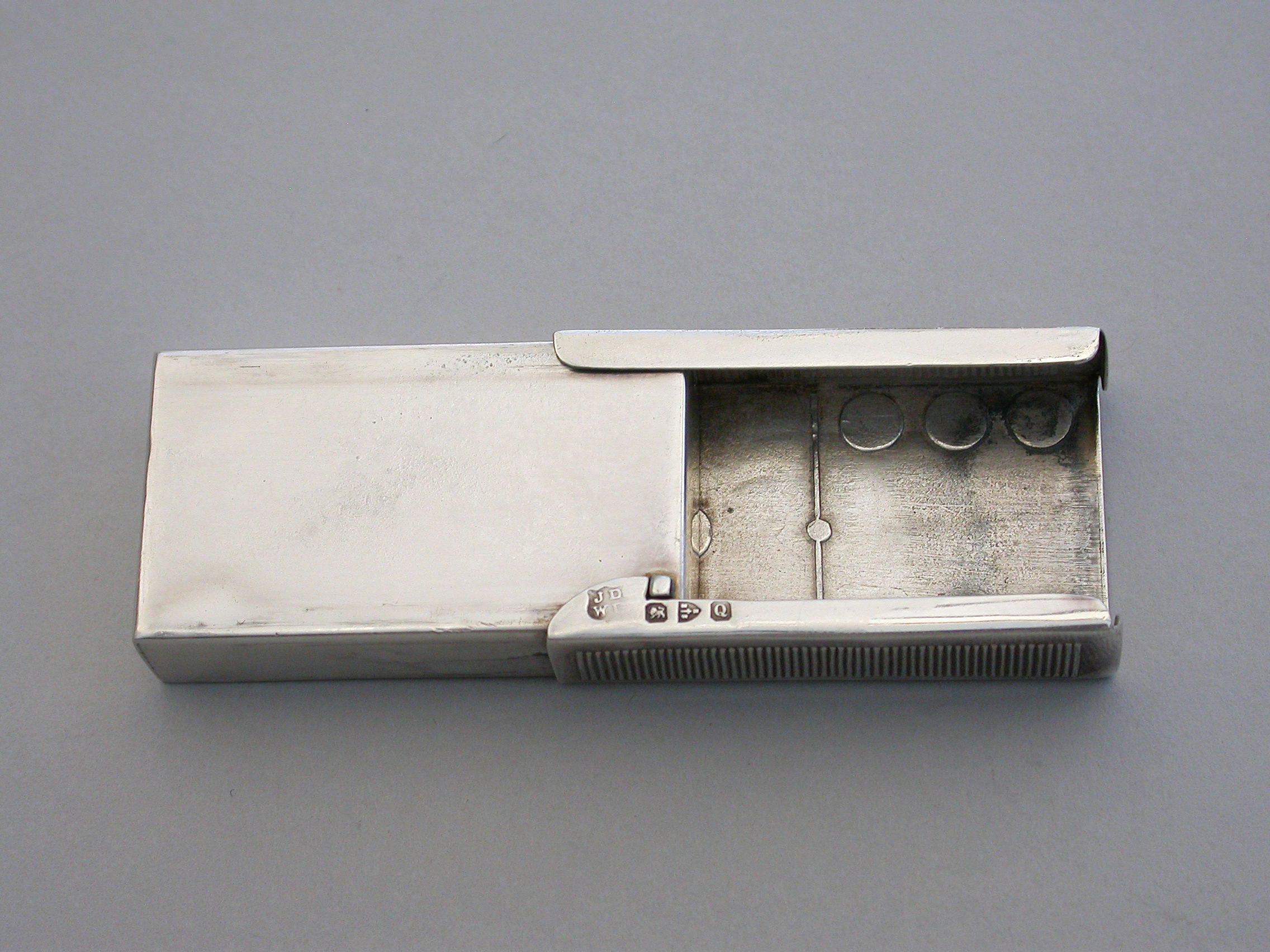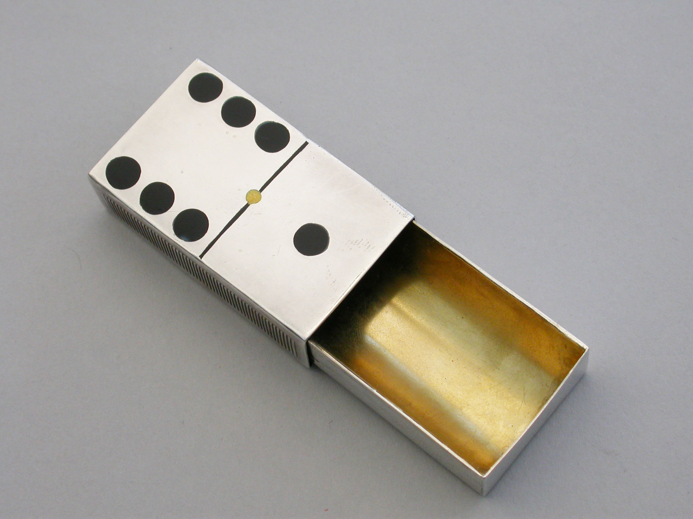 A rare Victorian novelty silver and enamel Vesta Case made in the form of a Domino, with silver gilt interior and slide opening mechanism. A striker to either side.