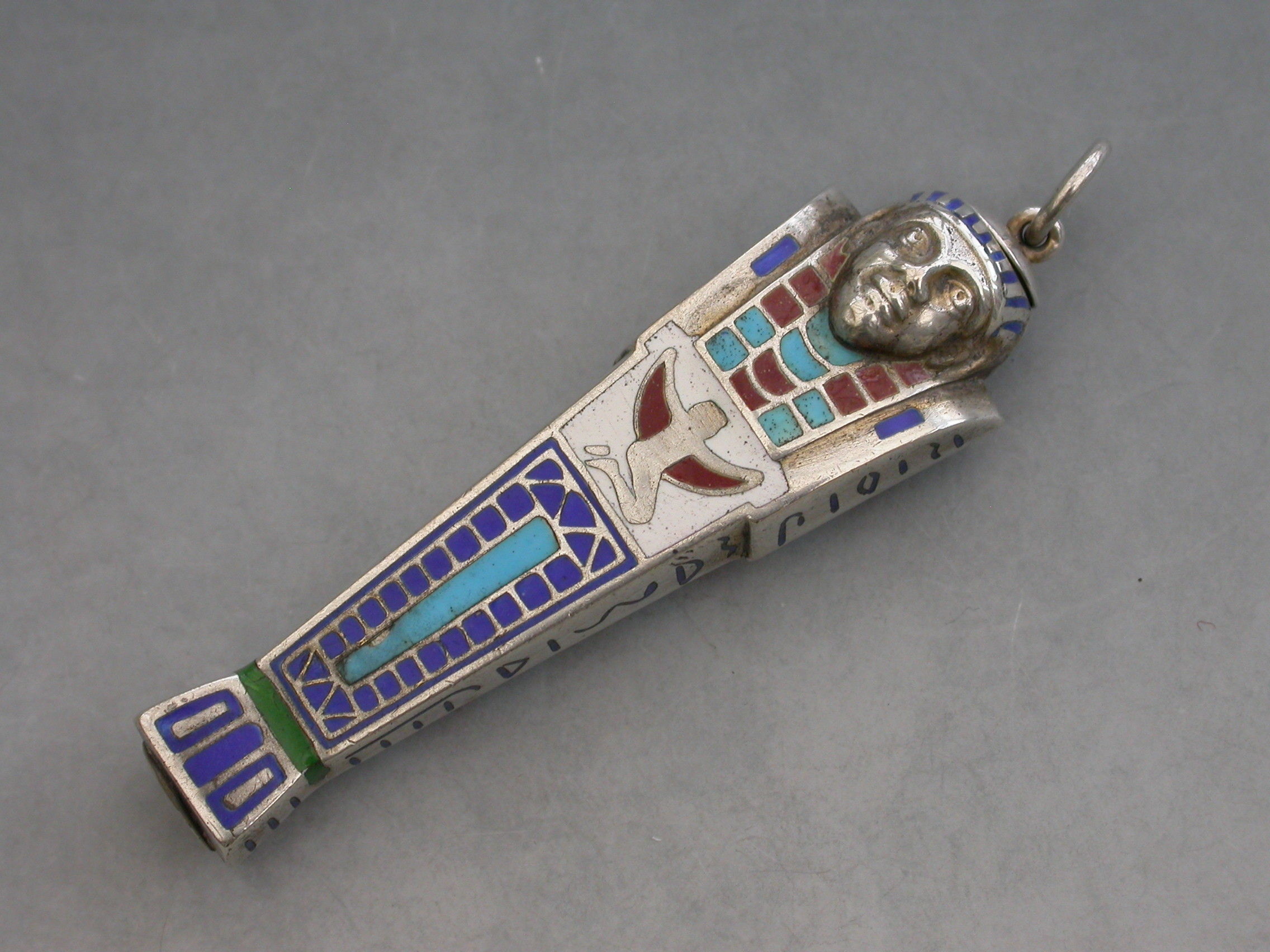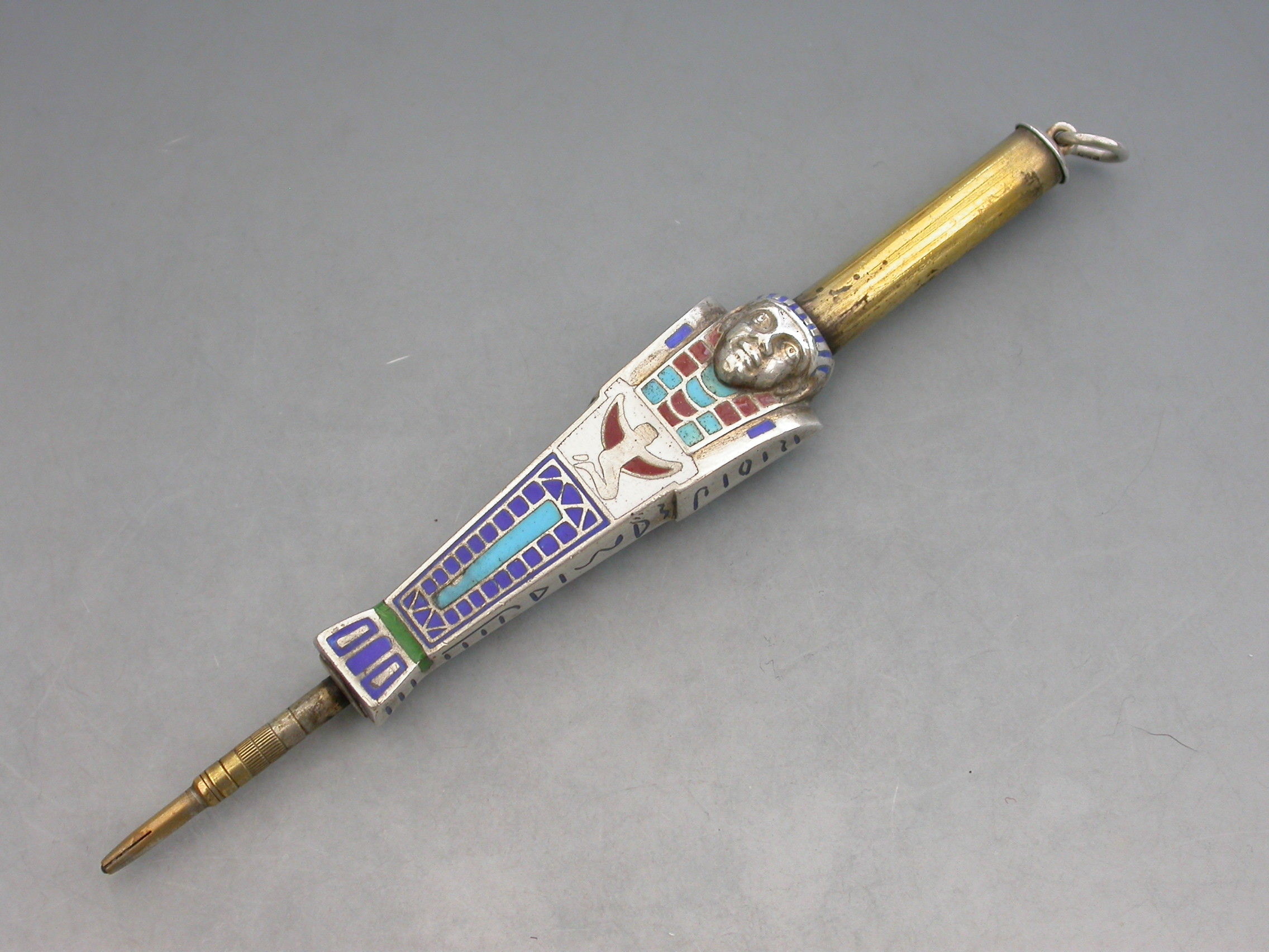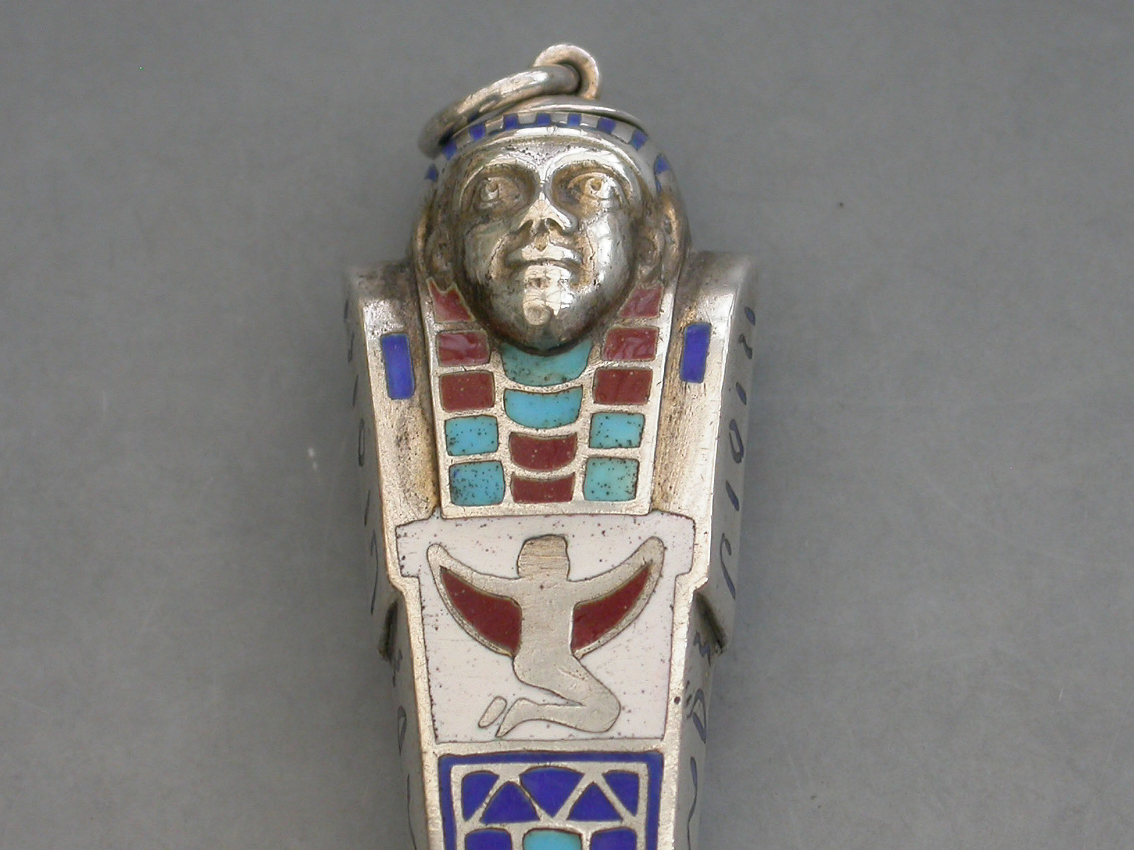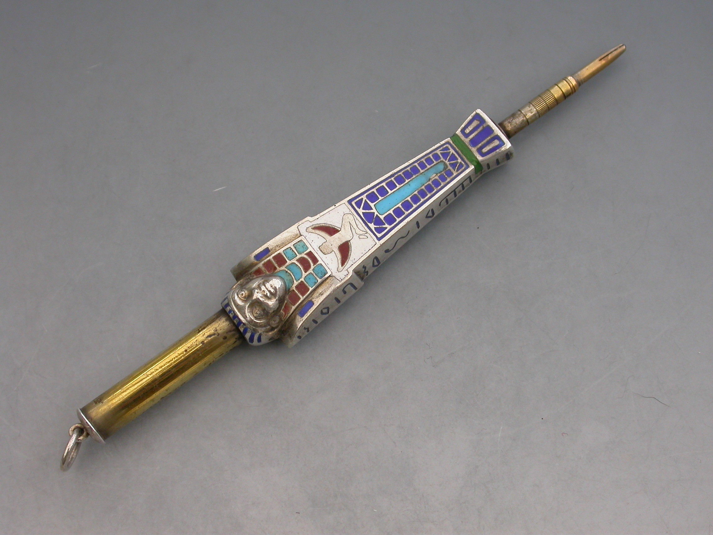 A rare Victorian novelty silver and enamel Propelling Pencil made in the form of an Egyptian Mummy, the body decorated with hieroglyphics and flowers in multi coloured enamels. Attached suspension ring.
