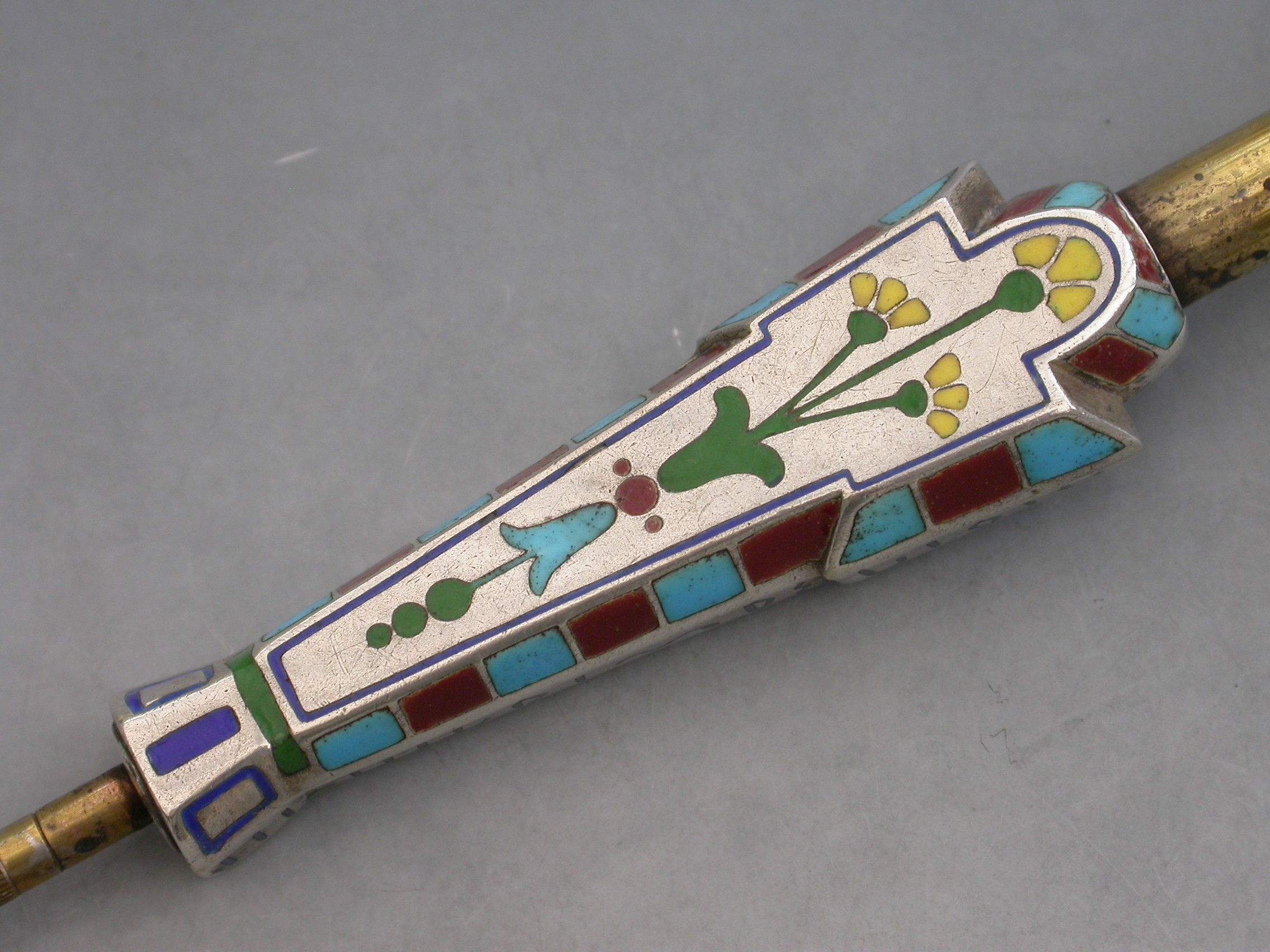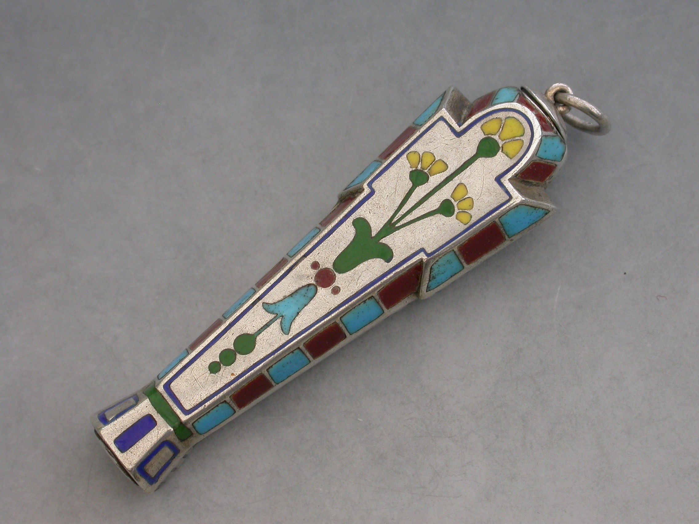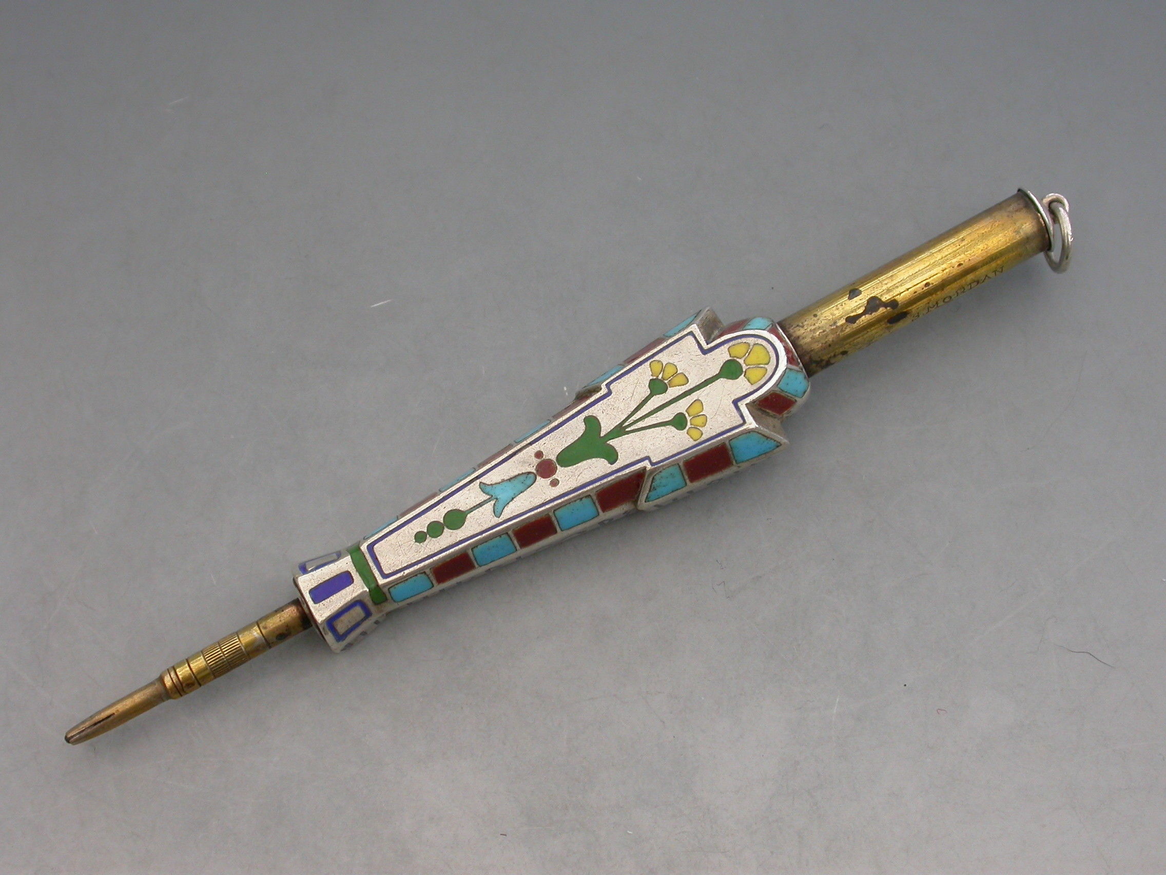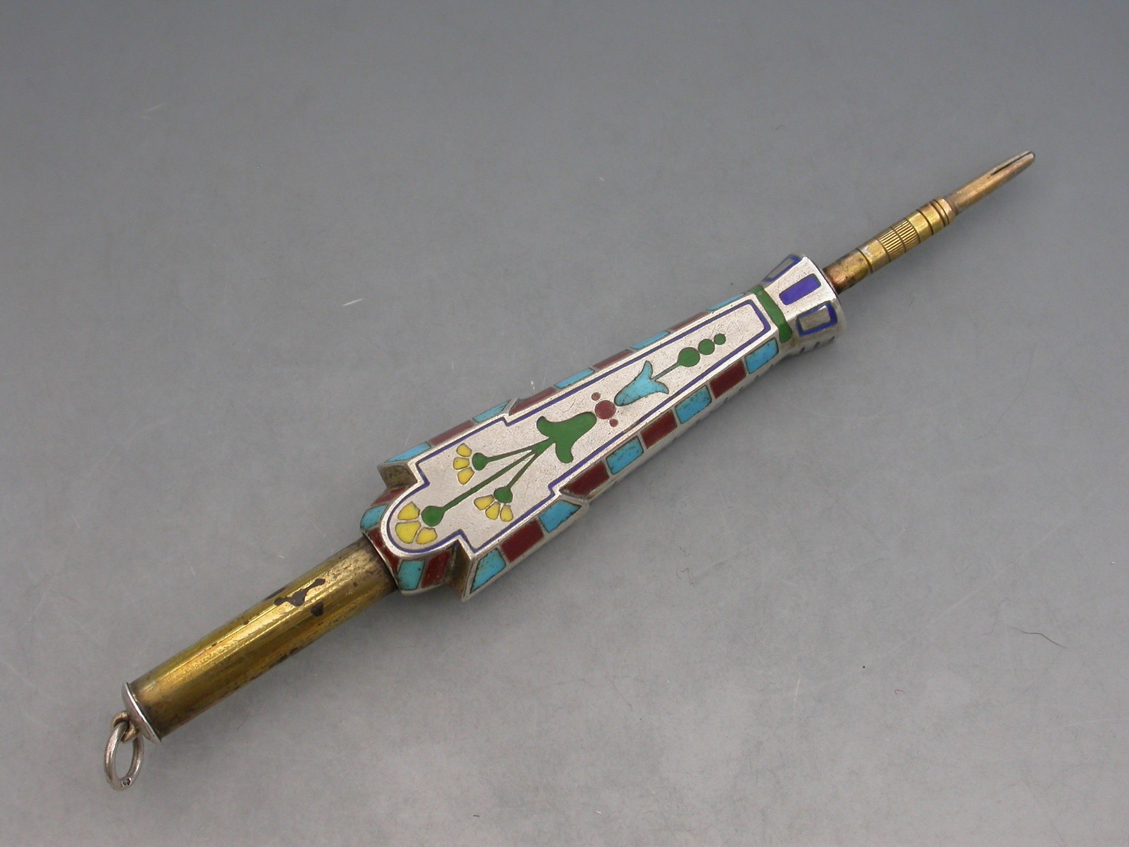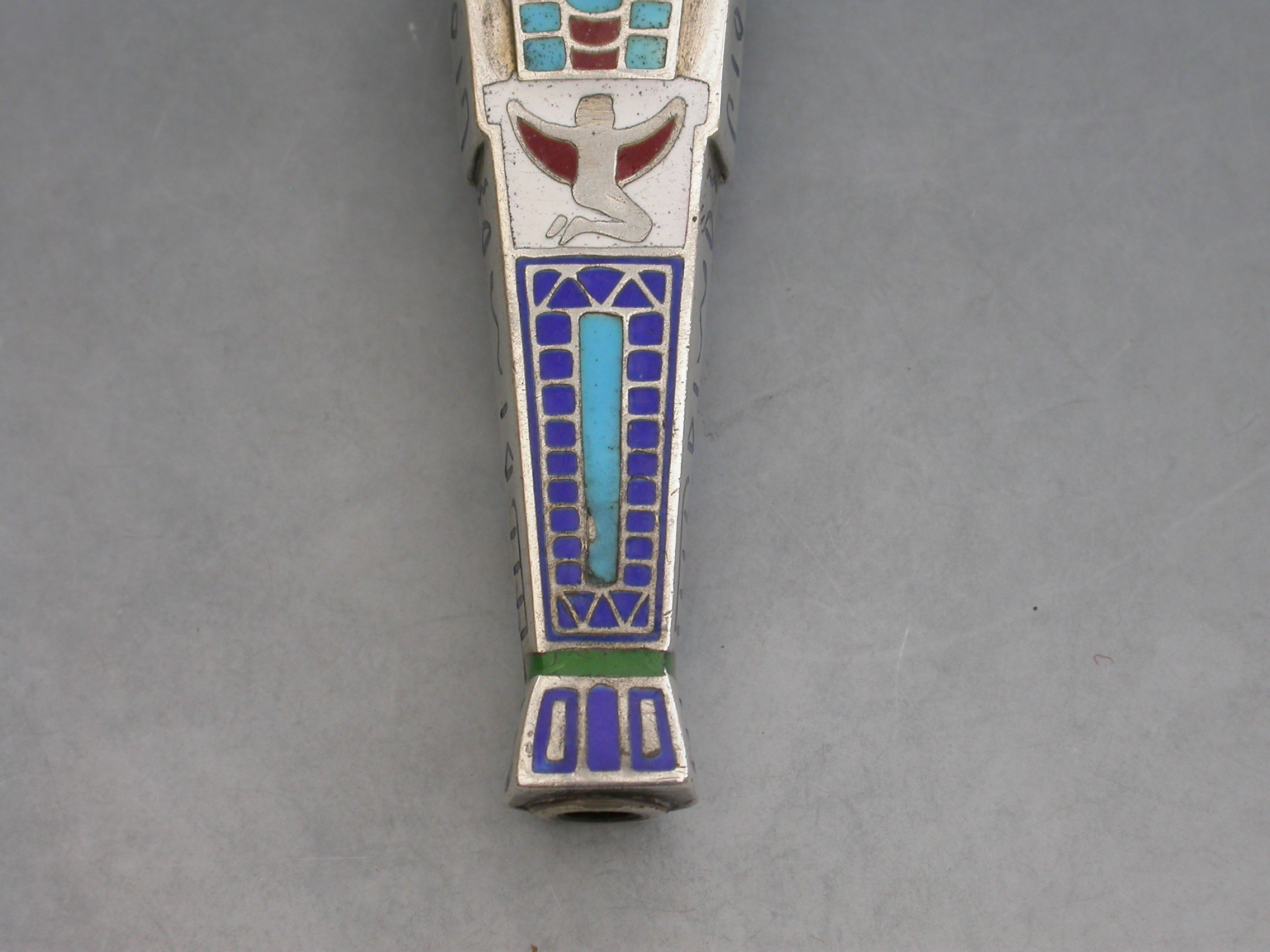 A rare Victorian novelty silver and enamel Propelling Pencil made in the form of an Egyptian Mummy, the body decorated with hieroglyphics and flowers in multi coloured enamels. Attached suspension ring.